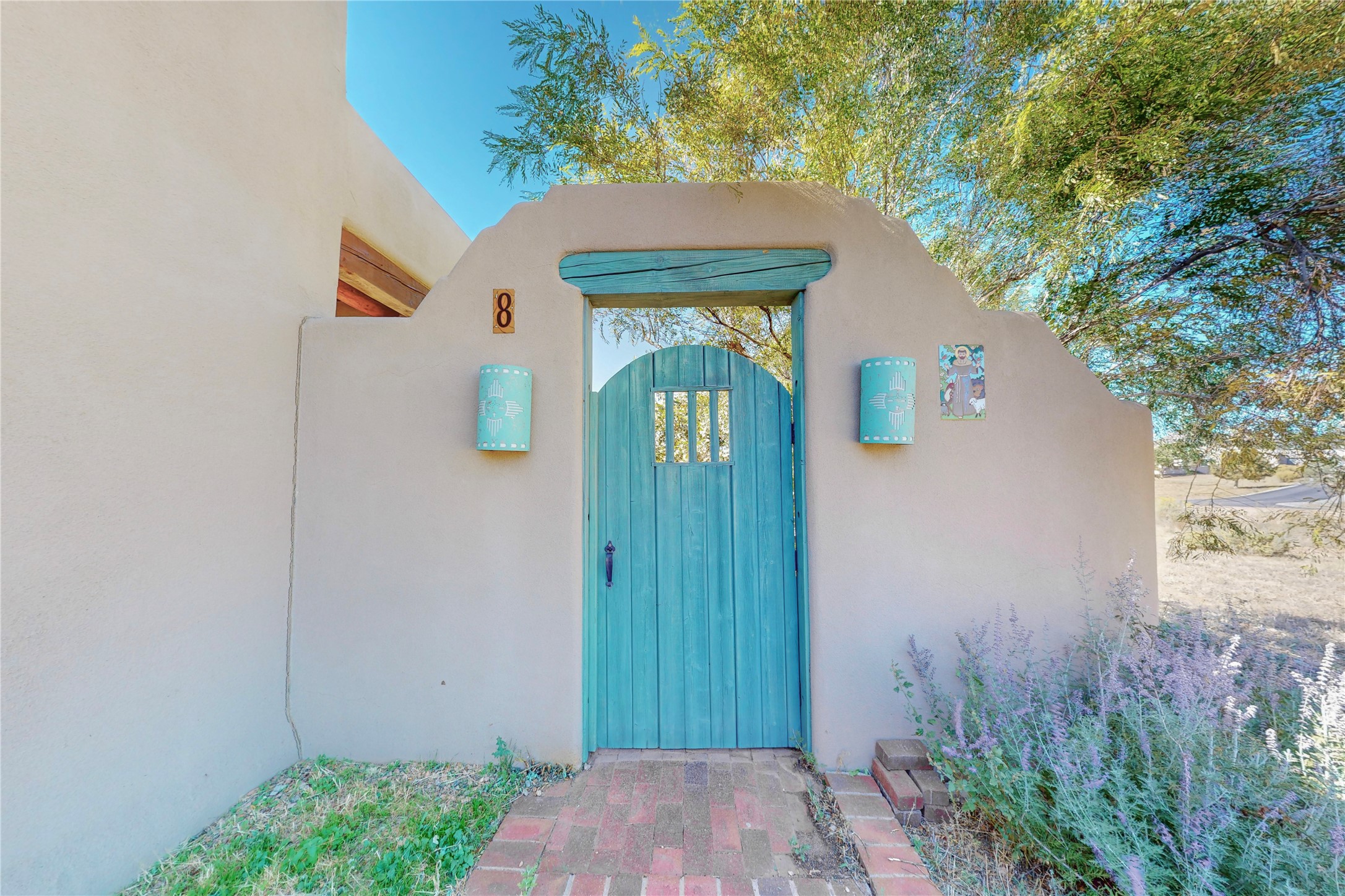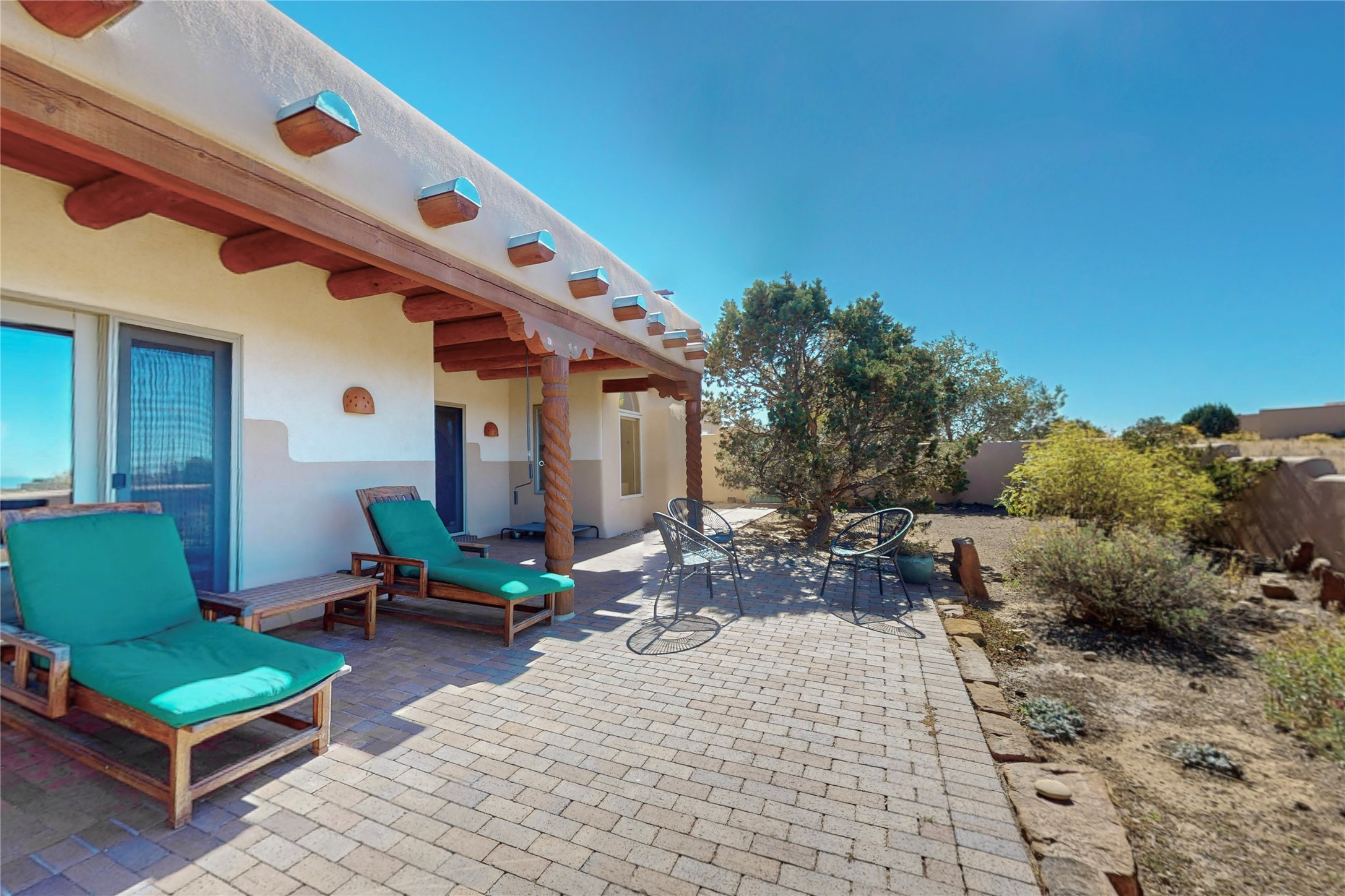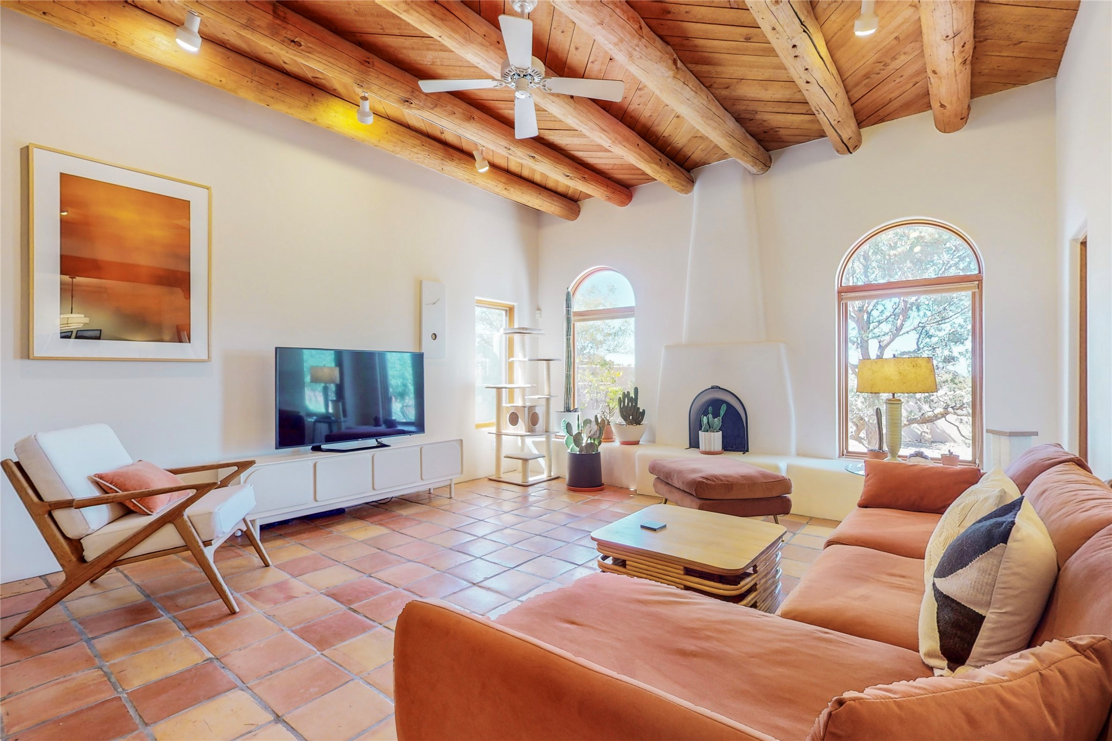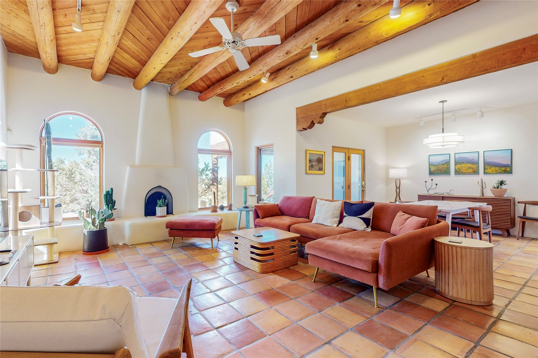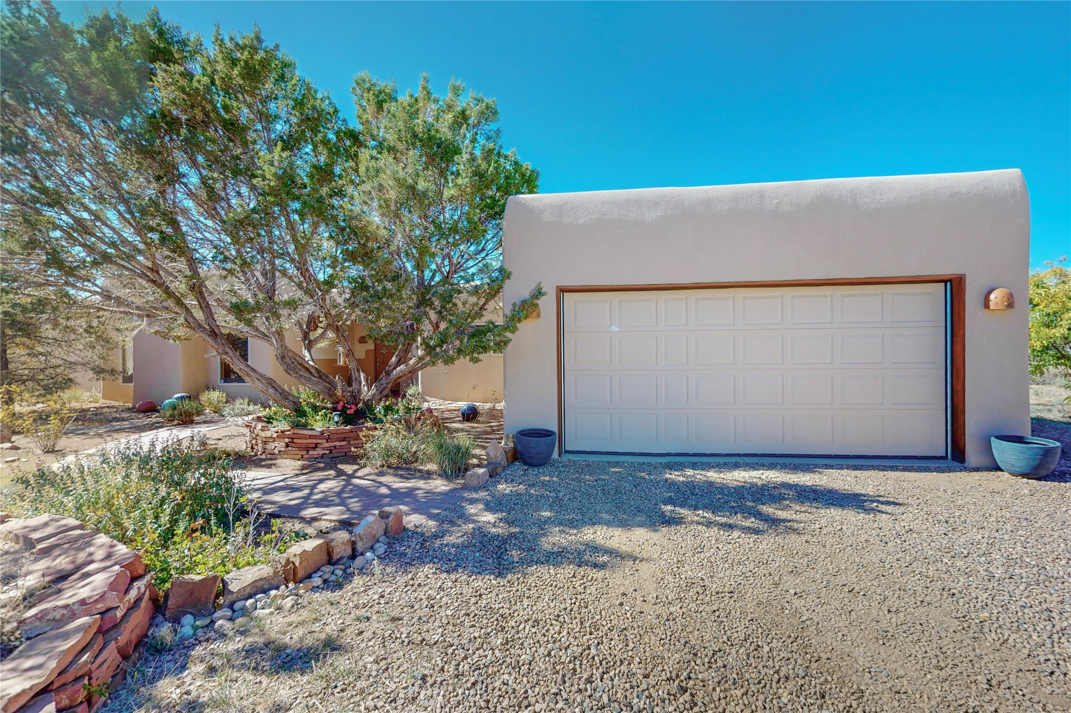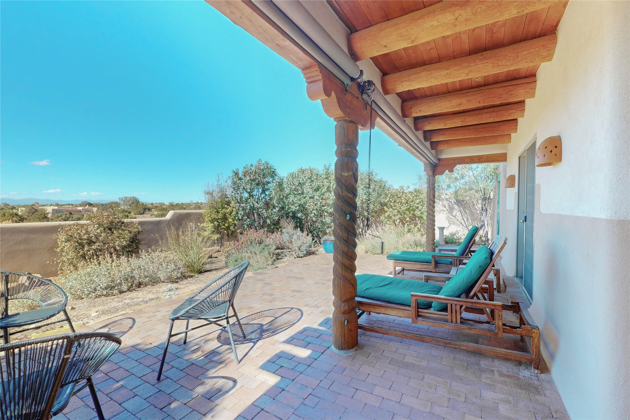 Gracious light open plan, 2230+ sq.ft. split bedroom design built by Adobeworks sitting high up on a cul de sac in Eldorado. Contemporary pueblo with high viga ceilings, dramatic custom kiva fireplace, nichos, corballed beams and tile floors in main living areas. A sunny large kitchen with island and pantry flows to a formal dining area with outside portal for dining with fabulous sweeping sunset mountain vistas . Owners suite features a romantic corner kiva and viga ceilings with a door to a privately walled garden and bath with walk in closet, separate shower and tub. There is a lovely library/music room with a central Rumford style fireplace and 2 bedroom, full bath guest suite. Close to both Eldorado amenities and local community services, trails and shopping plus only minutes into Santa Fe. This home is a must see.
