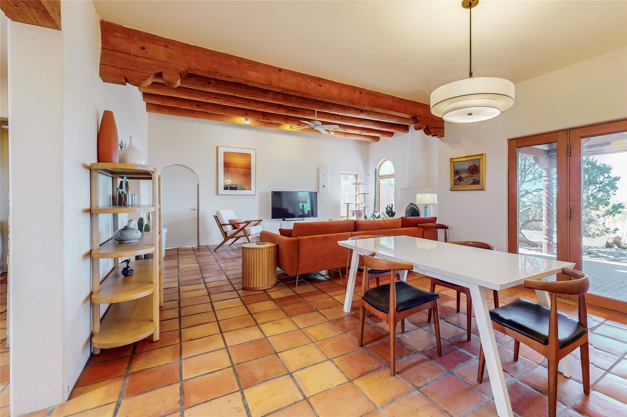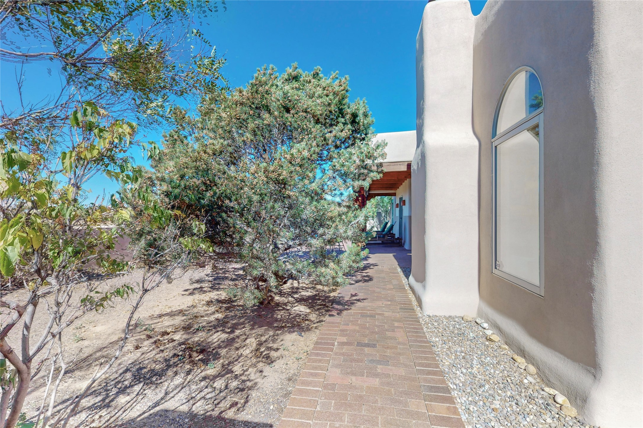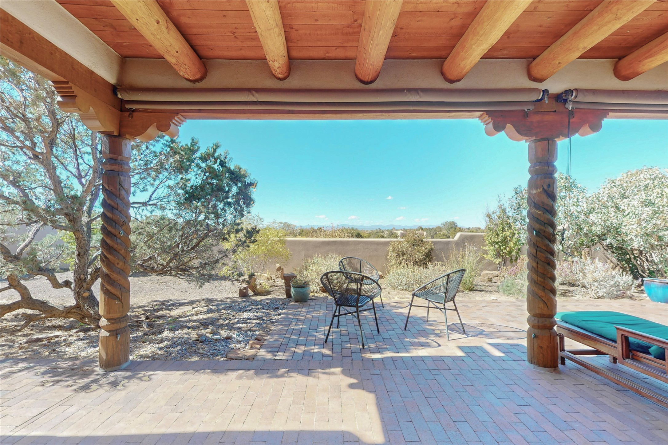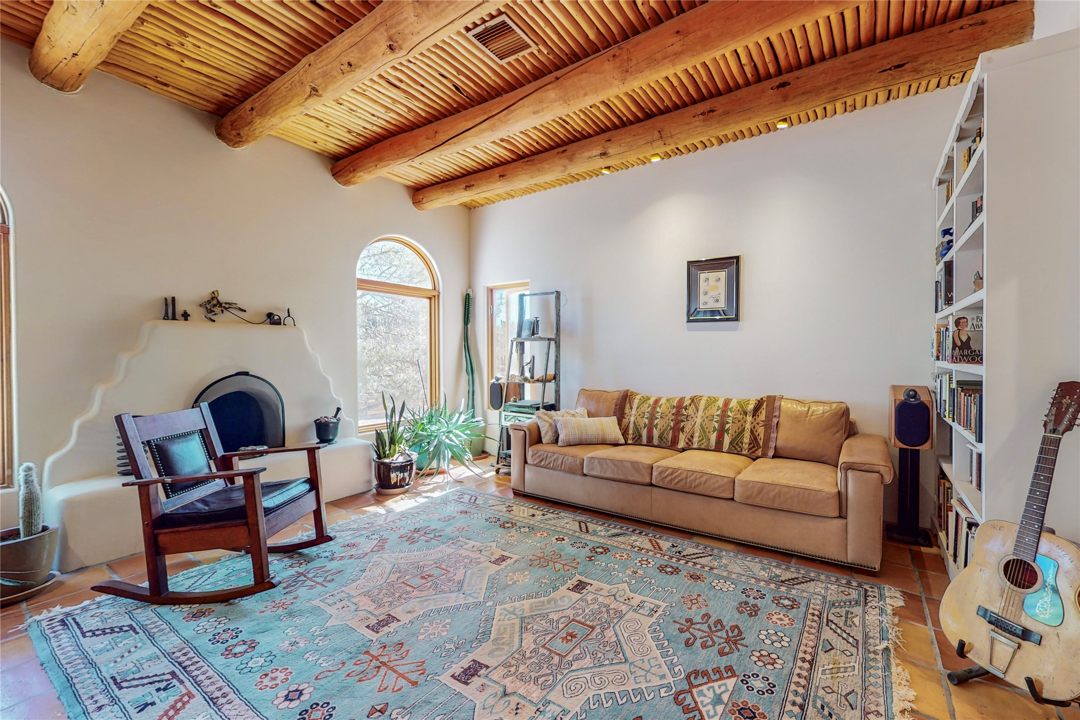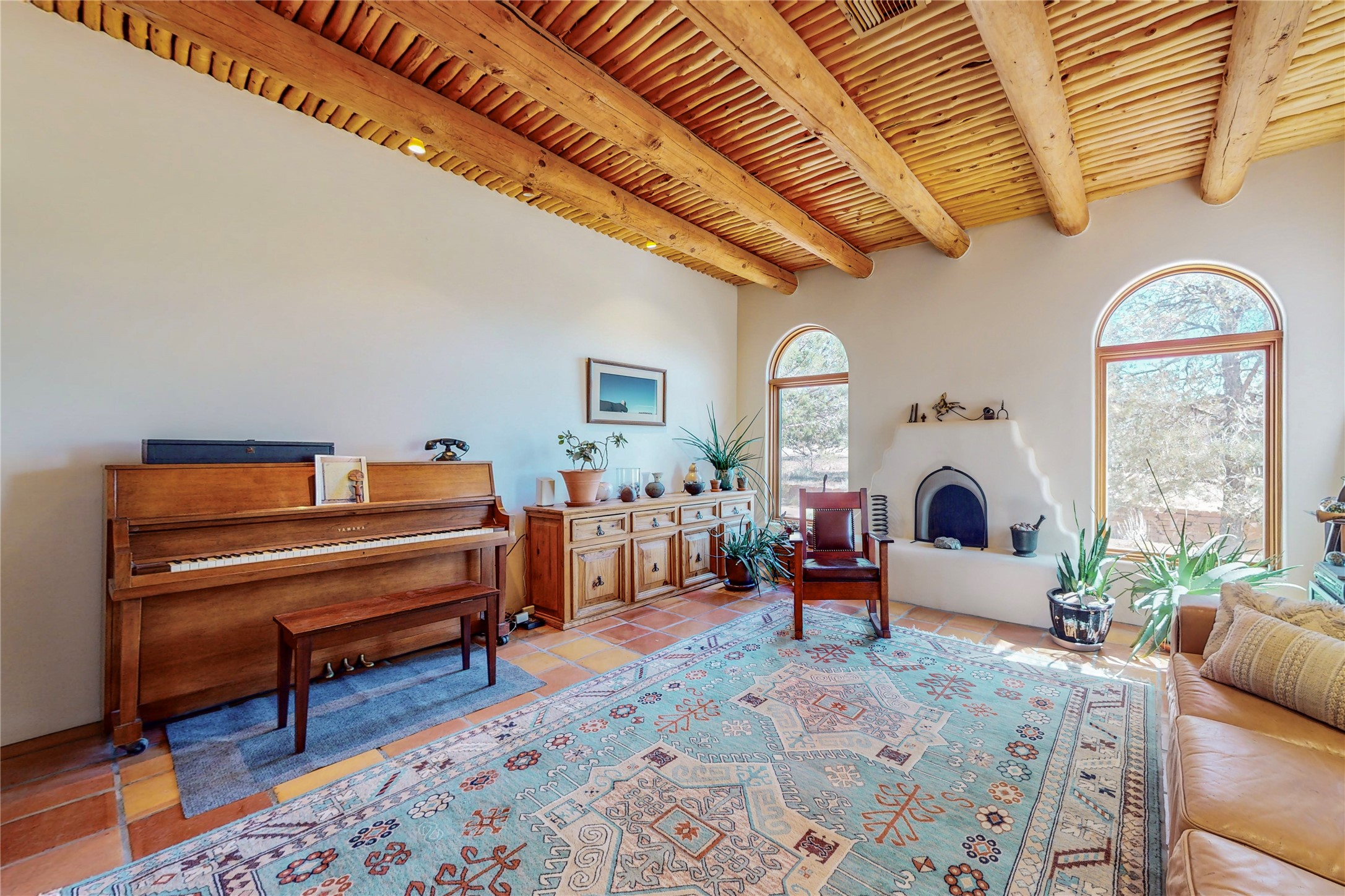 Gracious light open plan, 2230+ sq.ft. split bedroom design built by Adobeworks sitting high up on a cul de sac in Eldorado. Contemporary pueblo with high viga ceilings, dramatic custom kiva fireplace, nichos, corballed beams and tile floors in main living areas. A sunny large kitchen with island and pantry flows to a formal dining area with outside portal for dining with fabulous sweeping sunset mountain vistas . Owners suite features a romantic corner kiva and viga ceilings with a door to a privately walled garden and bath with walk in closet, separate shower and tub. There is a lovely library/music room with a central Rumford style fireplace and 2 bedroom, full bath guest suite. Close to both Eldorado amenities and local community services, trails and shopping plus only minutes into Santa Fe. This home is a must see.