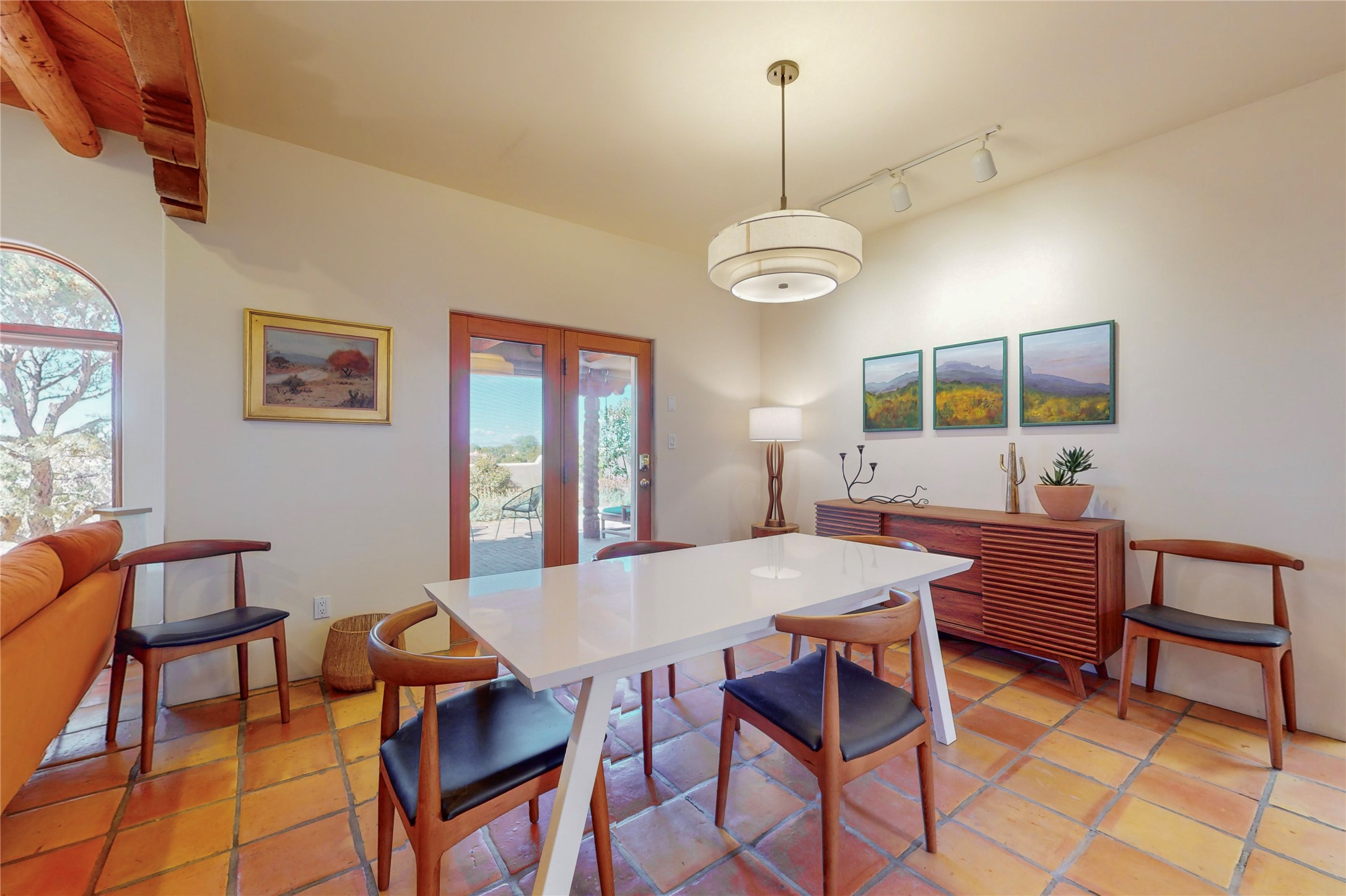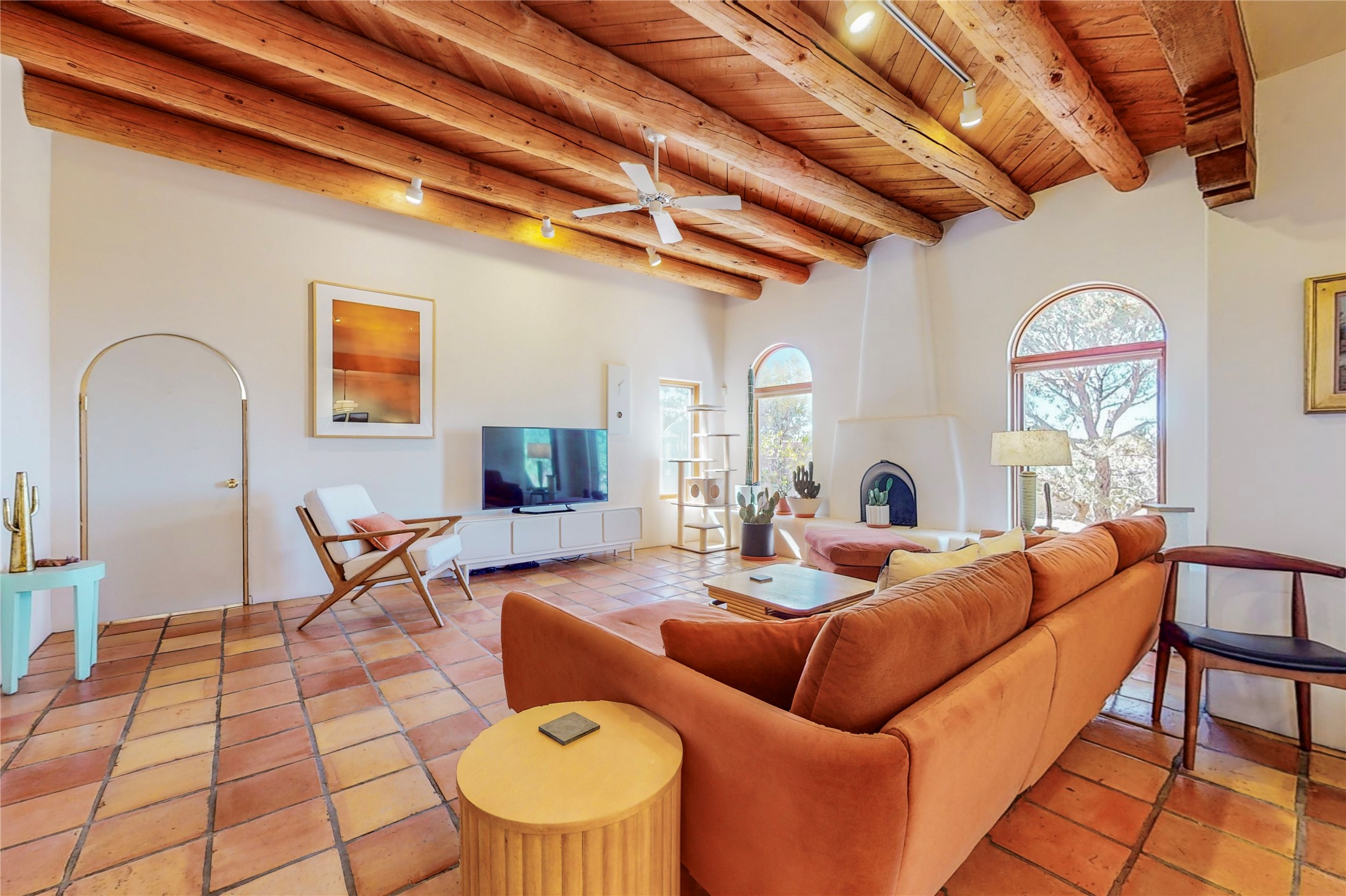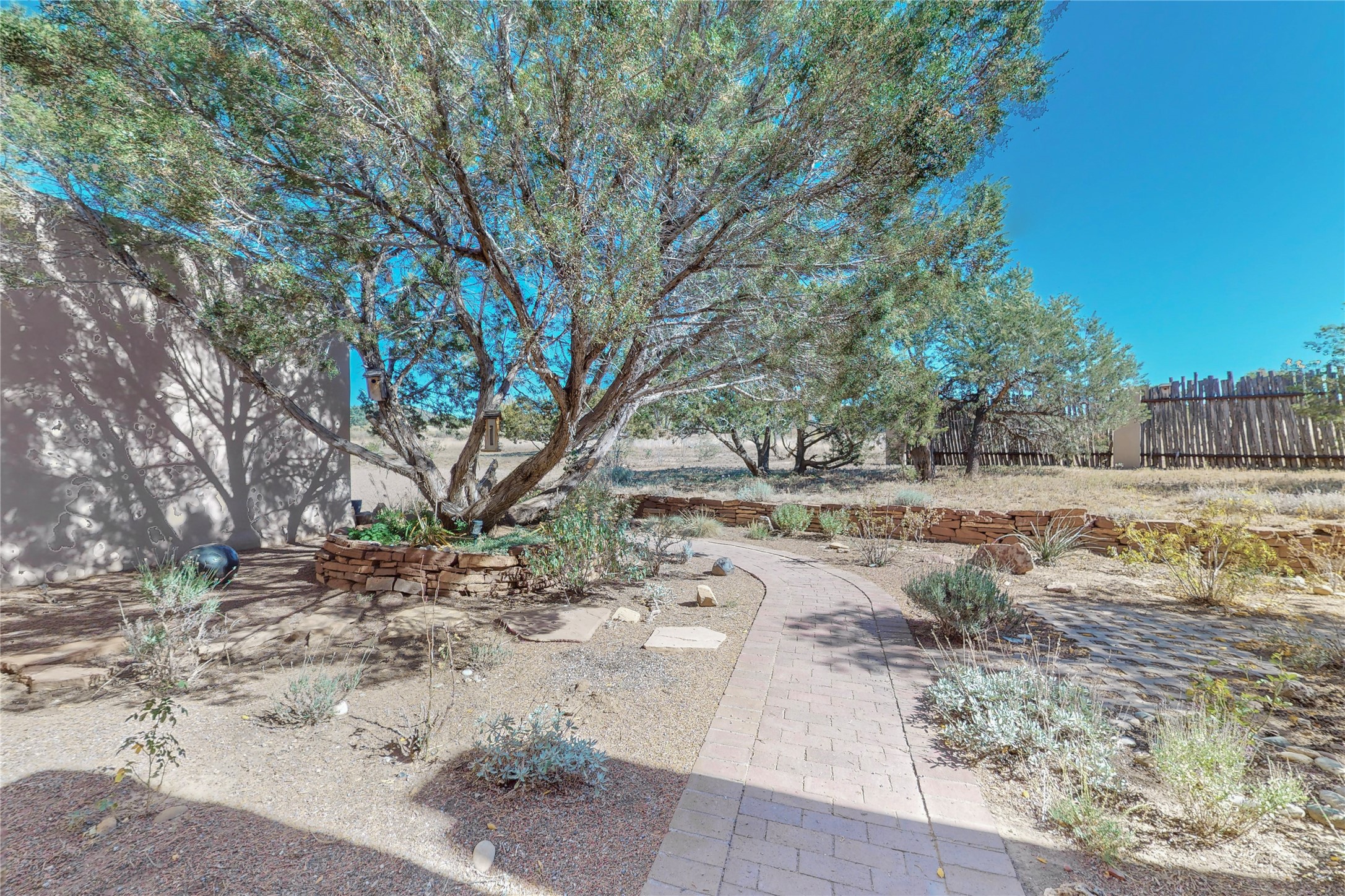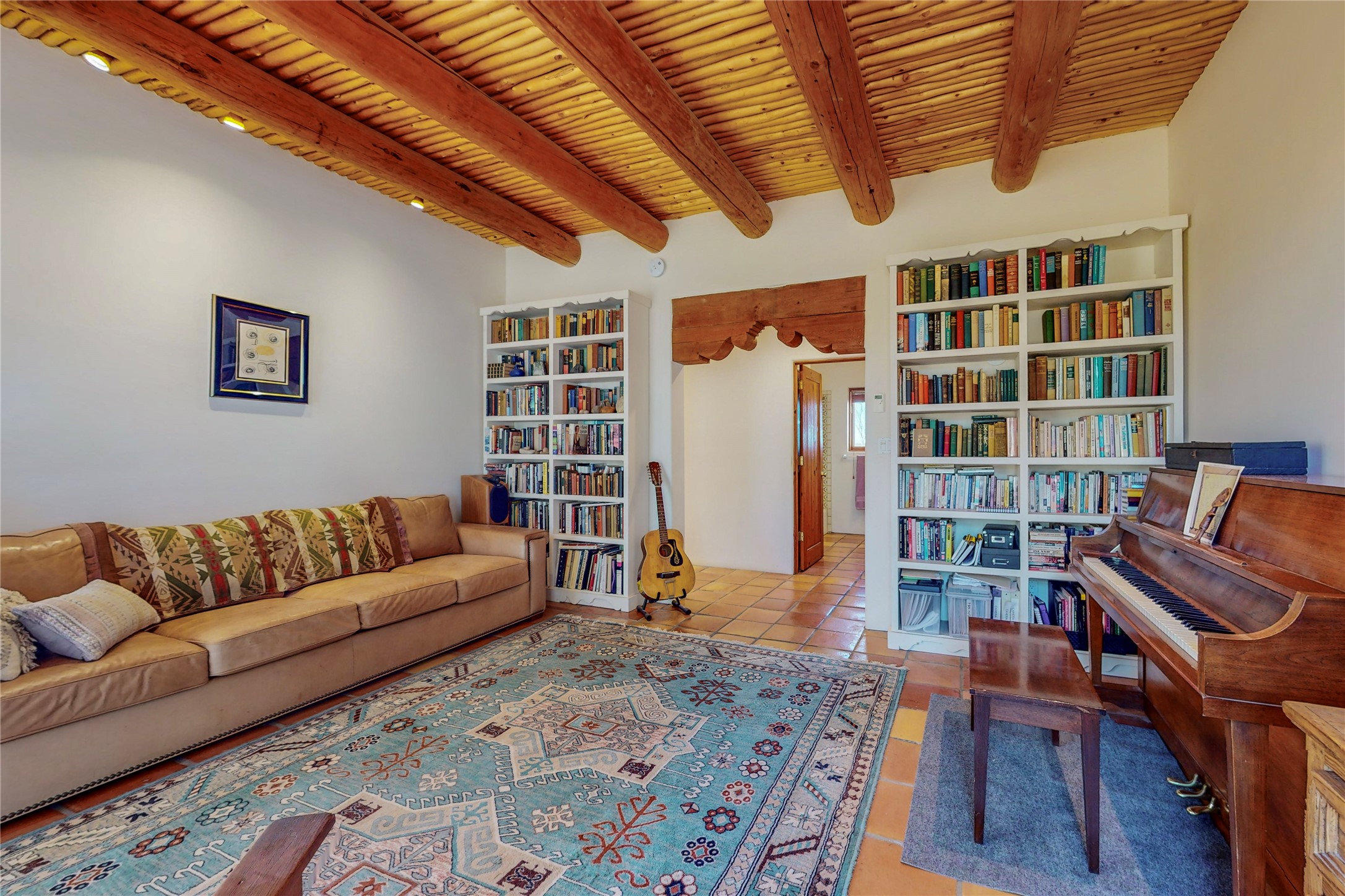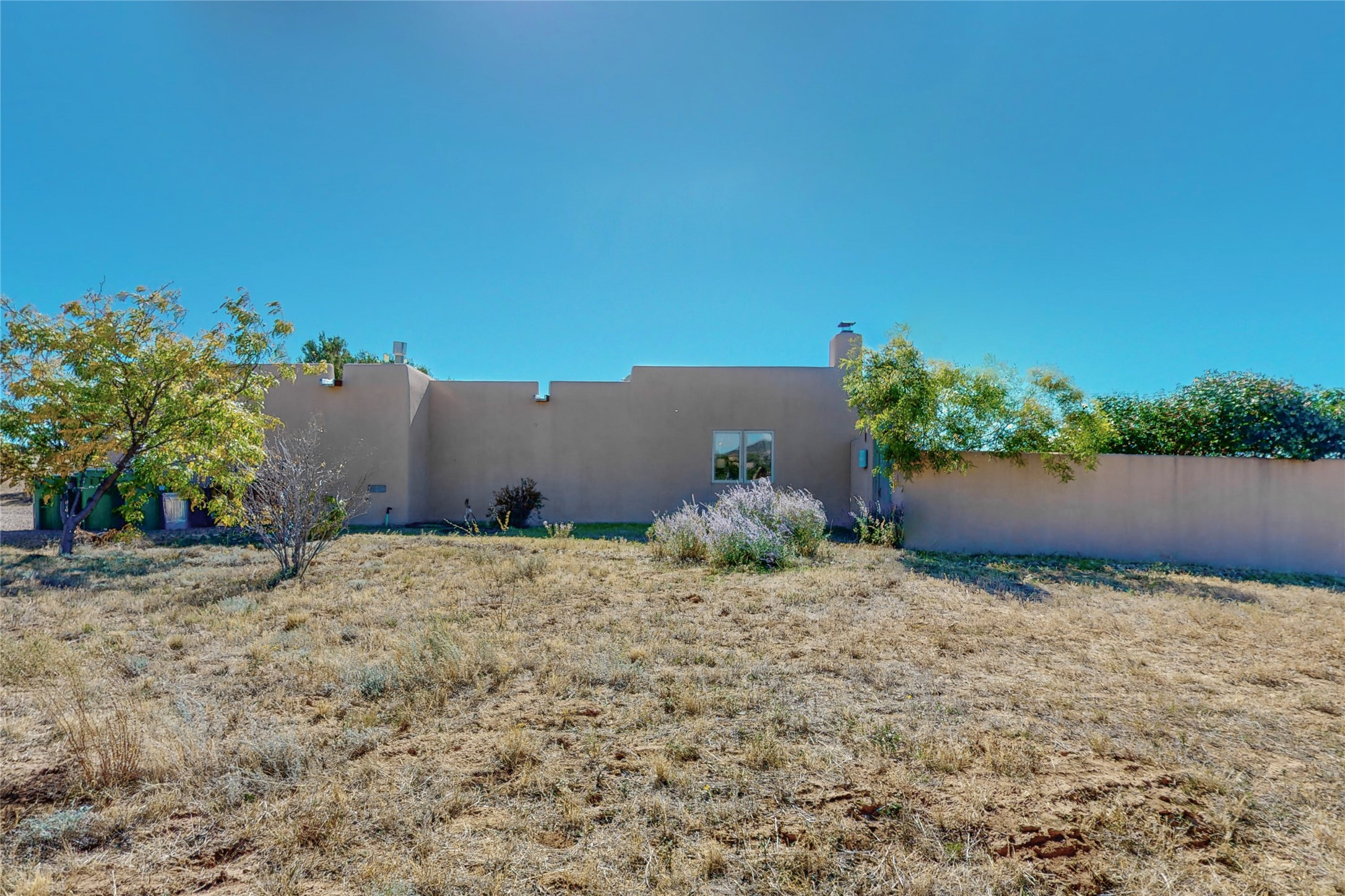 Gracious light open plan, 2230+ sq.ft. split bedroom design built by Adobeworks sitting high up on a cul de sac in Eldorado. Contemporary pueblo with high viga ceilings, dramatic custom kiva fireplace, nichos, corballed beams and tile floors in main living areas. A sunny large kitchen with island and pantry flows to a formal dining area with outside portal for dining with fabulous sweeping sunset mountain vistas . Owners suite features a romantic corner kiva and viga ceilings with a door to a privately walled garden and bath with walk in closet, separate shower and tub. There is a lovely library/music room with a central Rumford style fireplace and 2 bedroom, full bath guest suite. Close to both Eldorado amenities and local community services, trails and shopping plus only minutes into Santa Fe. This home is a must see.