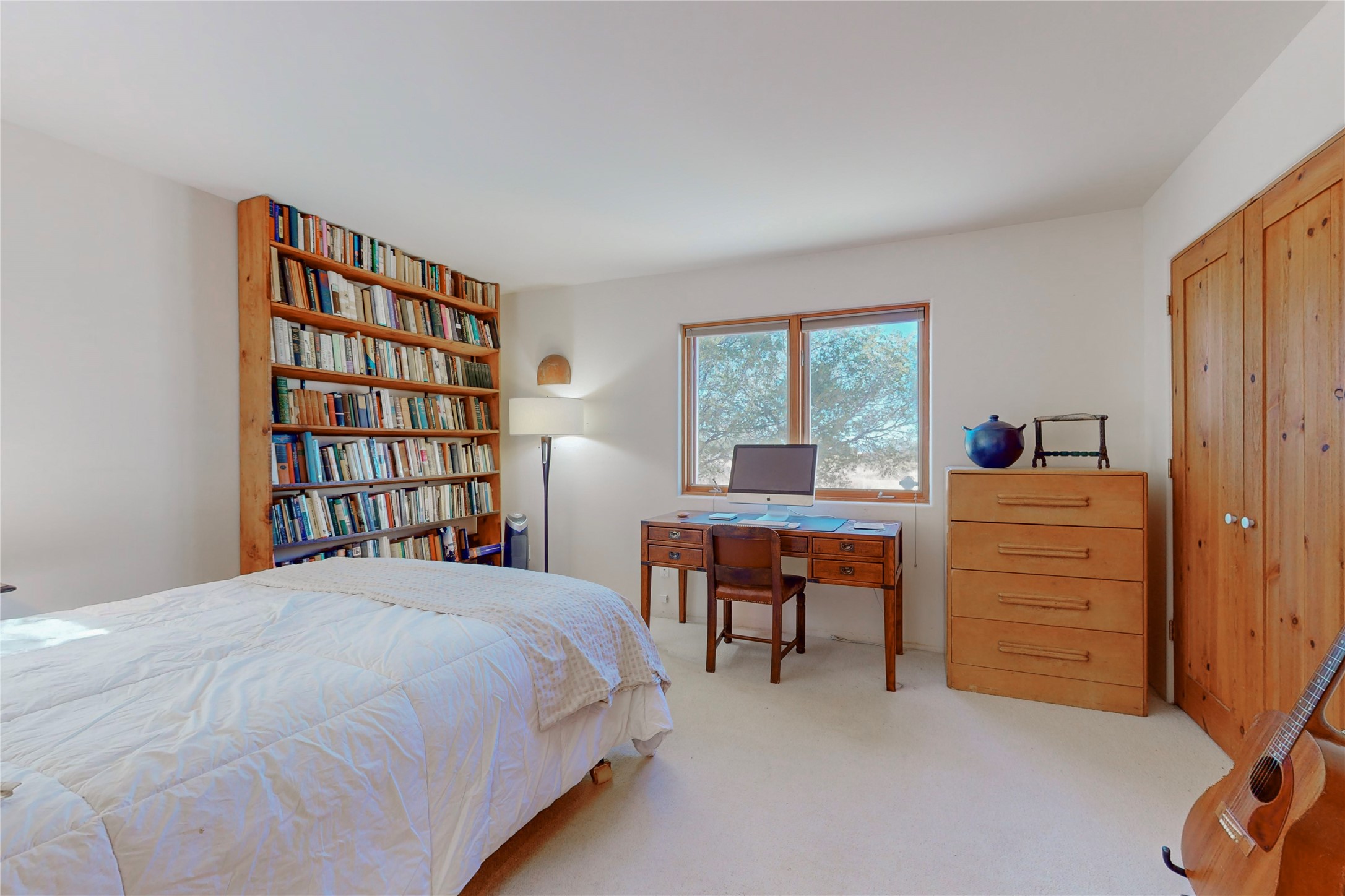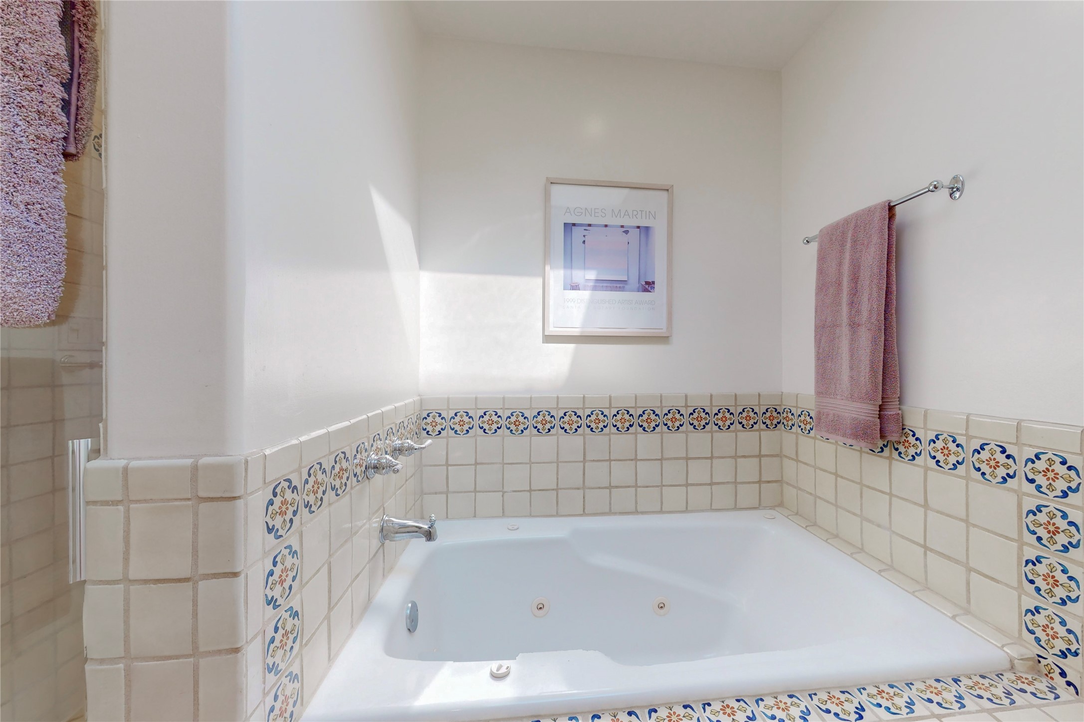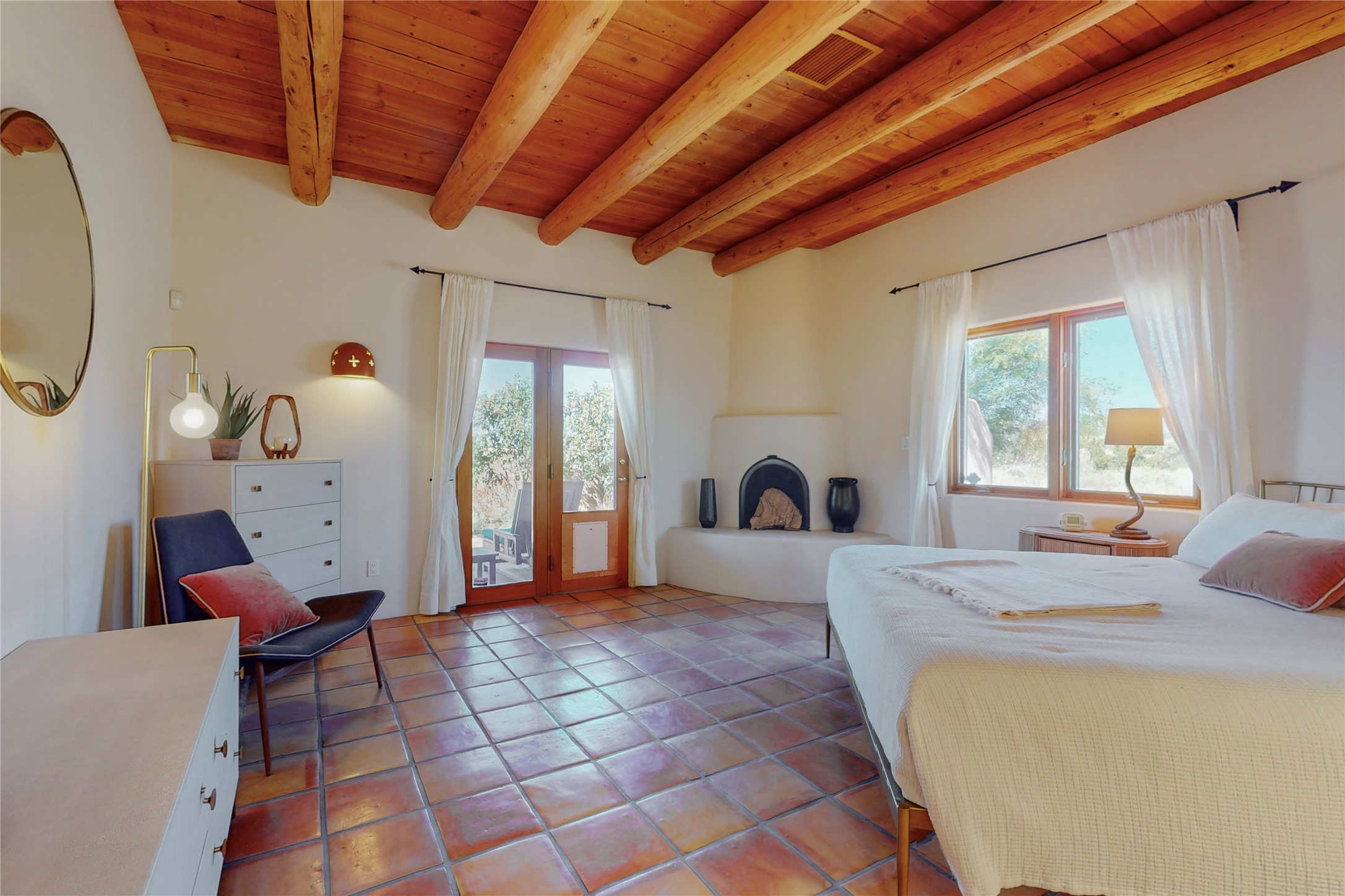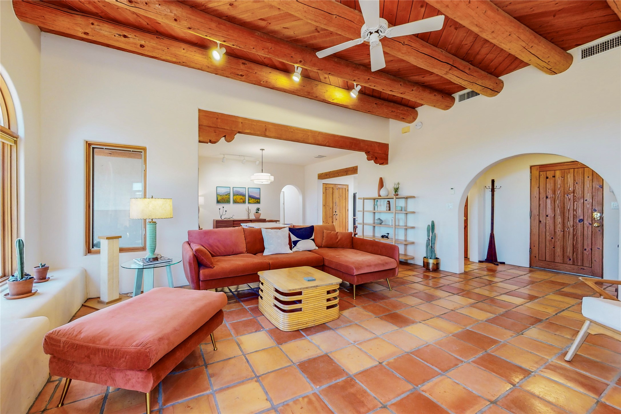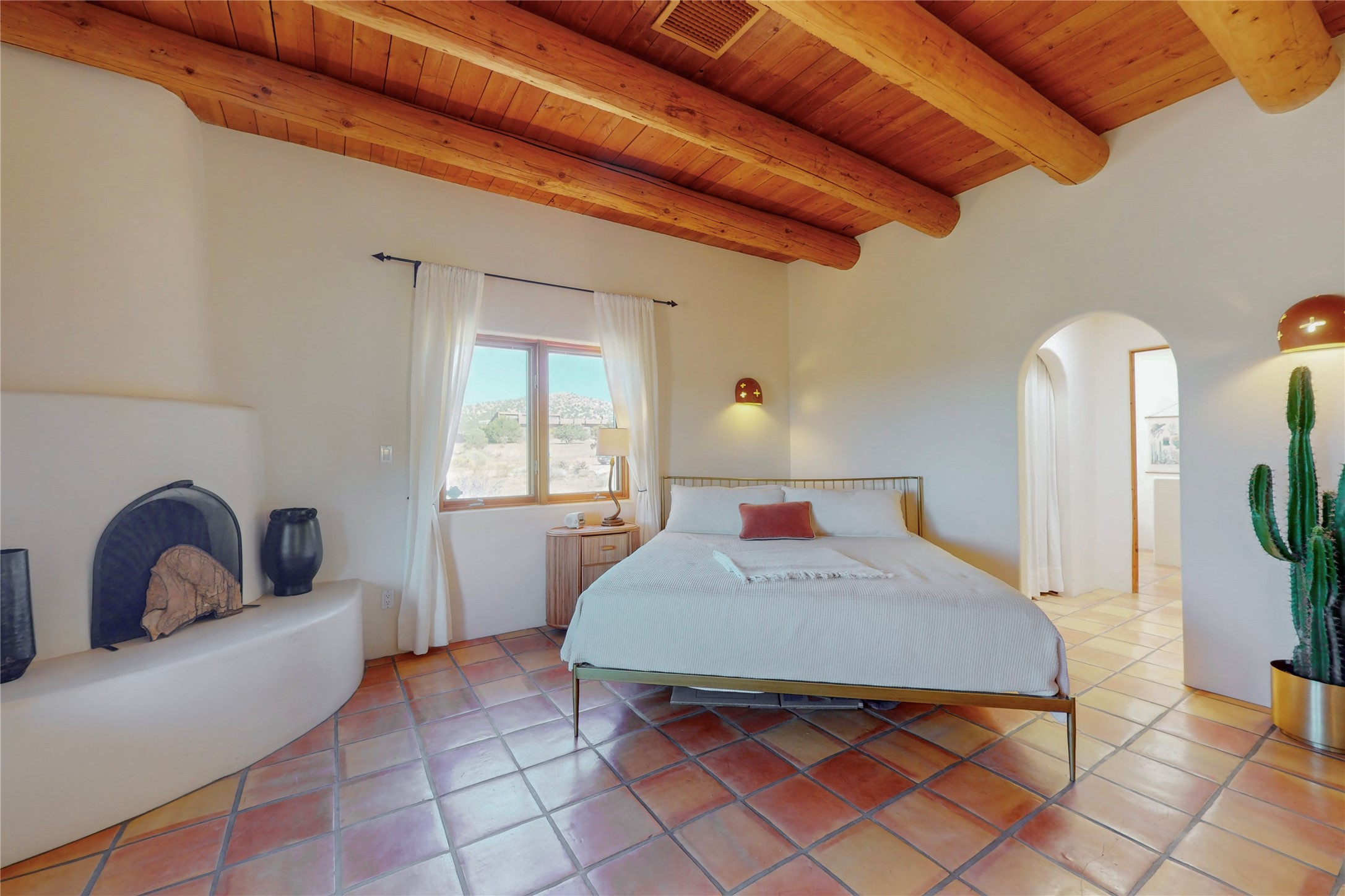 Gracious light open plan, 2230+ sq.ft. split bedroom design built by Adobeworks sitting high up on a cul de sac in Eldorado. Contemporary pueblo with high viga ceilings, dramatic custom kiva fireplace, nichos, corballed beams and tile floors in main living areas. A sunny large kitchen with island and pantry flows to a formal dining area with outside portal for dining with fabulous sweeping sunset mountain vistas . Owners suite features a romantic corner kiva and viga ceilings with a door to a privately walled garden and bath with walk in closet, separate shower and tub. There is a lovely library/music room with a central Rumford style fireplace and 2 bedroom, full bath guest suite. Close to both Eldorado amenities and local community services, trails and shopping plus only minutes into Santa Fe. This home is a must see.