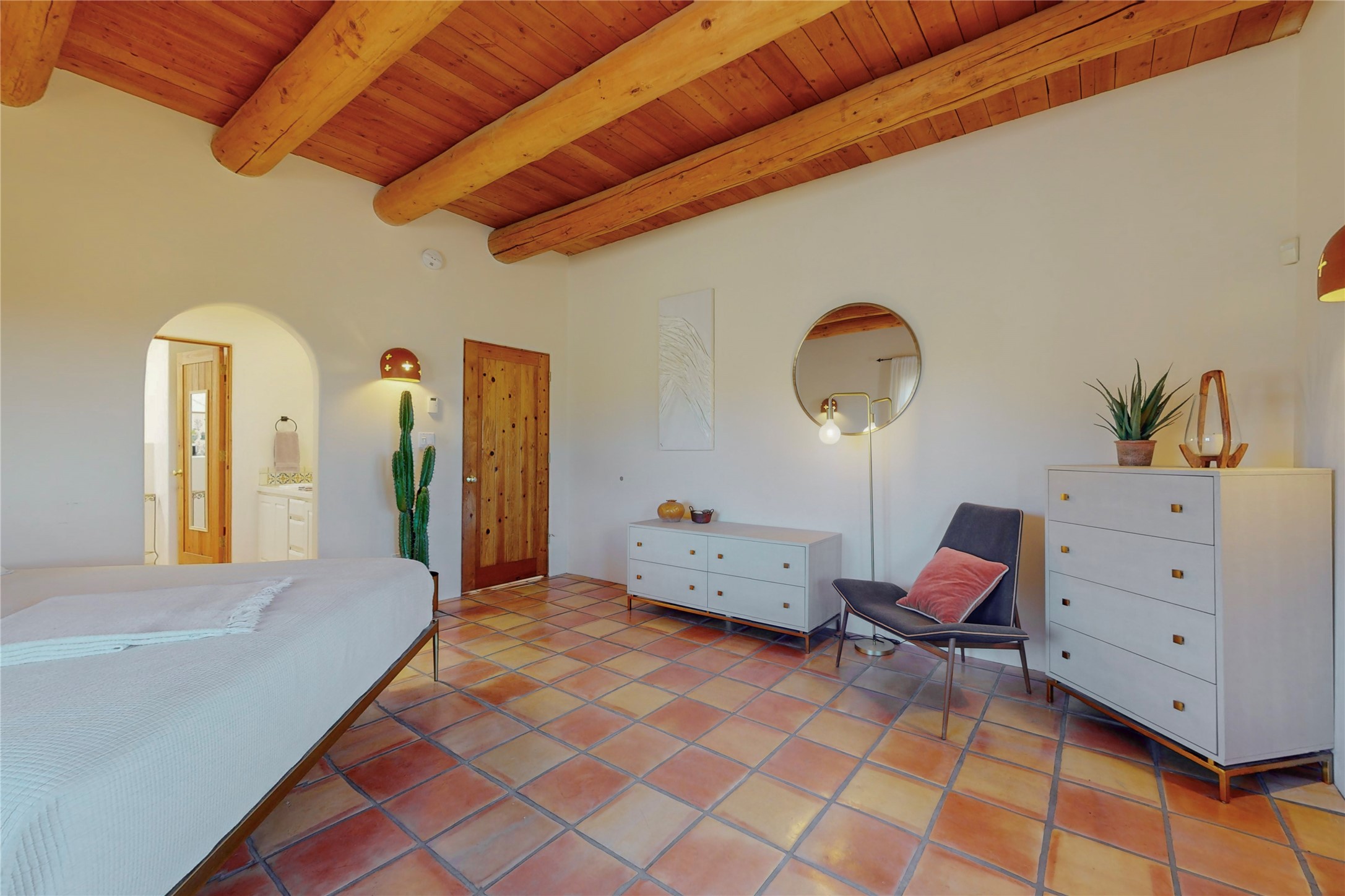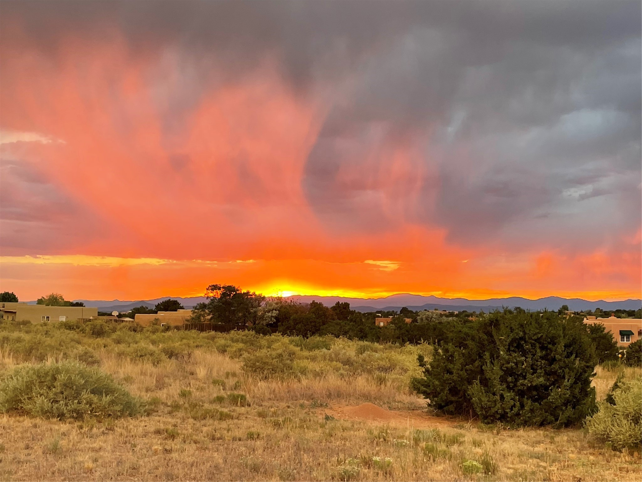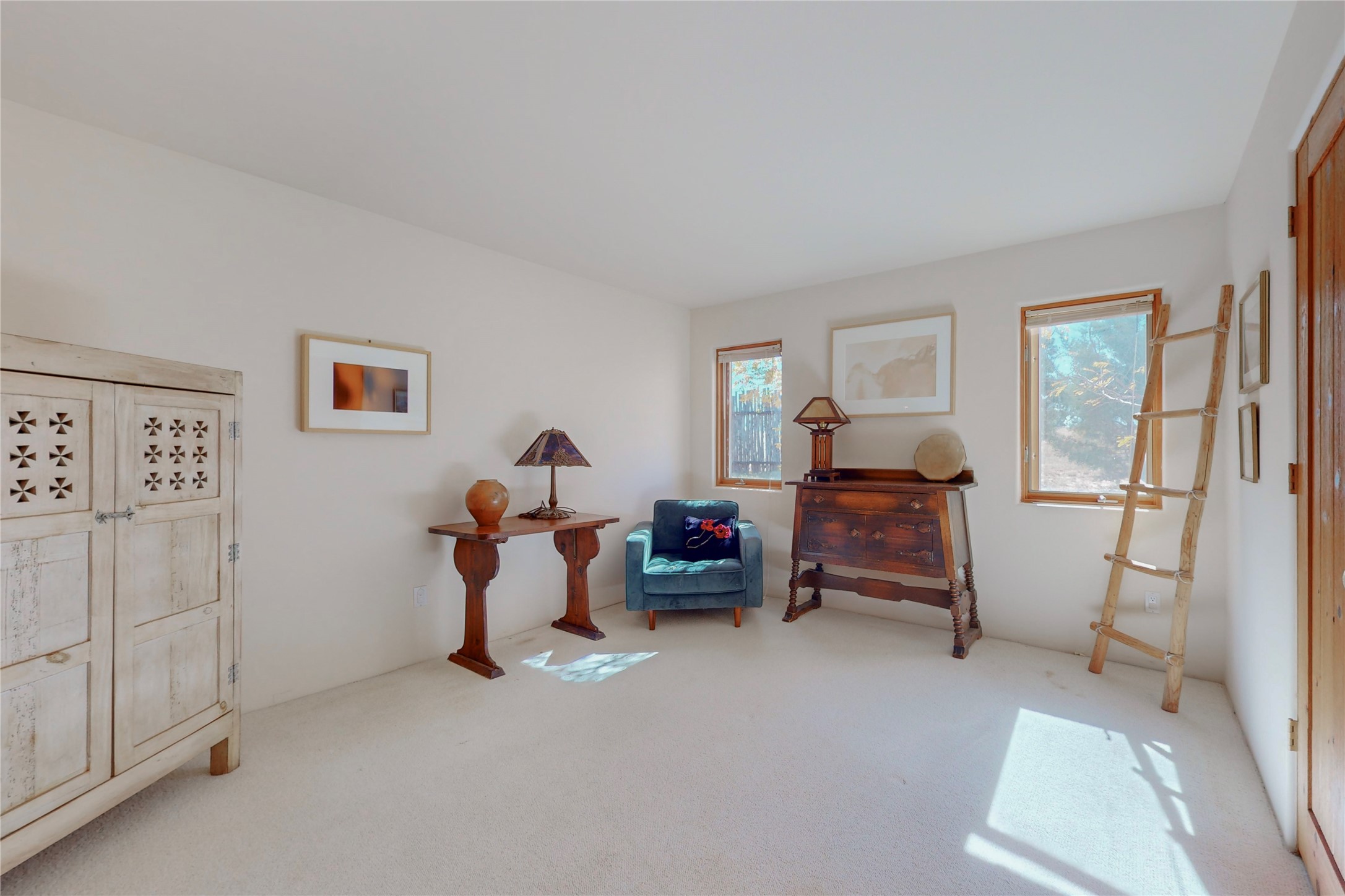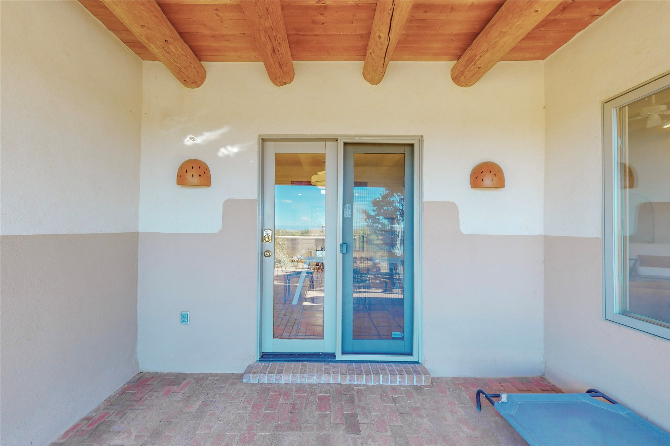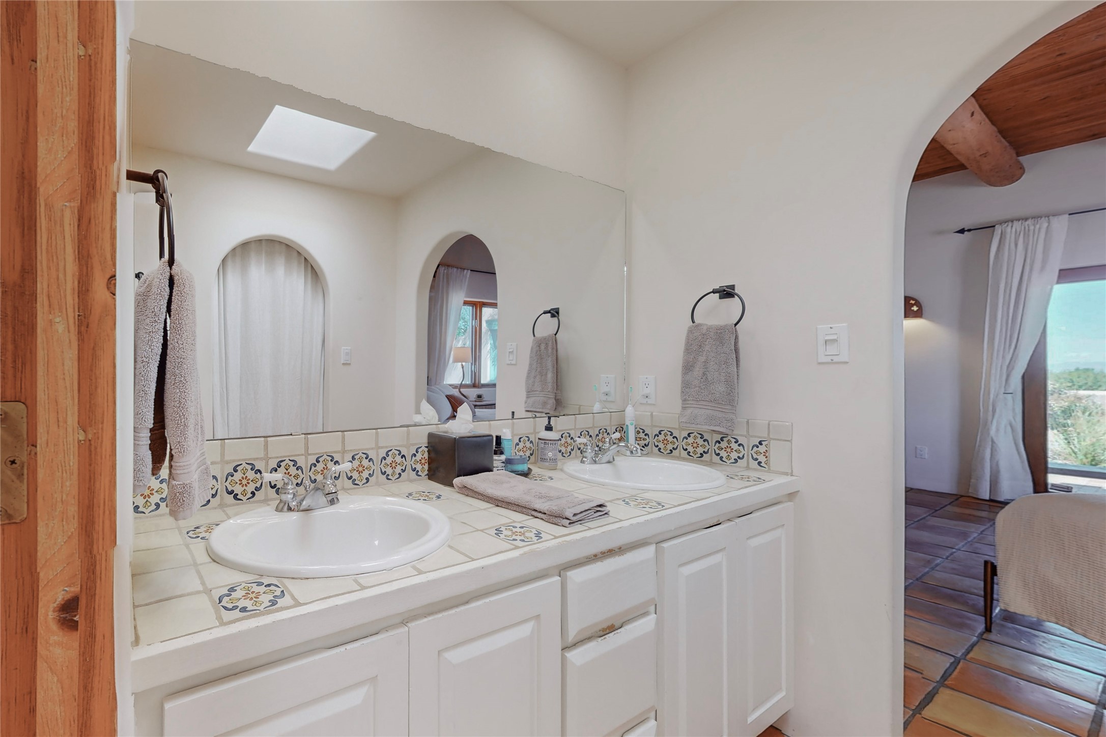 Gracious light open plan, 2230+ sq.ft. split bedroom design built by Adobeworks sitting high up on a cul de sac in Eldorado. Contemporary pueblo with high viga ceilings, dramatic custom kiva fireplace, nichos, corballed beams and tile floors in main living areas. A sunny large kitchen with island and pantry flows to a formal dining area with outside portal for dining with fabulous sweeping sunset mountain vistas . Owners suite features a romantic corner kiva and viga ceilings with a door to a privately walled garden and bath with walk in closet, separate shower and tub. There is a lovely library/music room with a central Rumford style fireplace and 2 bedroom, full bath guest suite. Close to both Eldorado amenities and local community services, trails and shopping plus only minutes into Santa Fe. This home is a must see.