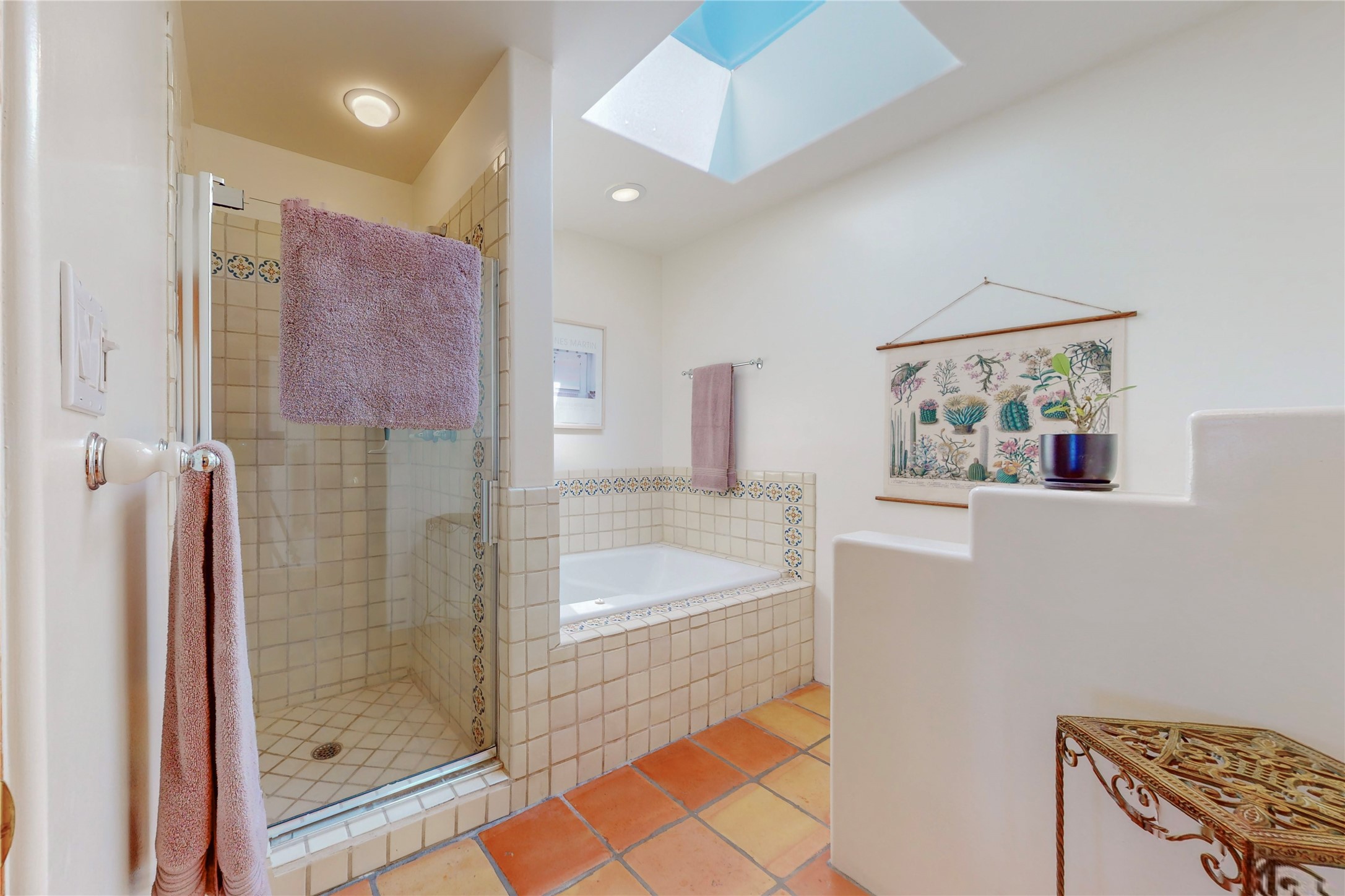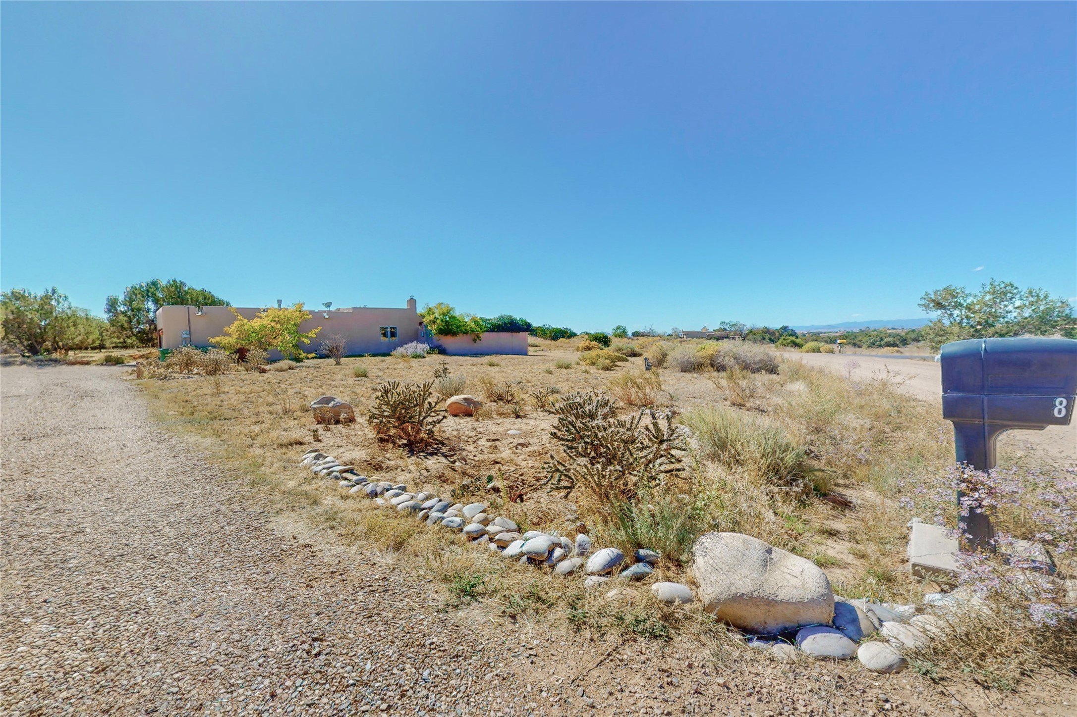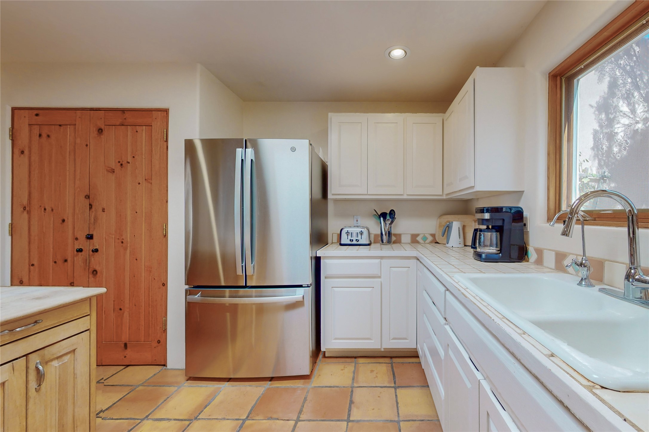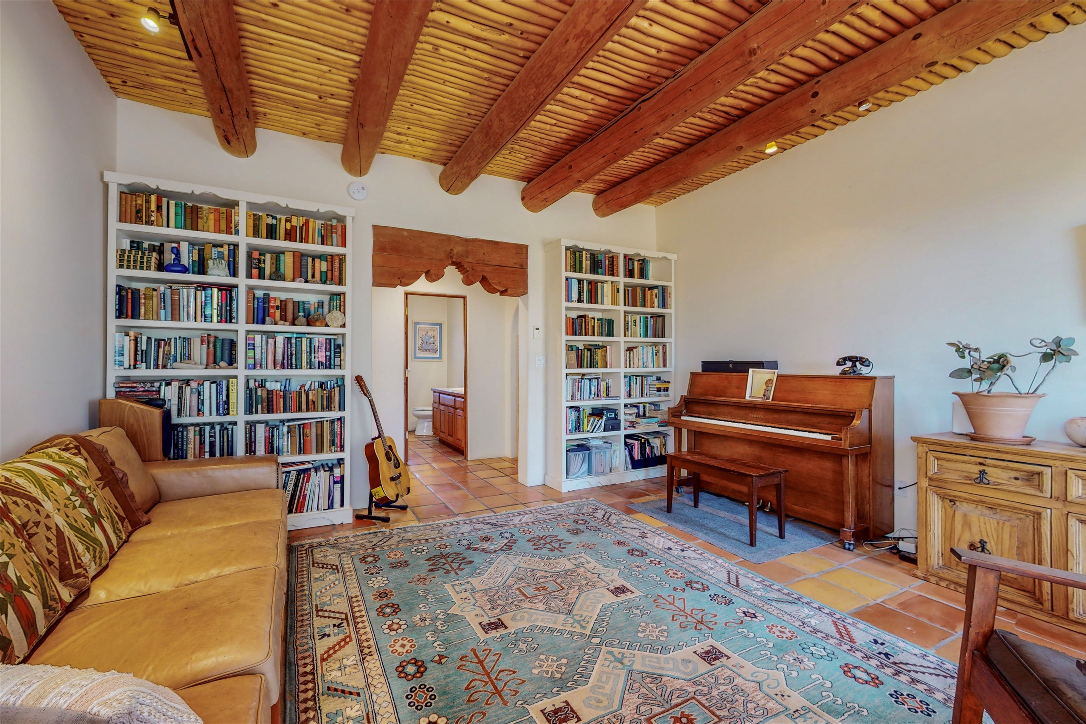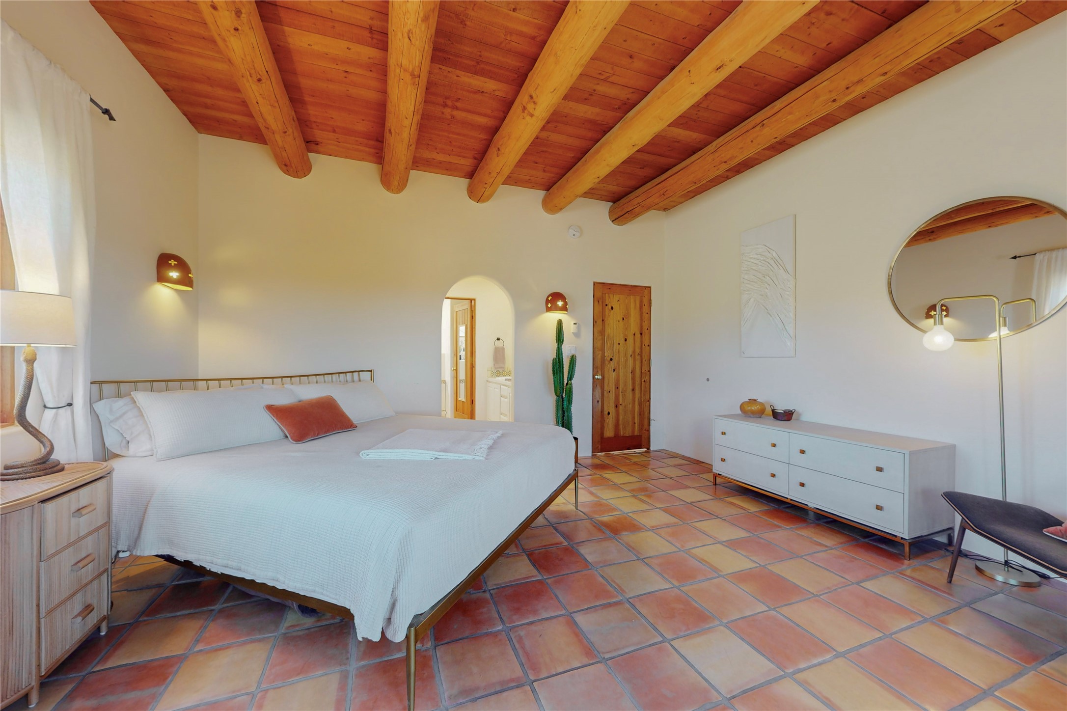 Gracious light open plan, 2230+ sq.ft. split bedroom design built by Adobeworks sitting high up on a cul de sac in Eldorado. Contemporary pueblo with high viga ceilings, dramatic custom kiva fireplace, nichos, corballed beams and tile floors in main living areas. A sunny large kitchen with island and pantry flows to a formal dining area with outside portal for dining with fabulous sweeping sunset mountain vistas . Owners suite features a romantic corner kiva and viga ceilings with a door to a privately walled garden and bath with walk in closet, separate shower and tub. There is a lovely library/music room with a central Rumford style fireplace and 2 bedroom, full bath guest suite. Close to both Eldorado amenities and local community services, trails and shopping plus only minutes into Santa Fe. This home is a must see.