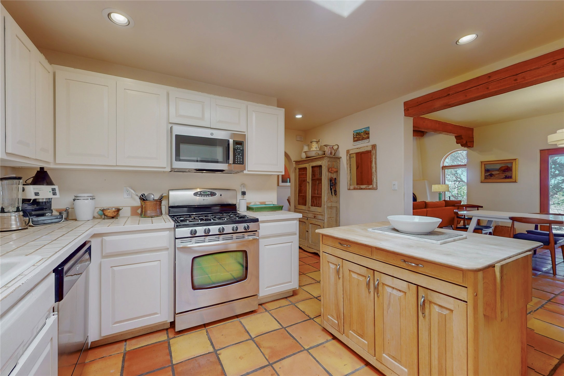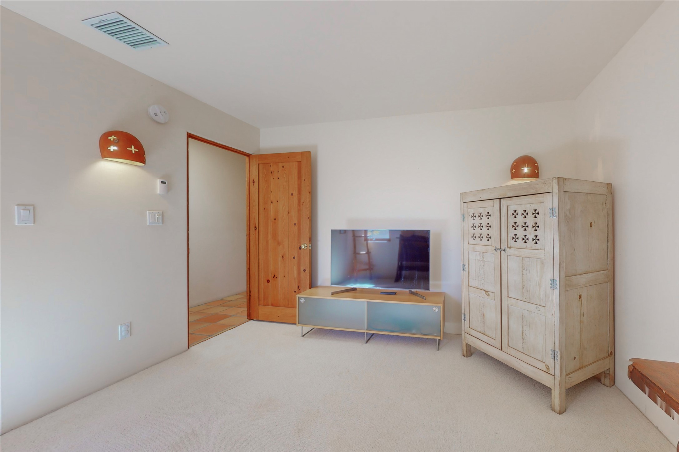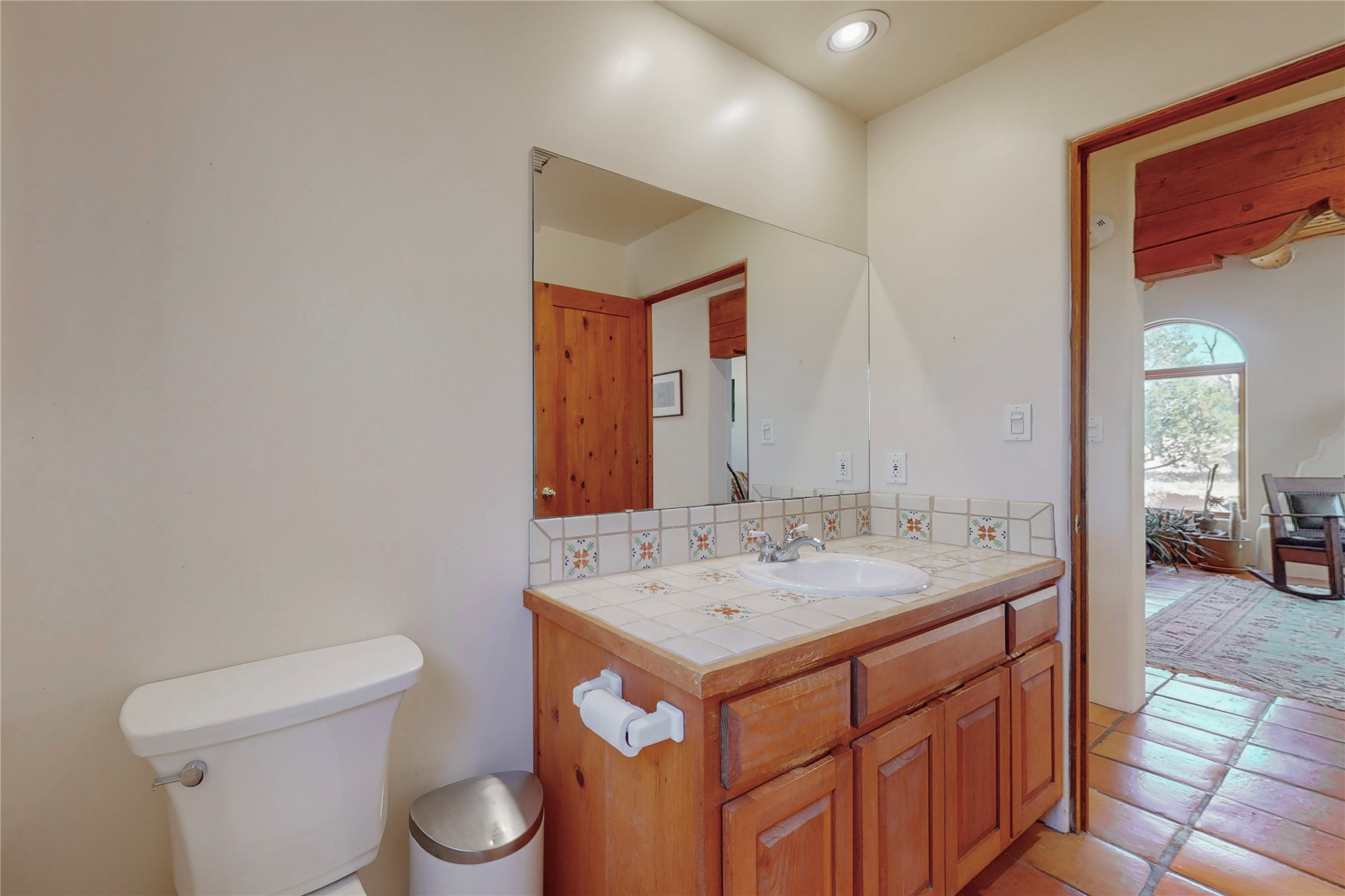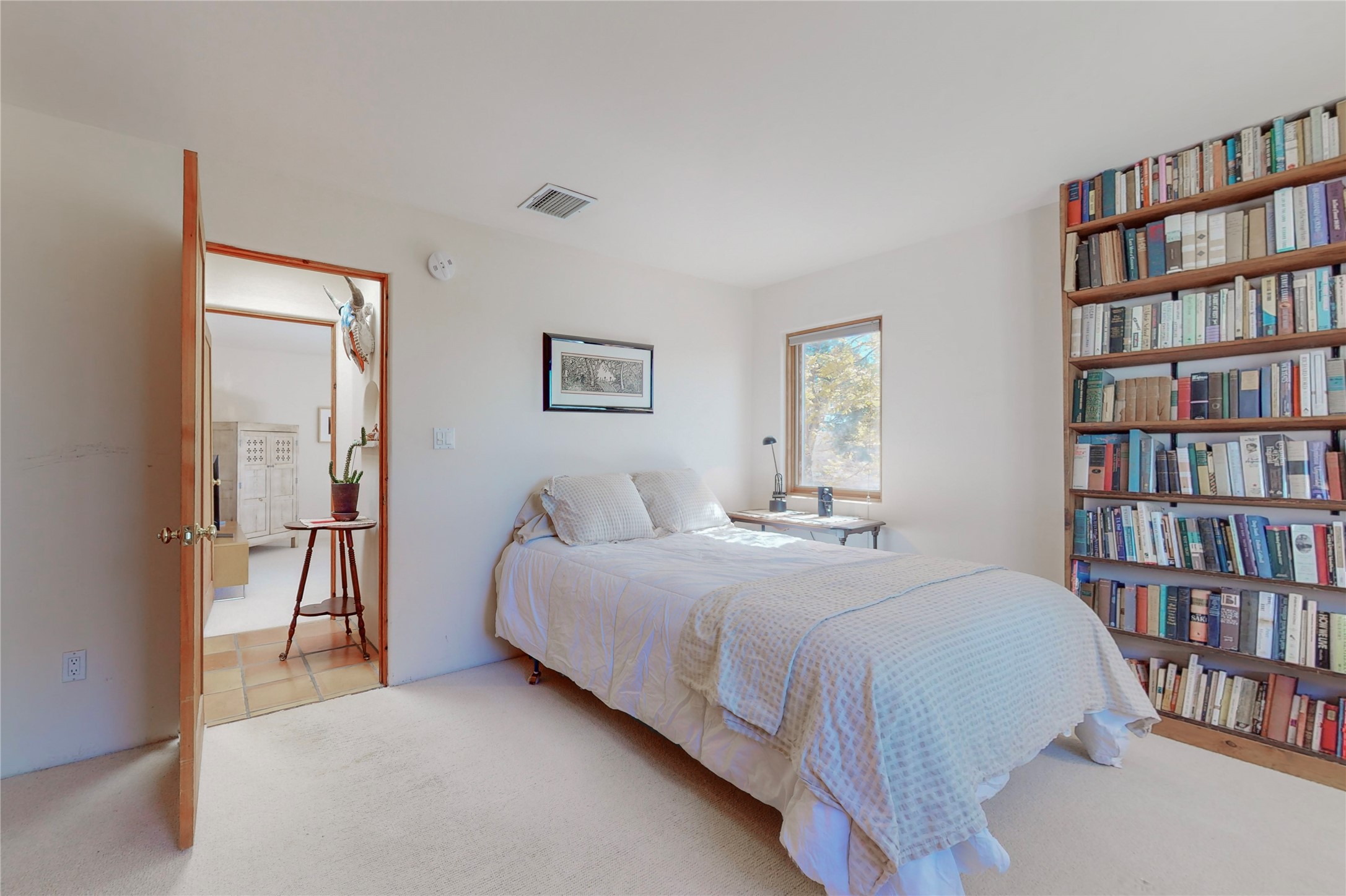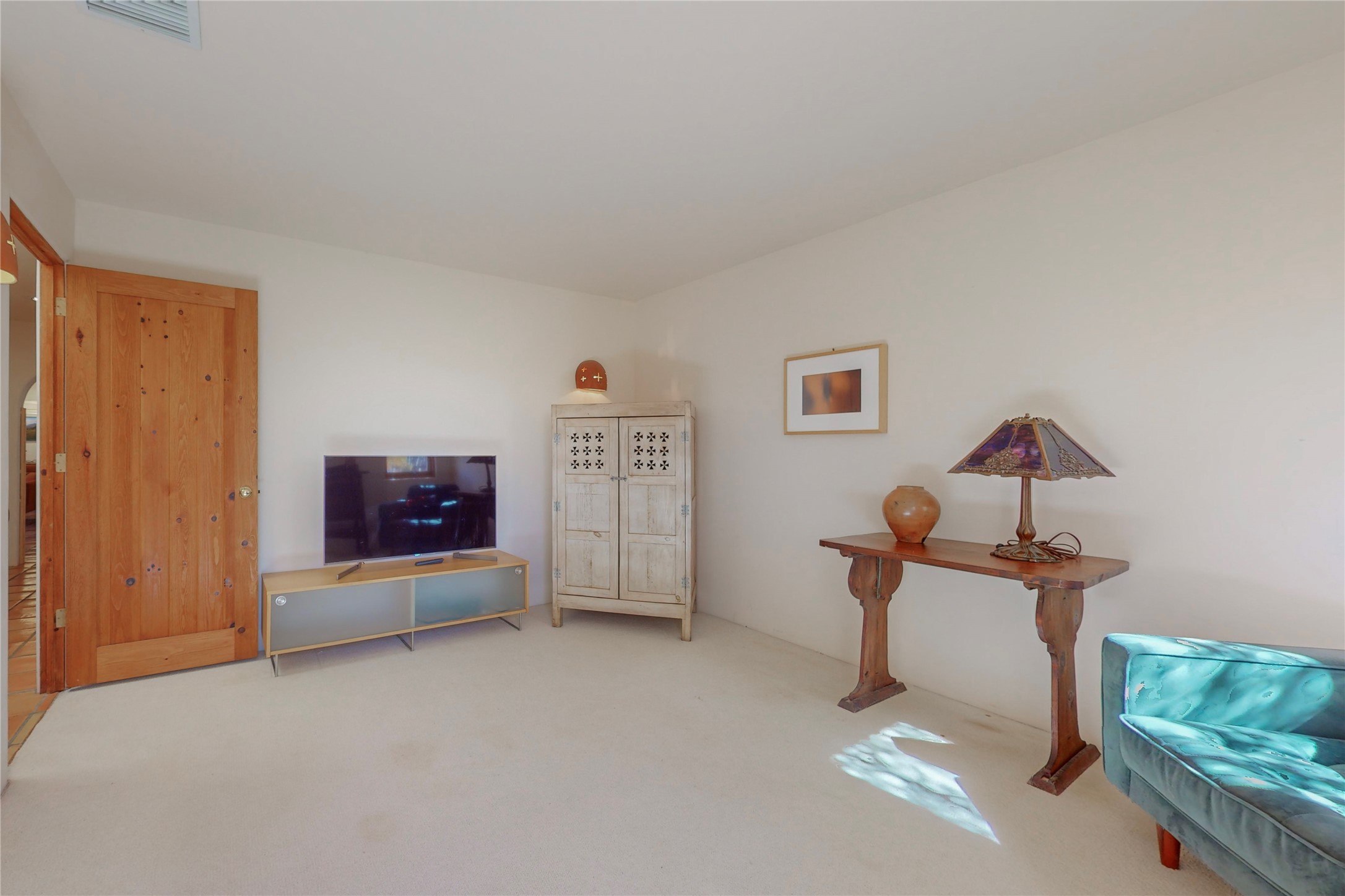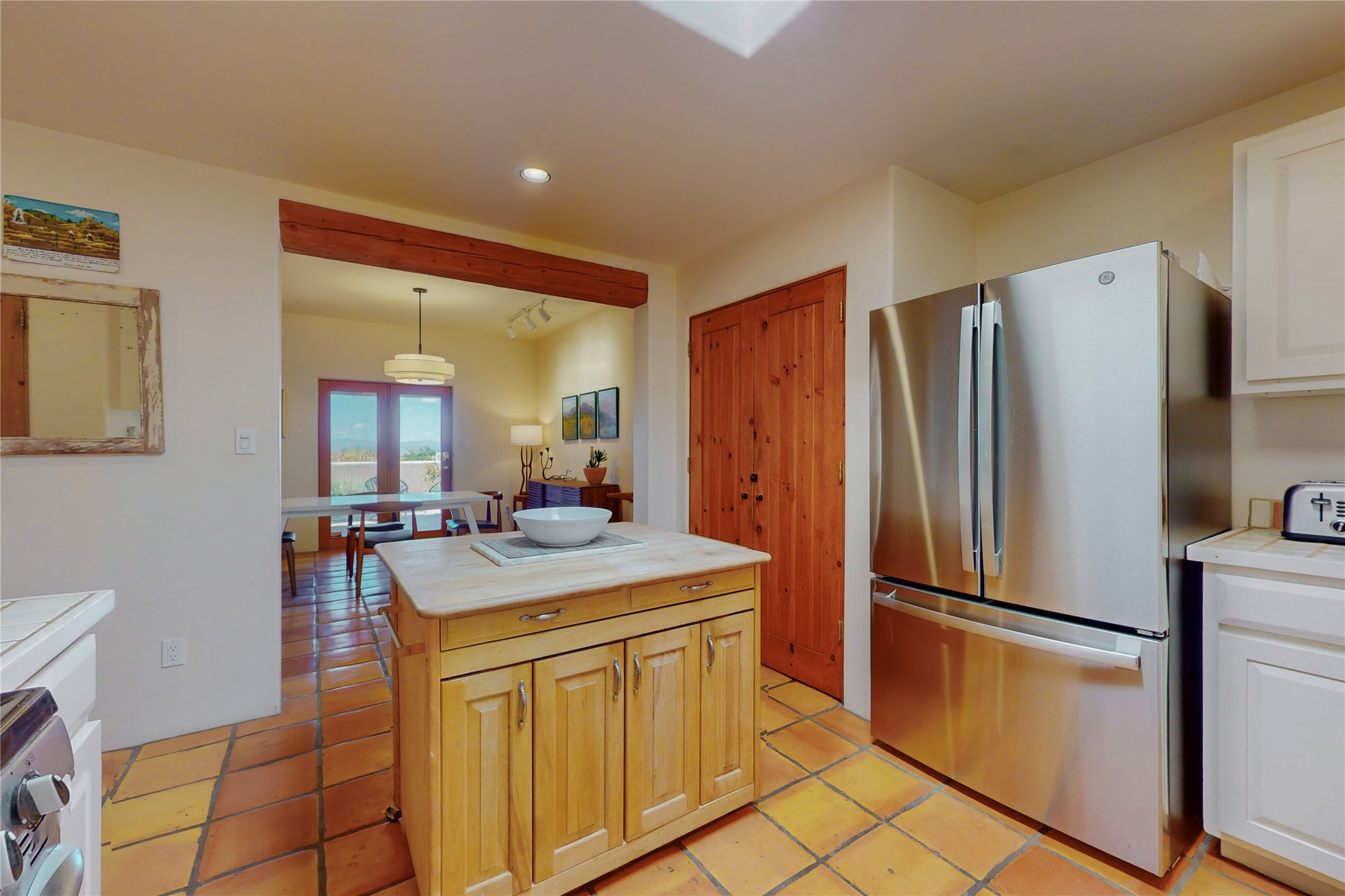 Gracious light open plan, 2230+ sq.ft. split bedroom design built by Adobeworks sitting high up on a cul de sac in Eldorado. Contemporary pueblo with high viga ceilings, dramatic custom kiva fireplace, nichos, corballed beams and tile floors in main living areas. A sunny large kitchen with island and pantry flows to a formal dining area with outside portal for dining with fabulous sweeping sunset mountain vistas . Owners suite features a romantic corner kiva and viga ceilings with a door to a privately walled garden and bath with walk in closet, separate shower and tub. There is a lovely library/music room with a central Rumford style fireplace and 2 bedroom, full bath guest suite. Close to both Eldorado amenities and local community services, trails and shopping plus only minutes into Santa Fe. This home is a must see.