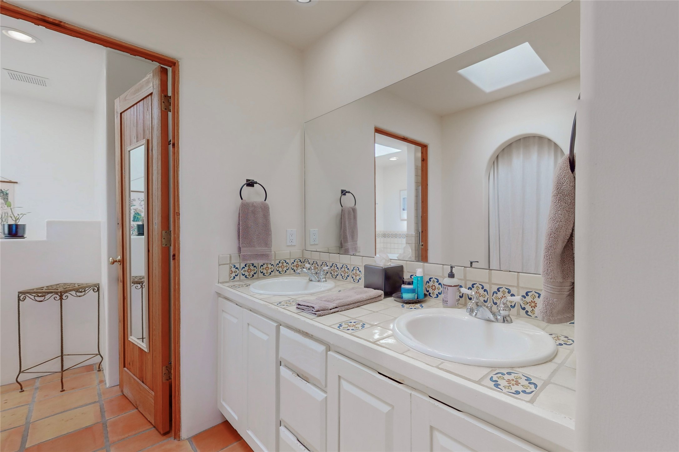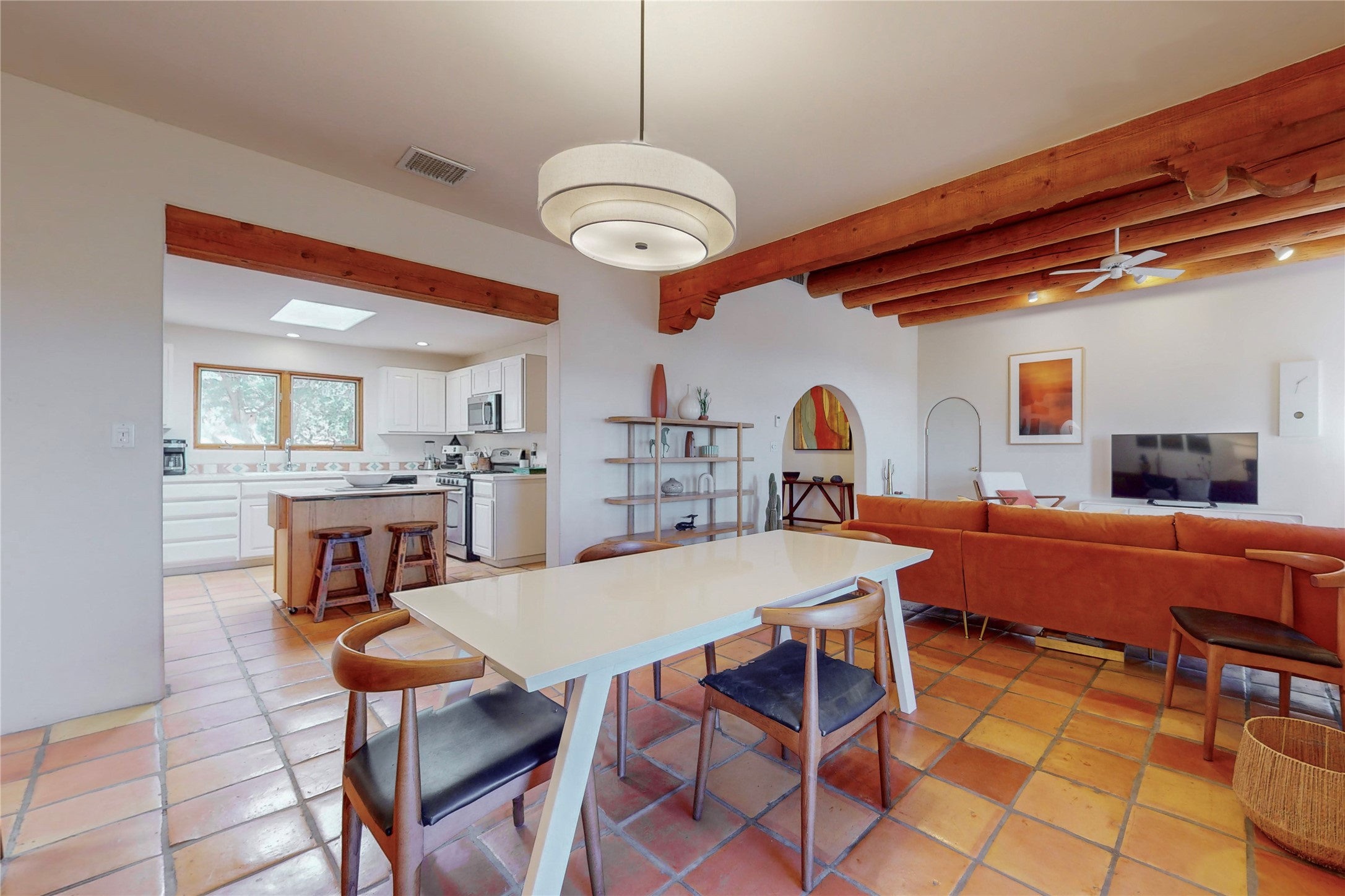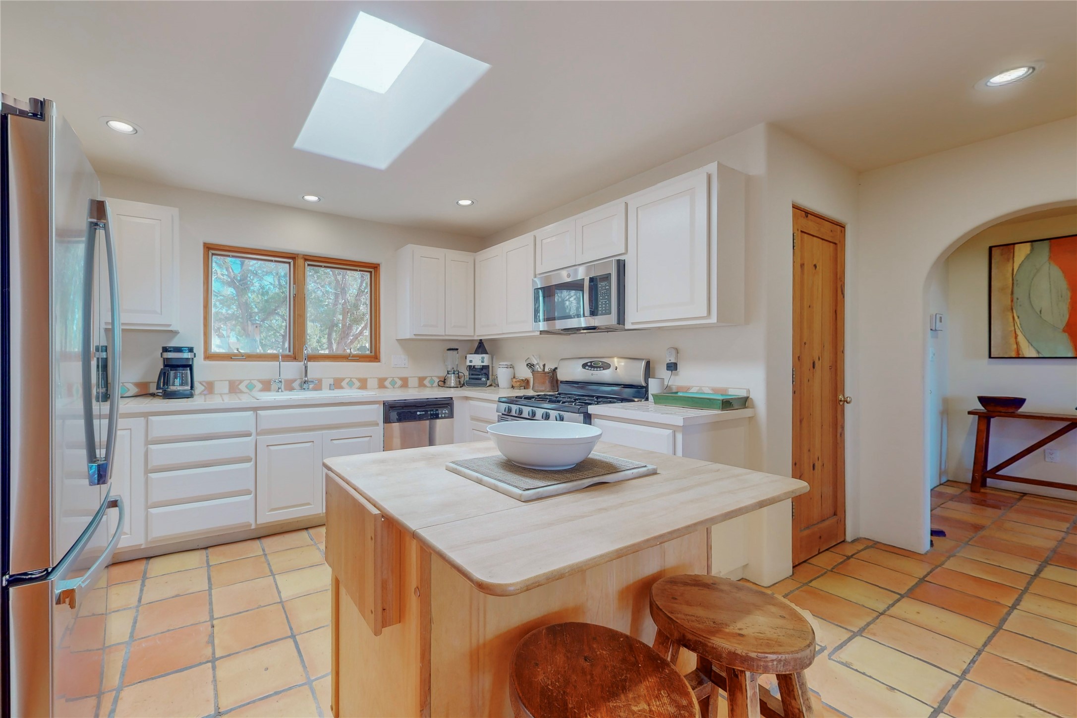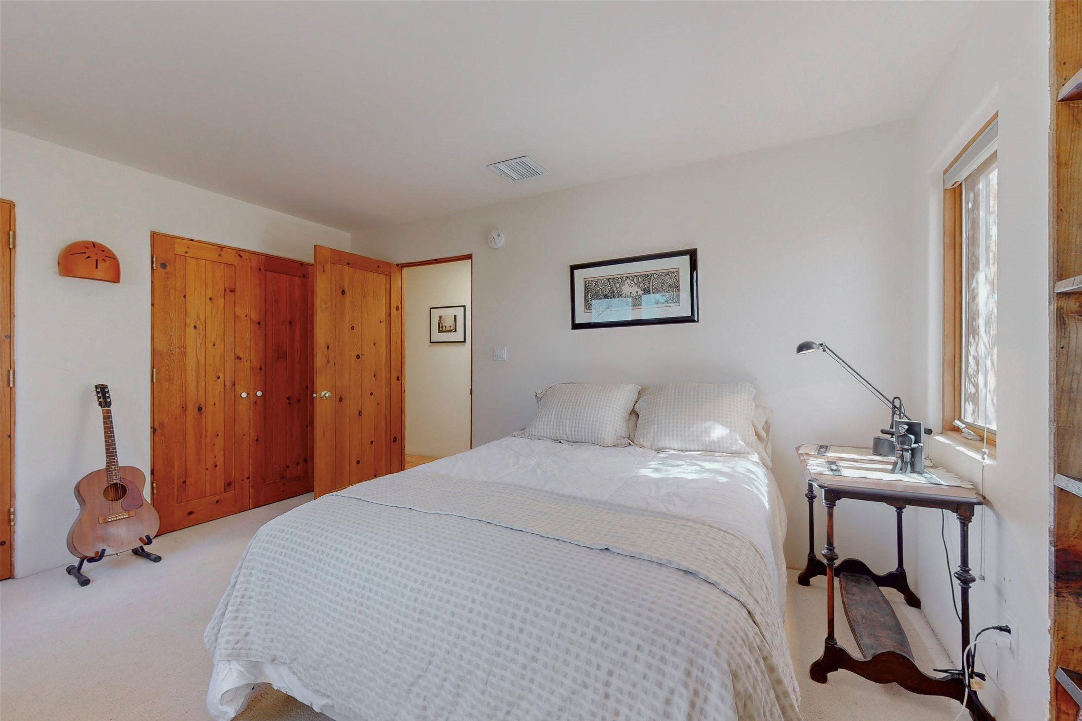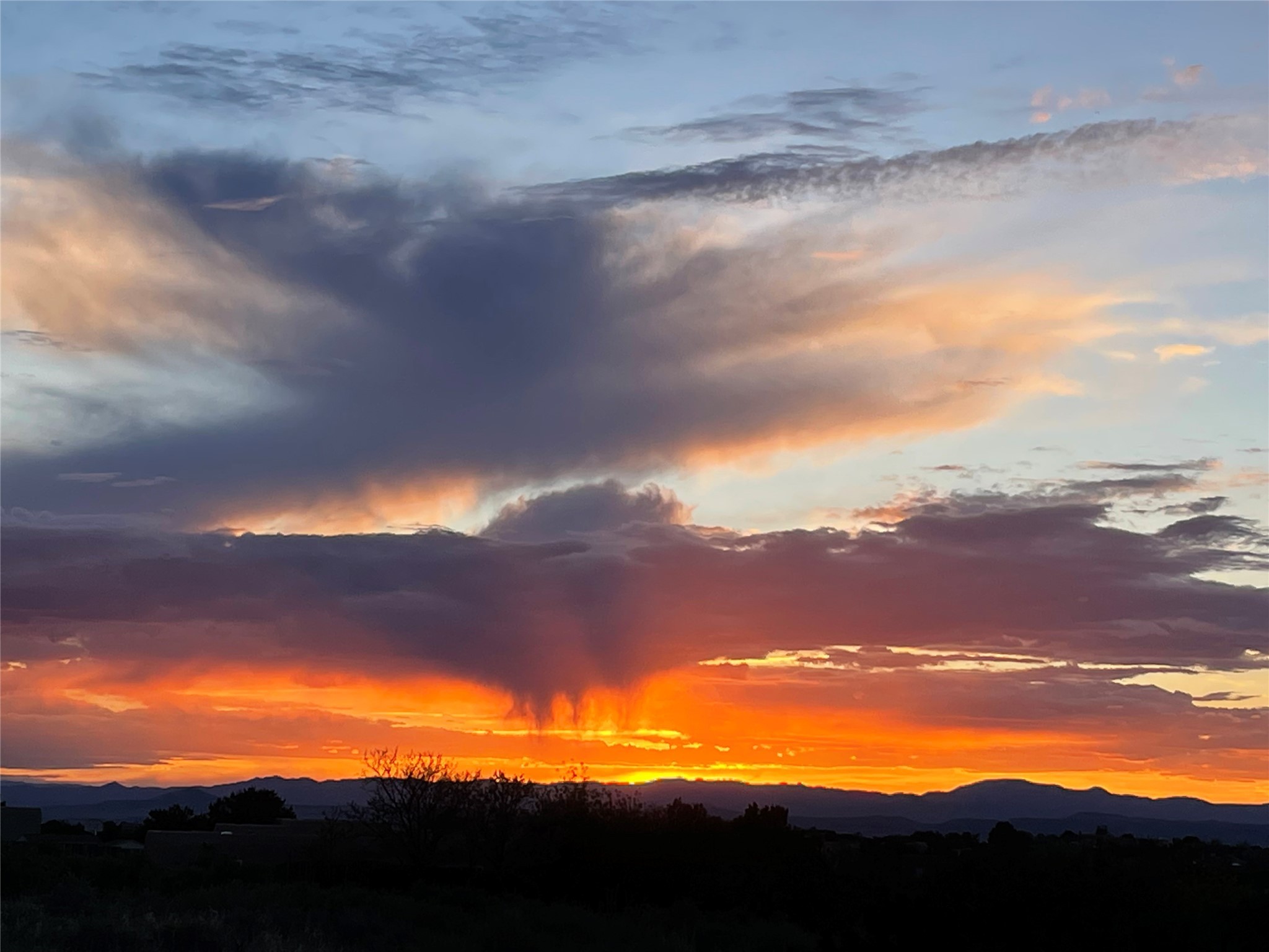 Gracious light open plan, 2230+ sq.ft. split bedroom design built by Adobeworks sitting high up on a cul de sac in Eldorado. Contemporary pueblo with high viga ceilings, dramatic custom kiva fireplace, nichos, corballed beams and tile floors in main living areas. A sunny large kitchen with island and pantry flows to a formal dining area with outside portal for dining with fabulous sweeping sunset mountain vistas . Owners suite features a romantic corner kiva and viga ceilings with a door to a privately walled garden and bath with walk in closet, separate shower and tub. There is a lovely library/music room with a central Rumford style fireplace and 2 bedroom, full bath guest suite. Close to both Eldorado amenities and local community services, trails and shopping plus only minutes into Santa Fe. This home is a must see.