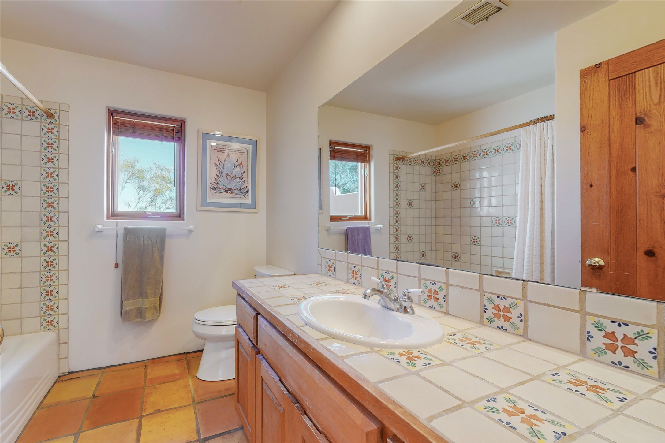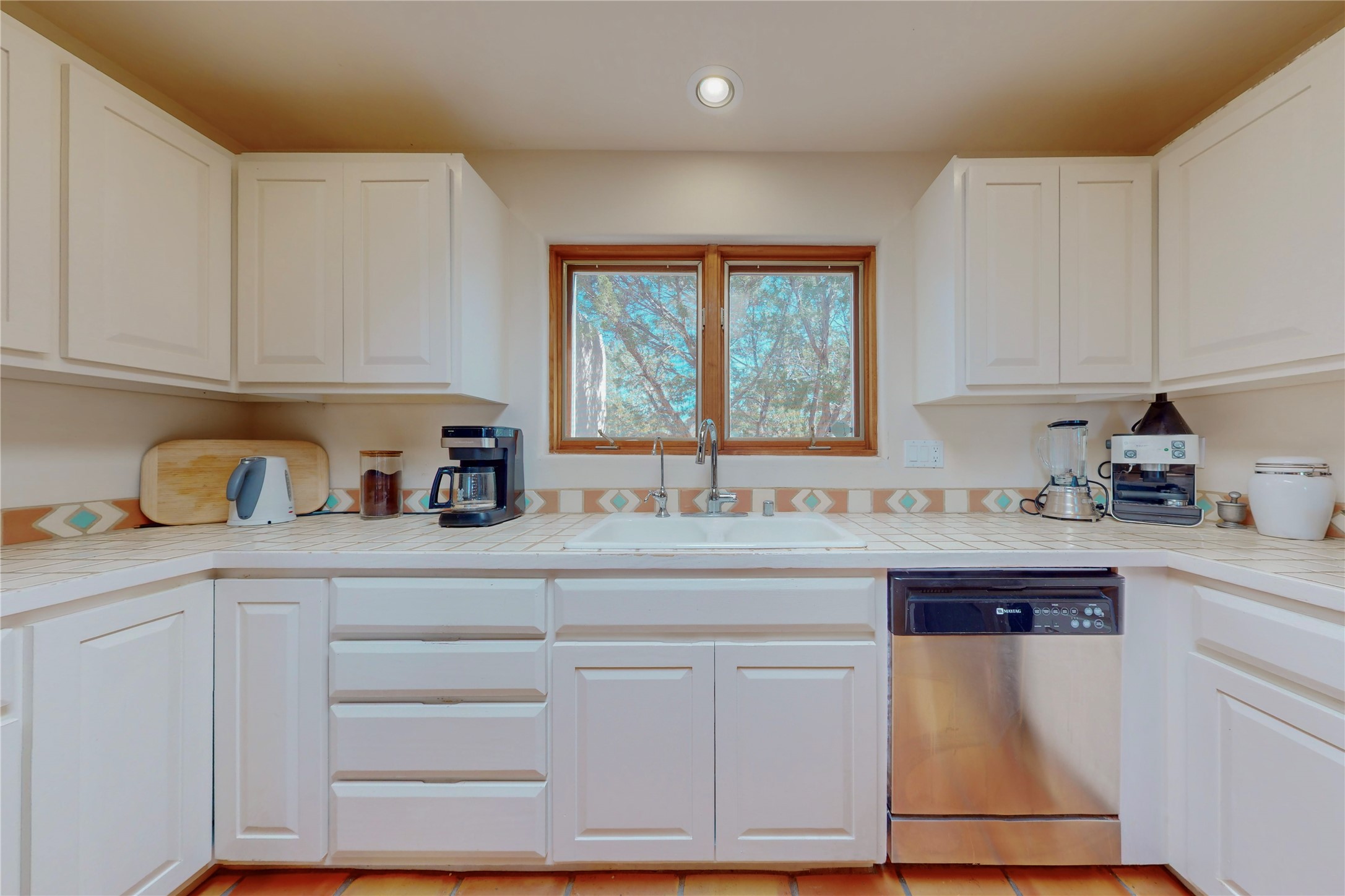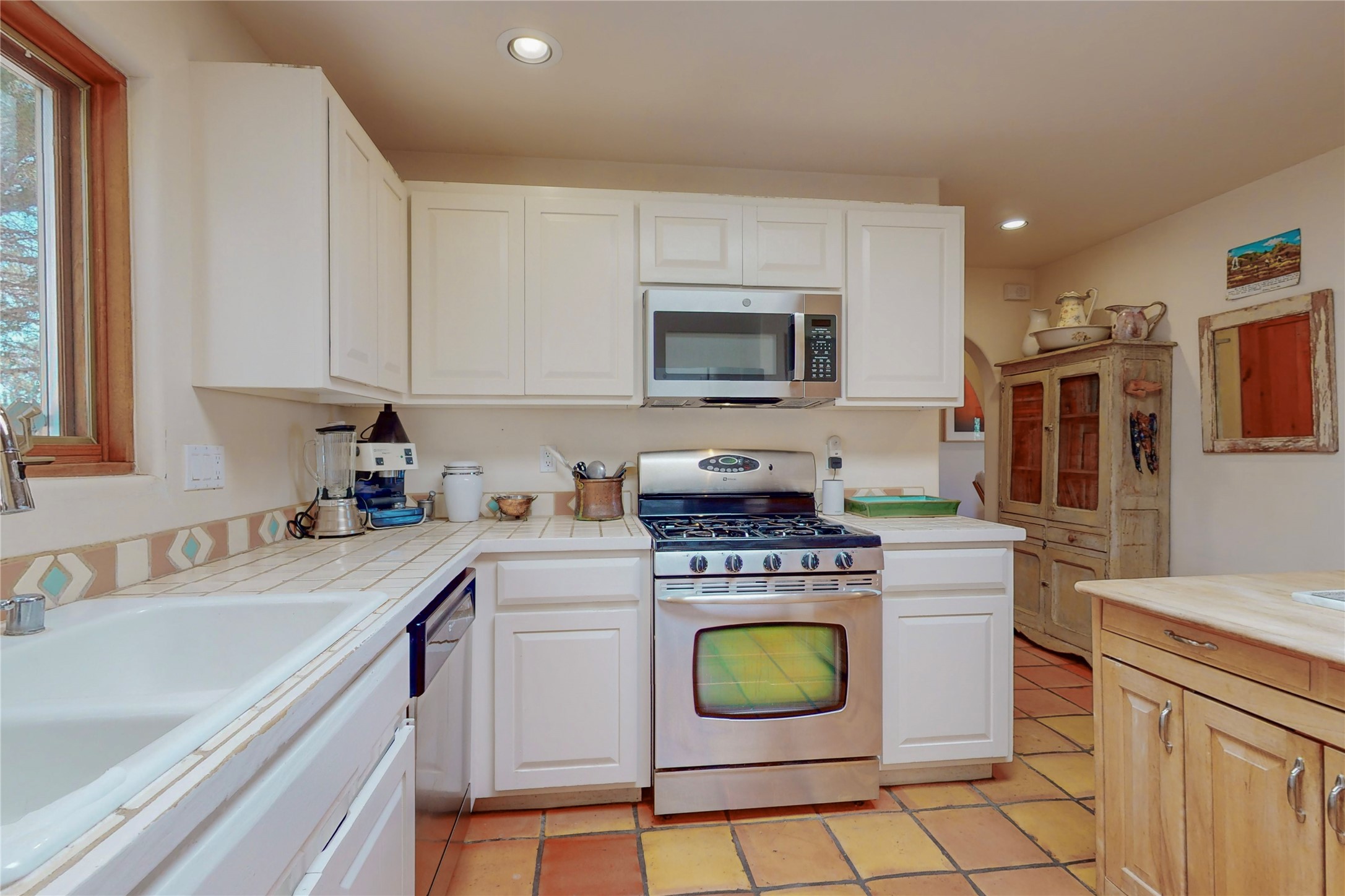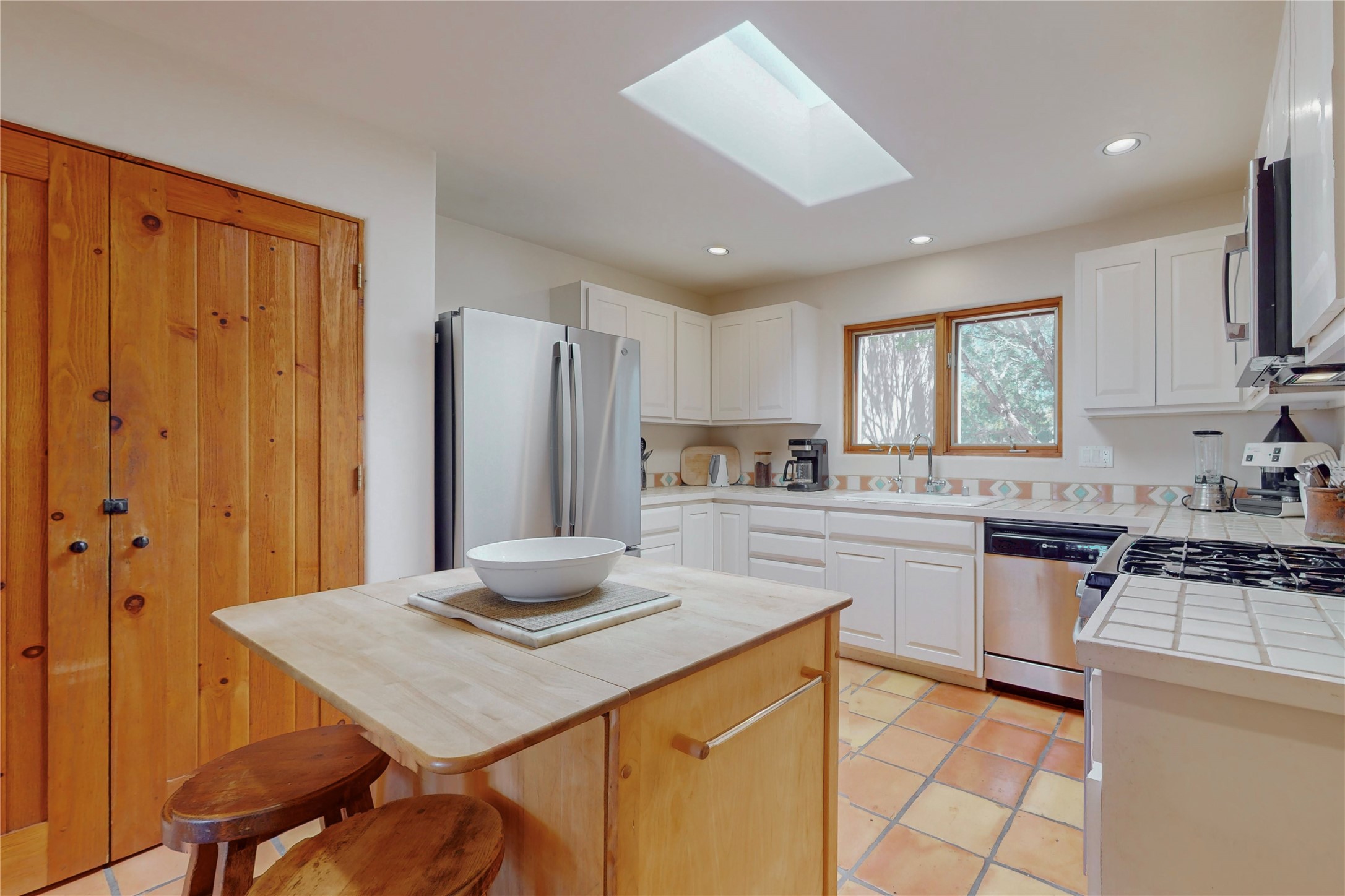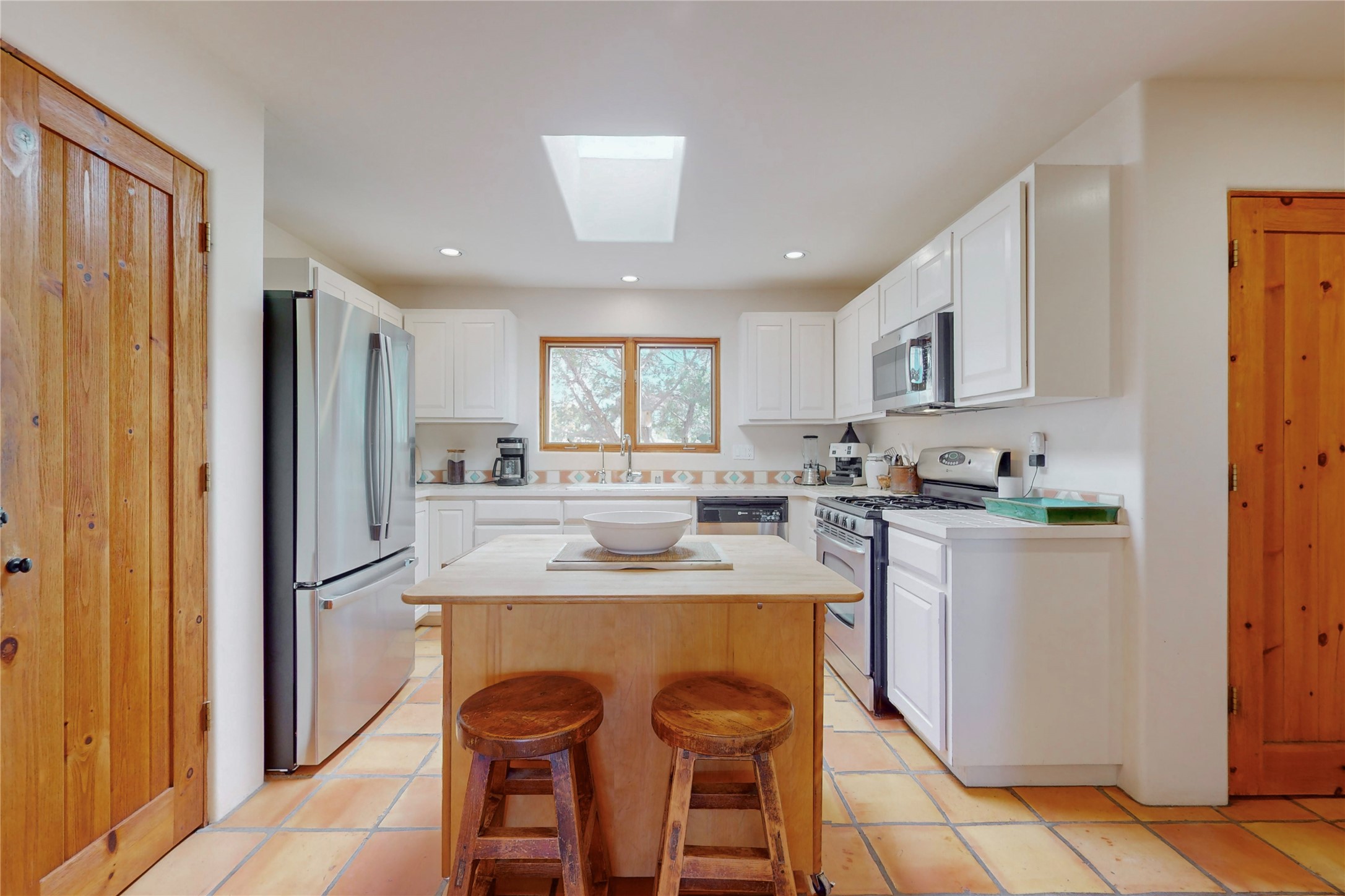 Gracious light open plan, 2230+ sq.ft. split bedroom design built by Adobeworks sitting high up on a cul de sac in Eldorado. Contemporary pueblo with high viga ceilings, dramatic custom kiva fireplace, nichos, corballed beams and tile floors in main living areas. A sunny large kitchen with island and pantry flows to a formal dining area with outside portal for dining with fabulous sweeping sunset mountain vistas . Owners suite features a romantic corner kiva and viga ceilings with a door to a privately walled garden and bath with walk in closet, separate shower and tub. There is a lovely library/music room with a central Rumford style fireplace and 2 bedroom, full bath guest suite. Close to both Eldorado amenities and local community services, trails and shopping plus only minutes into Santa Fe. This home is a must see.