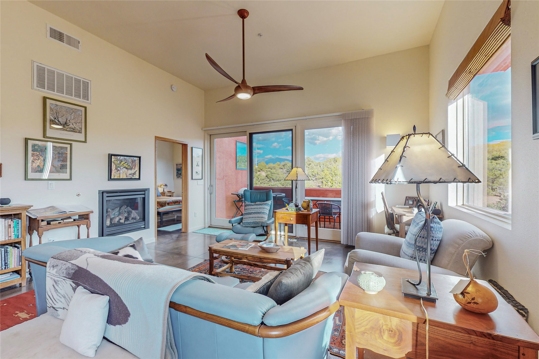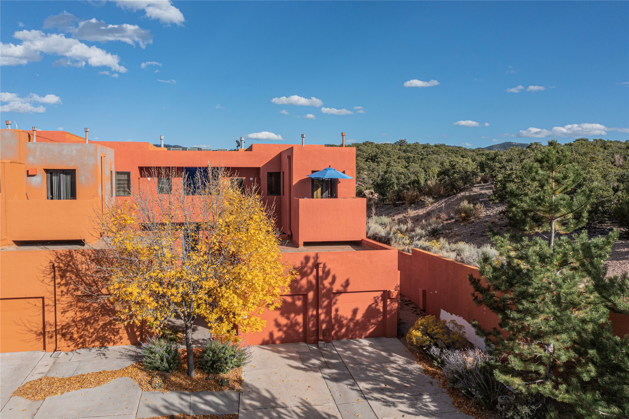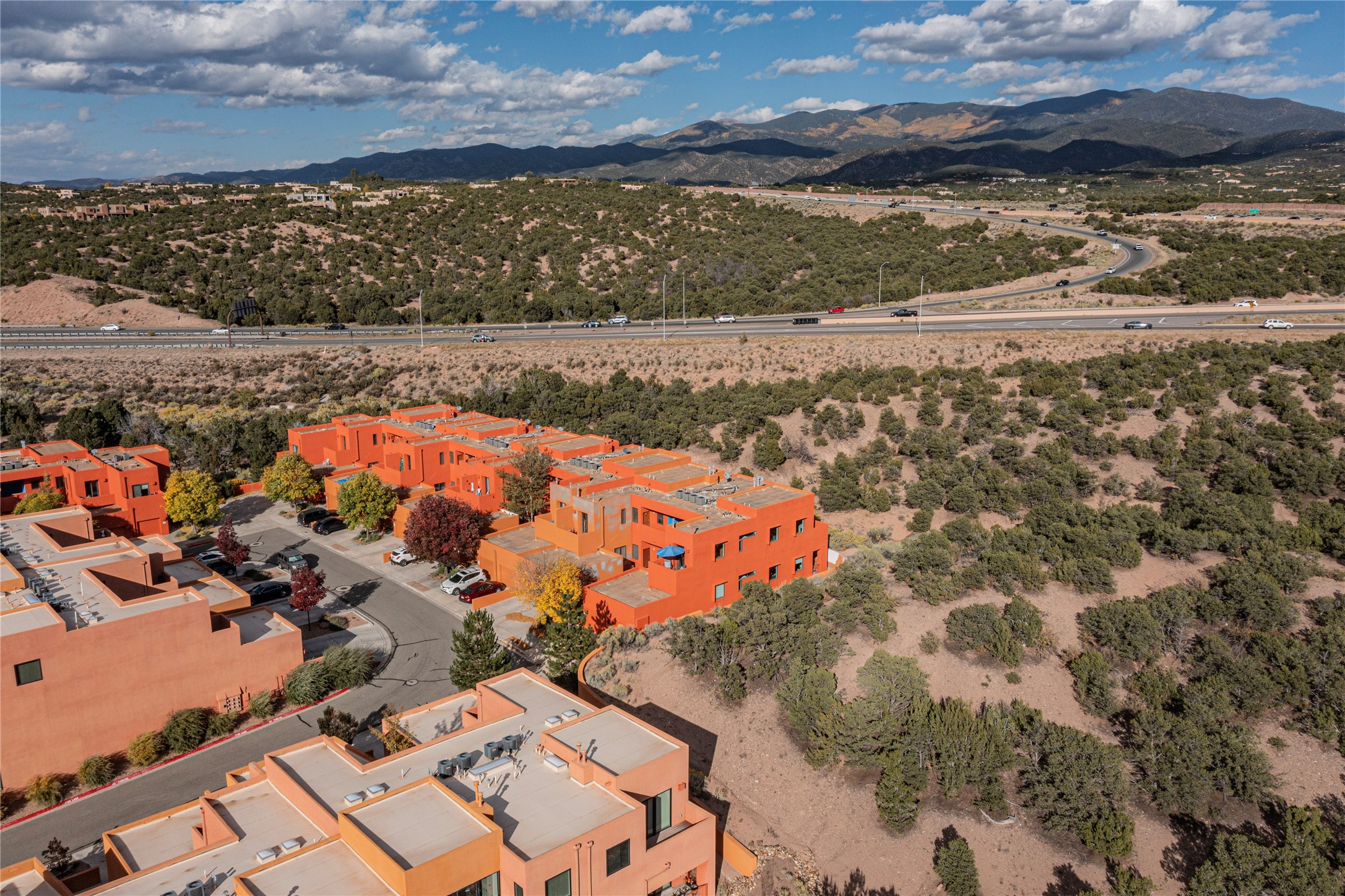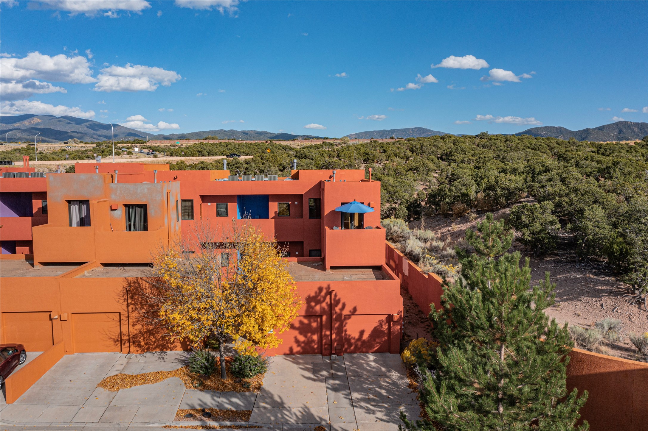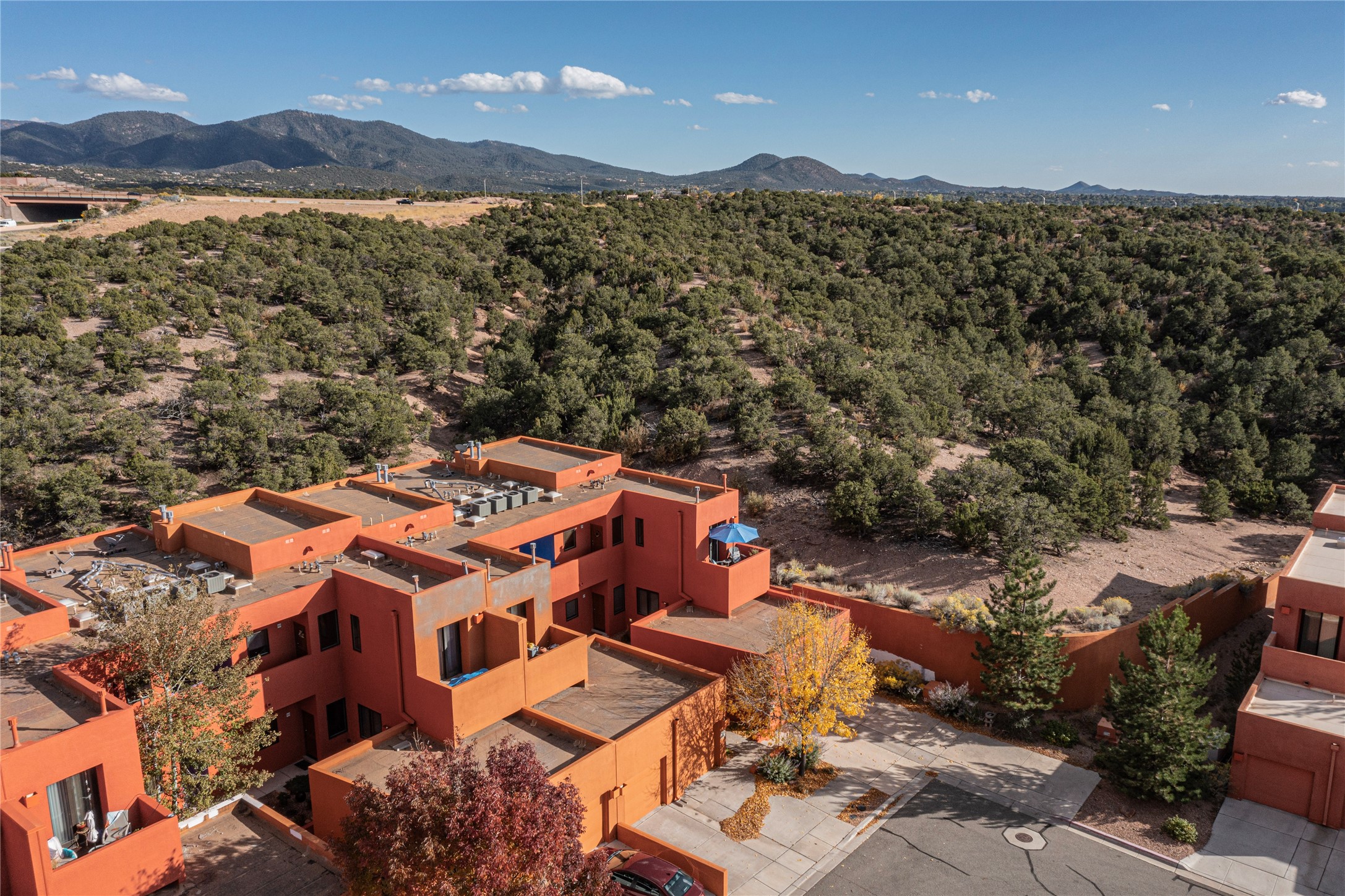 Rare end unit in coveted Zocalo in northside Santa Fe, convenient to 599 bypass, minutes to both the Santa Fe Opera and downtown. This beautifully-maintained 2-bedroom, 1 3/4 bath condo is full of light, private, and has decks at both ends, with mountain and sunset views! Huge south windows overlook peaceful undeveloped hillsides, tall glass sliding doors at both ends bring the beauty of the landscape inside. Modern design by award-winning architect Ricard Legoretta emphasizes clean lines, high ceilings and flowing spaces, giving a spacious feel. Gas fireplace built into wall in great room for cozy relaxing. Split bedroom design with spa-like ensuite in main bedroom including soaking tub and tiled, glass-walled shower, plus walk-in closet for plenty of storage. Second bedroom boasts its own deck with lovely views and seating area. Stackable washer and dryer in closet off front hall; kitchen includes a breakfast bar. New custom window treatments, MinkaAire silent ceiling fans, easy-care polished and tinted concrete floors have been re-sealed in most rooms, new refrigerator and sink/ faucet in kitchen, wood sash and trim refinished throughout--this condo has been tended with love and care by an experienced home renovator! Condo includes detached, oversized one-car garage plus another parking space. Zocalo amenities include security, landscaping and exterior maintenance, beautiful clubhouse with two gyms, pool, soaking tub, courtyard with fountain, and covered patio with a bbq.
