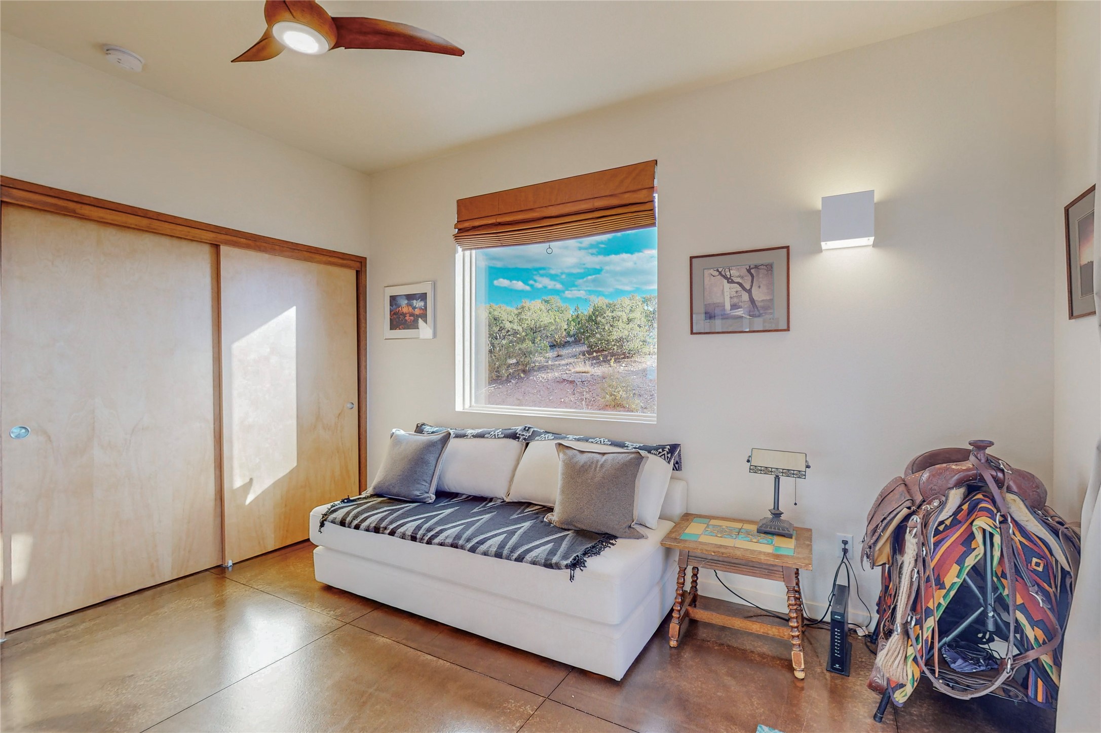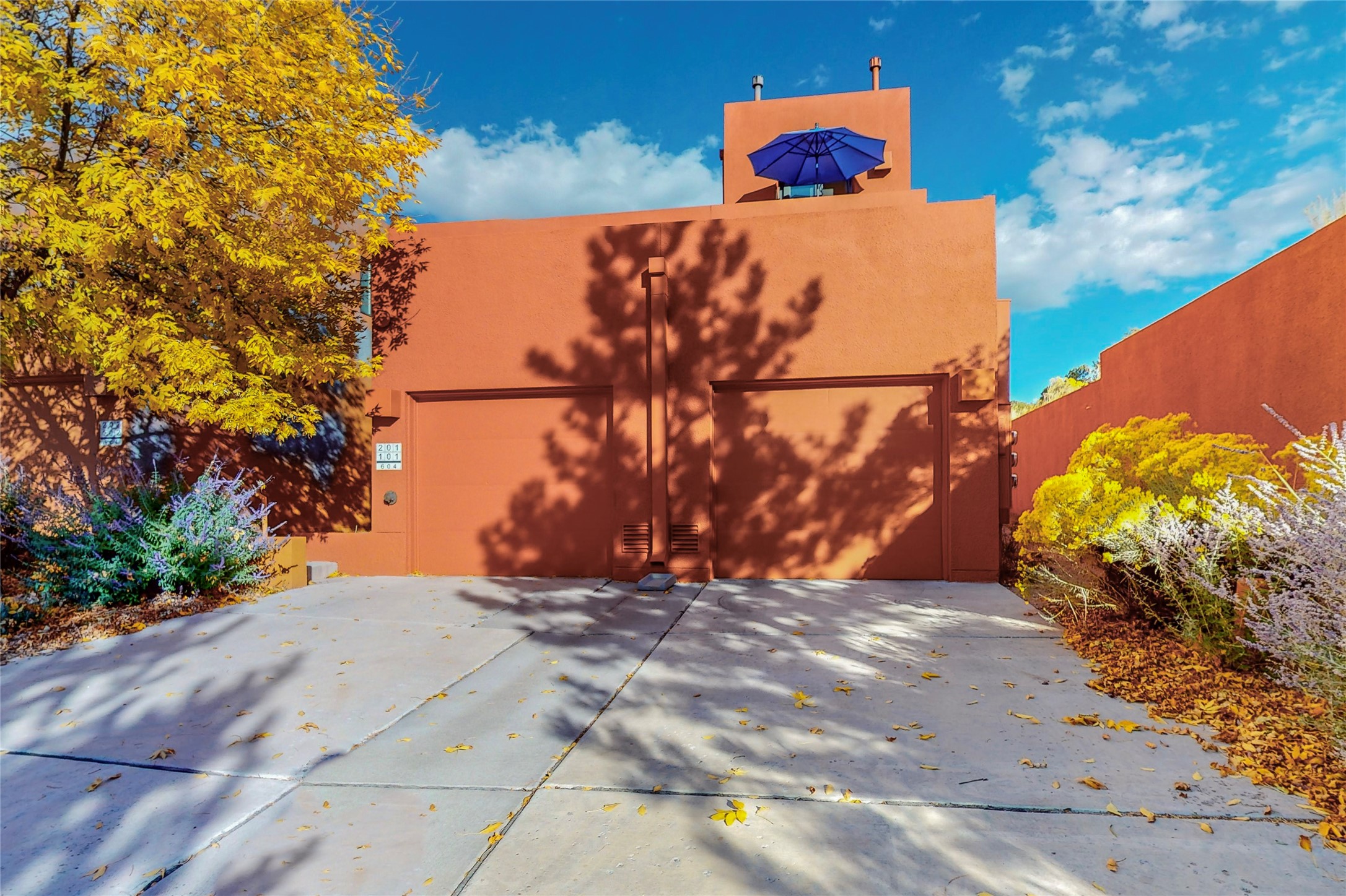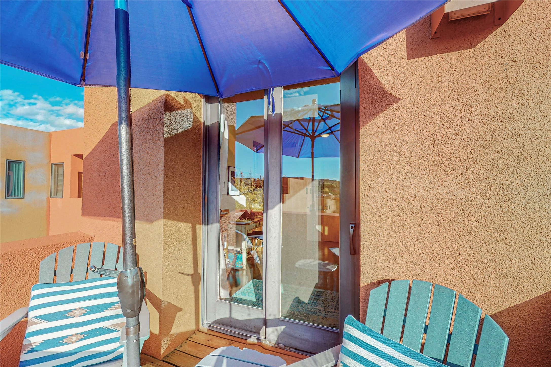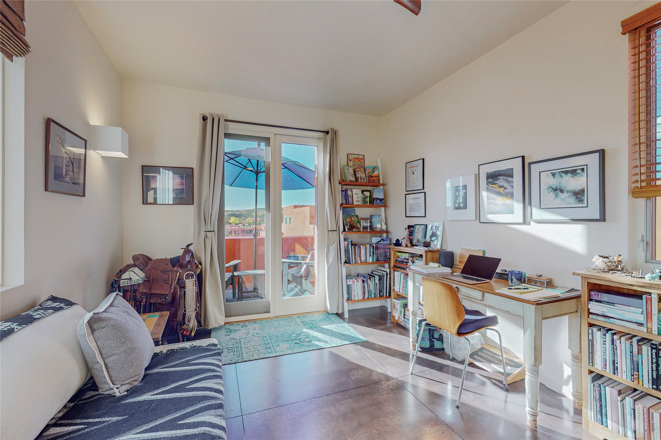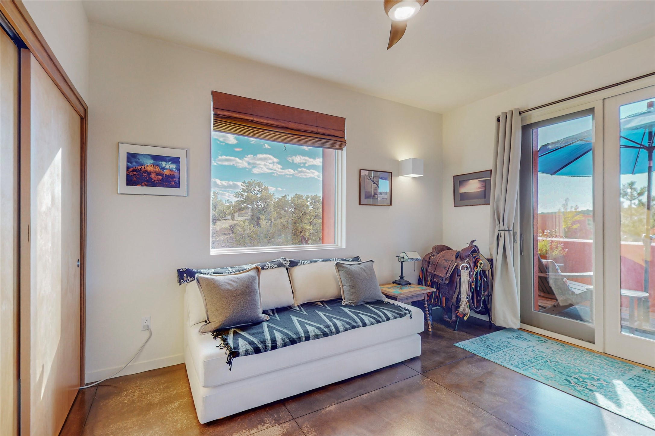 Rare end unit in coveted Zocalo in northside Santa Fe, convenient to 599 bypass, minutes to both the Santa Fe Opera and downtown. This beautifully-maintained 2-bedroom, 1 3/4 bath condo is full of light, private, and has decks at both ends, with mountain and sunset views! Huge south windows overlook peaceful undeveloped hillsides, tall glass sliding doors at both ends bring the beauty of the landscape inside. Modern design by award-winning architect Ricard Legoretta emphasizes clean lines, high ceilings and flowing spaces, giving a spacious feel. Gas fireplace built into wall in great room for cozy relaxing. Split bedroom design with spa-like ensuite in main bedroom including soaking tub and tiled, glass-walled shower, plus walk-in closet for plenty of storage. Second bedroom boasts its own deck with lovely views and seating area. Stackable washer and dryer in closet off front hall; kitchen includes a breakfast bar. New custom window treatments, MinkaAire silent ceiling fans, easy-care polished and tinted concrete floors have been re-sealed in most rooms, new refrigerator and sink/ faucet in kitchen, wood sash and trim refinished throughout--this condo has been tended with love and care by an experienced home renovator! Condo includes detached, oversized one-car garage plus another parking space. Zocalo amenities include security, landscaping and exterior maintenance, beautiful clubhouse with two gyms, pool, soaking tub, courtyard with fountain, and covered patio with a bbq.