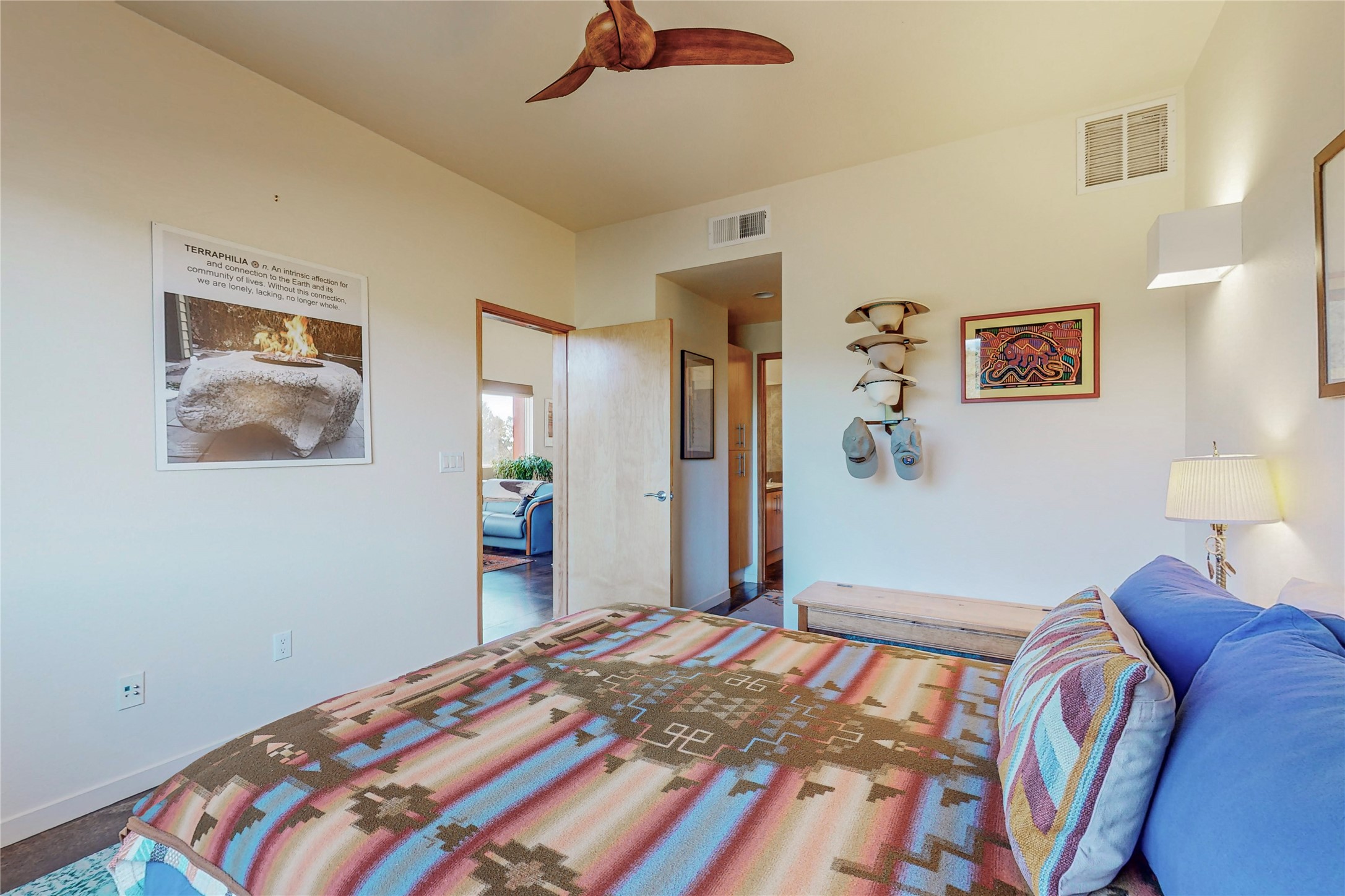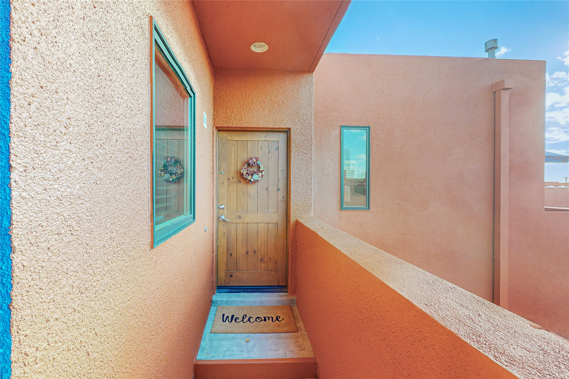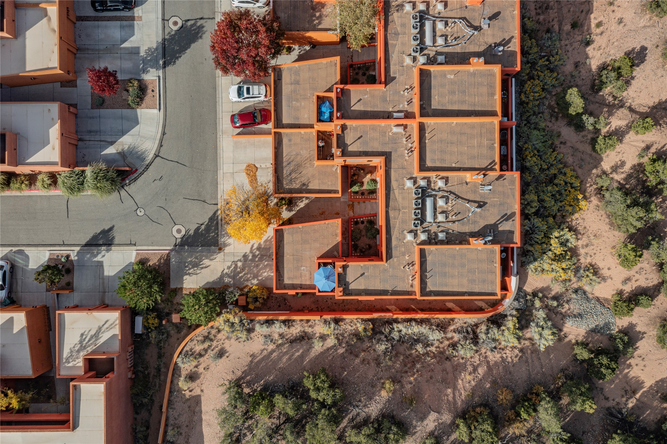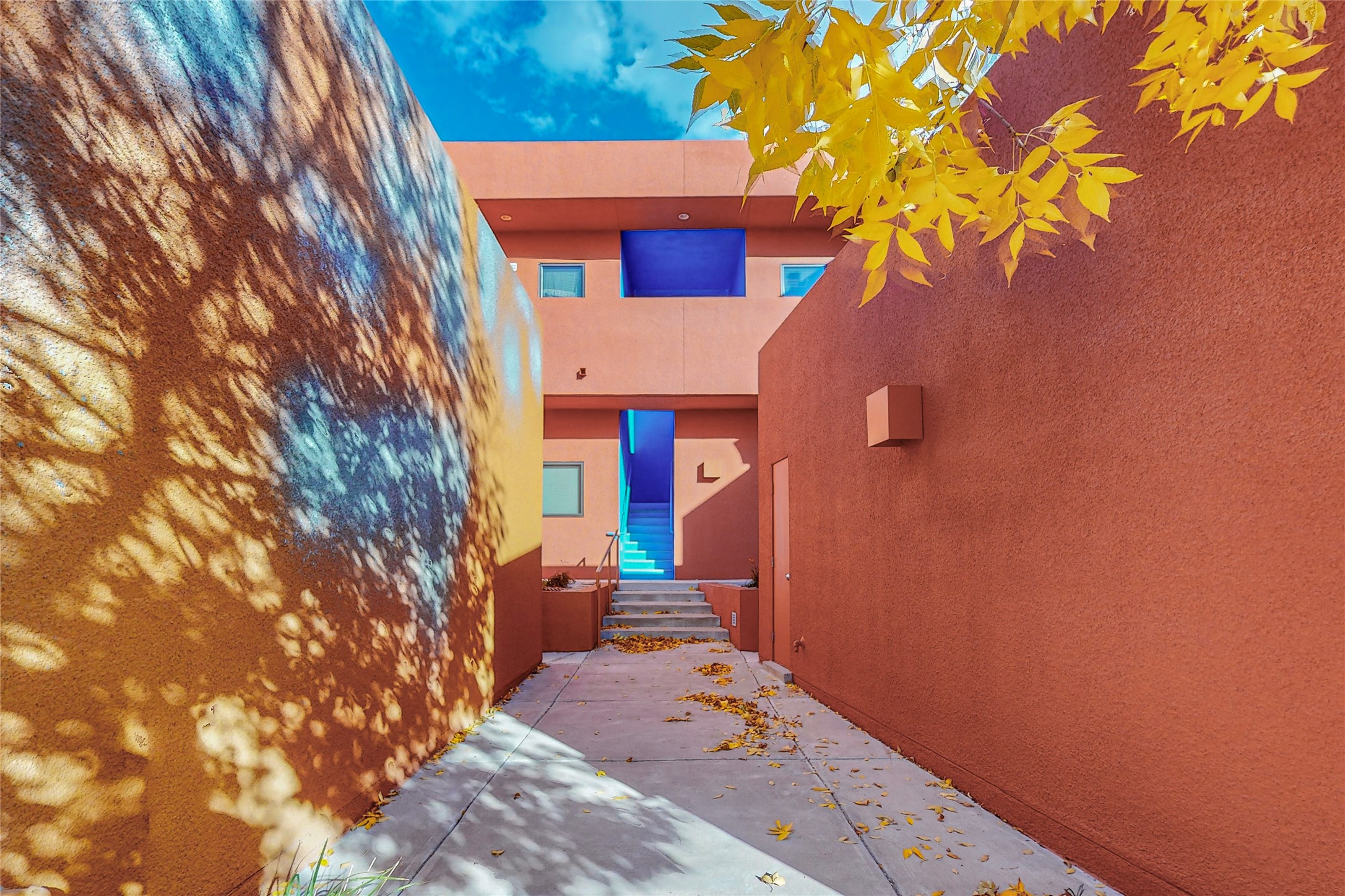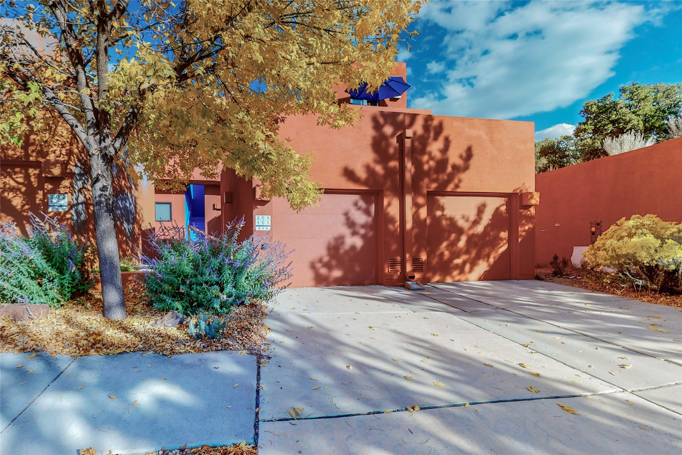 Rare end unit in coveted Zocalo in northside Santa Fe, convenient to 599 bypass, minutes to both the Santa Fe Opera and downtown. This beautifully-maintained 2-bedroom, 1 3/4 bath condo is full of light, private, and has decks at both ends, with mountain and sunset views! Huge south windows overlook peaceful undeveloped hillsides, tall glass sliding doors at both ends bring the beauty of the landscape inside. Modern design by award-winning architect Ricard Legoretta emphasizes clean lines, high ceilings and flowing spaces, giving a spacious feel. Gas fireplace built into wall in great room for cozy relaxing. Split bedroom design with spa-like ensuite in main bedroom including soaking tub and tiled, glass-walled shower, plus walk-in closet for plenty of storage. Second bedroom boasts its own deck with lovely views and seating area. Stackable washer and dryer in closet off front hall; kitchen includes a breakfast bar. New custom window treatments, MinkaAire silent ceiling fans, easy-care polished and tinted concrete floors have been re-sealed in most rooms, new refrigerator and sink/ faucet in kitchen, wood sash and trim refinished throughout--this condo has been tended with love and care by an experienced home renovator! Condo includes detached, oversized one-car garage plus another parking space. Zocalo amenities include security, landscaping and exterior maintenance, beautiful clubhouse with two gyms, pool, soaking tub, courtyard with fountain, and covered patio with a bbq.