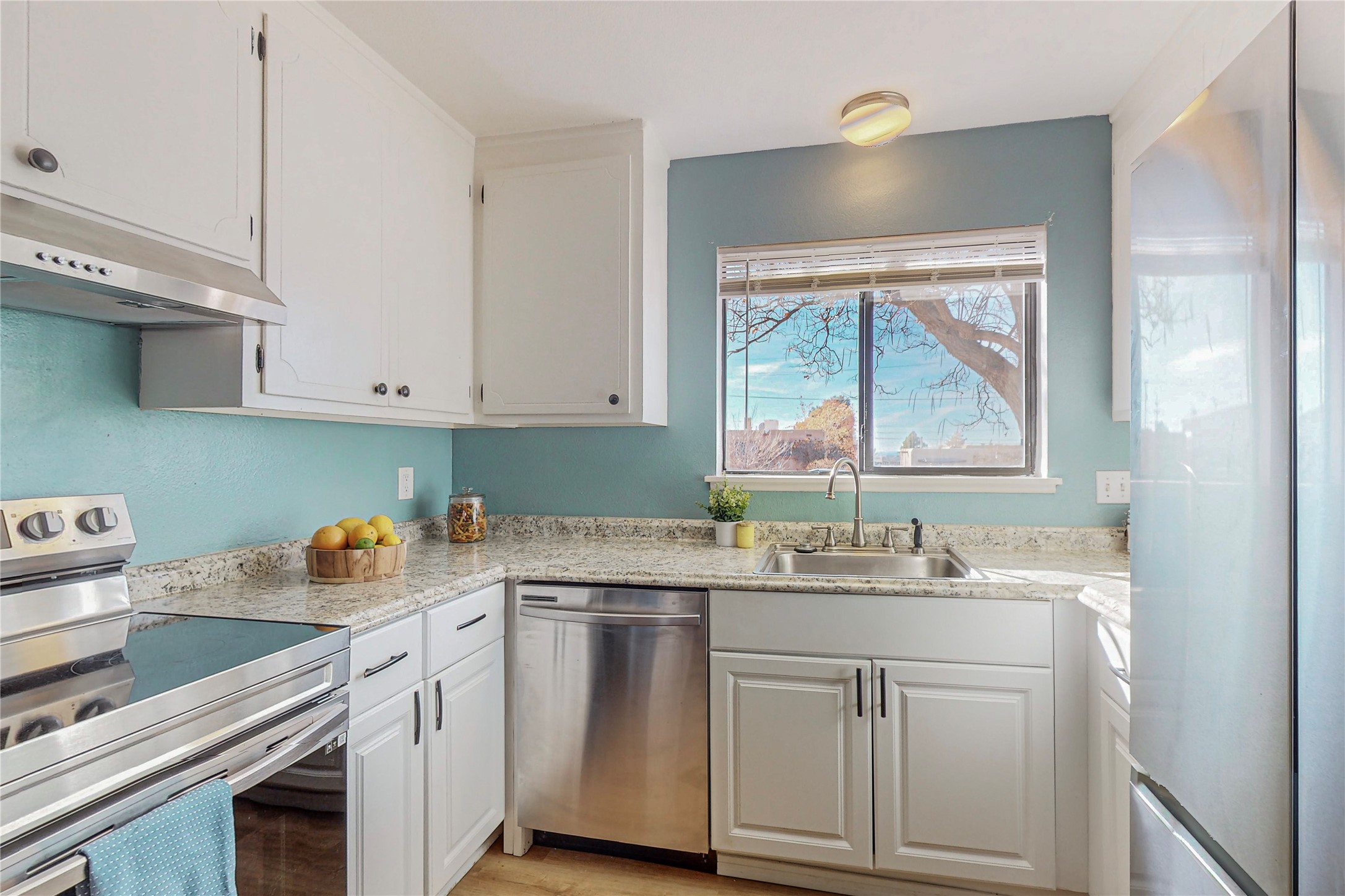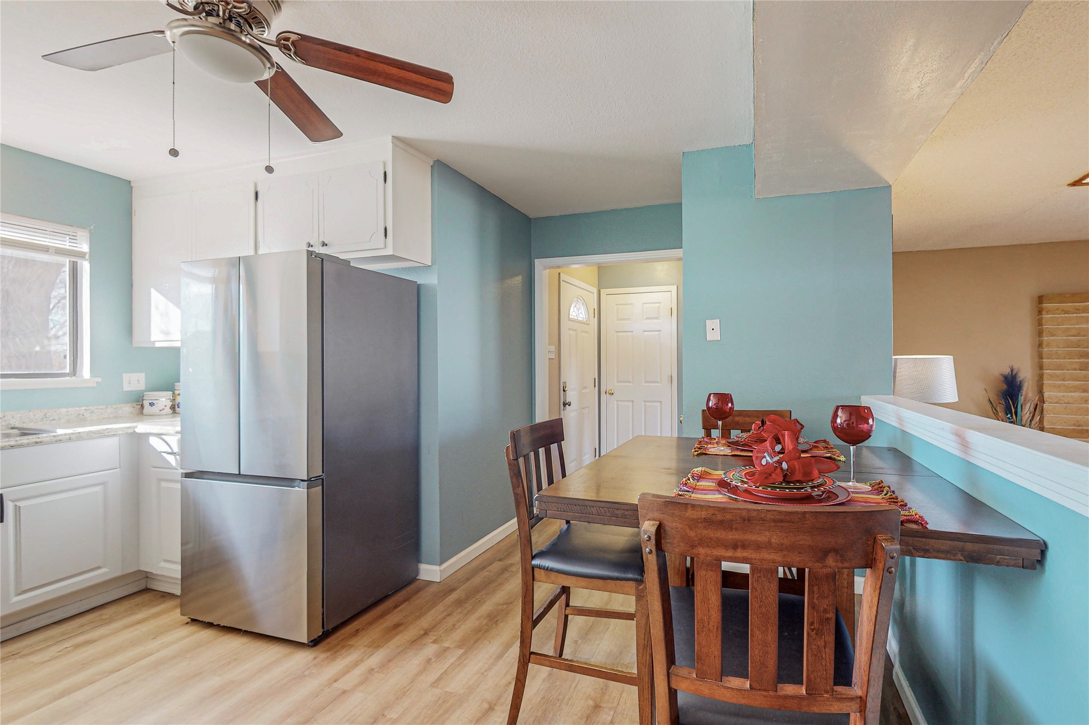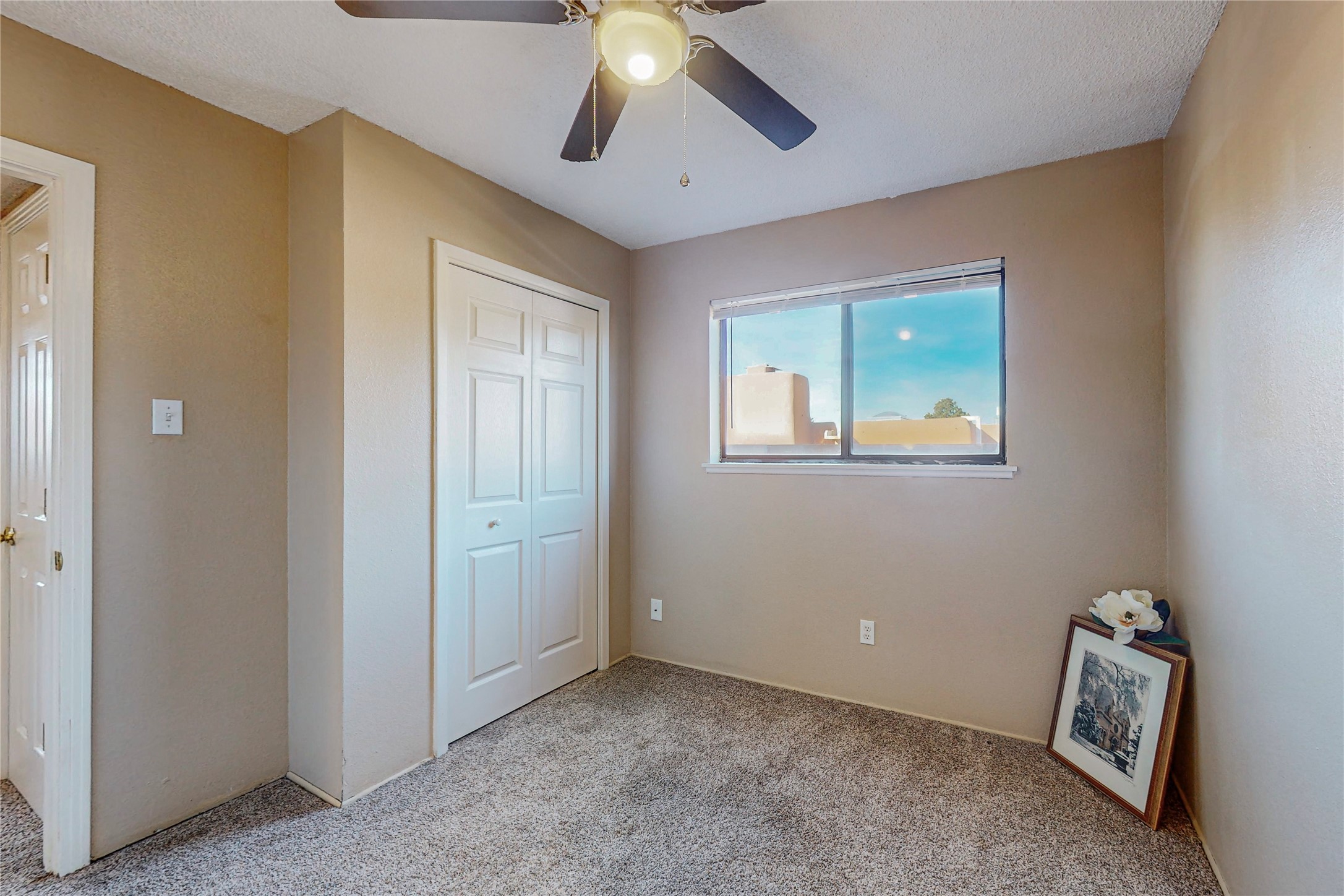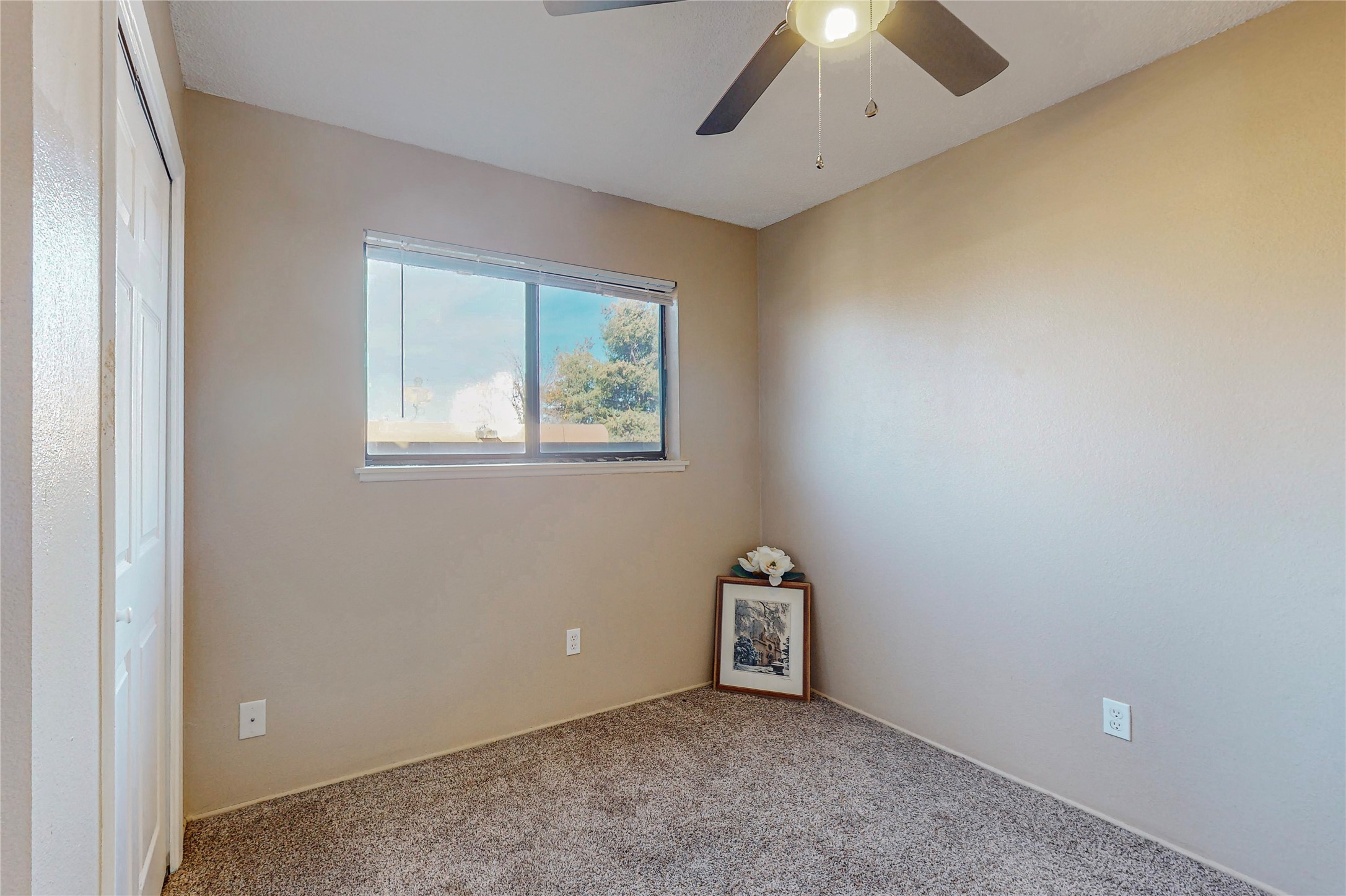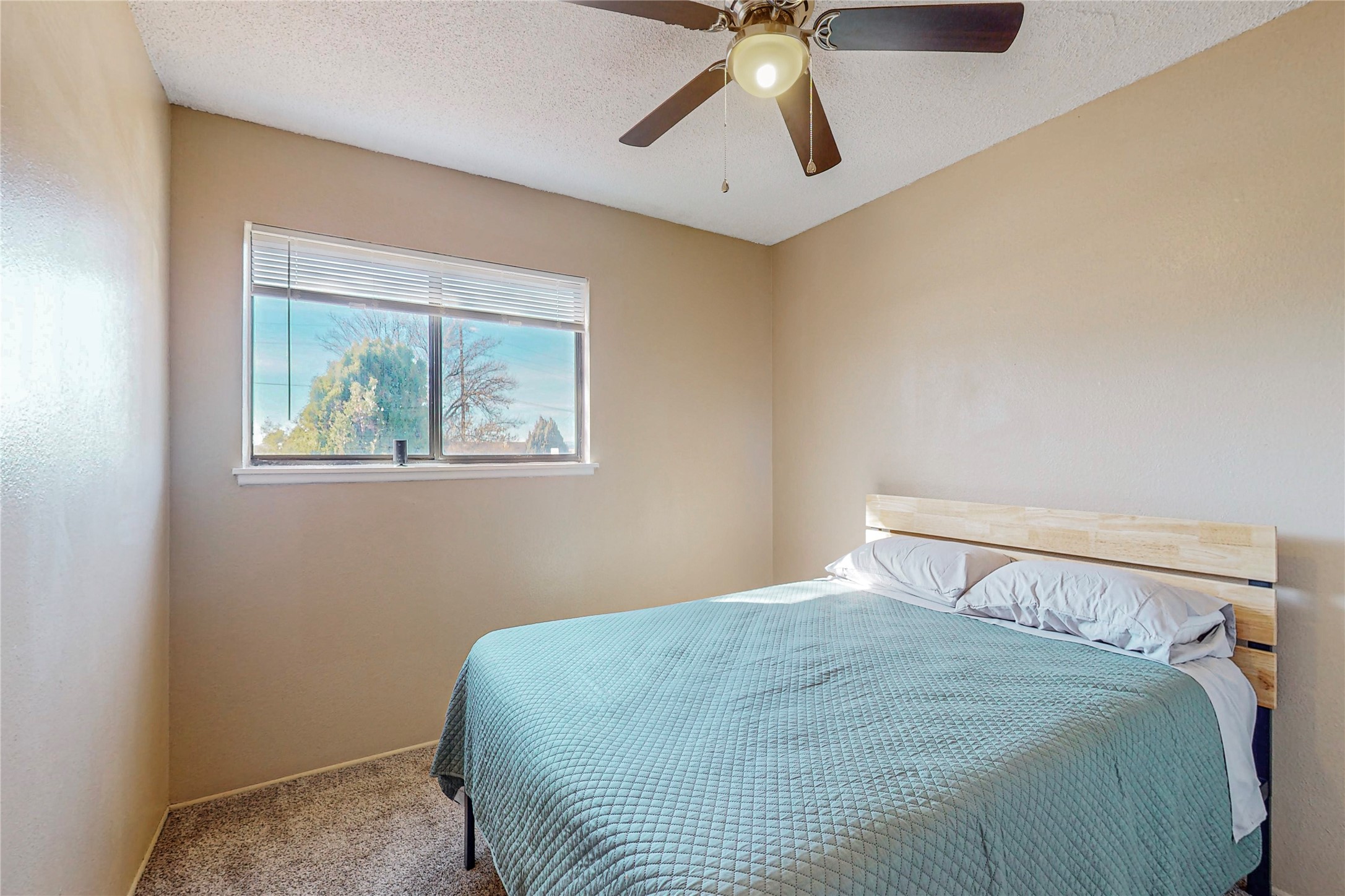 Come home to this move in ready FOUR bedroom two bathroom beautiful home! The kitchen is open concept with a dining area that over looks into the spacious living room.The living room has a cozy fireplace and french doors that open up to the very large walled back yard that your family can make their own. Ceiling fans in each of the bedrooms and beautiful skylights throughout the home. A brand new TPO membrane roof was just installed with a 20 year labor and material warranty. There is a single car attached garage with a laundry room. Conveniently located near schools, hospitals, the Railrunner and shops!