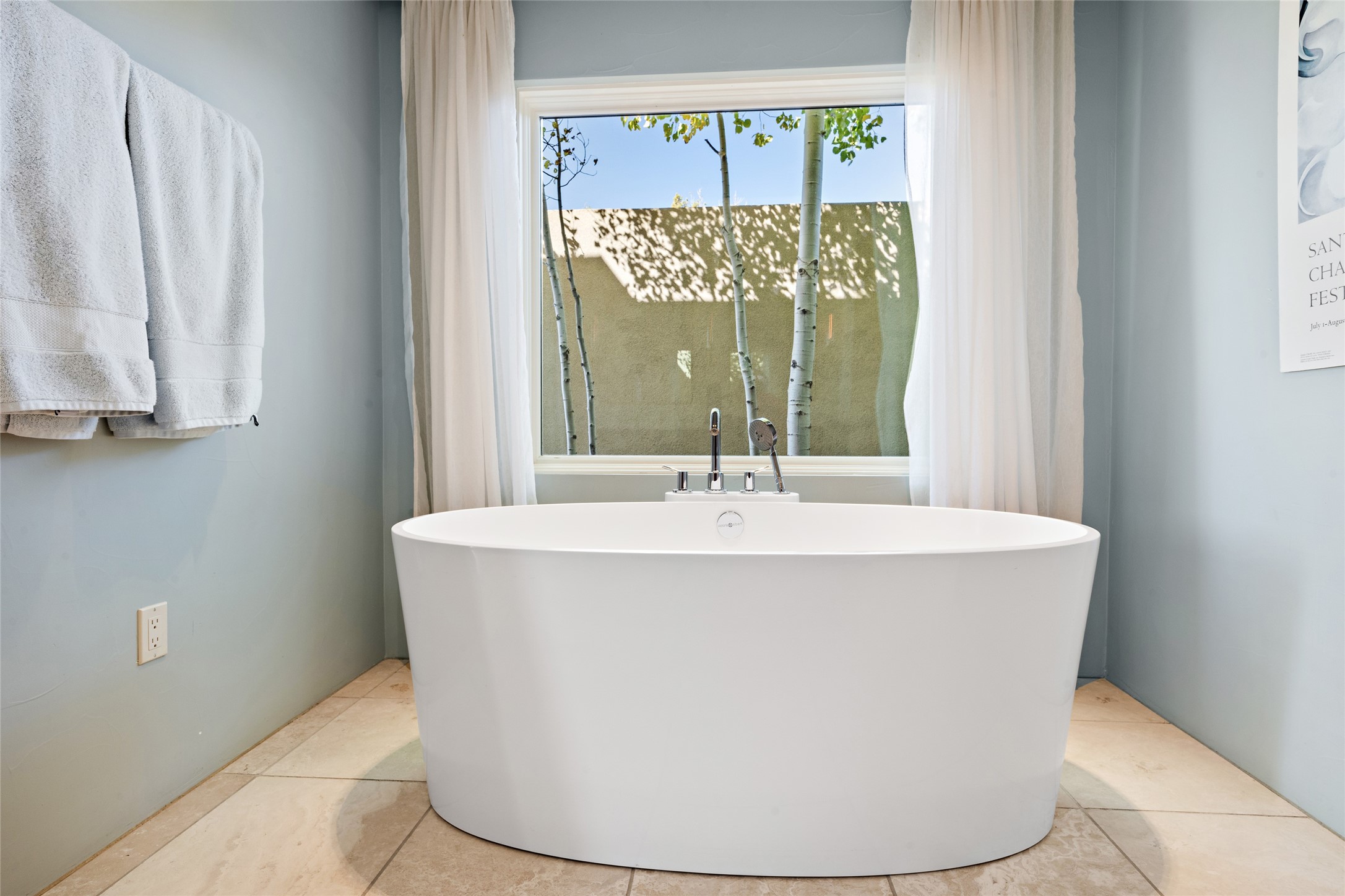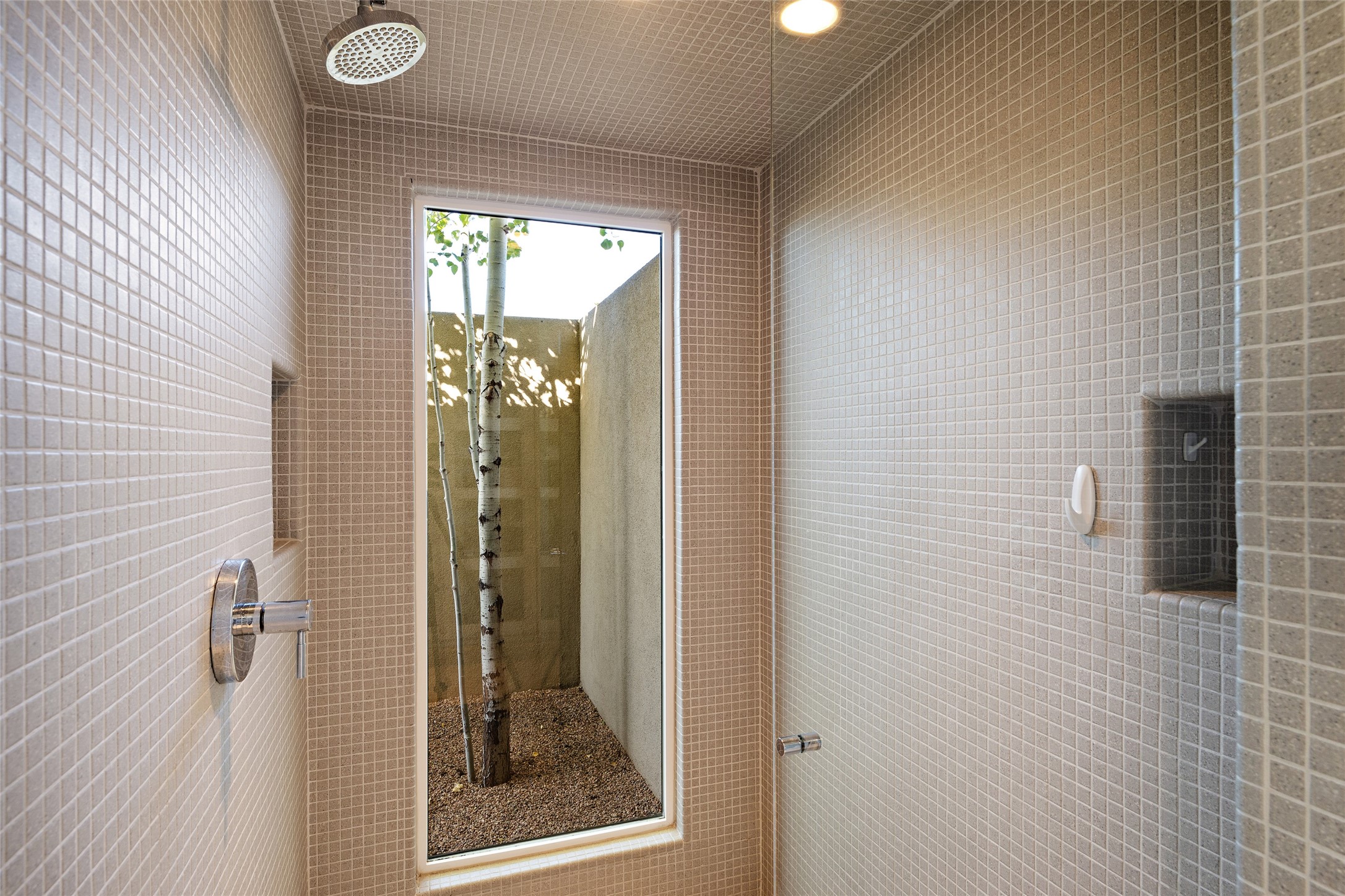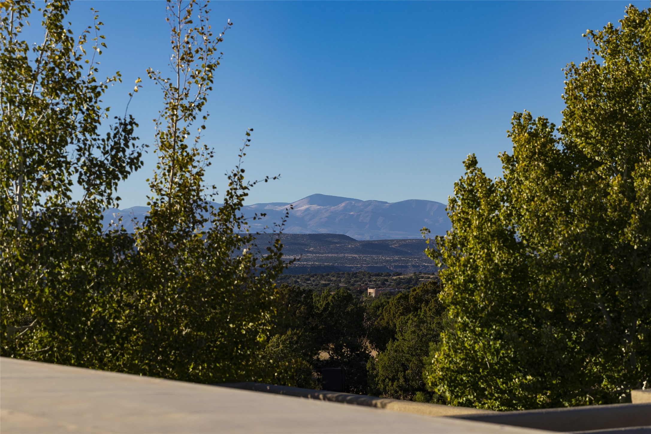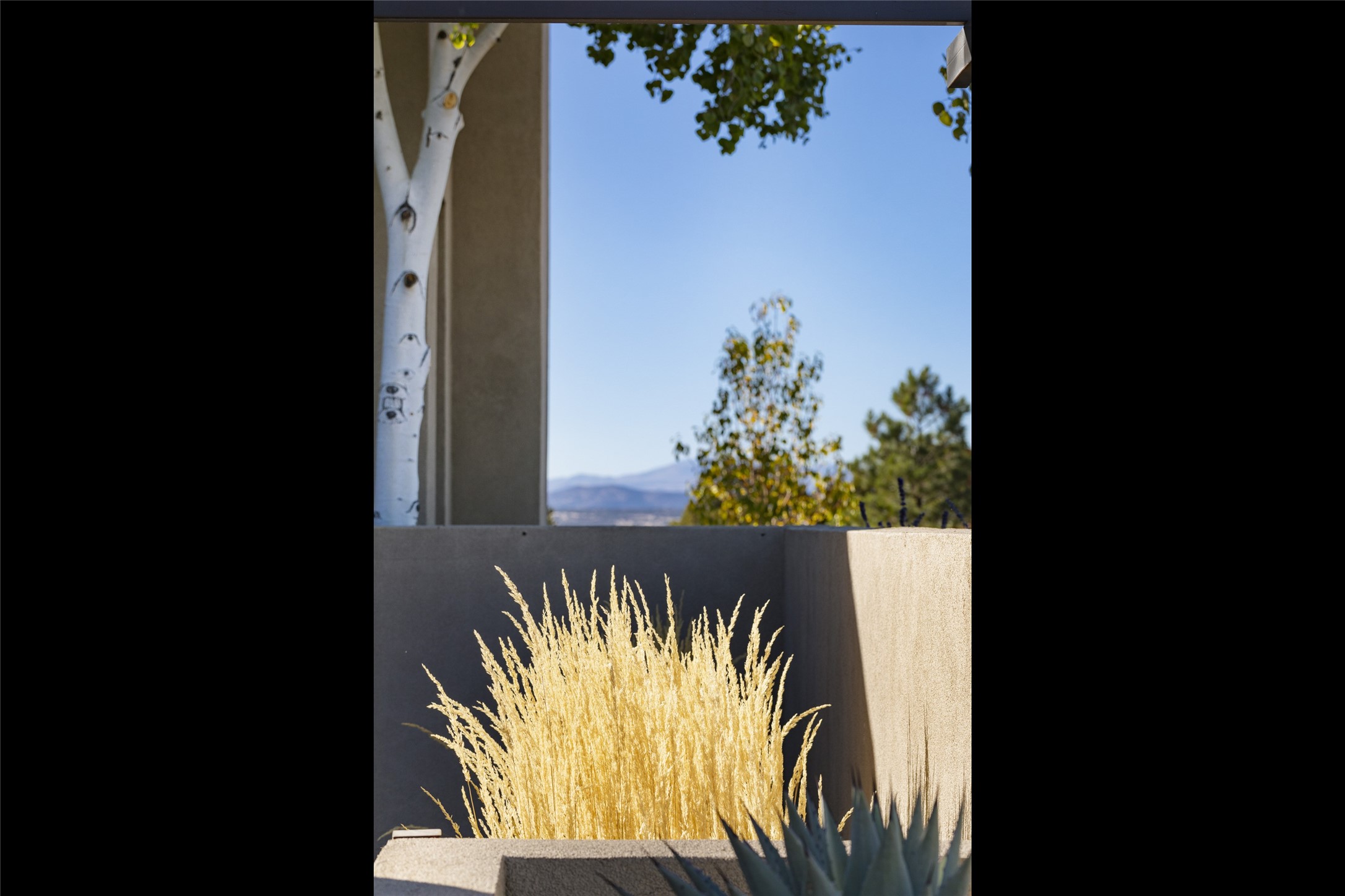 Sophisticated contemporary architecture, by renowned builder, Seth Anderson blended with luxury finishes, a resort-like backyard, and spectacular Mountain views are celebrated at this exciting Las Campanas residence. Designed to enjoy the ultimate Santa Fe lifestyle, this one of a kind residence, located within the master planned community Las Campanas, impresses with exceptional design which seamlessly incorporates the ultimate indoor and outdoor living experience with a newly added elevated portal and fireplace, a modern above ground spa, a substantial roof deck with 360-degree views, vibrant surround landscape, and three separate covered entertainment areas. This exquisite home offers excellent separation of space, with a private owner's suite complete portal access, a spa-like bath with a Victoria Albert soaking tub, a steam shower with glass accents which frame the aspen tree views, custom cabinets, and a spacious wrap around walk-in closet. Flexible design features include two additional bedrooms which share a full bath, plus a newly added modern office or ideal art studio with front courtyard access. The state-of-the-art chef's kitchen delights with Subzero and Wolf appliances, a large island with expansive seating, and a walk-in pantry. Located directly off the kitchen is the ultimate great room for entertaining, which was designed to integrate the surrounding natural landscape and mountain views, complete with a grand gas fireplace, Jemez and Sangre de Cristo Mountain views, and a formal dining area. The outdoor living experience is enhanced by deep portals with mountain views, surround aspen trees, rose gardens, and newly installed photovoltaic landscape lighting. Exceptional features include a spacious heated 3-car garage, a tranquil gated front entrance courtyard, exceptional natural light throughout, radiant in-floor heating with an updated boiler, and custom steel accents which add the highest level of contemporary design.
