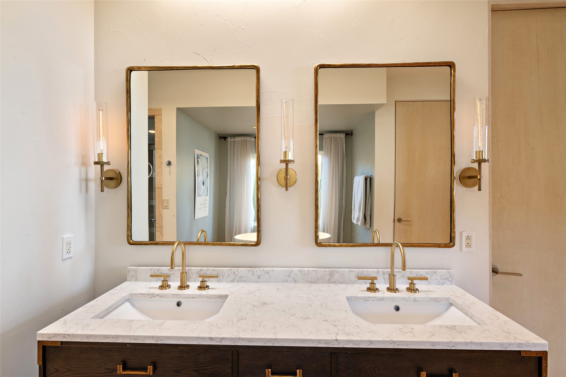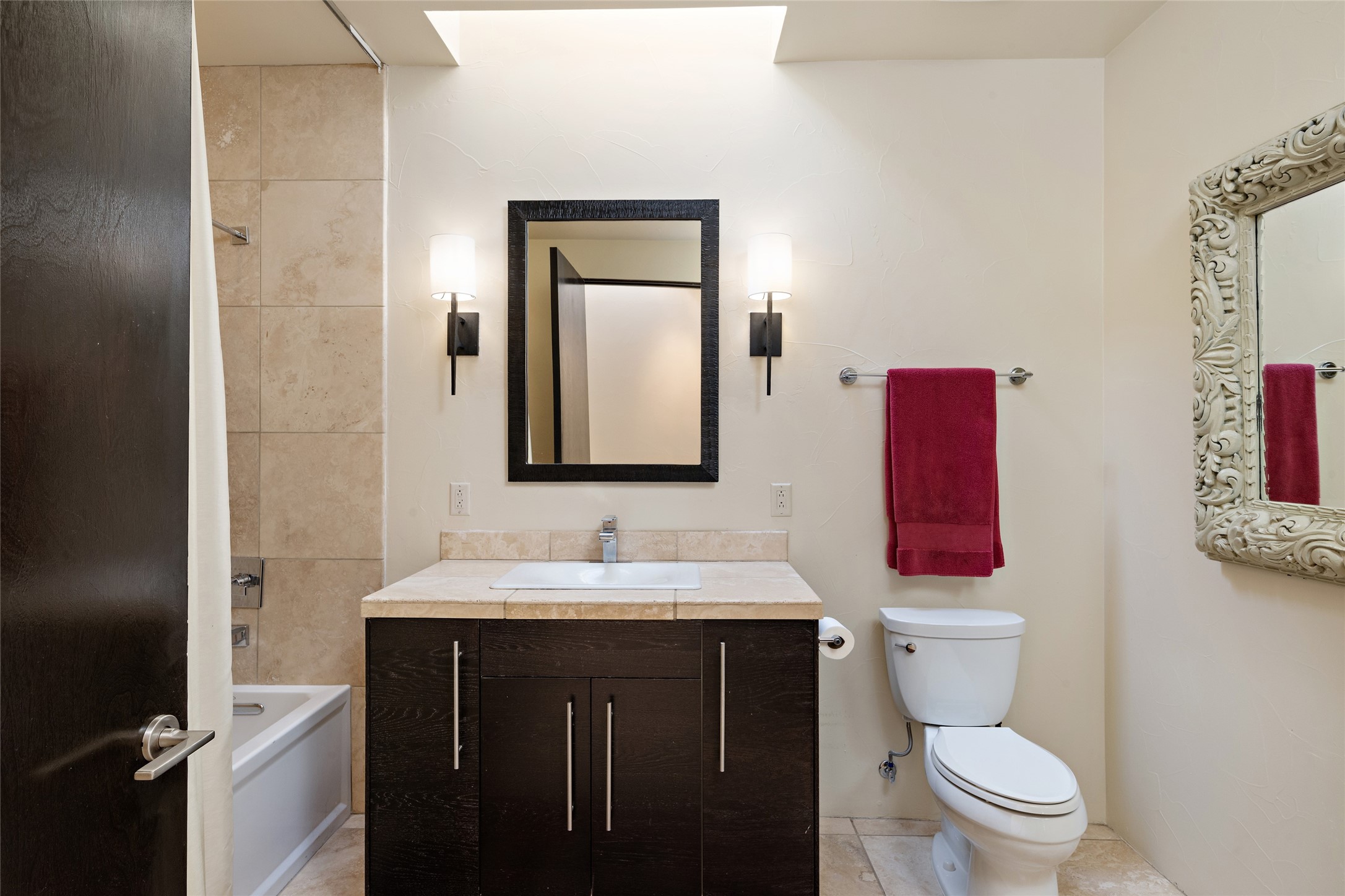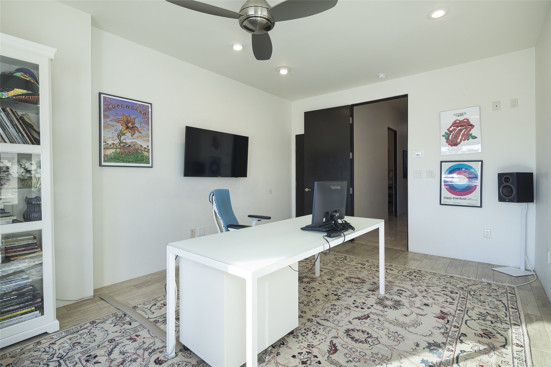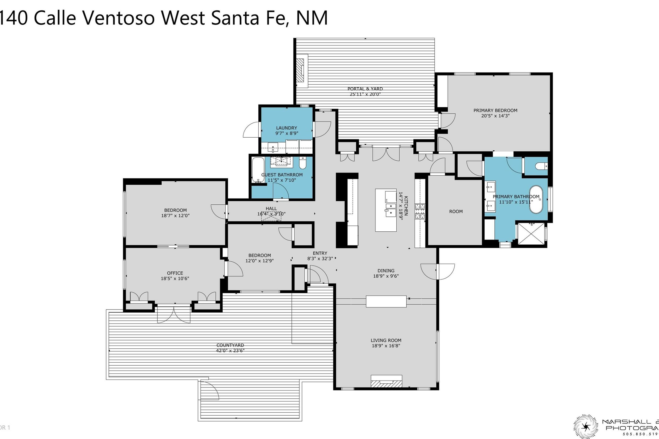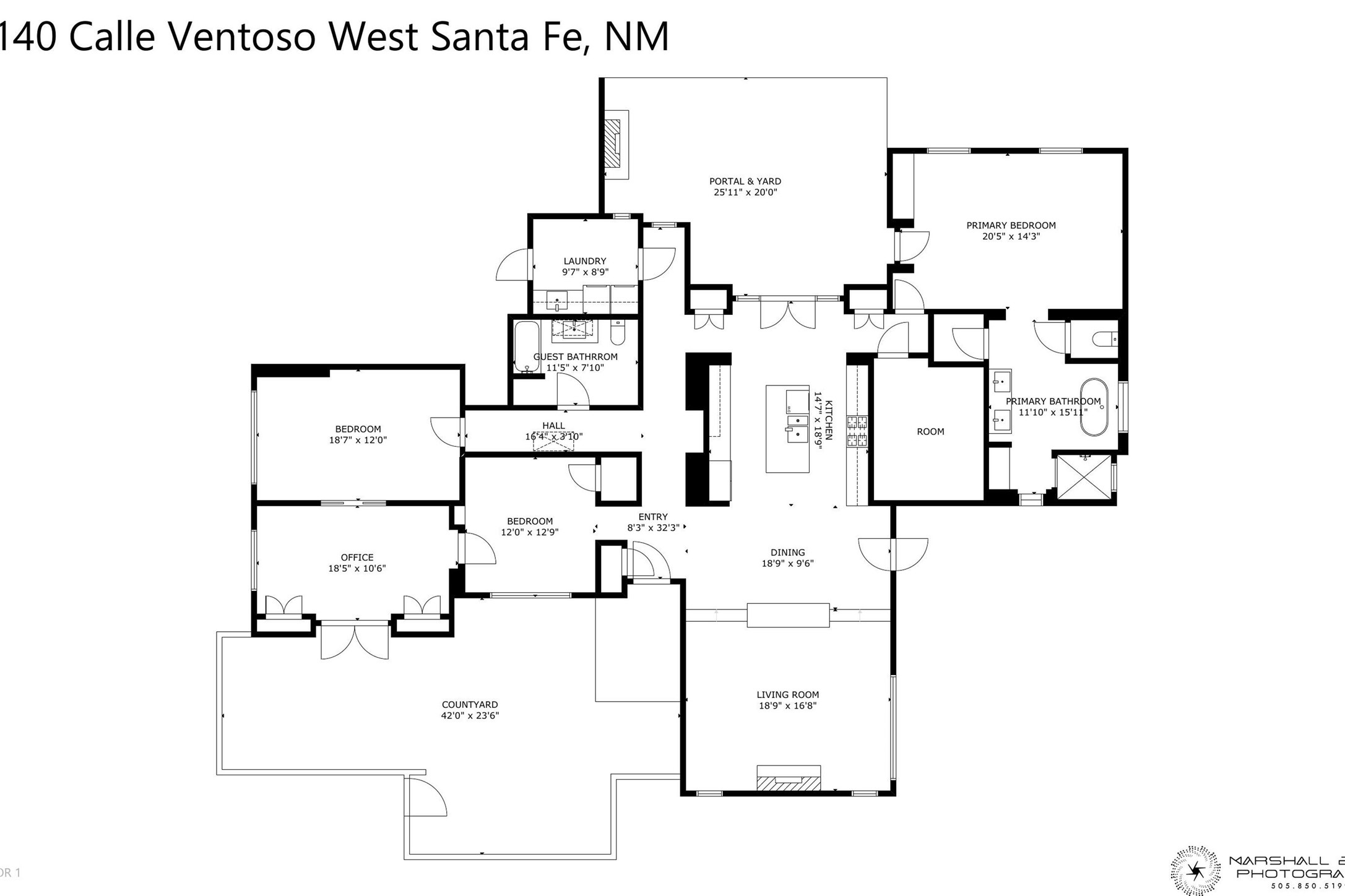 Sophisticated contemporary architecture, by renowned builder, Seth Anderson blended with luxury finishes, a resort-like backyard, and spectacular Mountain views are celebrated at this exciting Las Campanas residence. Designed to enjoy the ultimate Santa Fe lifestyle, this one of a kind residence, located within the master planned community Las Campanas, impresses with exceptional design which seamlessly incorporates the ultimate indoor and outdoor living experience with a newly added elevated portal and fireplace, a modern above ground spa, a substantial roof deck with 360-degree views, vibrant surround landscape, and three separate covered entertainment areas. This exquisite home offers excellent separation of space, with a private owner's suite complete portal access, a spa-like bath with a Victoria Albert soaking tub, a steam shower with glass accents which frame the aspen tree views, custom cabinets, and a spacious wrap around walk-in closet. Flexible design features include two additional bedrooms which share a full bath, plus a newly added modern office or ideal art studio with front courtyard access. The state-of-the-art chef's kitchen delights with Subzero and Wolf appliances, a large island with expansive seating, and a walk-in pantry. Located directly off the kitchen is the ultimate great room for entertaining, which was designed to integrate the surrounding natural landscape and mountain views, complete with a grand gas fireplace, Jemez and Sangre de Cristo Mountain views, and a formal dining area. The outdoor living experience is enhanced by deep portals with mountain views, surround aspen trees, rose gardens, and newly installed photovoltaic landscape lighting. Exceptional features include a spacious heated 3-car garage, a tranquil gated front entrance courtyard, exceptional natural light throughout, radiant in-floor heating with an updated boiler, and custom steel accents which add the highest level of contemporary design.