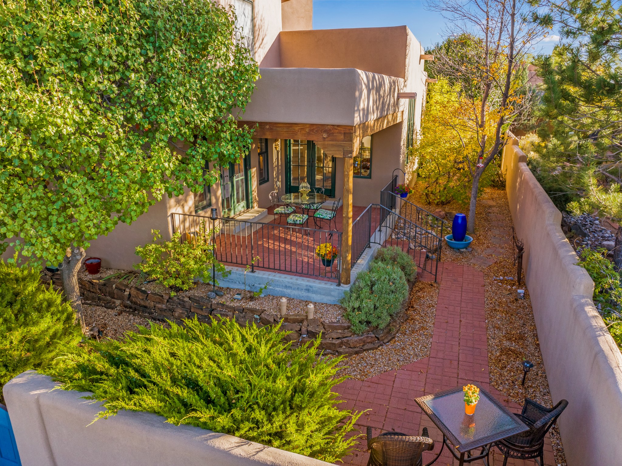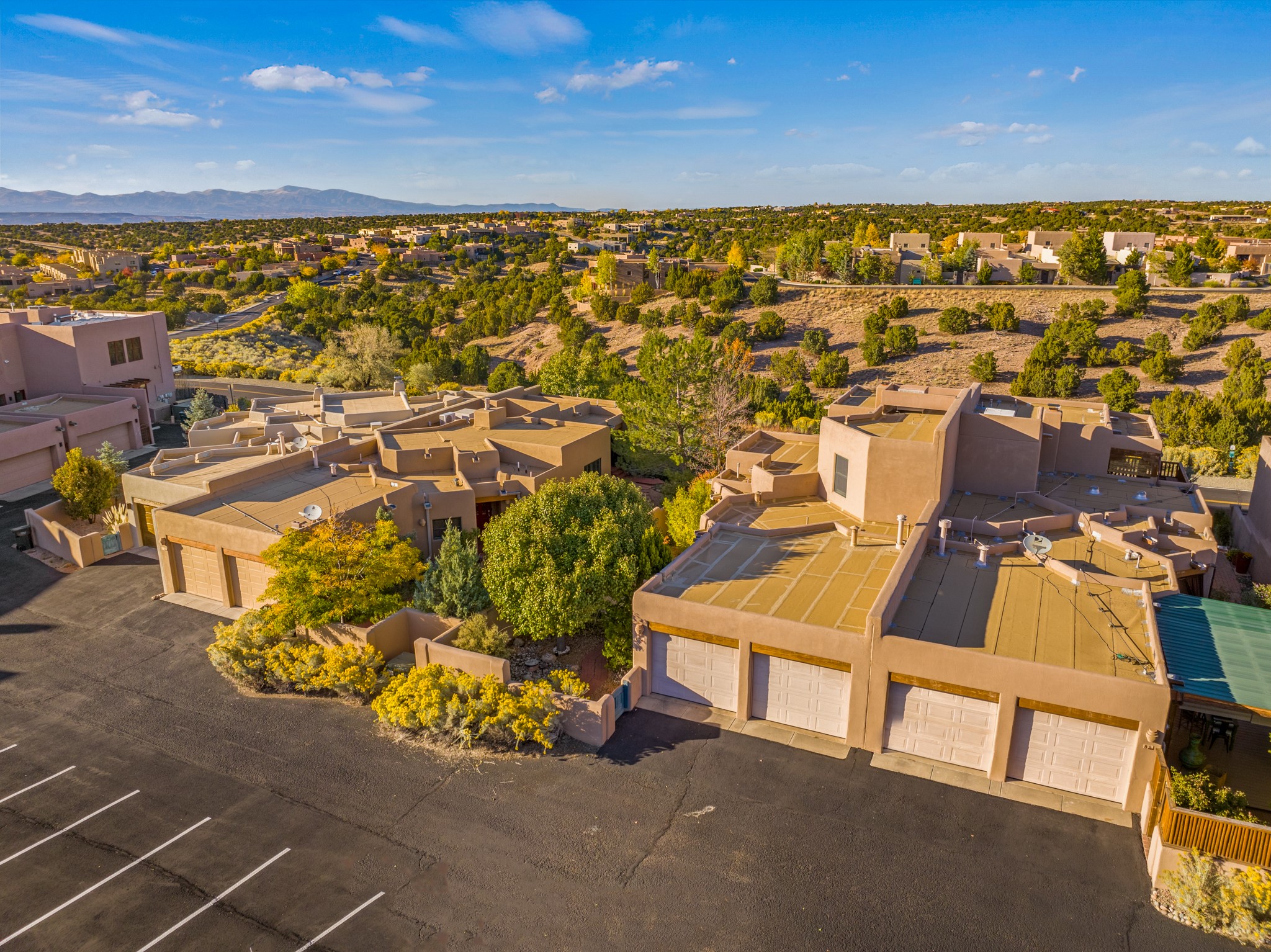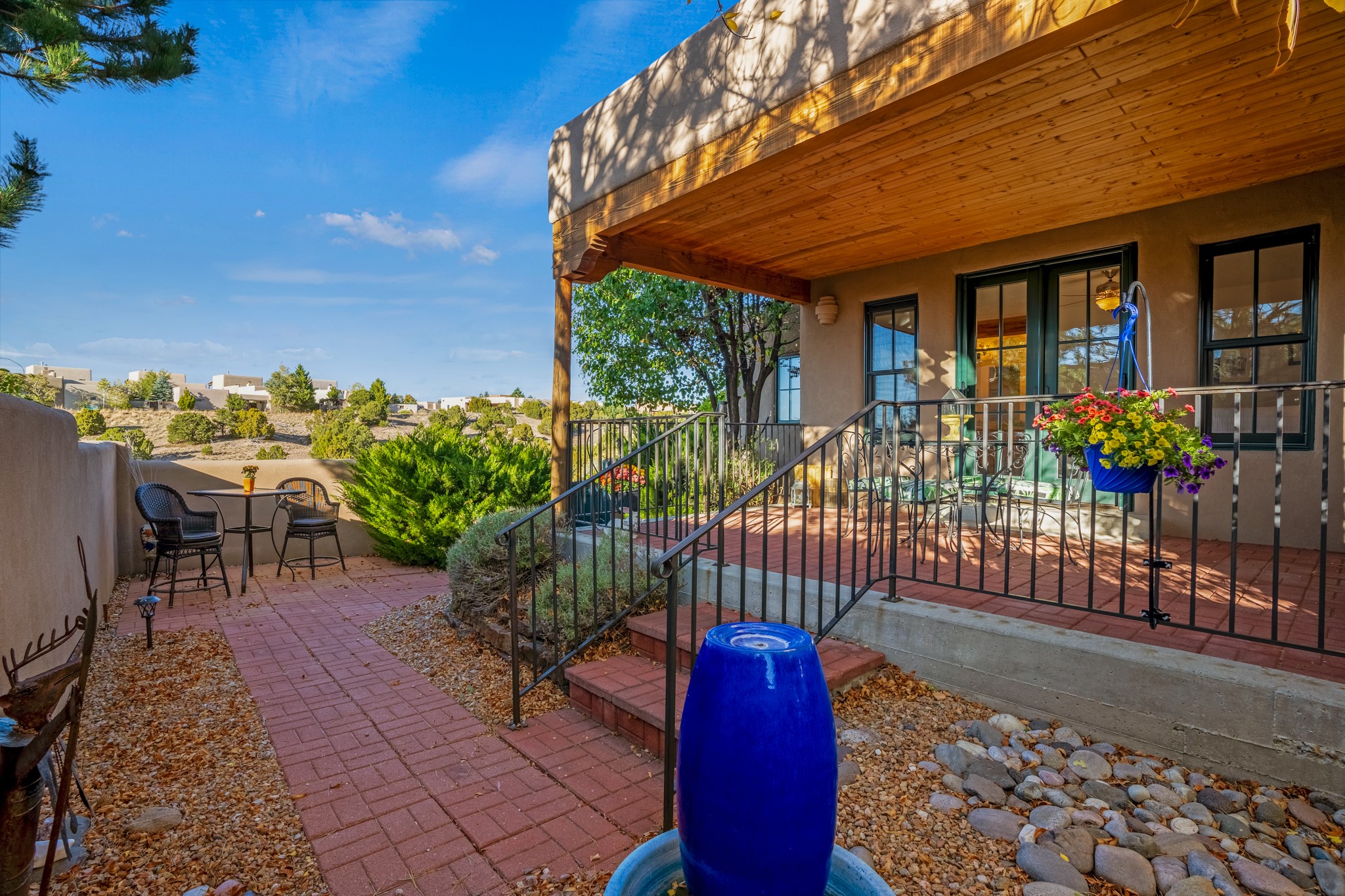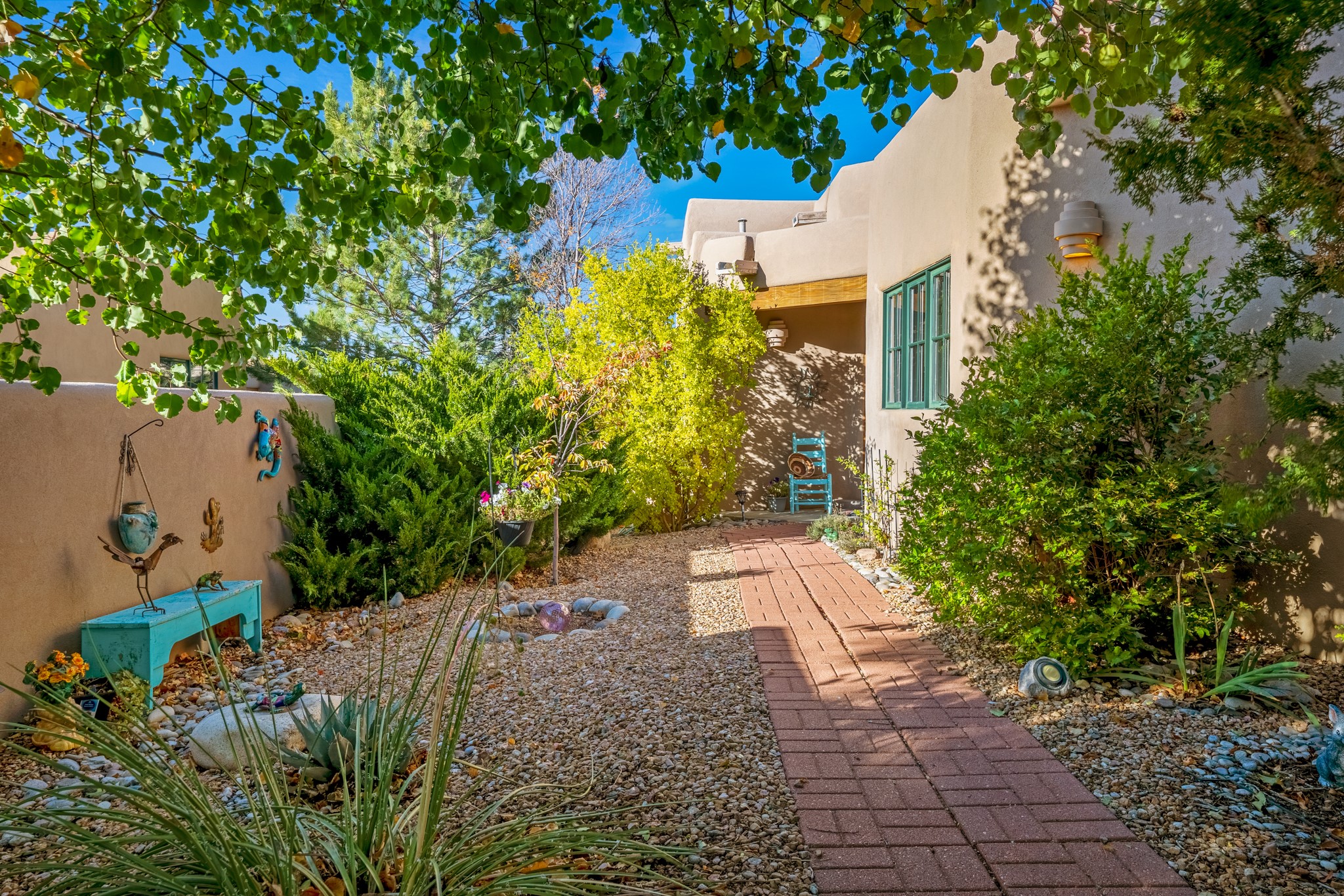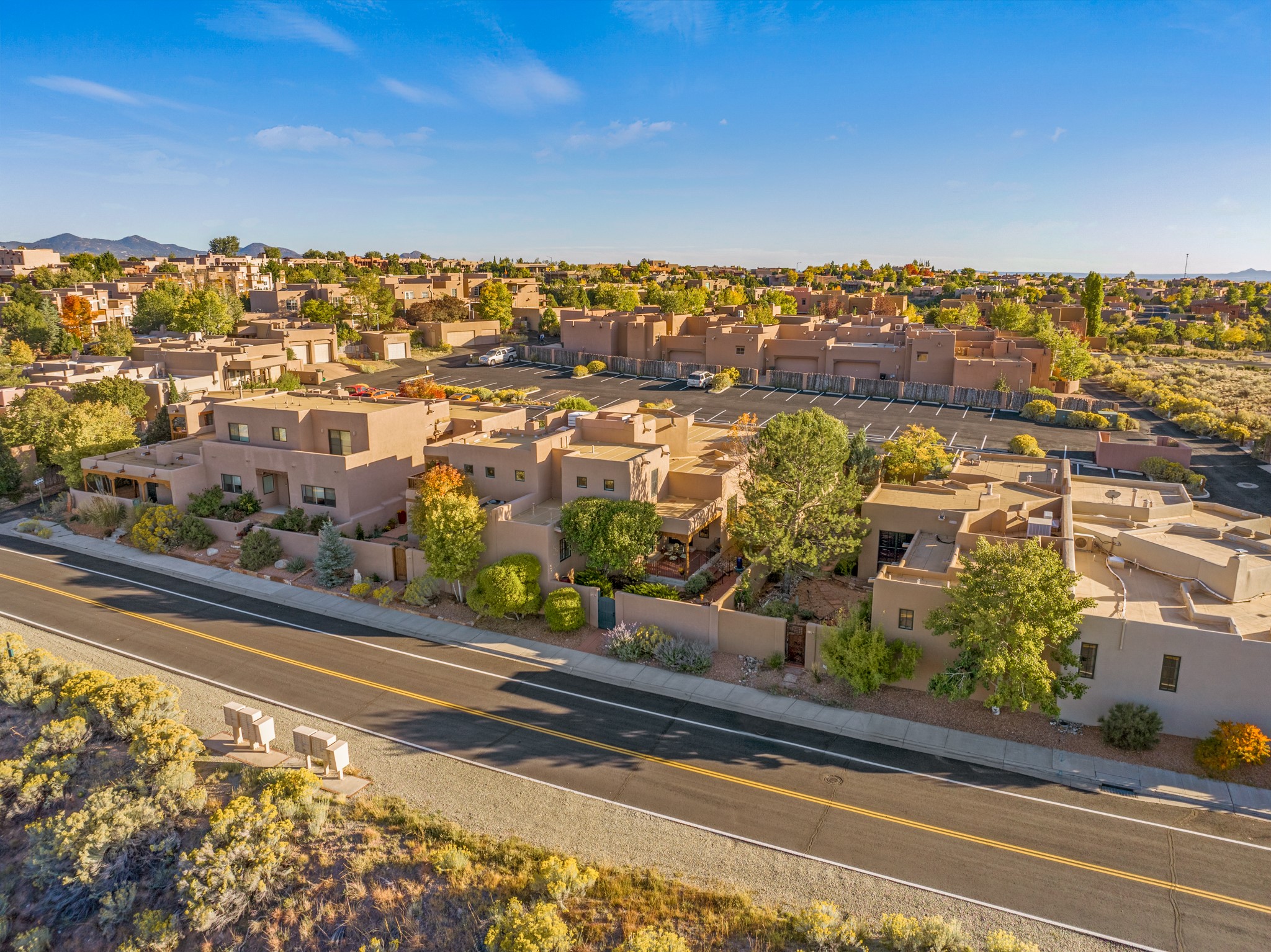 Bright, airy, contemporary patio home located in the heart of Aldea de Santa Fe. This light filled home features an open concept floor plan, first floor master suite, attached garage, radiant in floor heat, evaporative cooling, beautiful landscaping, drip irrigation and a large, covered patio with Jemez mountain views. The main living area has a high ceiling, vigas, large windows, faux paint and wood burning kiva fireplace. Kitchen features spacious pantries, maple cabinets, a center island and stainless Bosch and Amana appliances. The master suite includes a walk-in closet, jetted tub and large shower. French doors with screens in both the living room and master suite open directly to the patio. Two spacious, carpeted bedrooms and full bath are located on the second floor. The lovely and peaceful yard is completely walled for your furry friends. The front of the house faces Aldea open space, offering stunning mountain views and the serenity of a walkable community with fitness amenities, parks, and miles of walking trails. The home backs up to a large parking area for guests. Great location with easy access to NM 599, Los Alamos, downtown Santa Fe. Aldea de Santa Fe is a new urbanist subdivision that offers 13 miles of walking trails, community center, Bocci ball, tennis and basket-ball courts. Just steps away from Aldea plaza and specialty shops, caf, and businesses. community is great place to meet new friends with many special interest clubs in place.