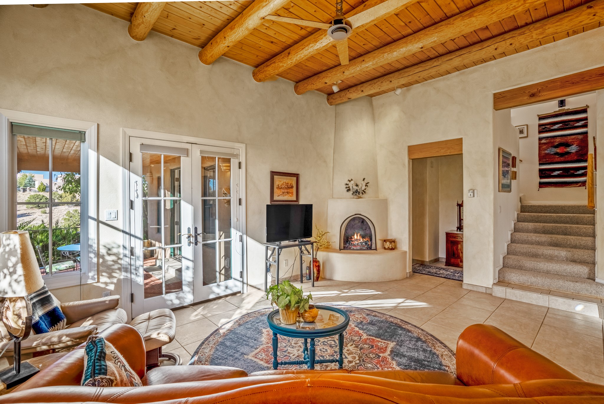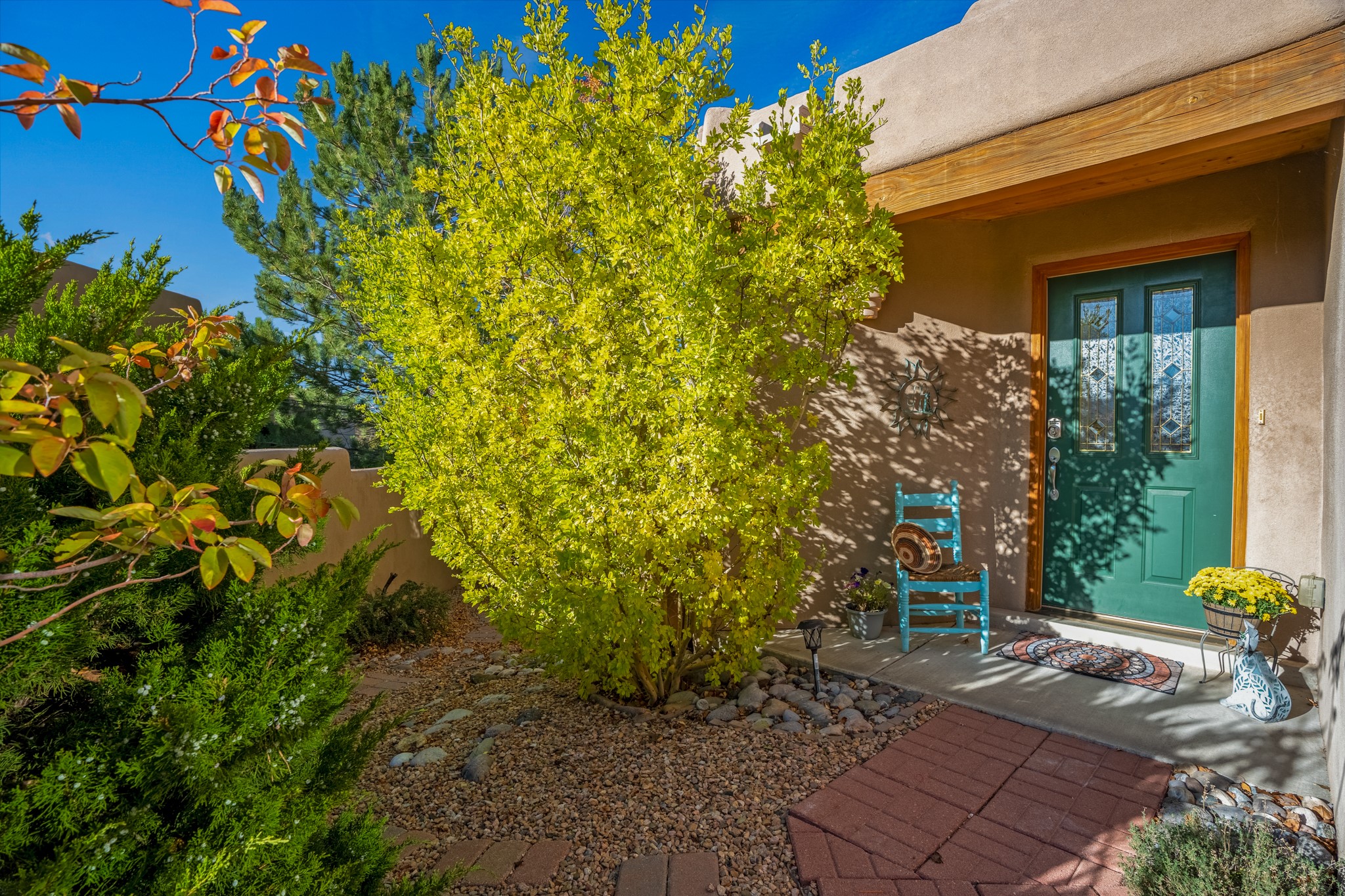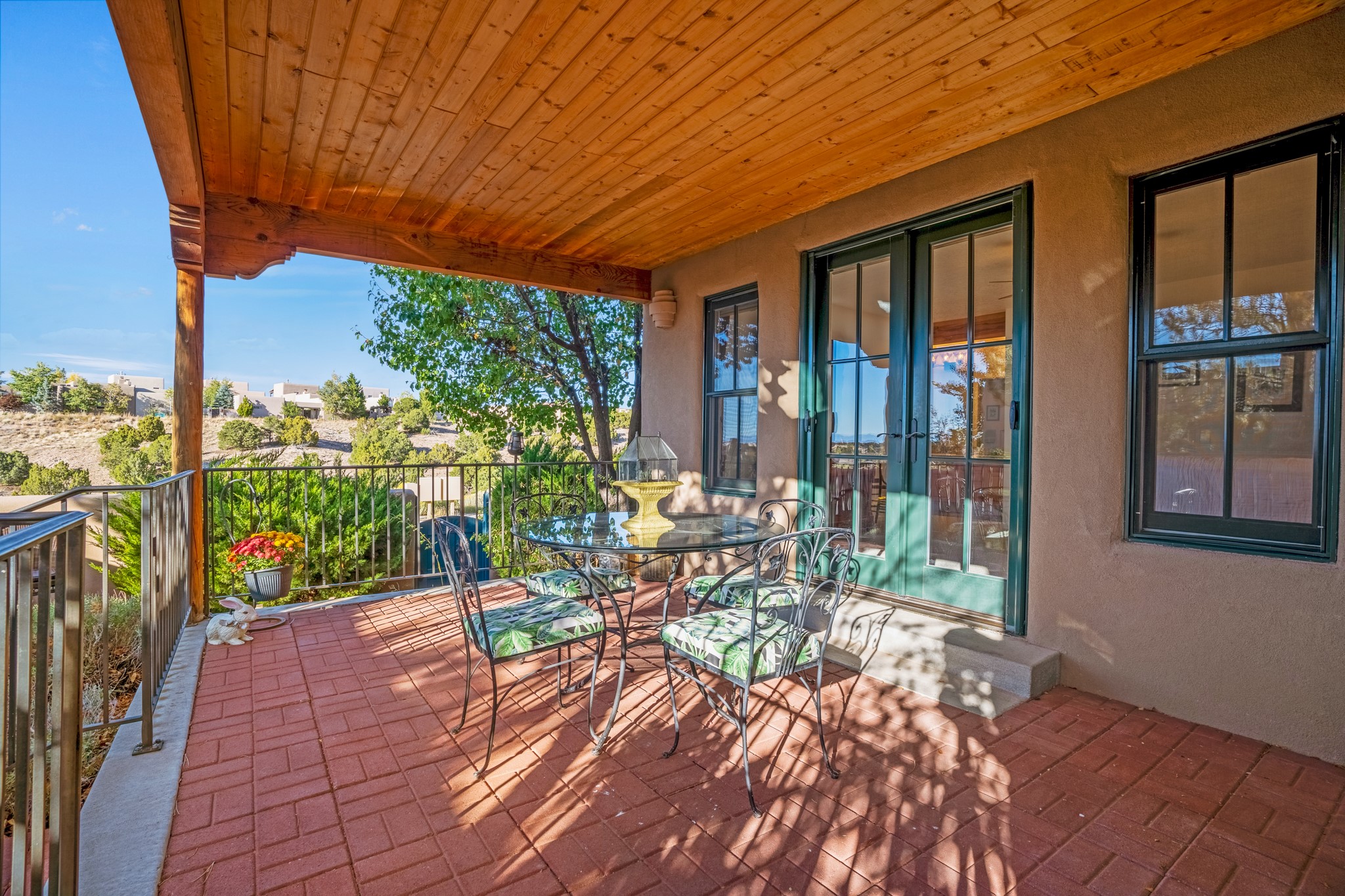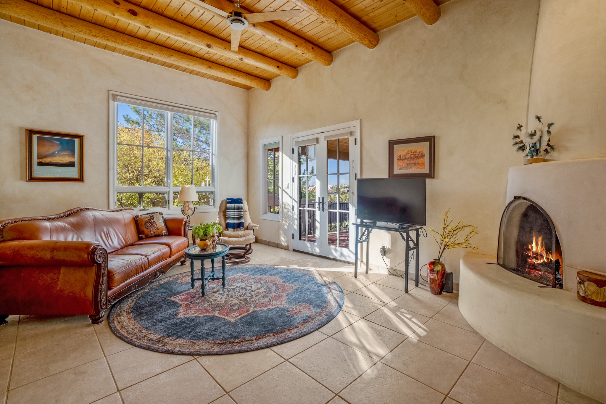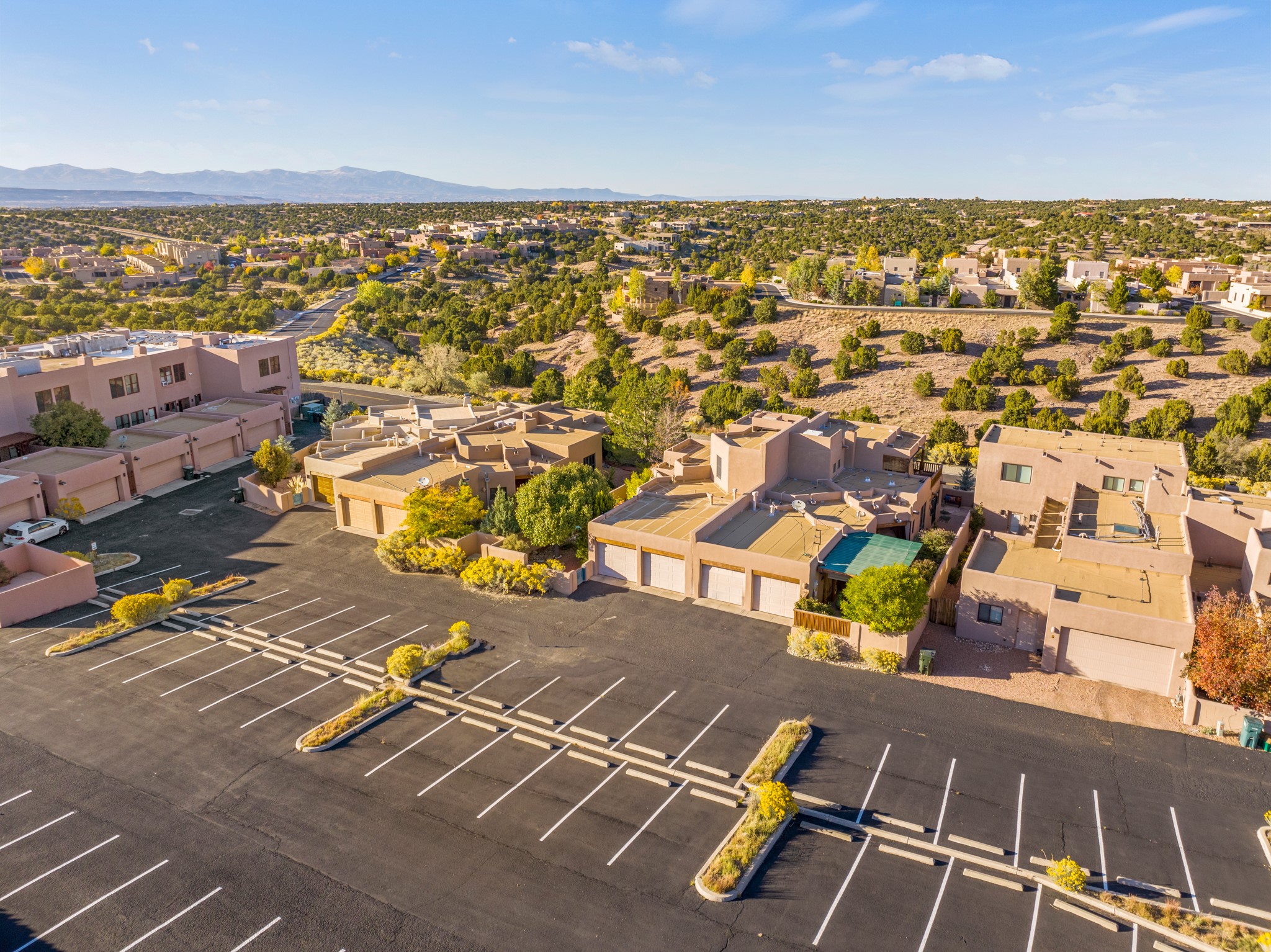 Bright, airy, contemporary patio home located in the heart of Aldea de Santa Fe. This light filled home features an open concept floor plan, first floor master suite, attached garage, radiant in floor heat, evaporative cooling, beautiful landscaping, drip irrigation and a large, covered patio with Jemez mountain views. The main living area has a high ceiling, vigas, large windows, faux paint and wood burning kiva fireplace. Kitchen features spacious pantries, maple cabinets, a center island and stainless Bosch and Amana appliances. The master suite includes a walk-in closet, jetted tub and large shower. French doors with screens in both the living room and master suite open directly to the patio. Two spacious, carpeted bedrooms and full bath are located on the second floor. The lovely and peaceful yard is completely walled for your furry friends. The front of the house faces Aldea open space, offering stunning mountain views and the serenity of a walkable community with fitness amenities, parks, and miles of walking trails. The home backs up to a large parking area for guests. Great location with easy access to NM 599, Los Alamos, downtown Santa Fe. Aldea de Santa Fe is a new urbanist subdivision that offers 13 miles of walking trails, community center, Bocci ball, tennis and basket-ball courts. Just steps away from Aldea plaza and specialty shops, caf, and businesses. community is great place to meet new friends with many special interest clubs in place.