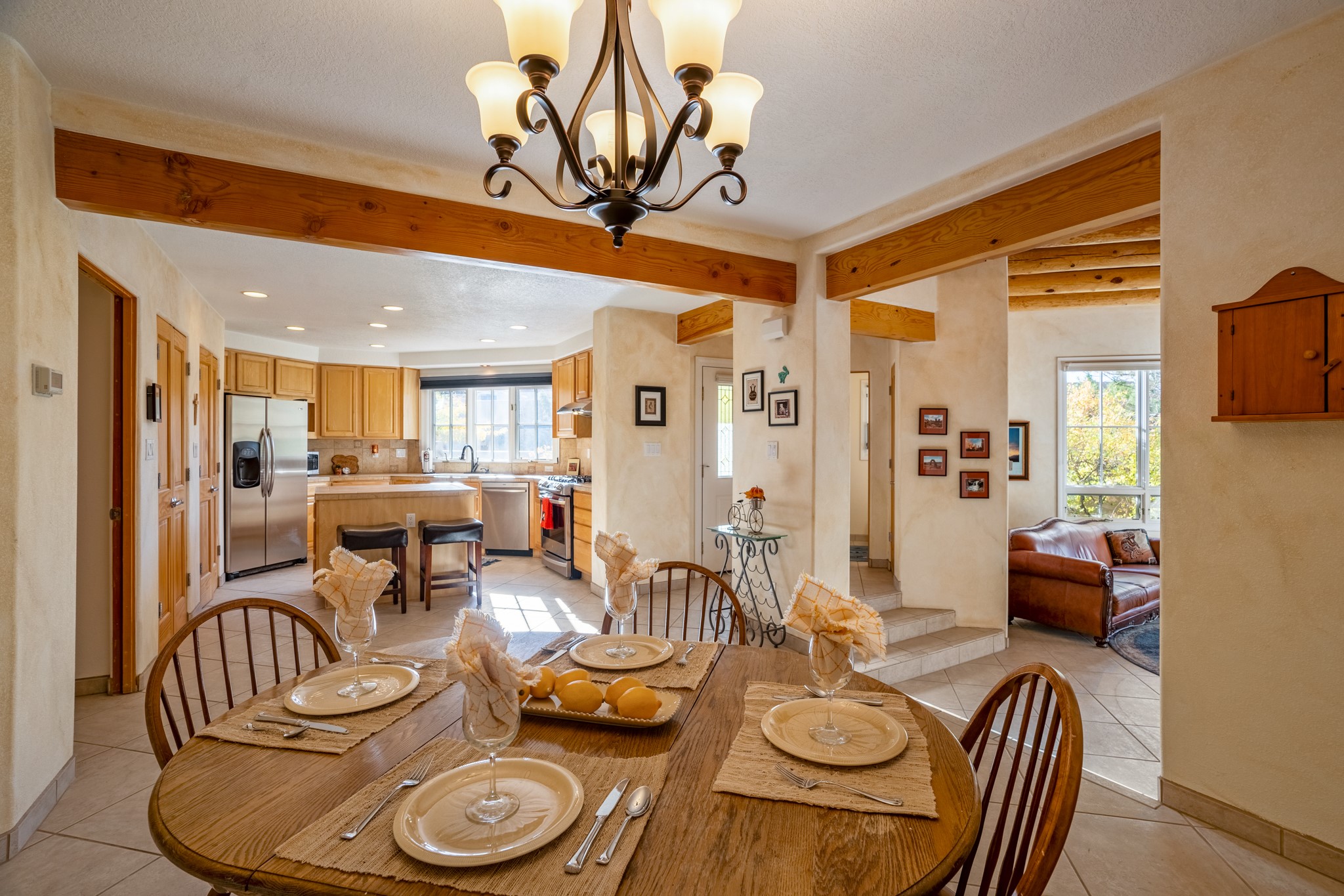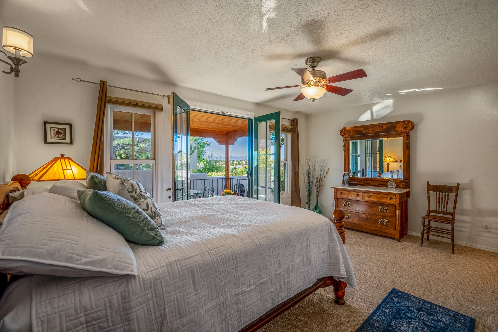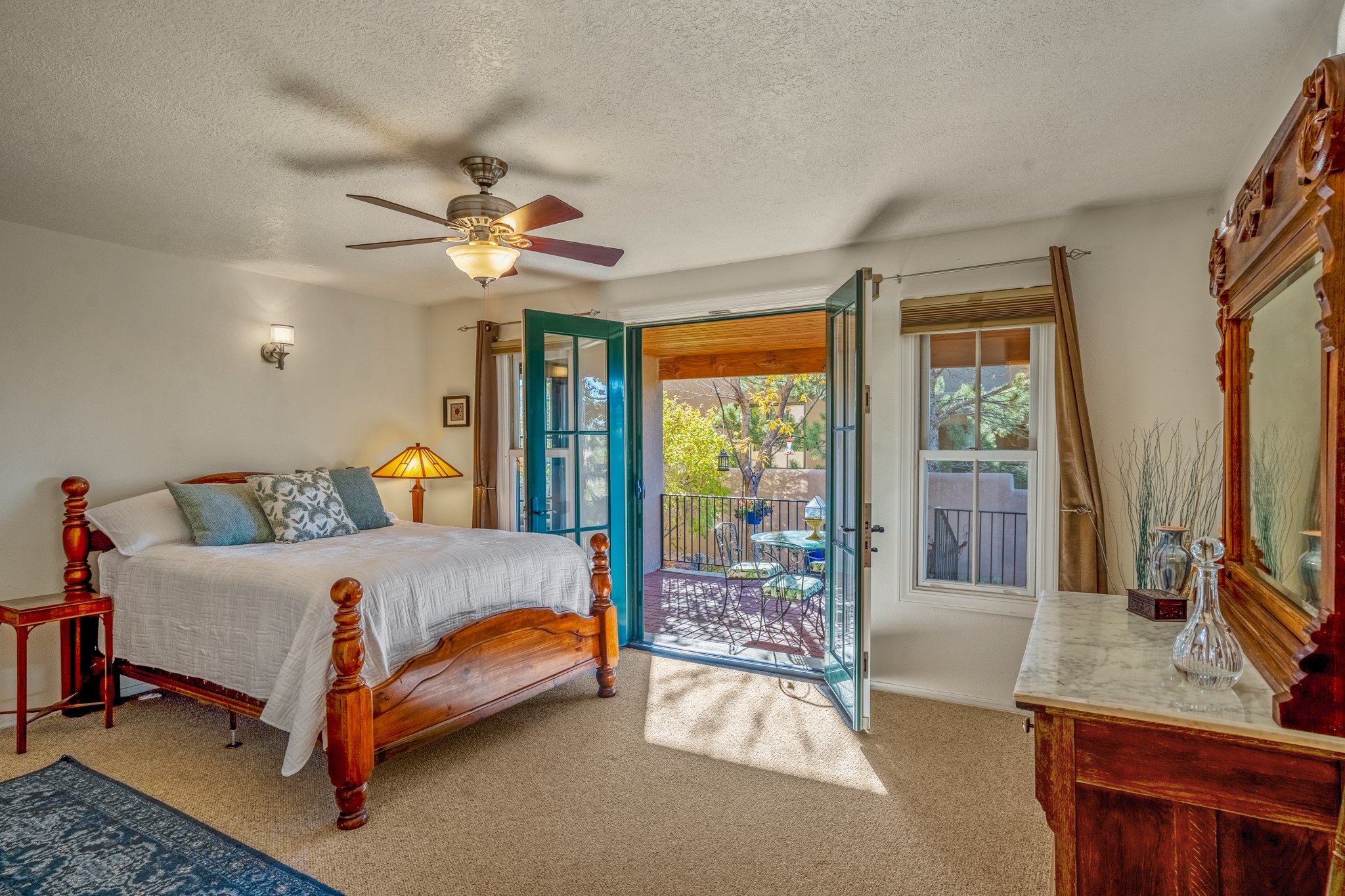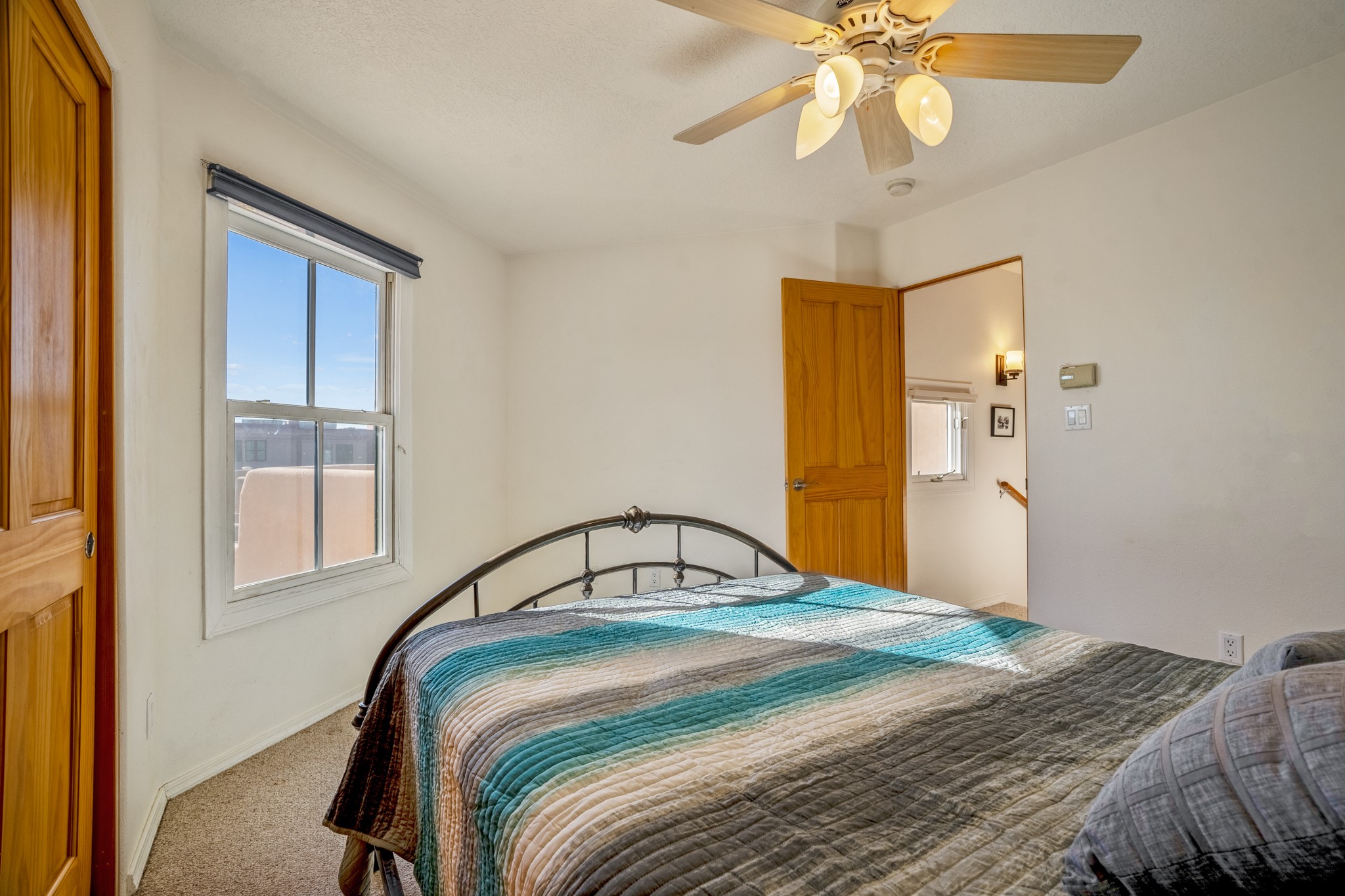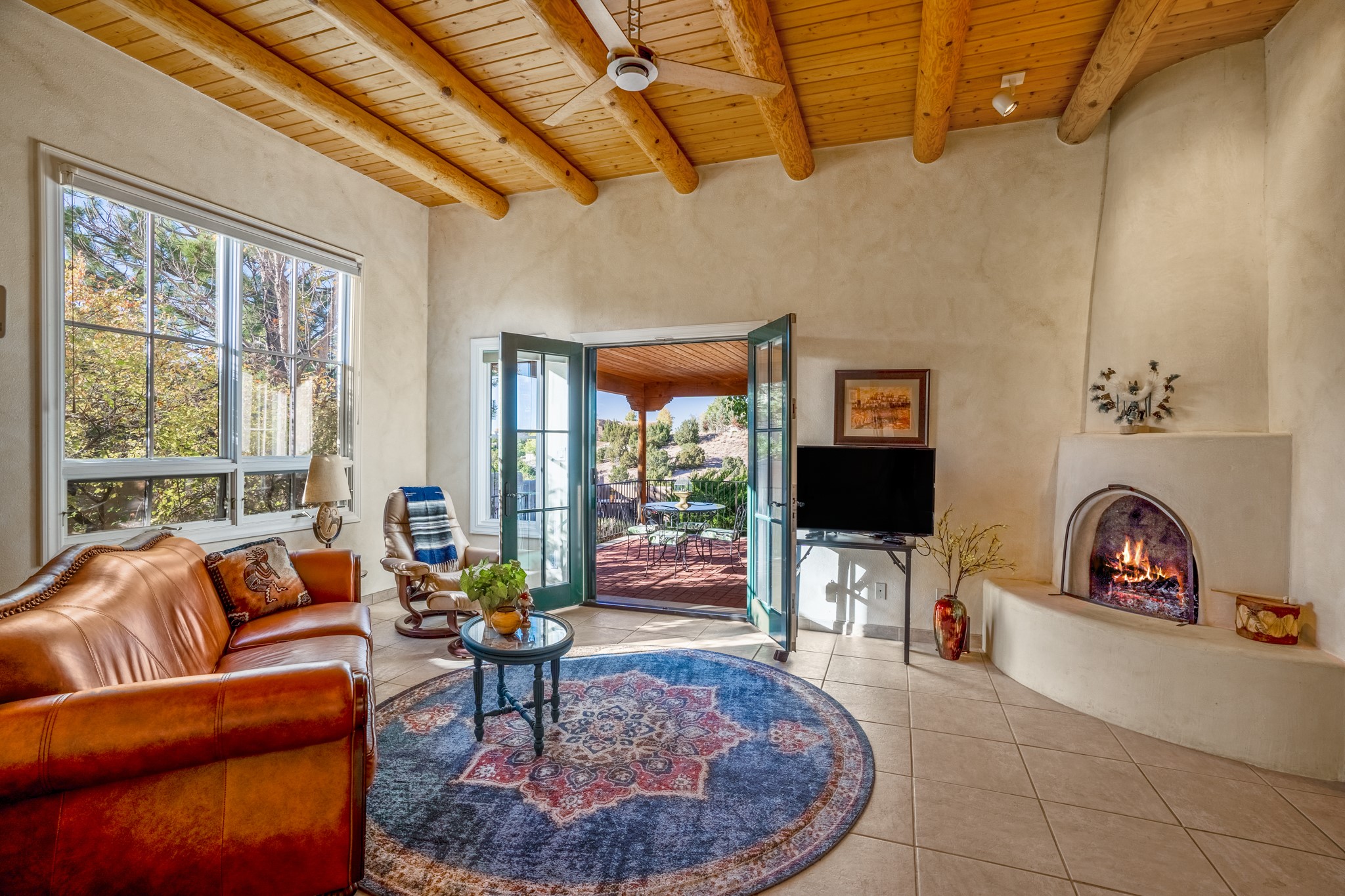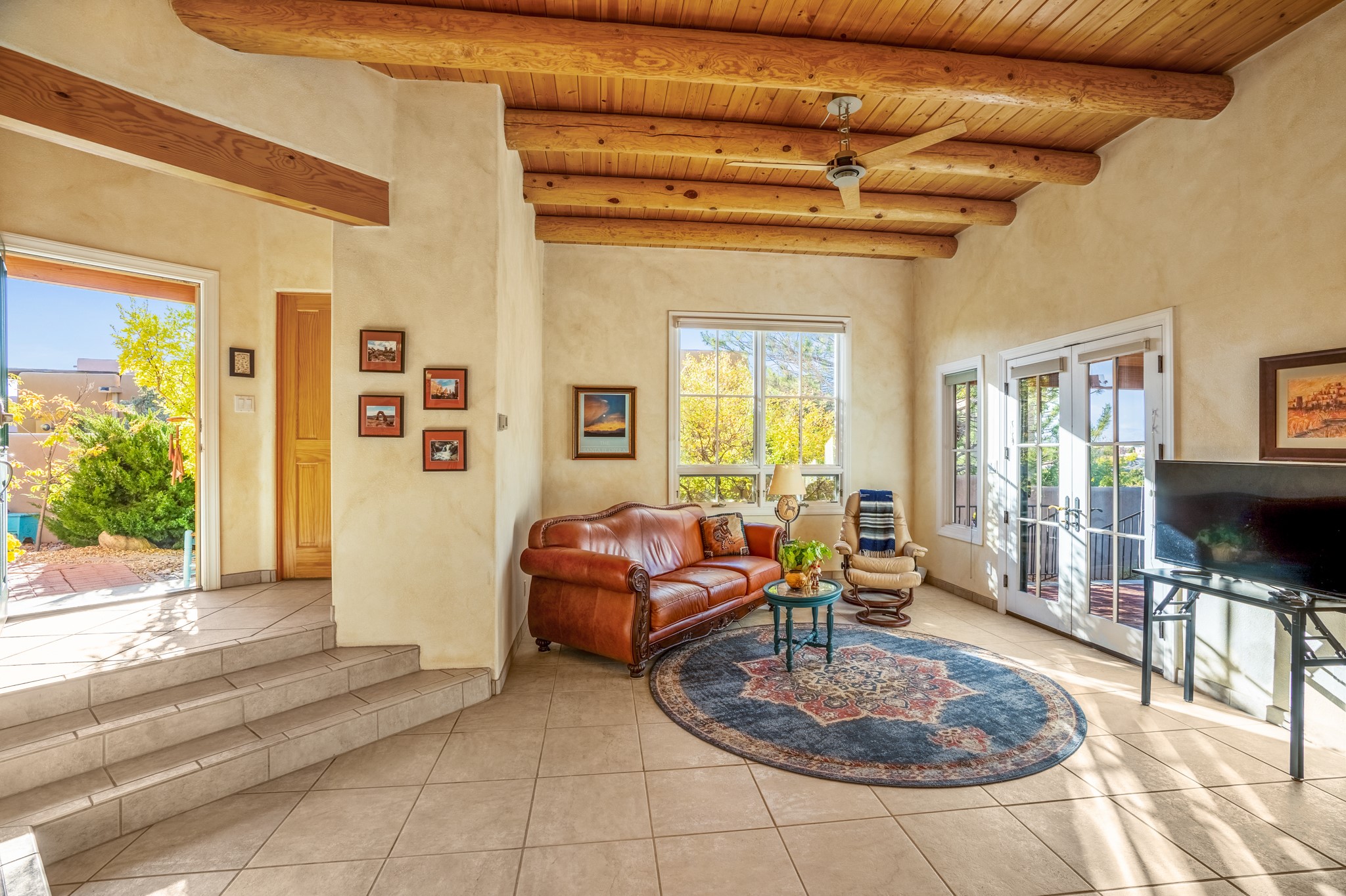 Bright, airy, contemporary patio home located in the heart of Aldea de Santa Fe. This light filled home features an open concept floor plan, first floor master suite, attached garage, radiant in floor heat, evaporative cooling, beautiful landscaping, drip irrigation and a large, covered patio with Jemez mountain views. The main living area has a high ceiling, vigas, large windows, faux paint and wood burning kiva fireplace. Kitchen features spacious pantries, maple cabinets, a center island and stainless Bosch and Amana appliances. The master suite includes a walk-in closet, jetted tub and large shower. French doors with screens in both the living room and master suite open directly to the patio. Two spacious, carpeted bedrooms and full bath are located on the second floor. The lovely and peaceful yard is completely walled for your furry friends. The front of the house faces Aldea open space, offering stunning mountain views and the serenity of a walkable community with fitness amenities, parks, and miles of walking trails. The home backs up to a large parking area for guests. Great location with easy access to NM 599, Los Alamos, downtown Santa Fe. Aldea de Santa Fe is a new urbanist subdivision that offers 13 miles of walking trails, community center, Bocci ball, tennis and basket-ball courts. Just steps away from Aldea plaza and specialty shops, caf, and businesses. community is great place to meet new friends with many special interest clubs in place.