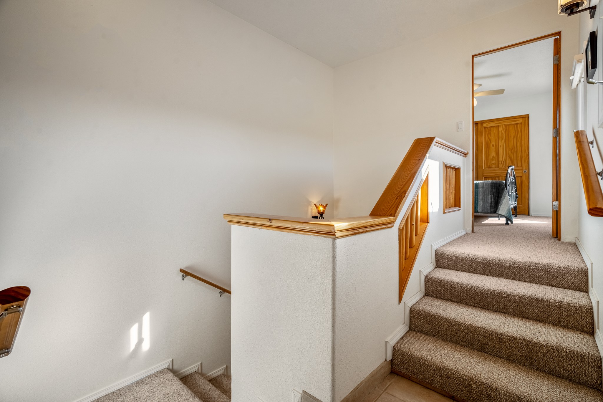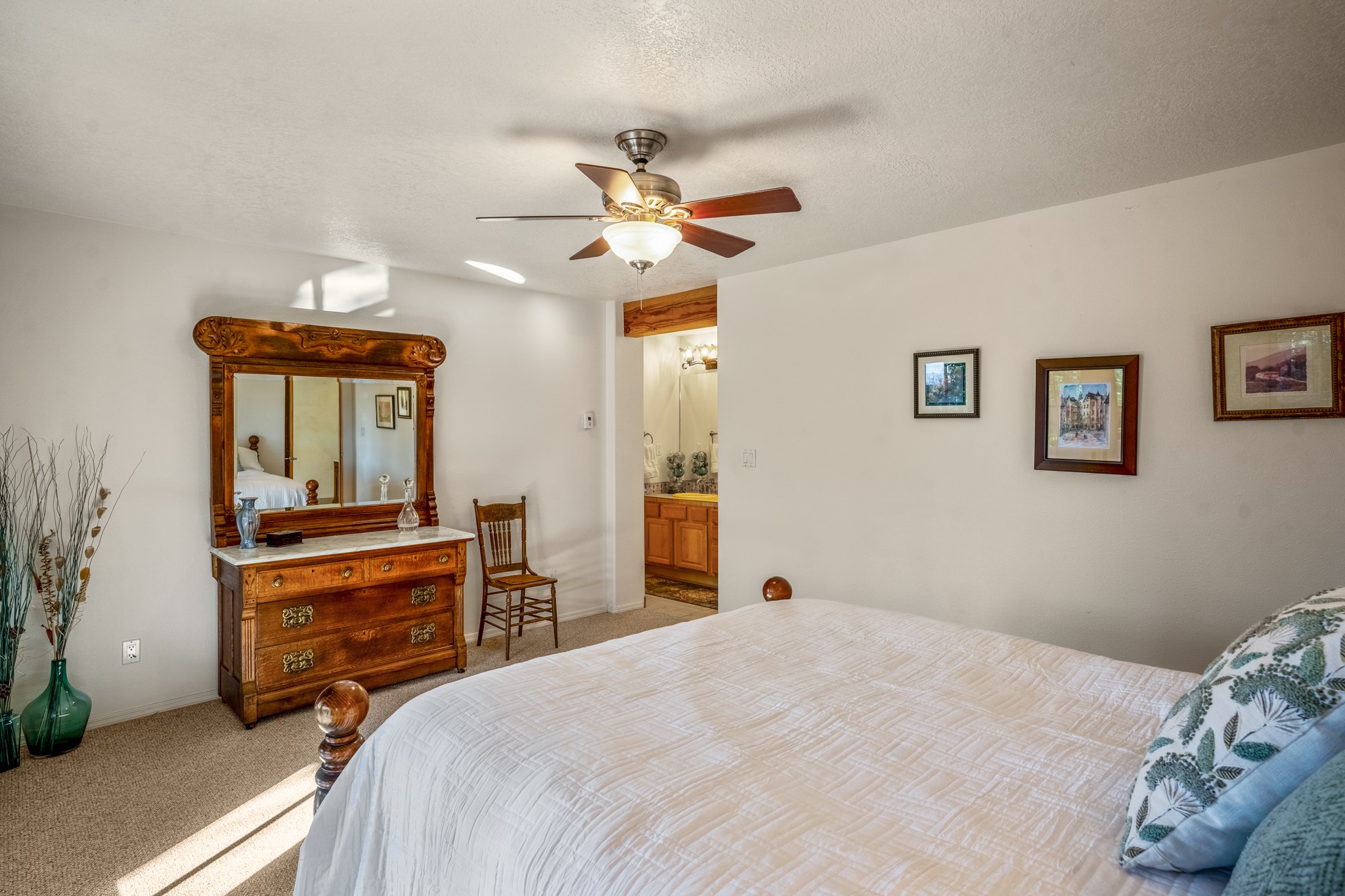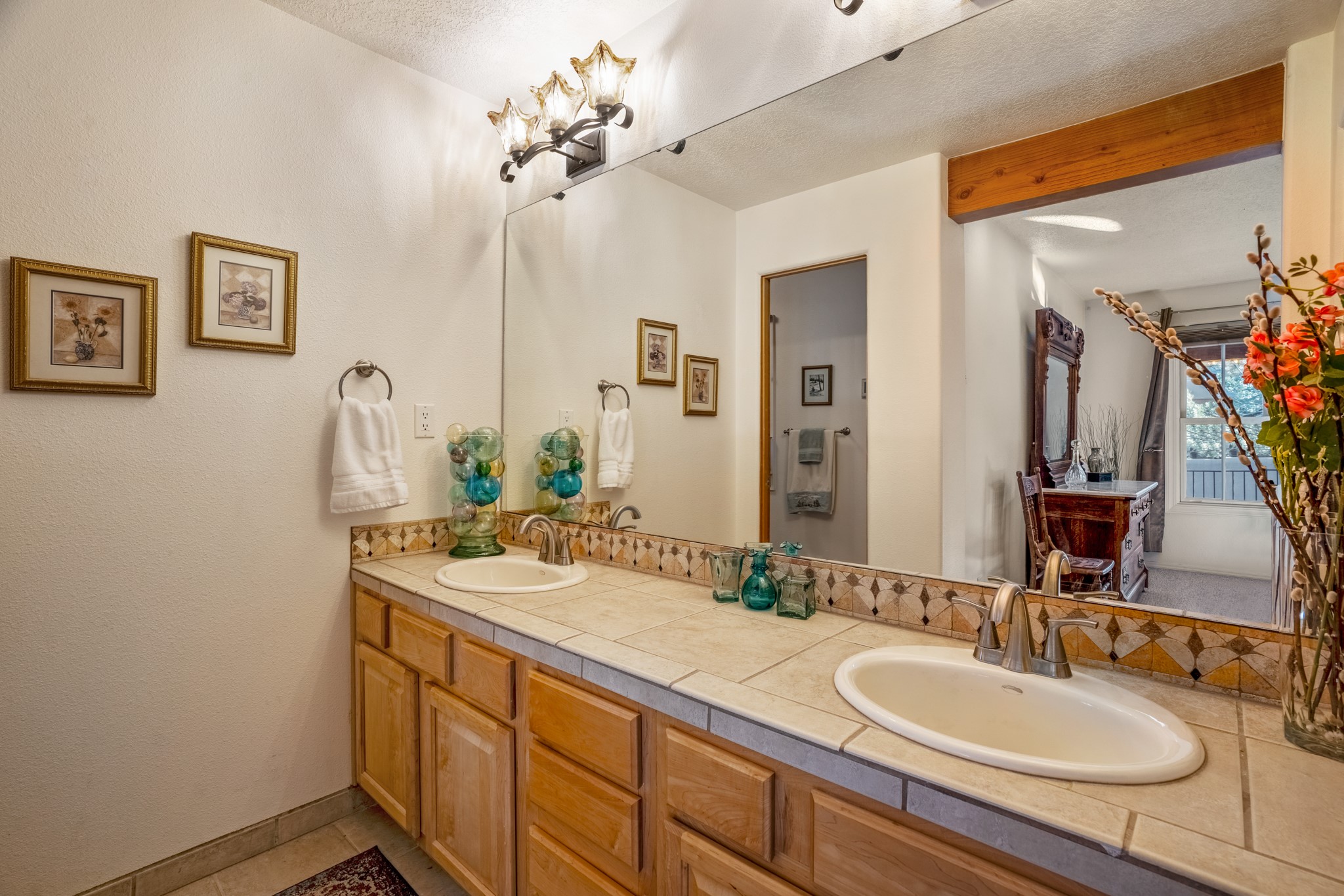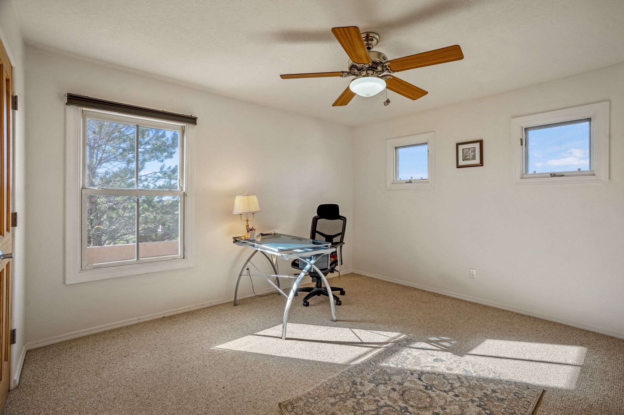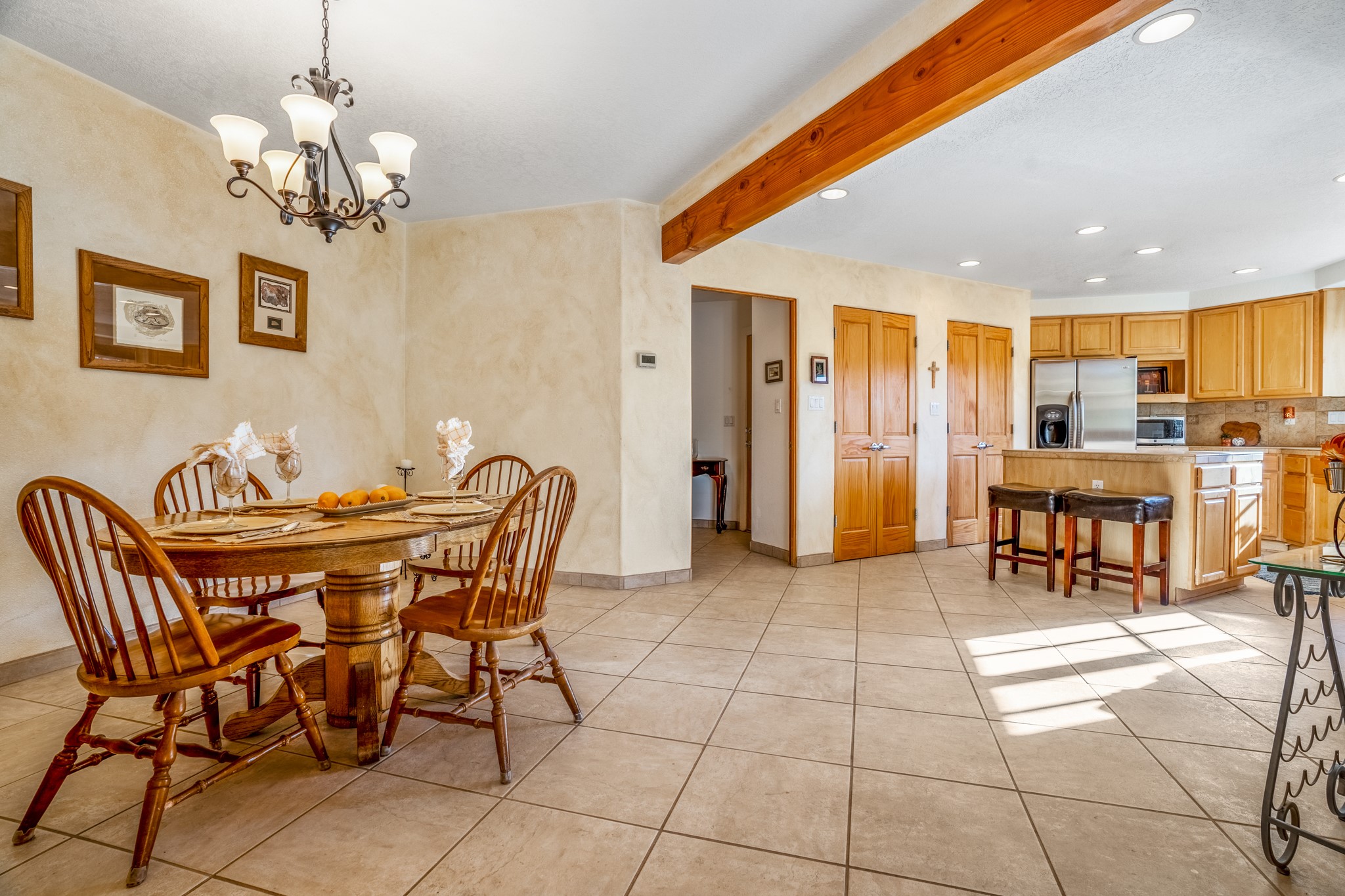 Bright, airy, contemporary patio home located in the heart of Aldea de Santa Fe. This light filled home features an open concept floor plan, first floor master suite, attached garage, radiant in floor heat, evaporative cooling, beautiful landscaping, drip irrigation and a large, covered patio with Jemez mountain views. The main living area has a high ceiling, vigas, large windows, faux paint and wood burning kiva fireplace. Kitchen features spacious pantries, maple cabinets, a center island and stainless Bosch and Amana appliances. The master suite includes a walk-in closet, jetted tub and large shower. French doors with screens in both the living room and master suite open directly to the patio. Two spacious, carpeted bedrooms and full bath are located on the second floor. The lovely and peaceful yard is completely walled for your furry friends. The front of the house faces Aldea open space, offering stunning mountain views and the serenity of a walkable community with fitness amenities, parks, and miles of walking trails. The home backs up to a large parking area for guests. Great location with easy access to NM 599, Los Alamos, downtown Santa Fe. Aldea de Santa Fe is a new urbanist subdivision that offers 13 miles of walking trails, community center, Bocci ball, tennis and basket-ball courts. Just steps away from Aldea plaza and specialty shops, caf, and businesses. community is great place to meet new friends with many special interest clubs in place.
