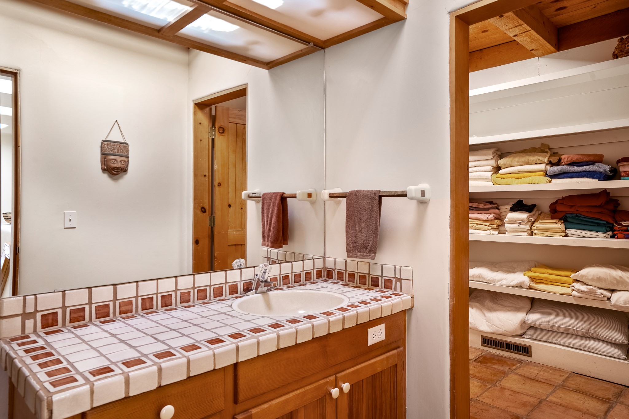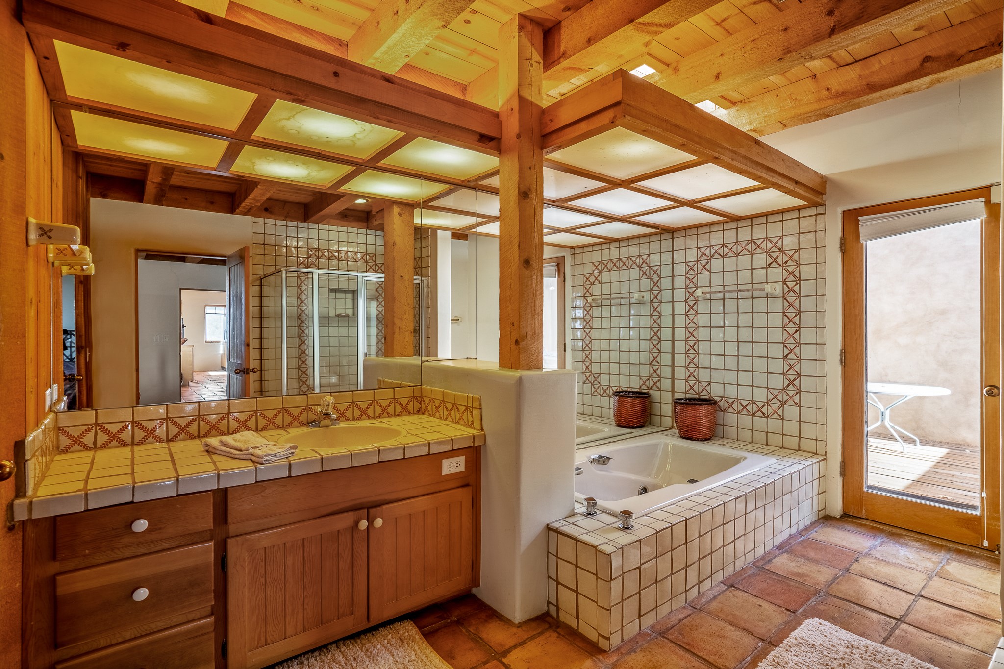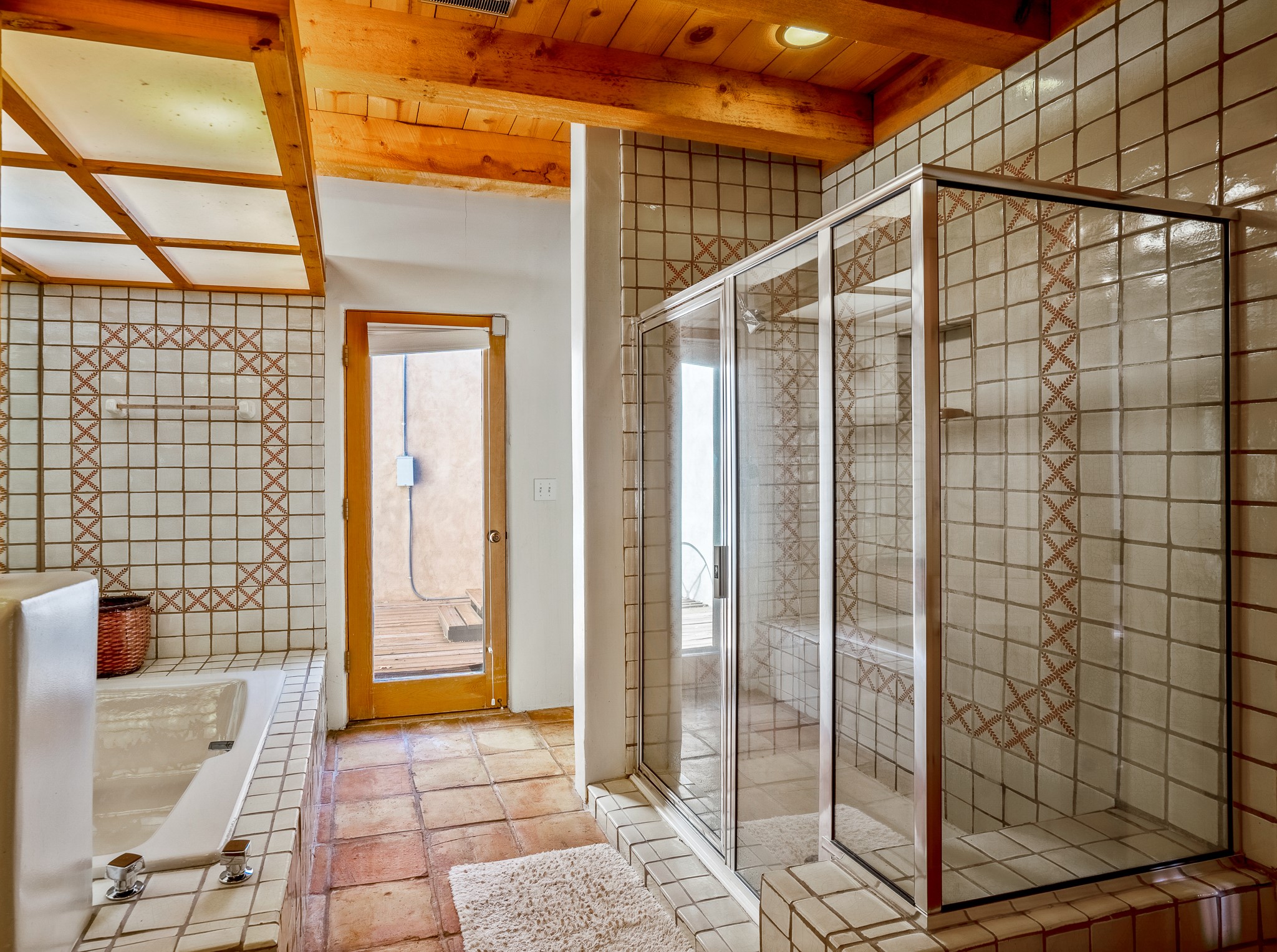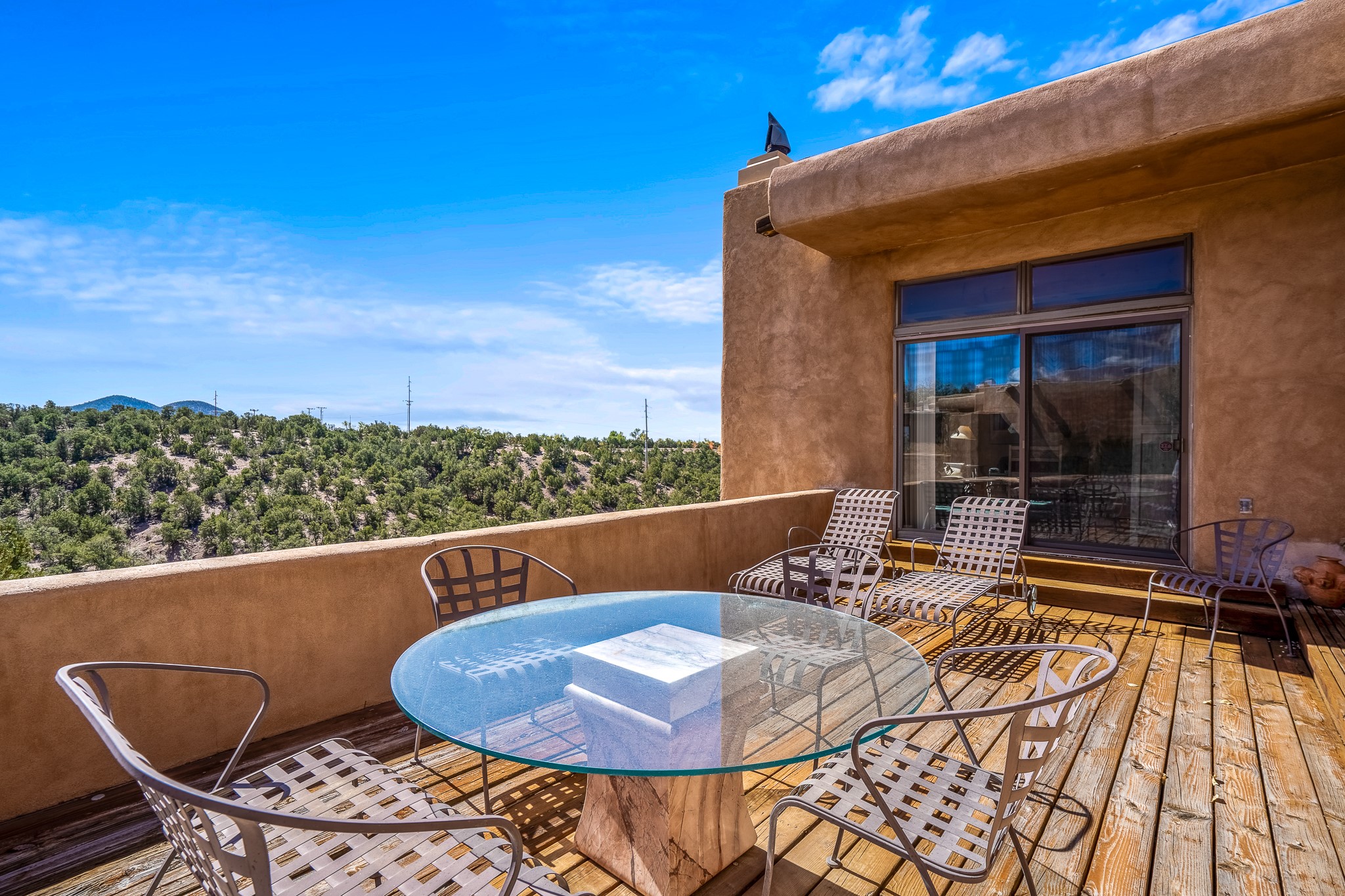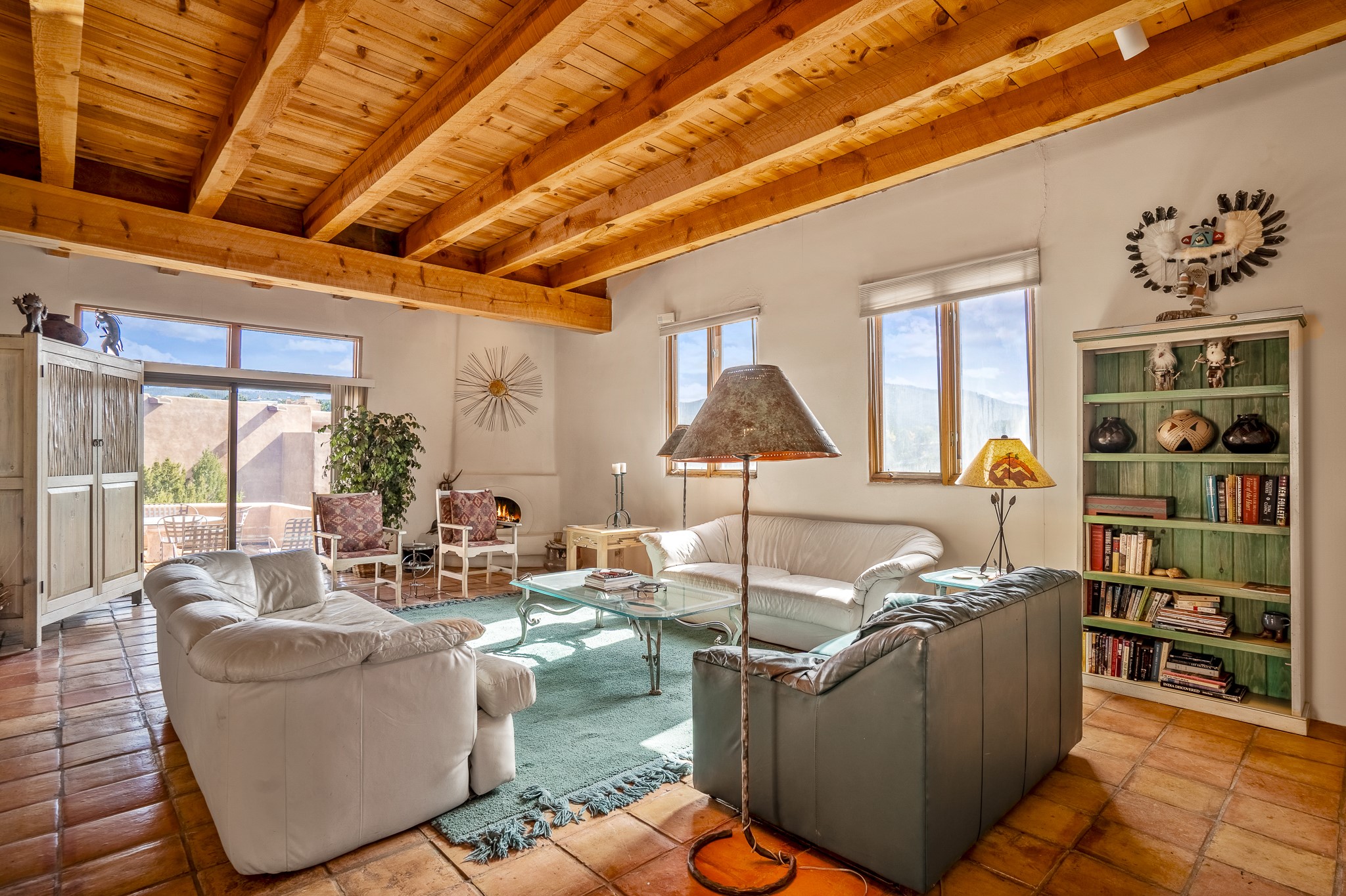 Just minutes from the plaza, this spacious home offers breathtaking views while providing unsurpassed comfort. High beamed ceilings and Saltillo tile floors, accented by abundant sunlight provide you with the warmth of the rich Santa Fe Culture. Over 3,100 square feet of floor space feature open living space on the main level with additional rooms, bathroom and den/play area for kids or entertaining guests. Two decks, one with a private courtyard and hot tub and the other offering fantastic views of the Sangre de Cristo mountains, expand upon the awe-inspiring living experience this condo offers. With a two-car garage, central A/C and heating, manicured grounds, and gated access, this property is an incredible opportunity for the discerning buyer.