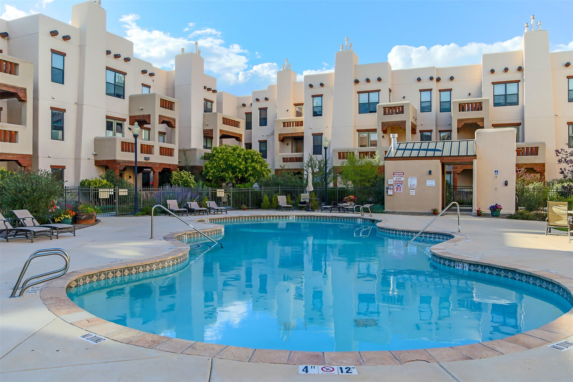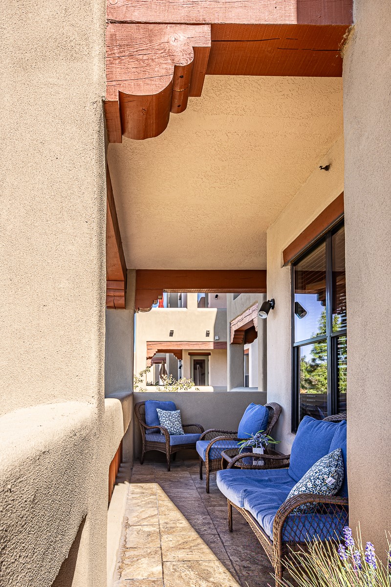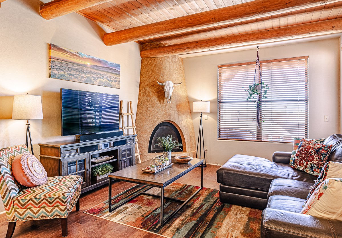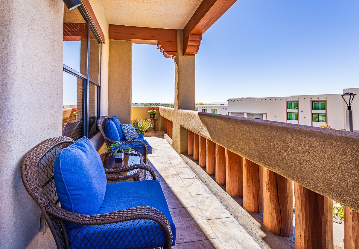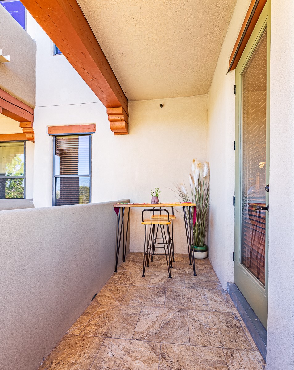 Welcome to the Alameda Condominiums, where luxury and style come together in this glamorous second-floor condo. This 2 BR/2 BA, 1171 sf Pueblo-style residence is perfectly positioned in a coveted corner location, offering views from east to west via the wraparound patio. Luxe appointments abound in the sun-drenched interior: espresso flooring, beautiful vigas, a gas Kiva FP, updated lighting, gleaming slate and granite, quartz kitchen sink, hi-end refrigerator, double ovens, and a new Samsung washer-dryer duo. The master suite is a sanctuary of comfort, with a dazzling bathroom featuring double sinks, glass shower, deep soaking tub, and a spacious walk-in closet. A well-appointed guest wing with its own second bathroom, walk-in closet, and office nook provides ample space for family or guests. This condo is conveniently located near the elevator, fitness center, and lobby for added ease of access. ***The package is complete with a jumbo STORAGE UNIT and a one-car GARAGE*** plus 2 additional parking spaces in the gated lot. Building amenities include pool, fitness center, full-time onsite management, community rooms, library, gated parking, and 24-hour controlled access for your peace of mind. Alameda Condominiums is ideally located, just 12 minutes away from the Santa Fe Plaza, offering easy access to the city's vibrant cultural and culinary scene. With so much to love in this remarkable condo, this is a rare opportunity to experience the ultimate in Santa Fe living.