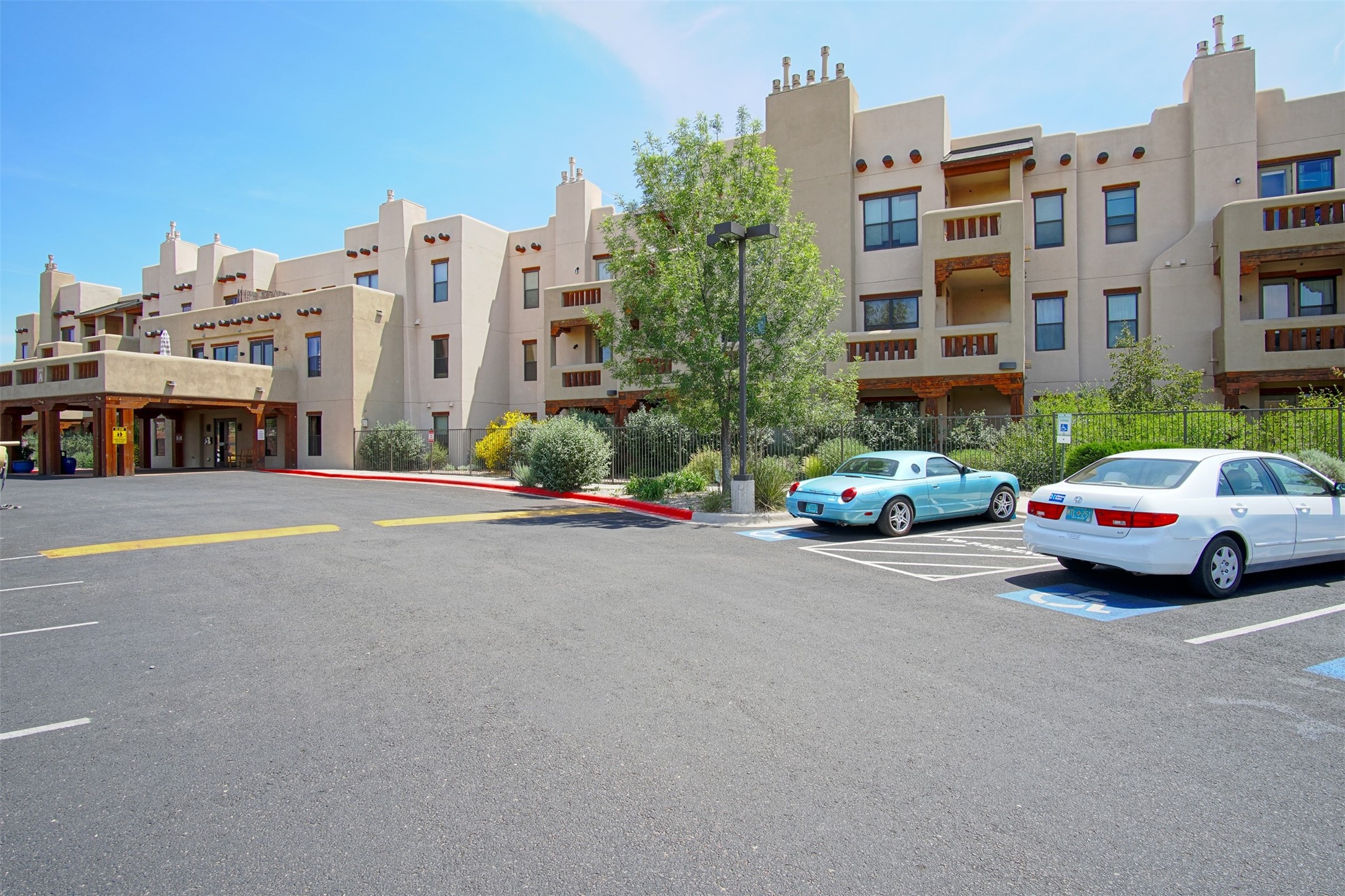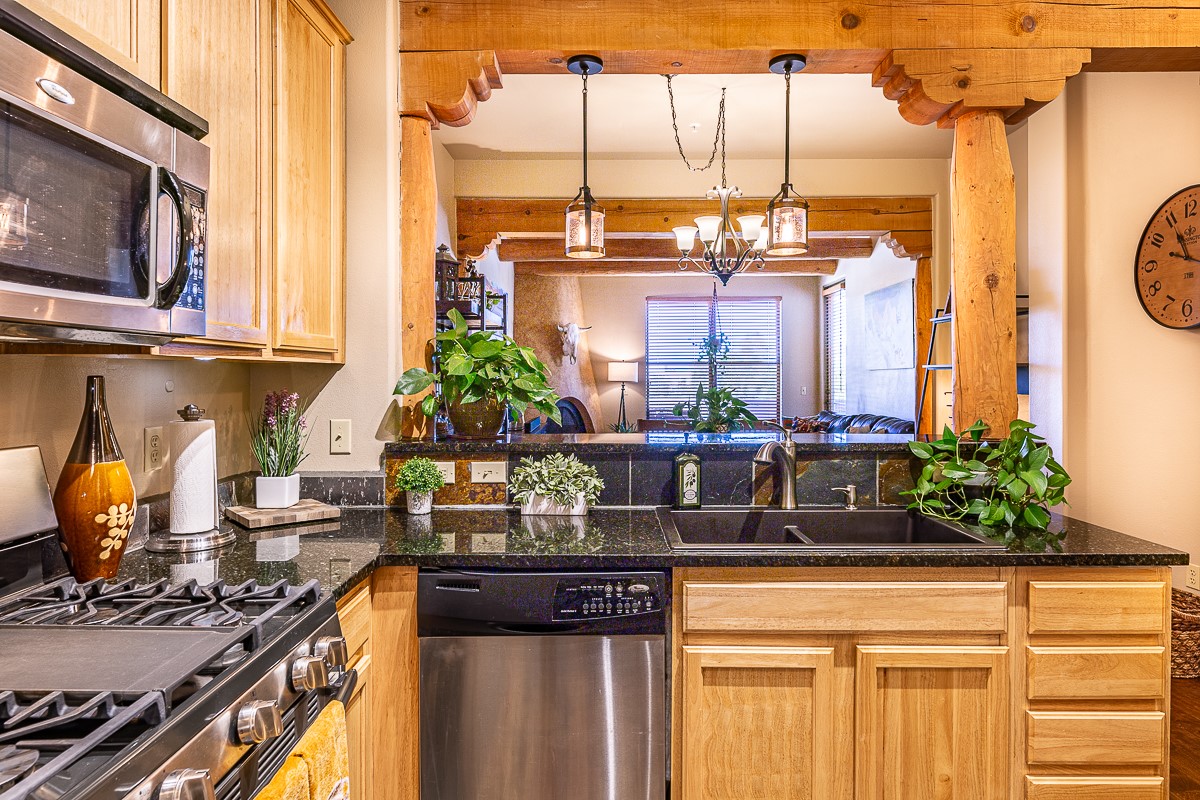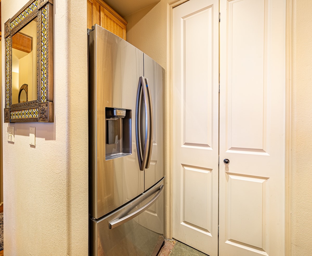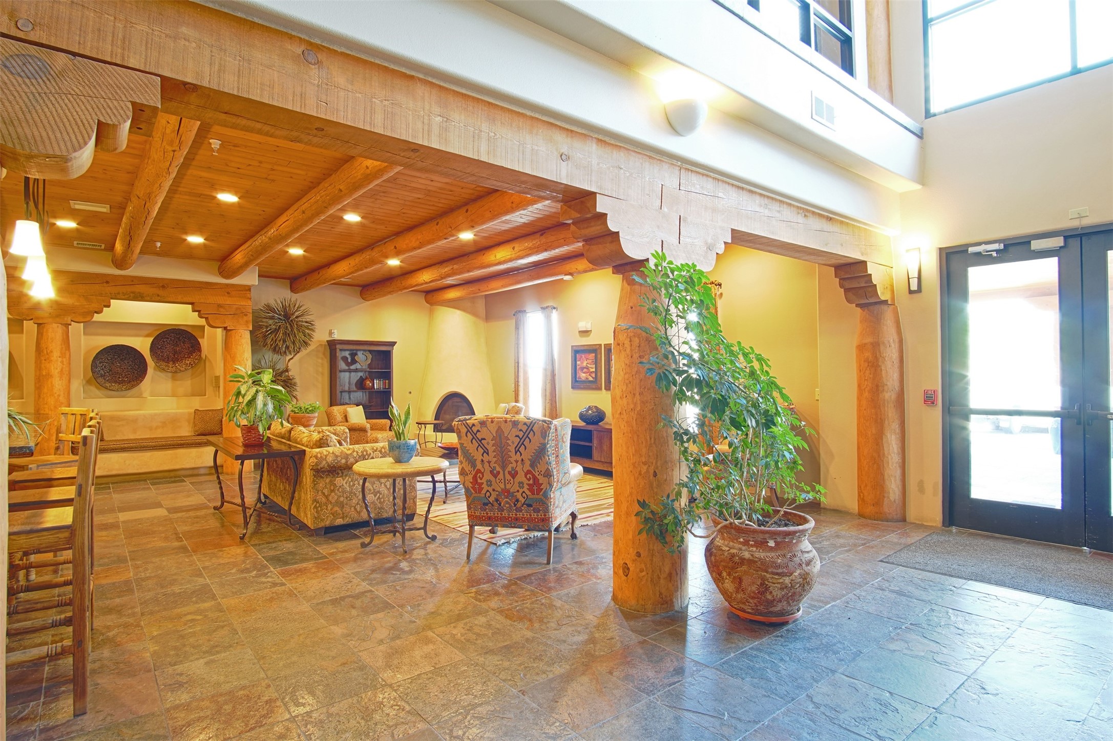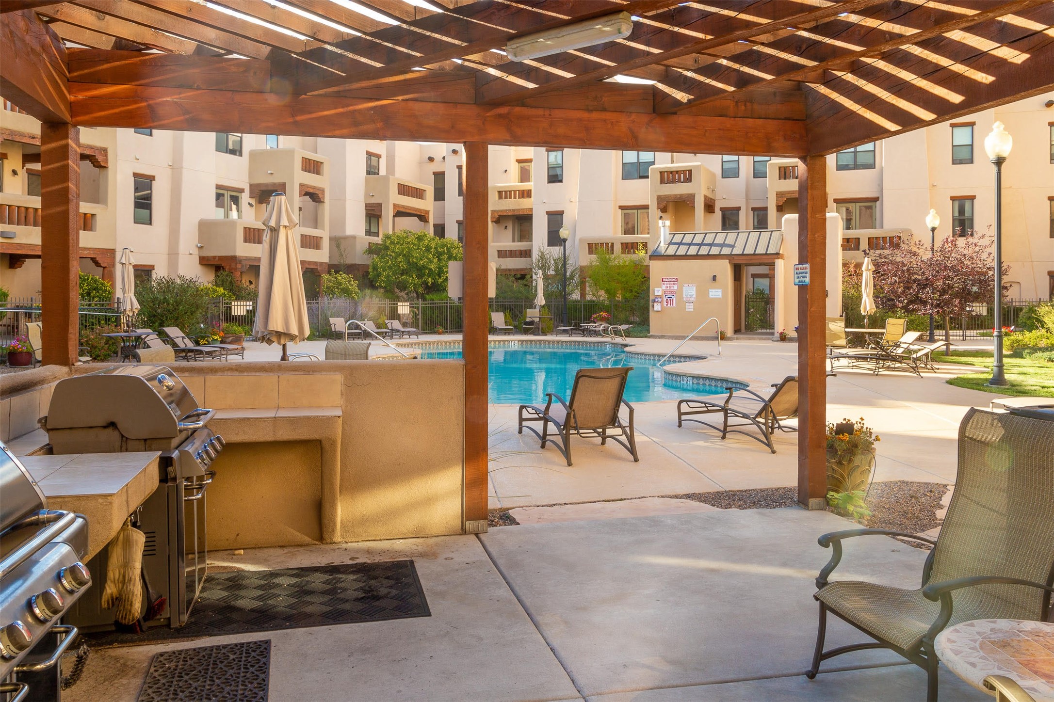 Welcome to the Alameda Condominiums, where luxury and style come together in this glamorous second-floor condo. This 2 BR/2 BA, 1171 sf Pueblo-style residence is perfectly positioned in a coveted corner location, offering views from east to west via the wraparound patio. Luxe appointments abound in the sun-drenched interior: espresso flooring, beautiful vigas, a gas Kiva FP, updated lighting, gleaming slate and granite, quartz kitchen sink, hi-end refrigerator, double ovens, and a new Samsung washer-dryer duo. The master suite is a sanctuary of comfort, with a dazzling bathroom featuring double sinks, glass shower, deep soaking tub, and a spacious walk-in closet. A well-appointed guest wing with its own second bathroom, walk-in closet, and office nook provides ample space for family or guests. This condo is conveniently located near the elevator, fitness center, and lobby for added ease of access. ***The package is complete with a jumbo STORAGE UNIT and a one-car GARAGE*** plus 2 additional parking spaces in the gated lot. Building amenities include pool, fitness center, full-time onsite management, community rooms, library, gated parking, and 24-hour controlled access for your peace of mind. Alameda Condominiums is ideally located, just 12 minutes away from the Santa Fe Plaza, offering easy access to the city's vibrant cultural and culinary scene. With so much to love in this remarkable condo, this is a rare opportunity to experience the ultimate in Santa Fe living.