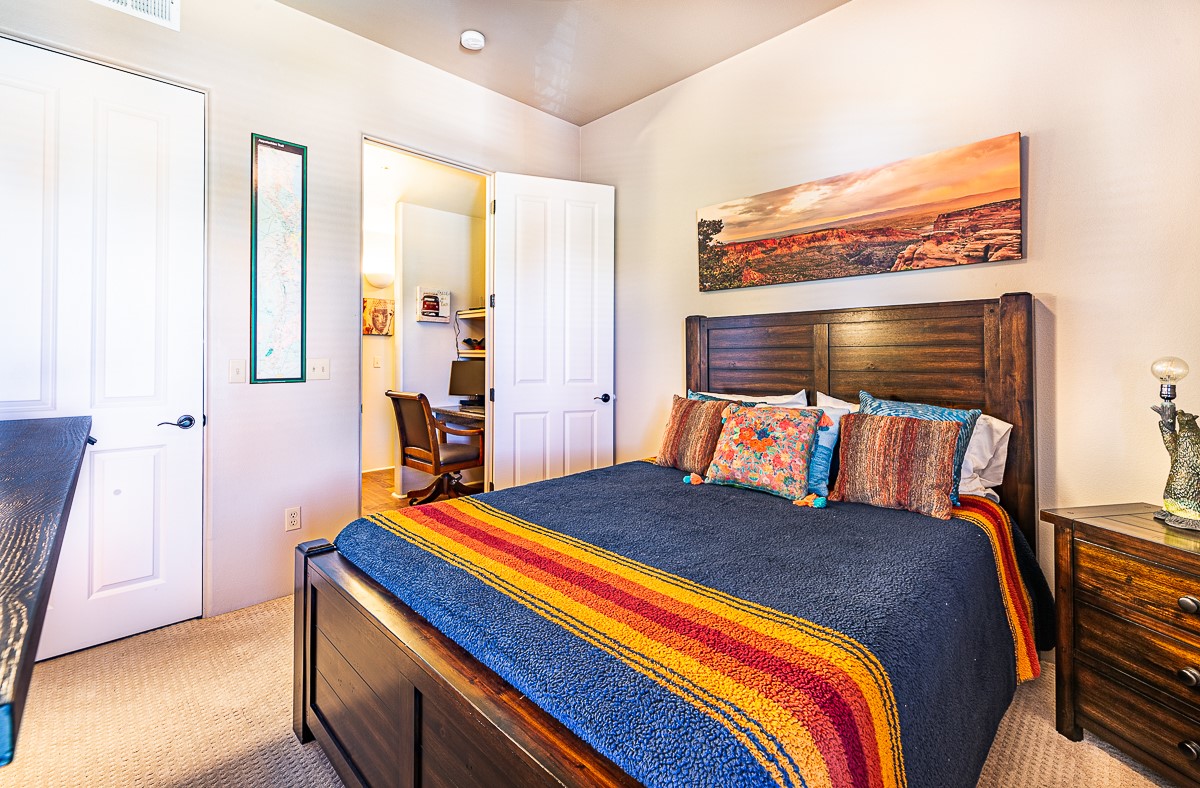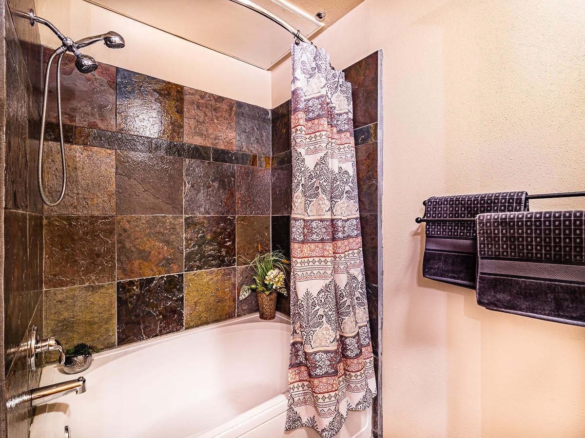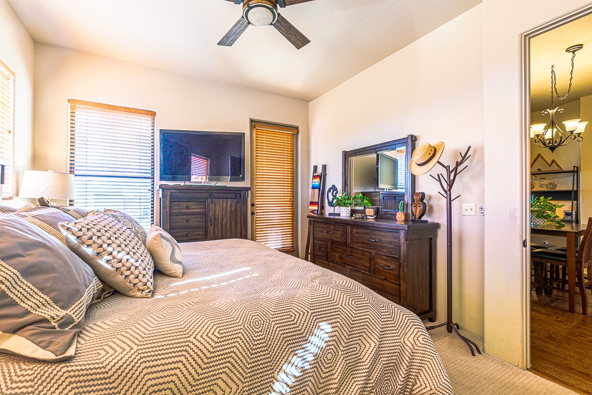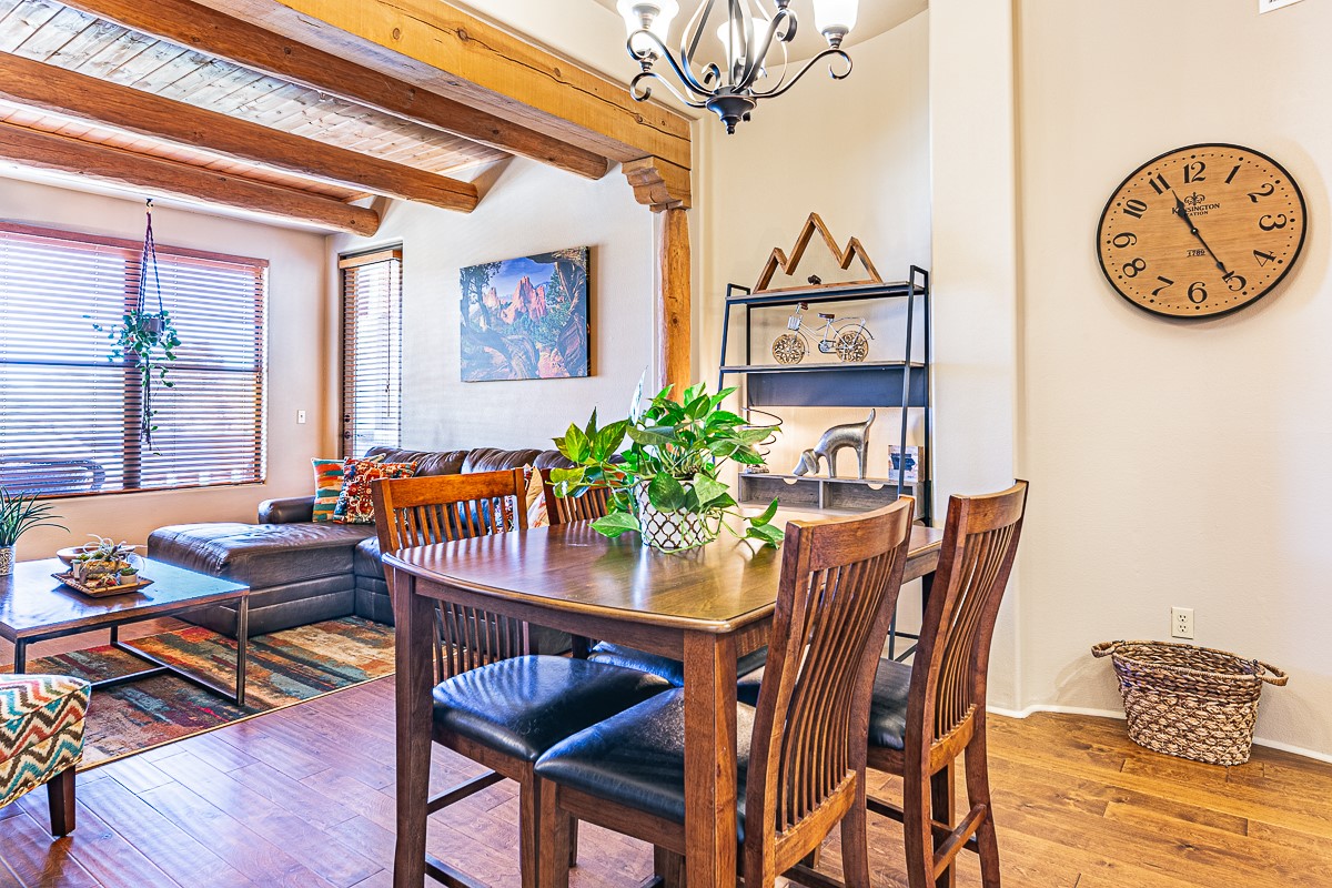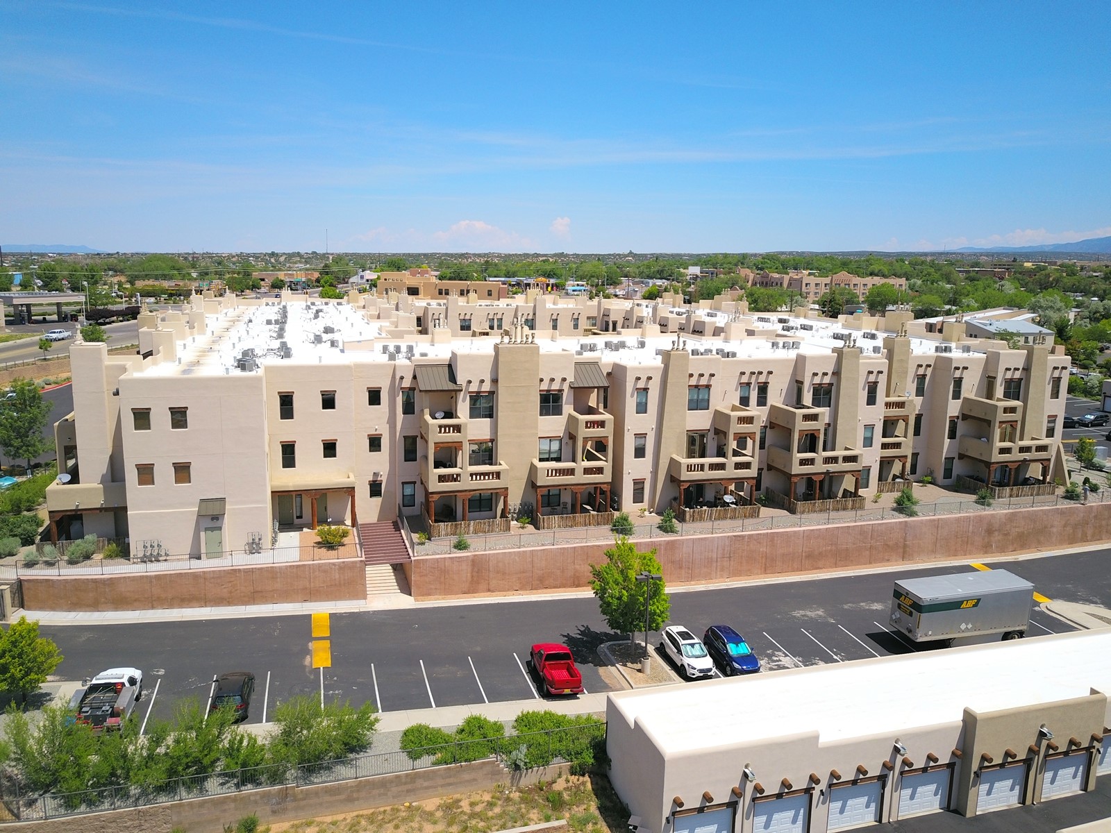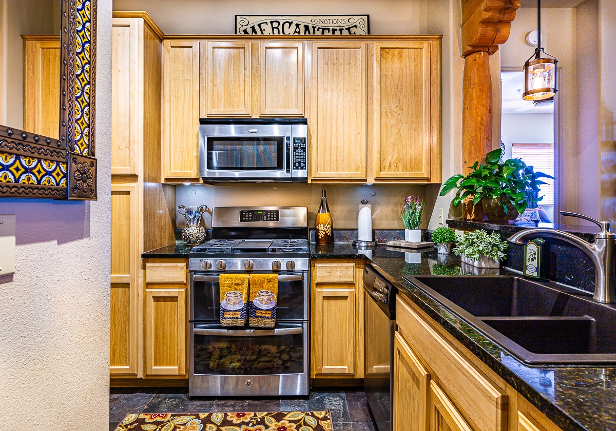 Welcome to the Alameda Condominiums, where luxury and style come together in this glamorous second-floor condo. This 2 BR/2 BA, 1171 sf Pueblo-style residence is perfectly positioned in a coveted corner location, offering views from east to west via the wraparound patio. Luxe appointments abound in the sun-drenched interior: espresso flooring, beautiful vigas, a gas Kiva FP, updated lighting, gleaming slate and granite, quartz kitchen sink, hi-end refrigerator, double ovens, and a new Samsung washer-dryer duo. The master suite is a sanctuary of comfort, with a dazzling bathroom featuring double sinks, glass shower, deep soaking tub, and a spacious walk-in closet. A well-appointed guest wing with its own second bathroom, walk-in closet, and office nook provides ample space for family or guests. This condo is conveniently located near the elevator, fitness center, and lobby for added ease of access. ***The package is complete with a jumbo STORAGE UNIT and a one-car GARAGE*** plus 2 additional parking spaces in the gated lot. Building amenities include pool, fitness center, full-time onsite management, community rooms, library, gated parking, and 24-hour controlled access for your peace of mind. Alameda Condominiums is ideally located, just 12 minutes away from the Santa Fe Plaza, offering easy access to the city's vibrant cultural and culinary scene. With so much to love in this remarkable condo, this is a rare opportunity to experience the ultimate in Santa Fe living.