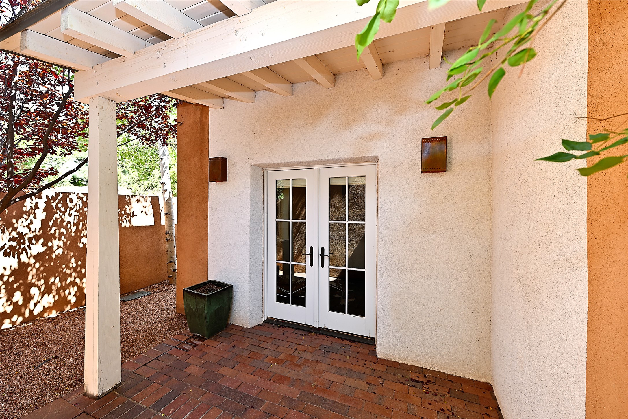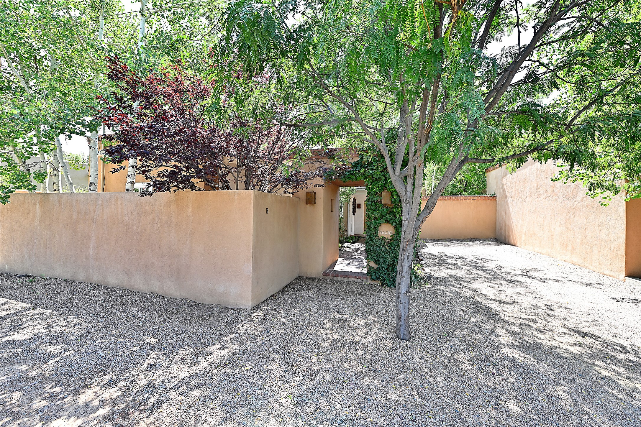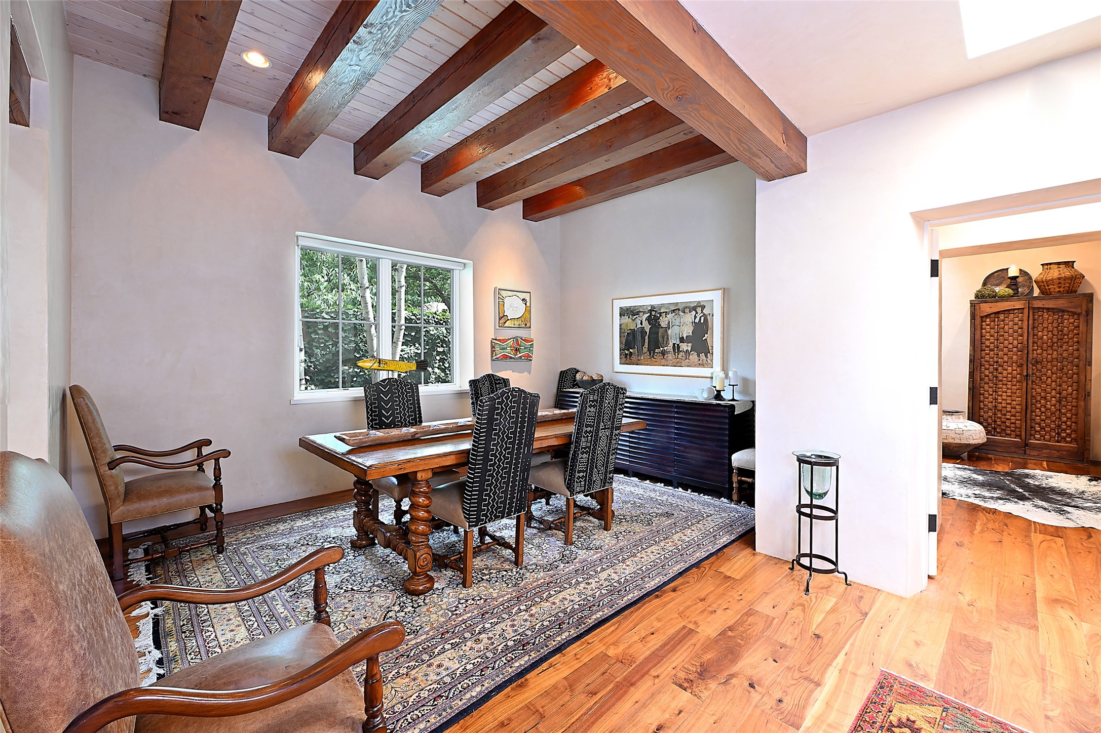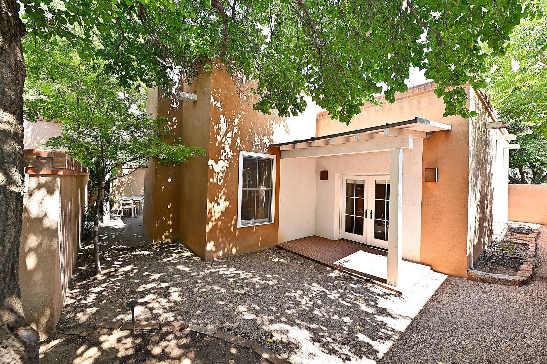 A unique opportunity to own a 3 bedroom 2.5 bath New Mexico Territorial style home in the Historic Eastside. Built in 2006 on a private lane. Single level, no interior steps. Inviting layout with wood flooring throughout. Open concept living and dining with warm, wooden beams and fireplace with brick surround. Sleek, modern kitchen is appointed with recessed lighting, double sink, a 6-burner gas range and plentiful cabinetry. Split bedroom plan for privacy. Primary suite has access to an outdoor courtyard, dual walk-in closets and an ensuite bath. Several private patio areas expand options for entertaining and dining. Central cooling system and radiant heating. There are 2 off-street designated parking spaces - an important feature in this limited Eastside location. Close to Downtown Subscription, Kaune's Neighborhood Market, and Canyon Road.