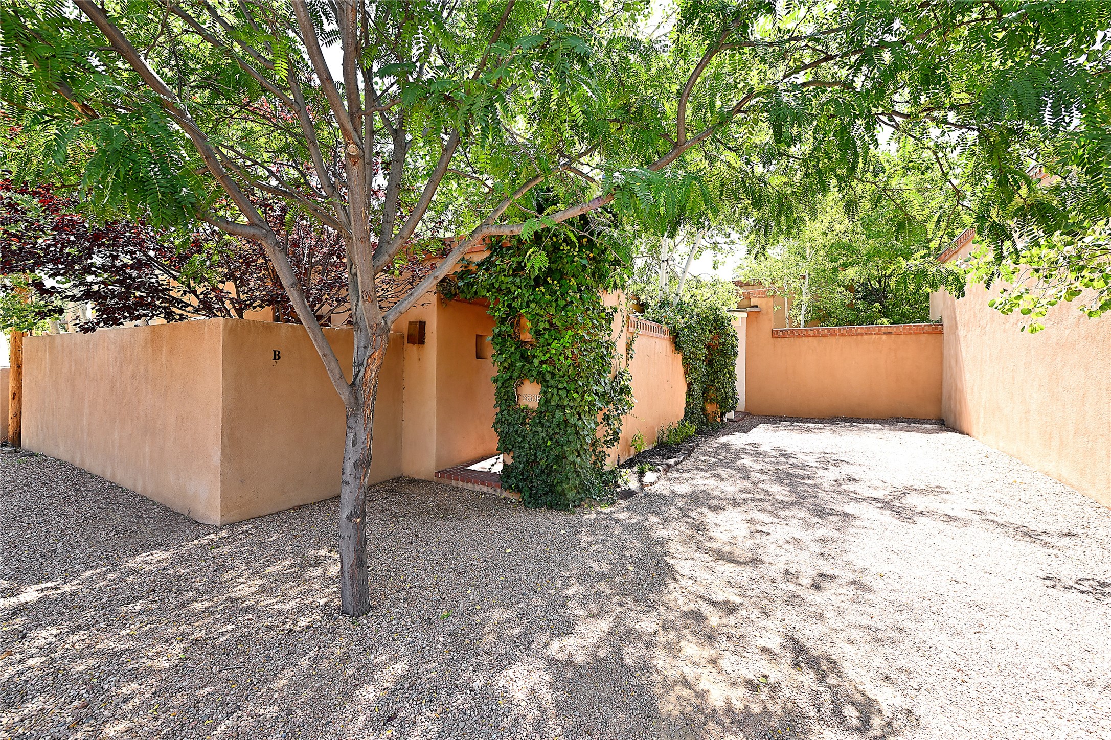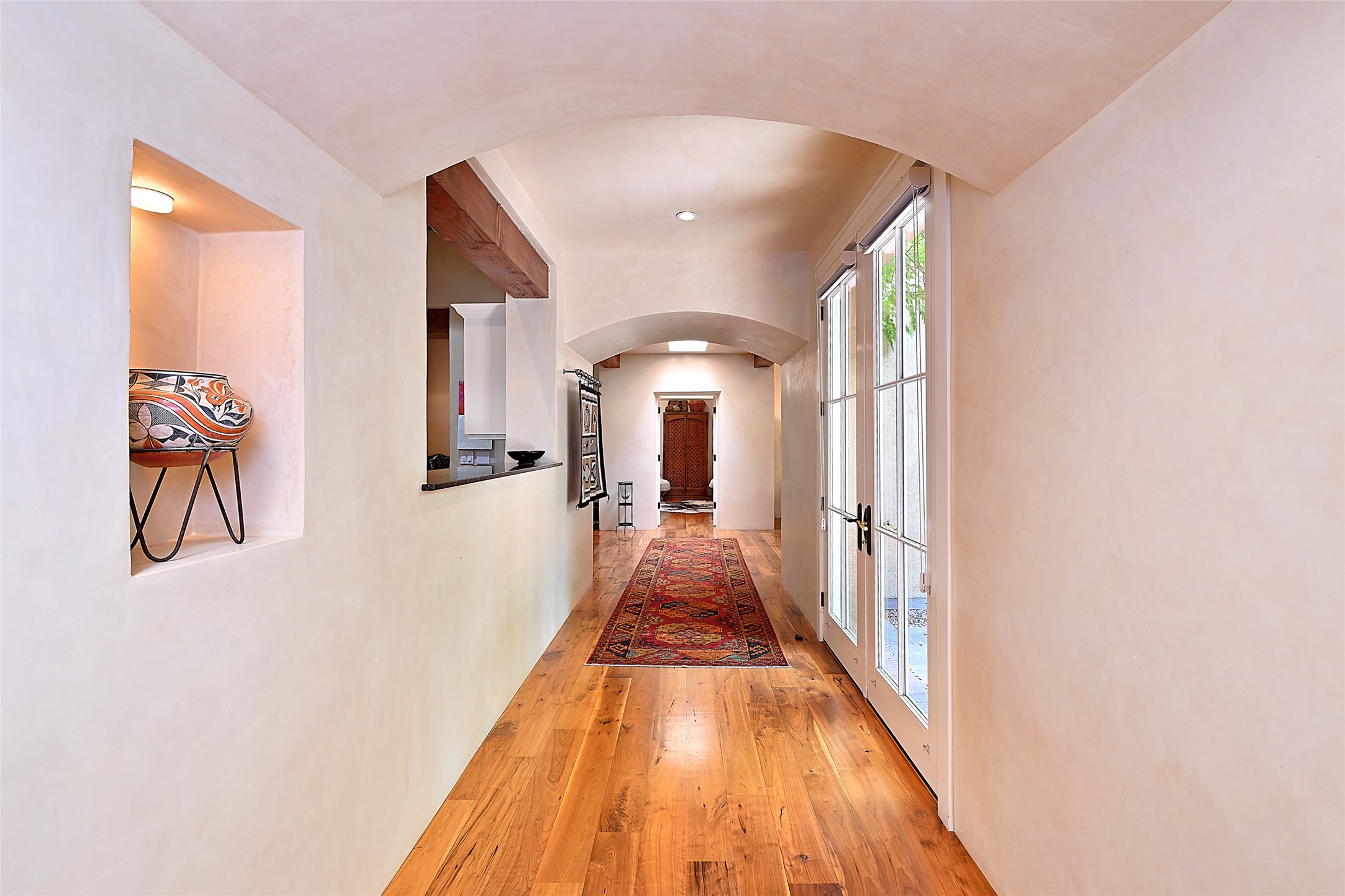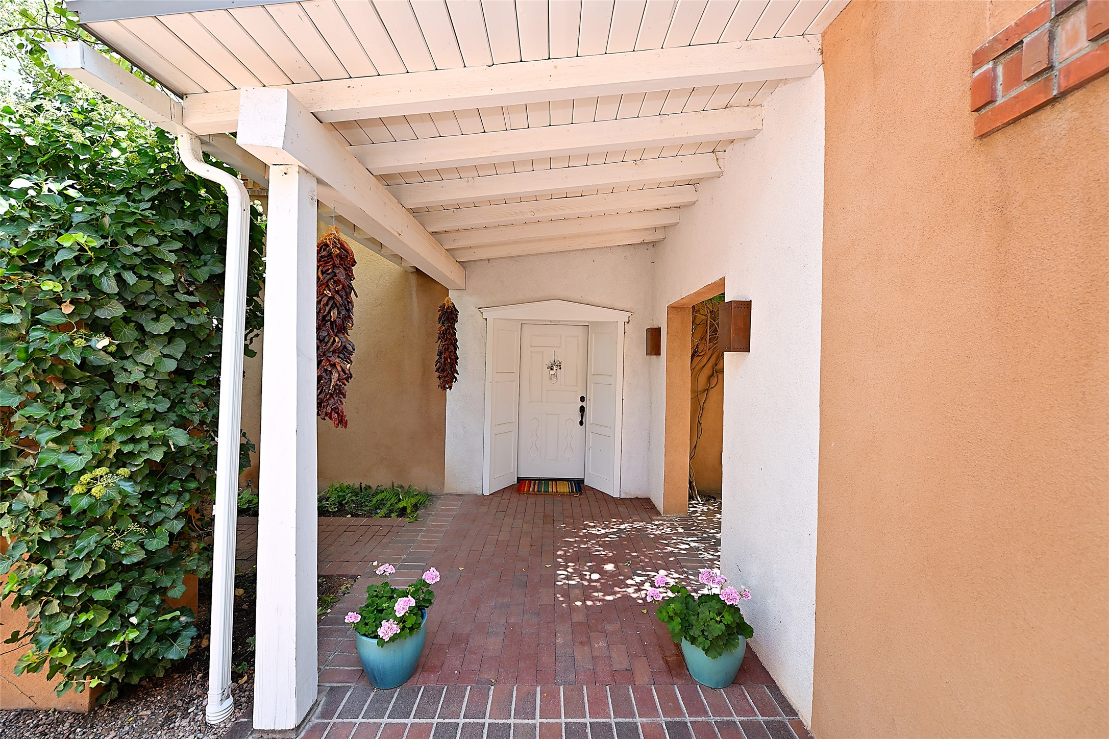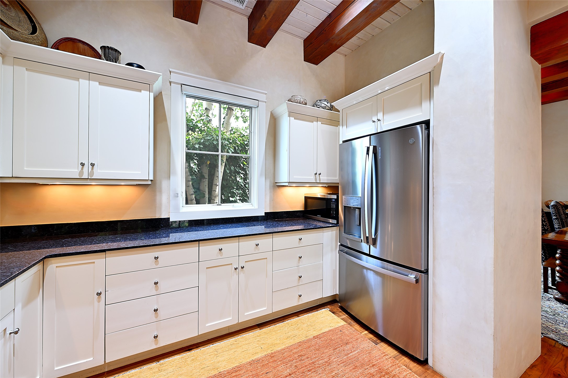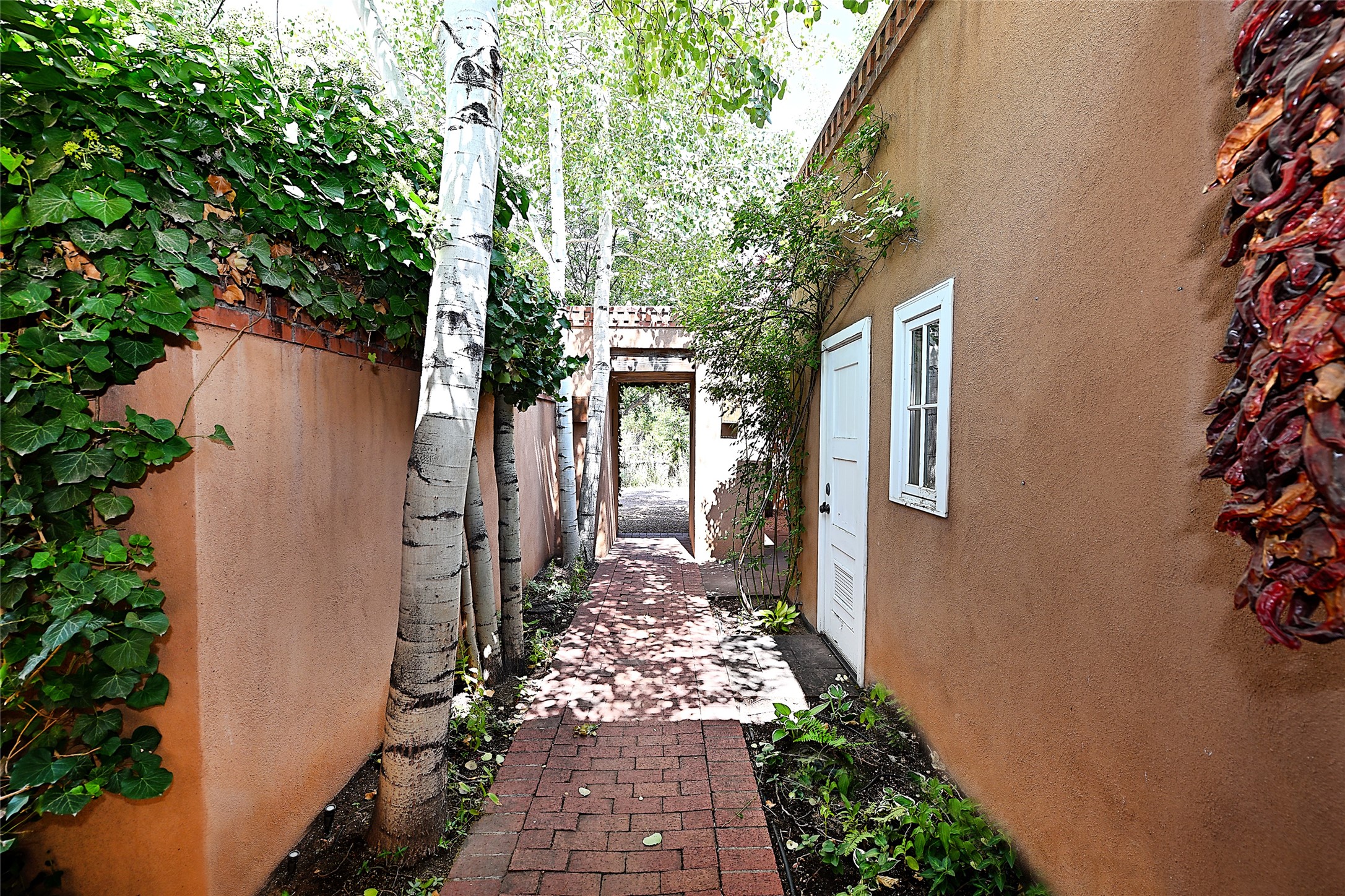 A unique opportunity to own a 3 bedroom 2.5 bath New Mexico Territorial style home in the Historic Eastside. Built in 2006 on a private lane. Single level, no interior steps. Inviting layout with wood flooring throughout. Open concept living and dining with warm, wooden beams and fireplace with brick surround. Sleek, modern kitchen is appointed with recessed lighting, double sink, a 6-burner gas range and plentiful cabinetry. Split bedroom plan for privacy. Primary suite has access to an outdoor courtyard, dual walk-in closets and an ensuite bath. Several private patio areas expand options for entertaining and dining. Central cooling system and radiant heating. There are 2 off-street designated parking spaces - an important feature in this limited Eastside location. Close to Downtown Subscription, Kaune's Neighborhood Market, and Canyon Road.