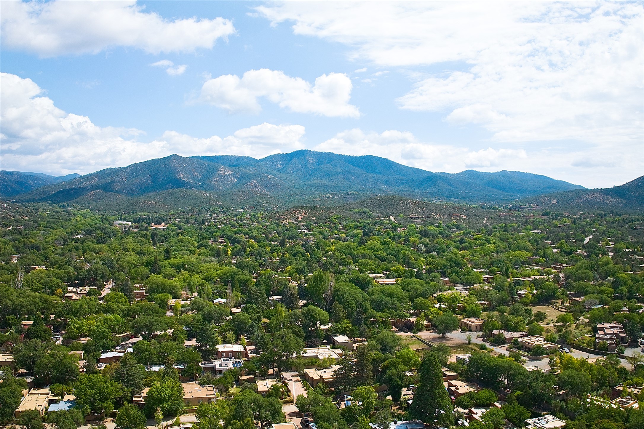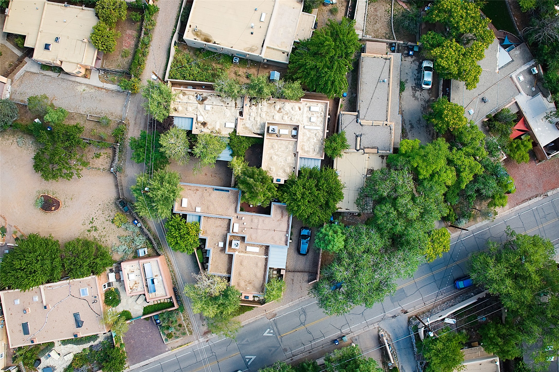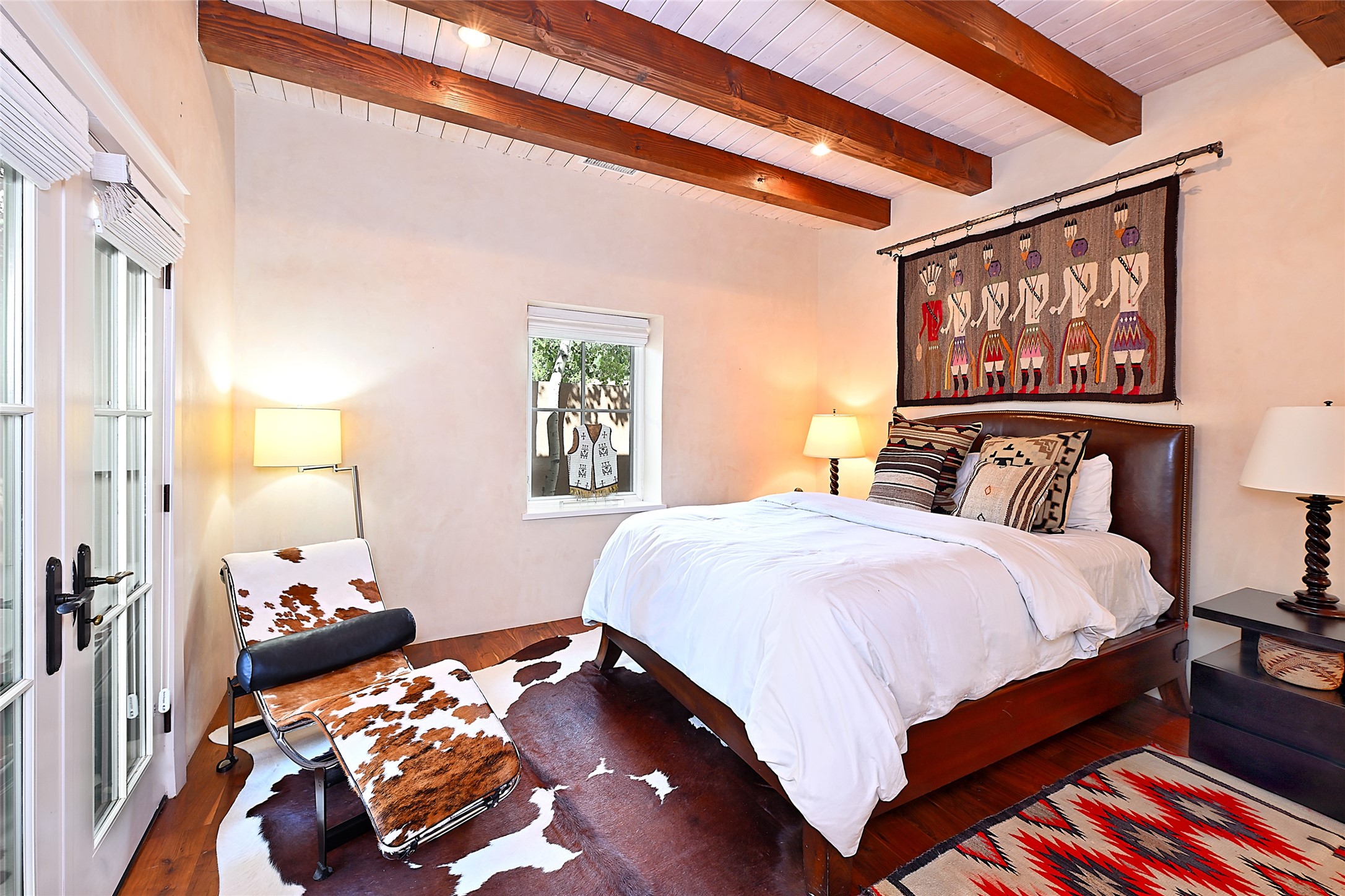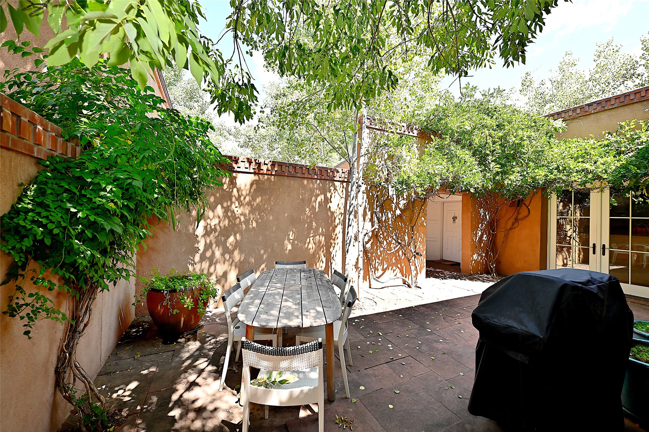 A unique opportunity to own a 3 bedroom 2.5 bath New Mexico Territorial style home in the Historic Eastside. Built in 2006 on a private lane. Single level, no interior steps. Inviting layout with wood flooring throughout. Open concept living and dining with warm, wooden beams and fireplace with brick surround. Sleek, modern kitchen is appointed with recessed lighting, double sink, a 6-burner gas range and plentiful cabinetry. Split bedroom plan for privacy. Primary suite has access to an outdoor courtyard, dual walk-in closets and an ensuite bath. Several private patio areas expand options for entertaining and dining. Central cooling system and radiant heating. There are 2 off-street designated parking spaces - an important feature in this limited Eastside location. Close to Downtown Subscription, Kaune's Neighborhood Market, and Canyon Road.