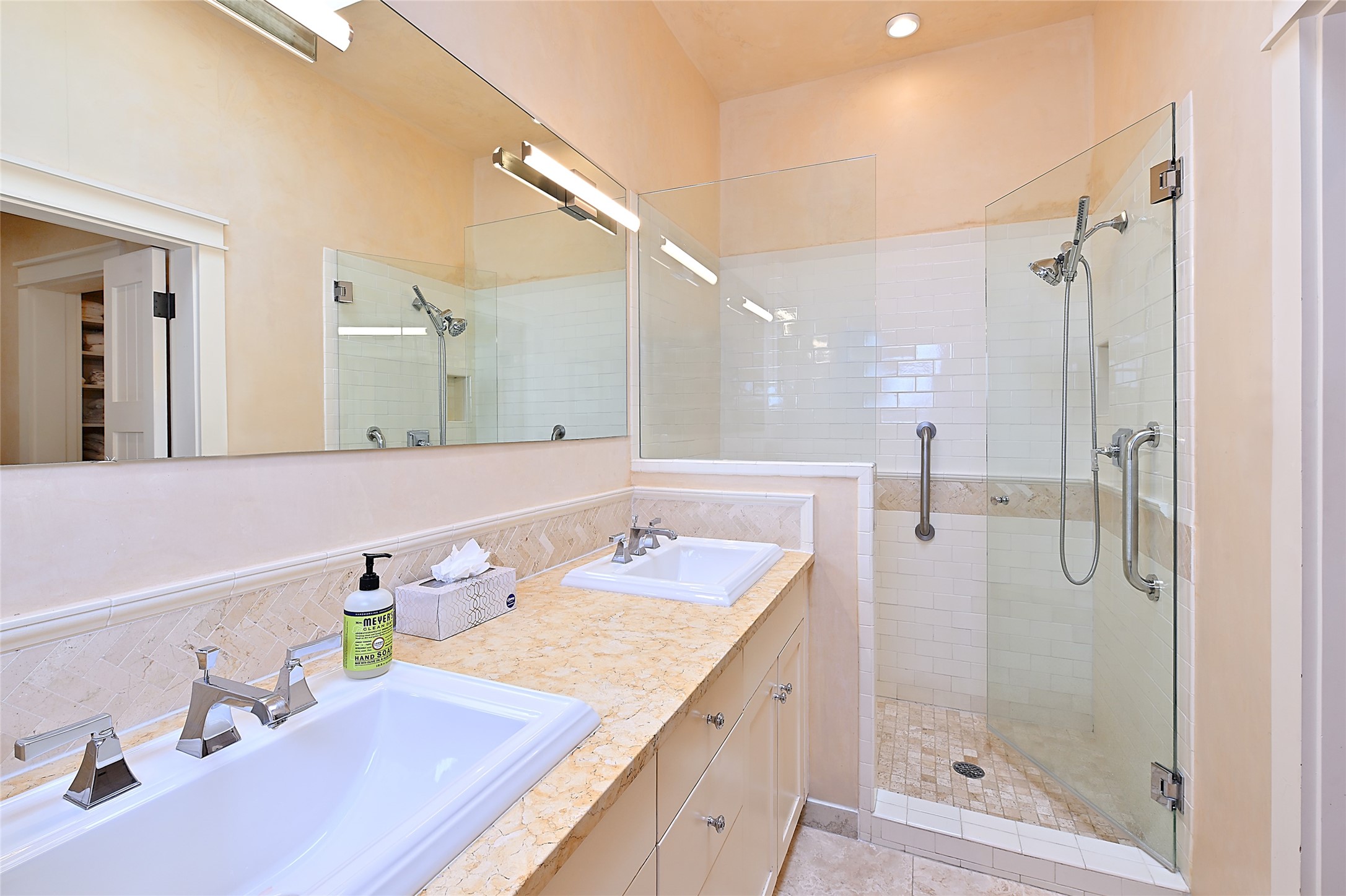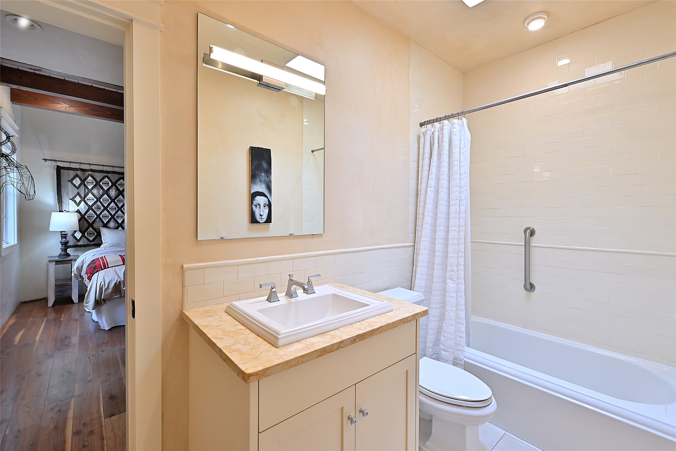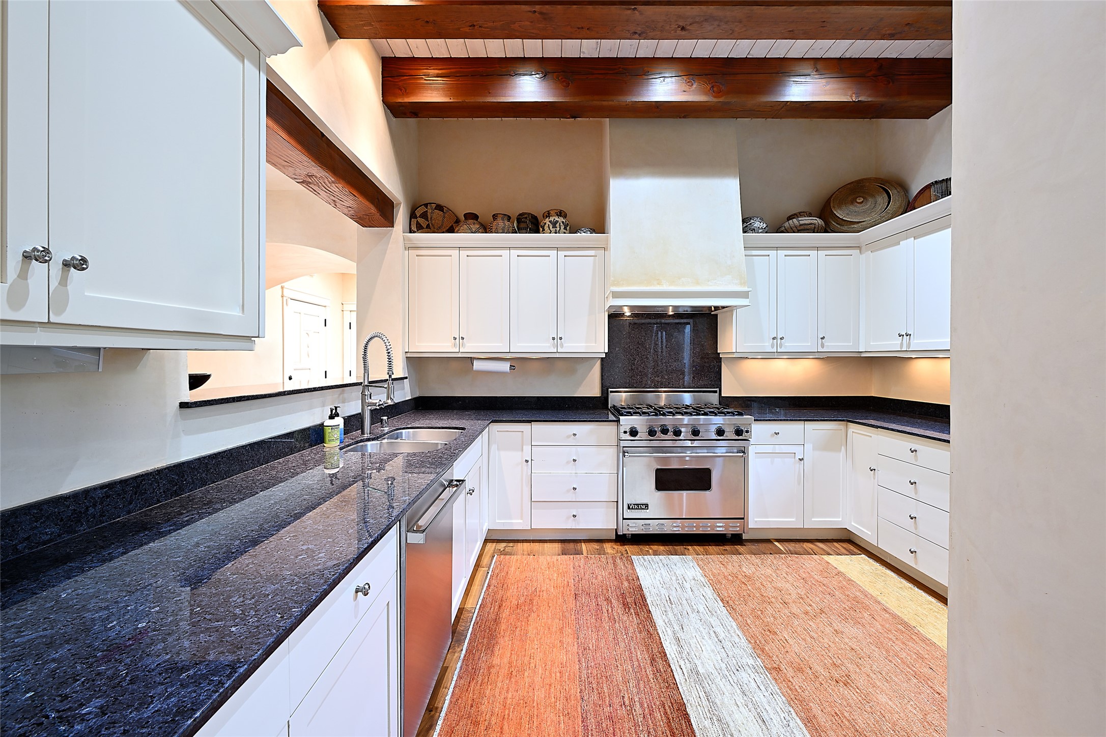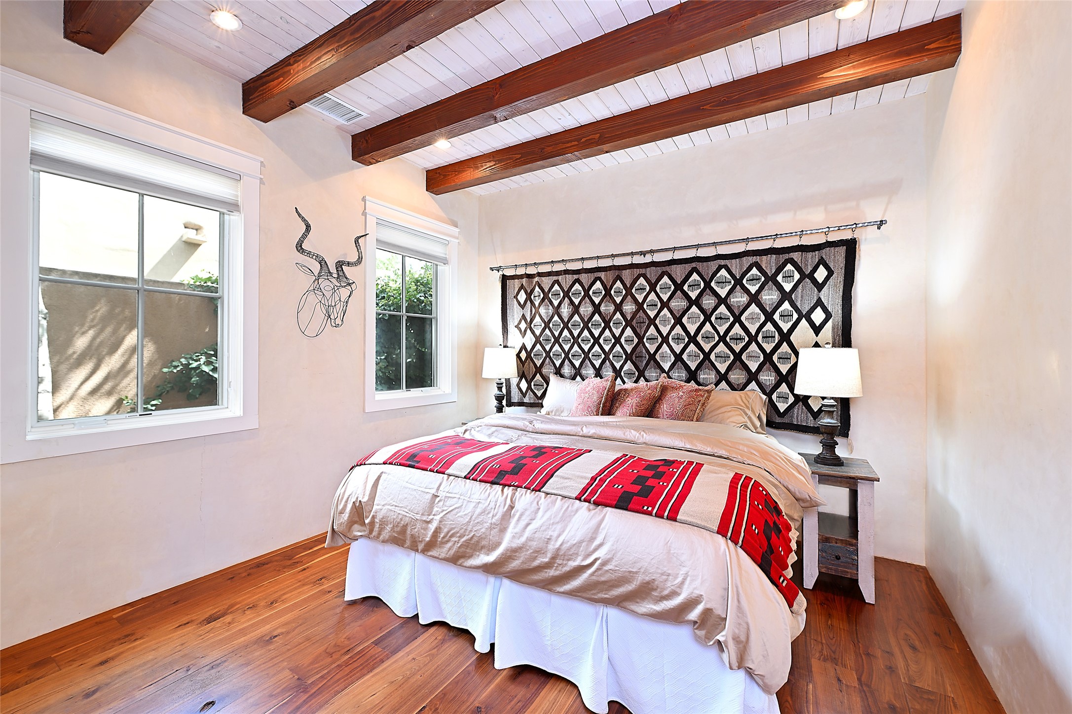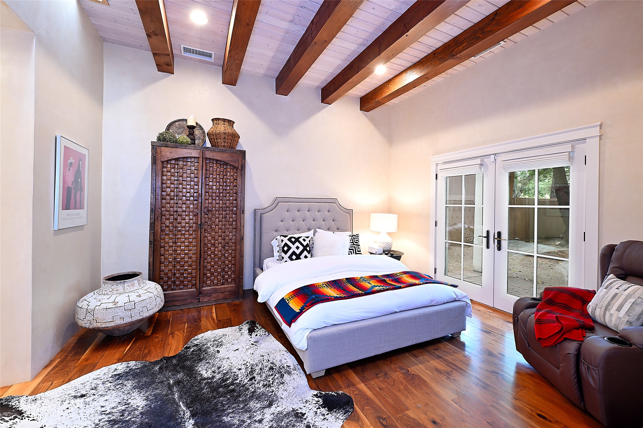 A unique opportunity to own a 3 bedroom 2.5 bath New Mexico Territorial style home in the Historic Eastside. Built in 2006 on a private lane. Single level, no interior steps. Inviting layout with wood flooring throughout. Open concept living and dining with warm, wooden beams and fireplace with brick surround. Sleek, modern kitchen is appointed with recessed lighting, double sink, a 6-burner gas range and plentiful cabinetry. Split bedroom plan for privacy. Primary suite has access to an outdoor courtyard, dual walk-in closets and an ensuite bath. Several private patio areas expand options for entertaining and dining. Central cooling system and radiant heating. There are 2 off-street designated parking spaces - an important feature in this limited Eastside location. Close to Downtown Subscription, Kaune's Neighborhood Market, and Canyon Road.