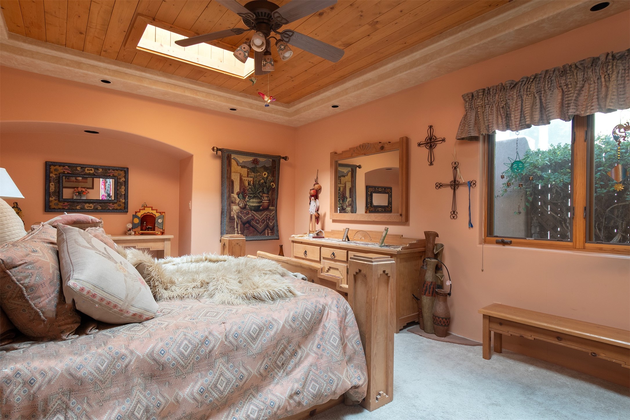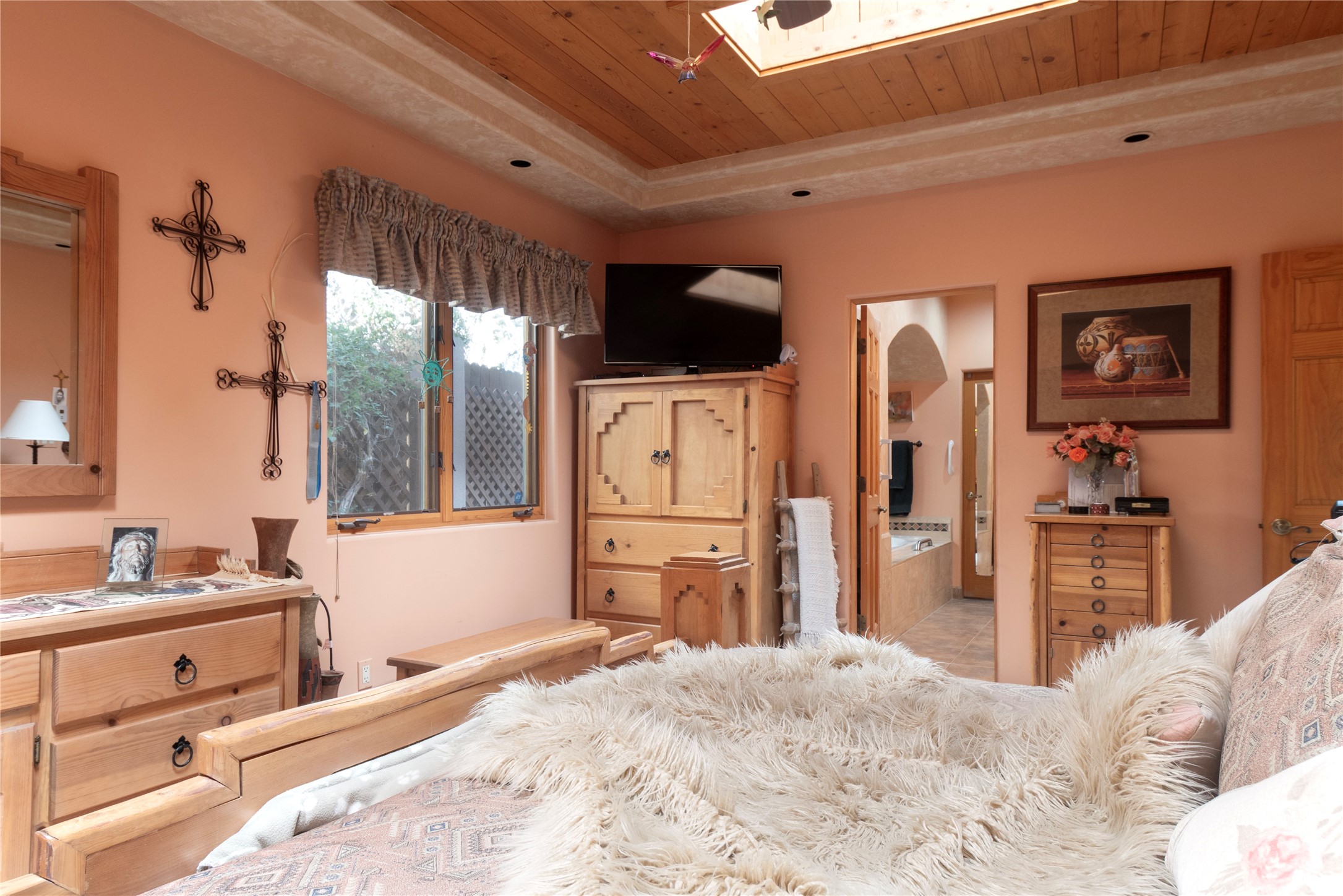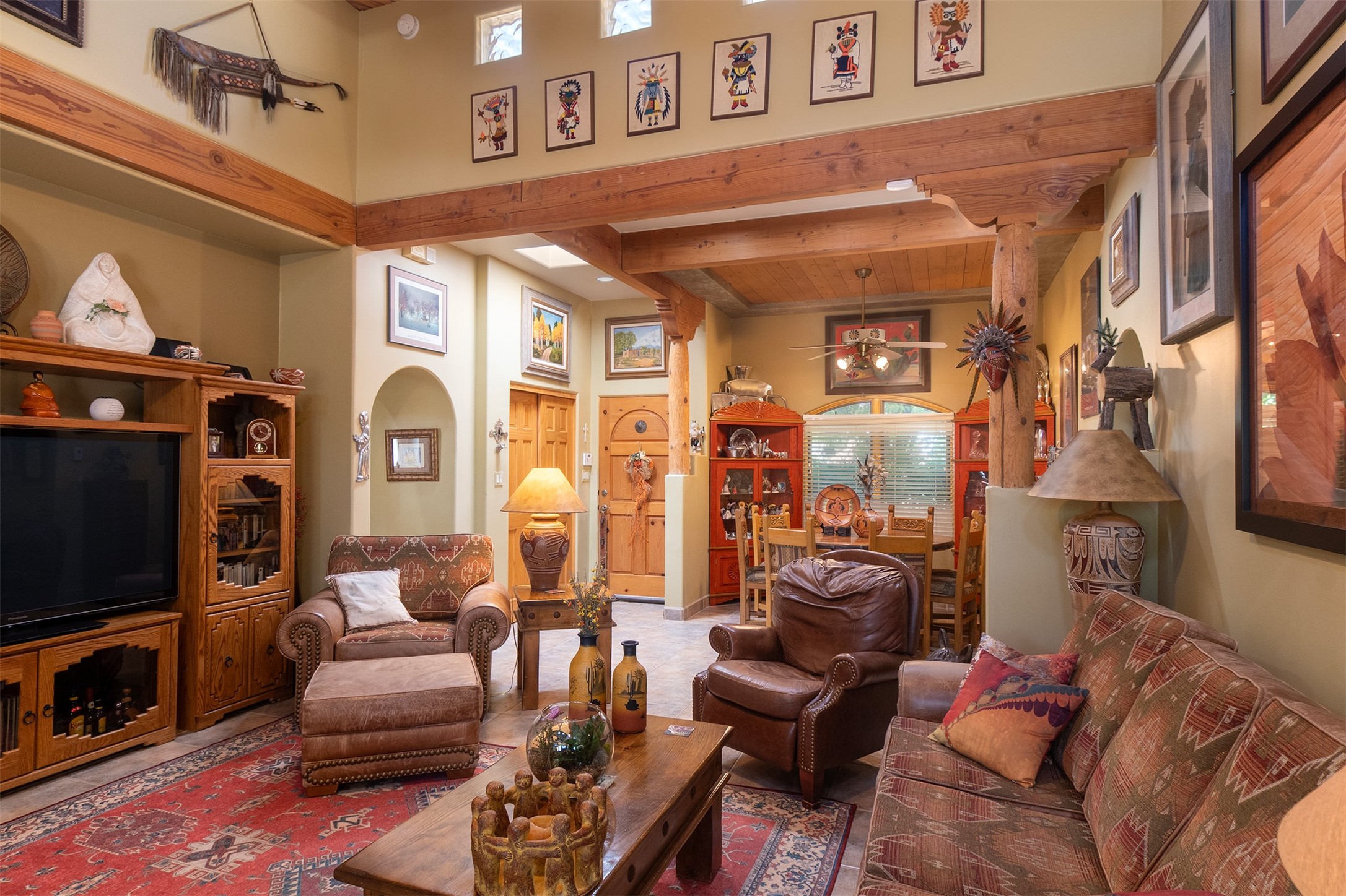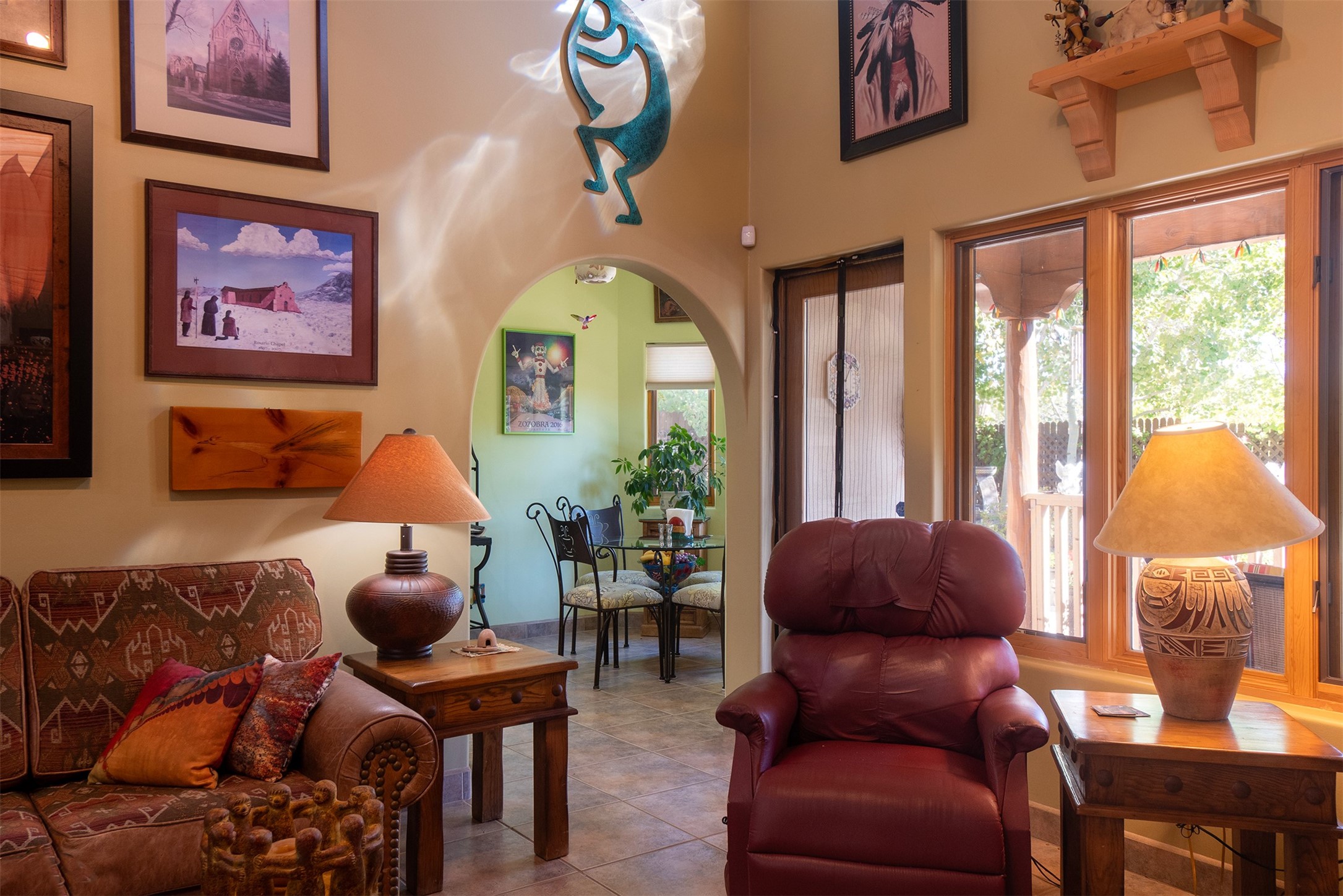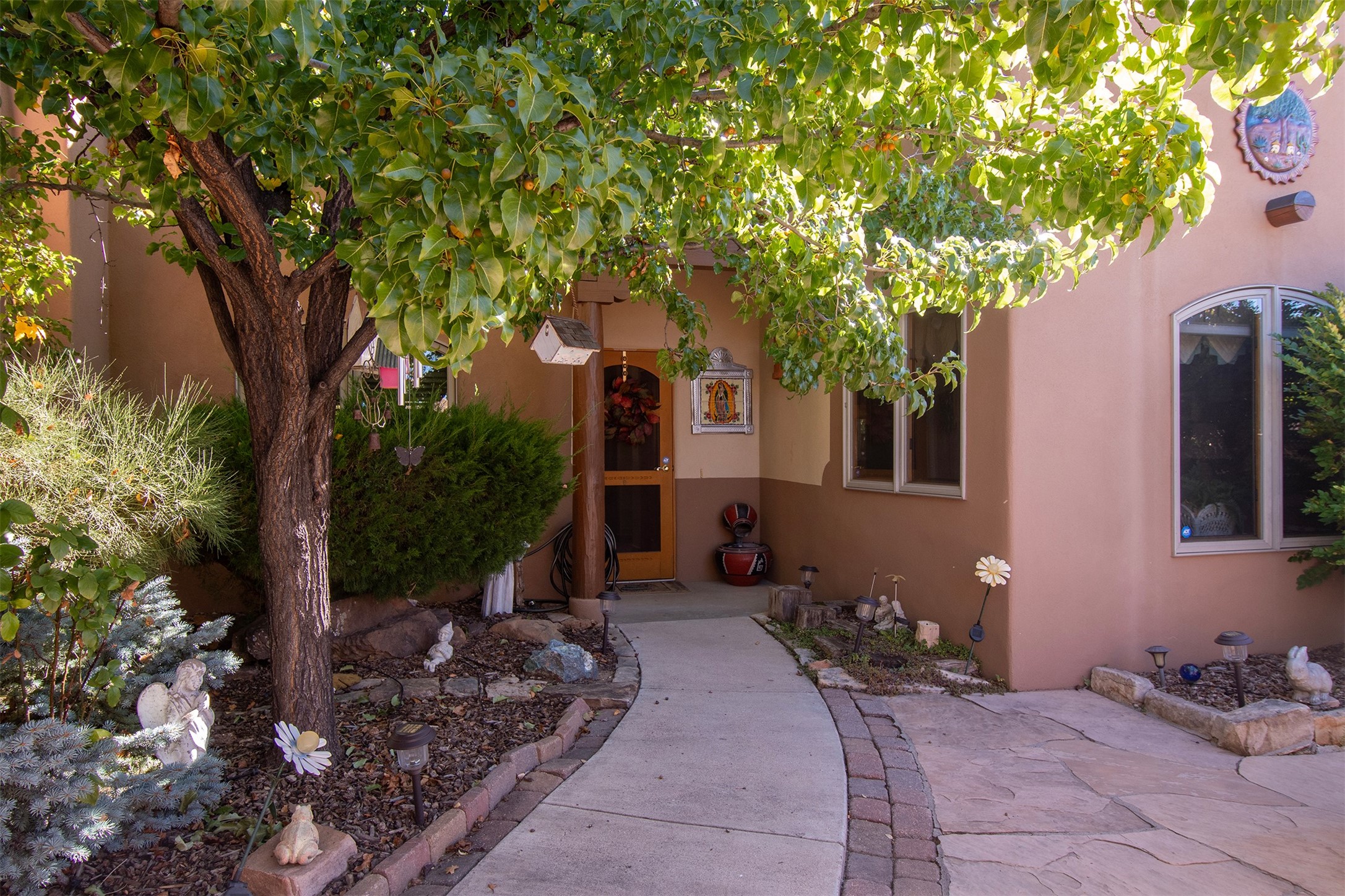 This sweet SINGLE LEVEL home located in the desirable Pueblos Del Sol neighborhood boasts rich Santa Fe-style architecture with multiple upgrades: 16- ceiling w/vigas and a magnificent kiva fireplace in the main living area, coffered & wood-planked ceilings in the primary bedroom and dining room, nichos, lentils, archways, abundant skylights. This impeccably maintained home features mountain views, a newer roof with a 20 yr warranty (conditions apply), radiant-in-floor heating, evaporative cooling, oversized 2-car garage, newer combination boiler and tankless water heater, newer clad windows, gorgeous established landscaping-- perennials, aspens, pine and shade trees- all on drip irrigation. Fully fenced/walled for privacy and pets. Its luxurious primary bedroom is completed by a superb bathroom with shower, jetted tub, dual vanities and expansive walk-in closet. The two guest bedrooms are spacious, both offering maximum privacy and space. The tranquil rear portal provides an extension of your living space for al fresco dining, morning coffee and relaxation among the multiple shaded areas. Not one single step.