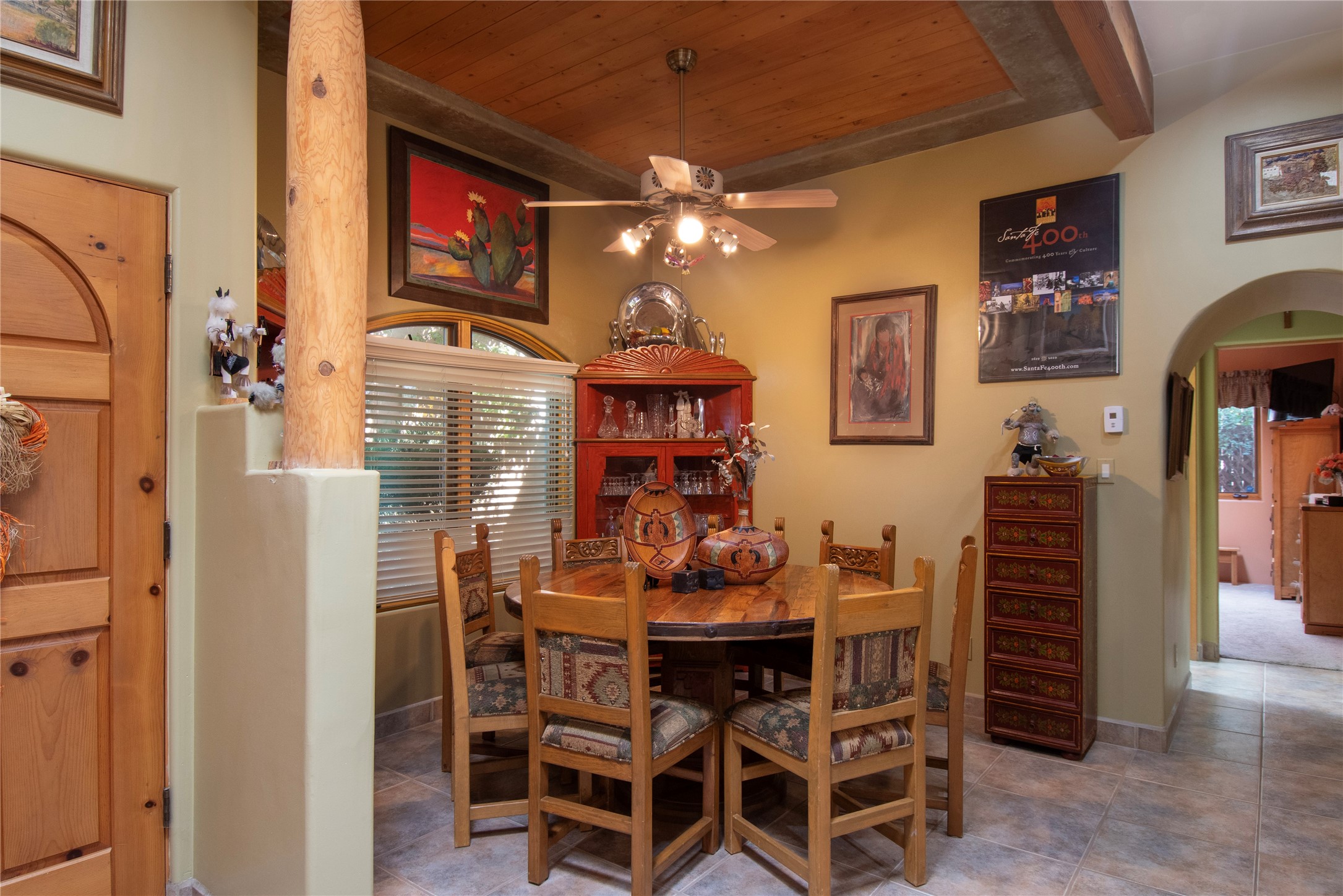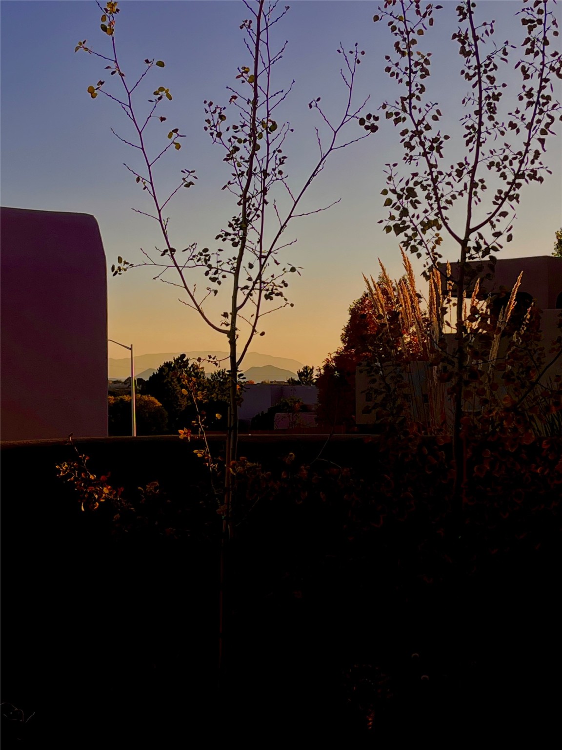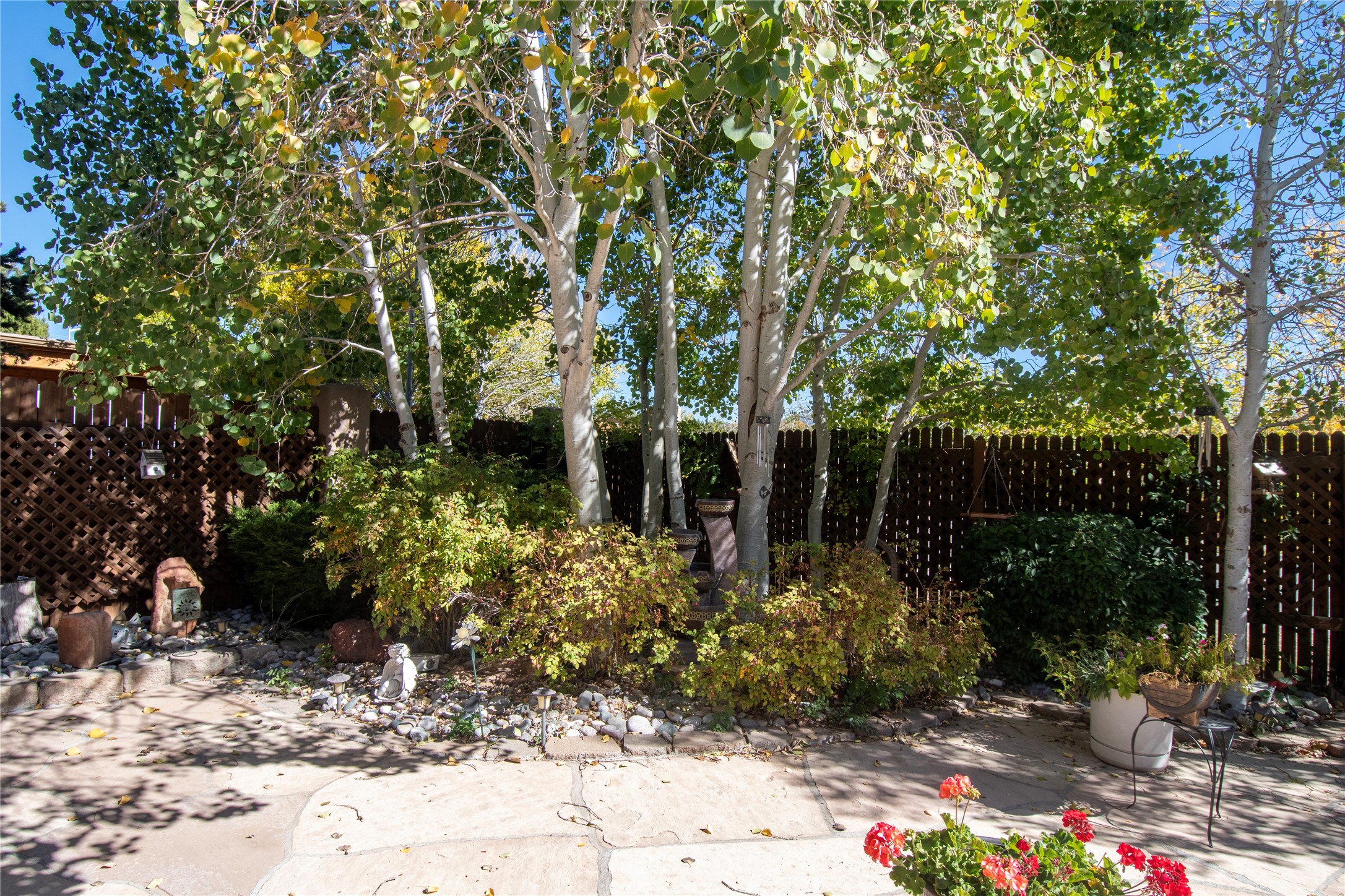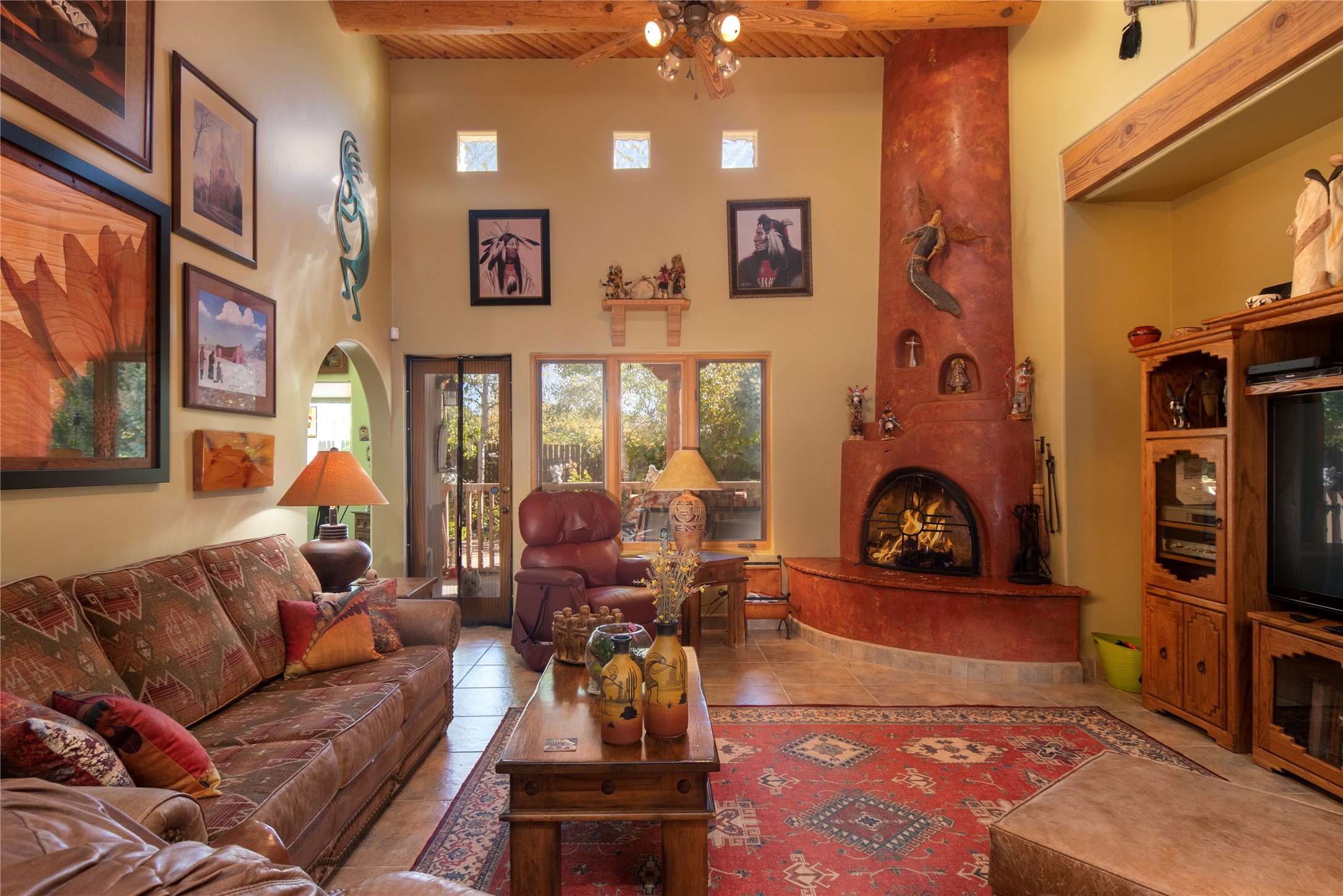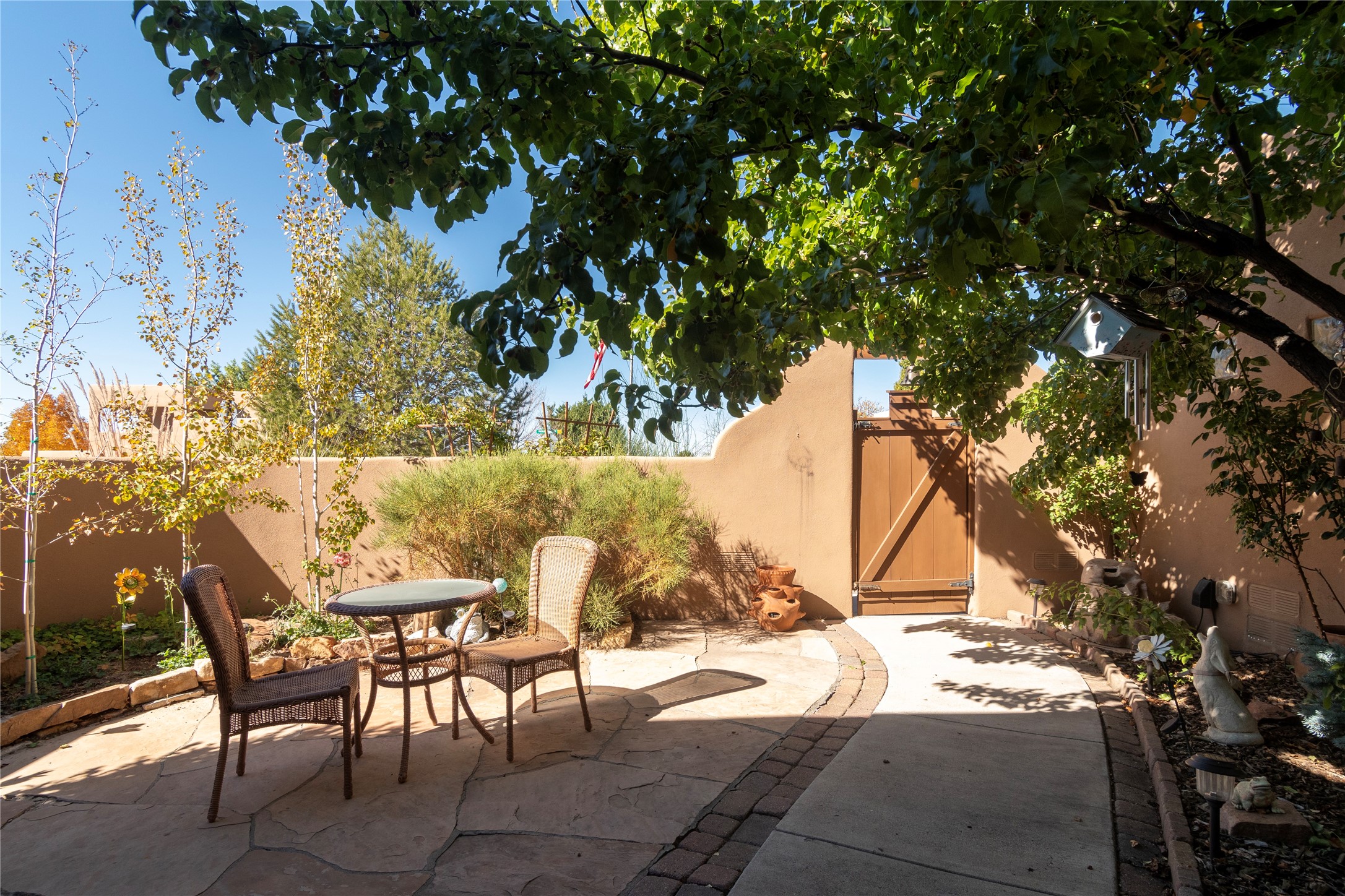 This sweet SINGLE LEVEL home located in the desirable Pueblos Del Sol neighborhood boasts rich Santa Fe-style architecture with multiple upgrades: 16- ceiling w/vigas and a magnificent kiva fireplace in the main living area, coffered & wood-planked ceilings in the primary bedroom and dining room, nichos, lentils, archways, abundant skylights. This impeccably maintained home features mountain views, a newer roof with a 20 yr warranty (conditions apply), radiant-in-floor heating, evaporative cooling, oversized 2-car garage, newer combination boiler and tankless water heater, newer clad windows, gorgeous established landscaping-- perennials, aspens, pine and shade trees- all on drip irrigation. Fully fenced/walled for privacy and pets. Its luxurious primary bedroom is completed by a superb bathroom with shower, jetted tub, dual vanities and expansive walk-in closet. The two guest bedrooms are spacious, both offering maximum privacy and space. The tranquil rear portal provides an extension of your living space for al fresco dining, morning coffee and relaxation among the multiple shaded areas. Not one single step.