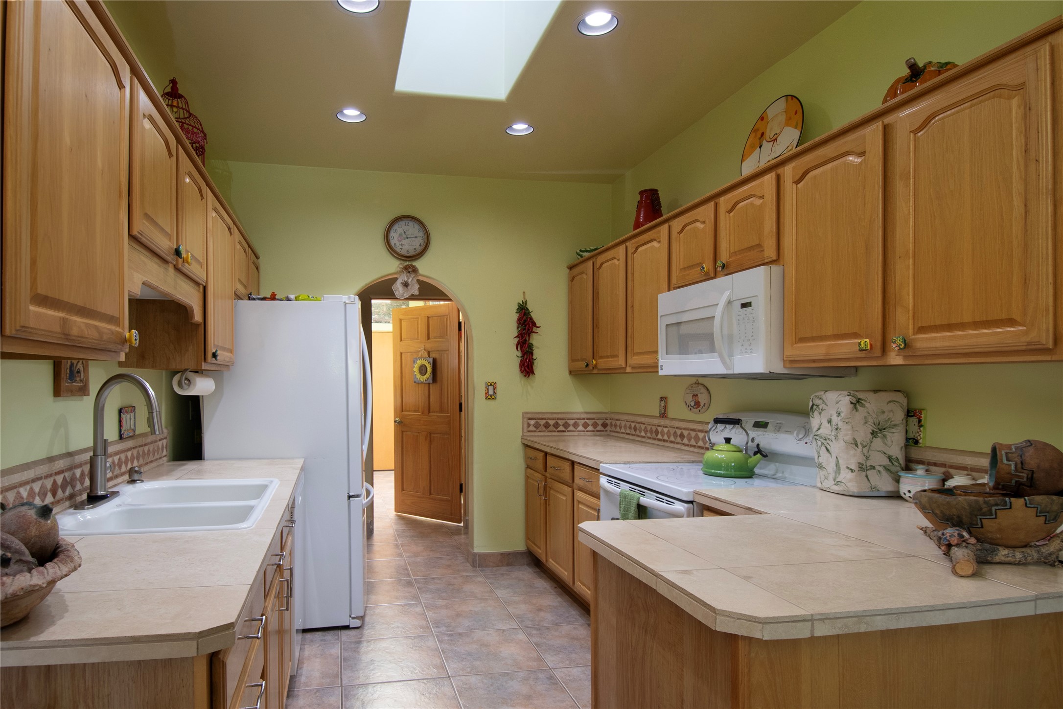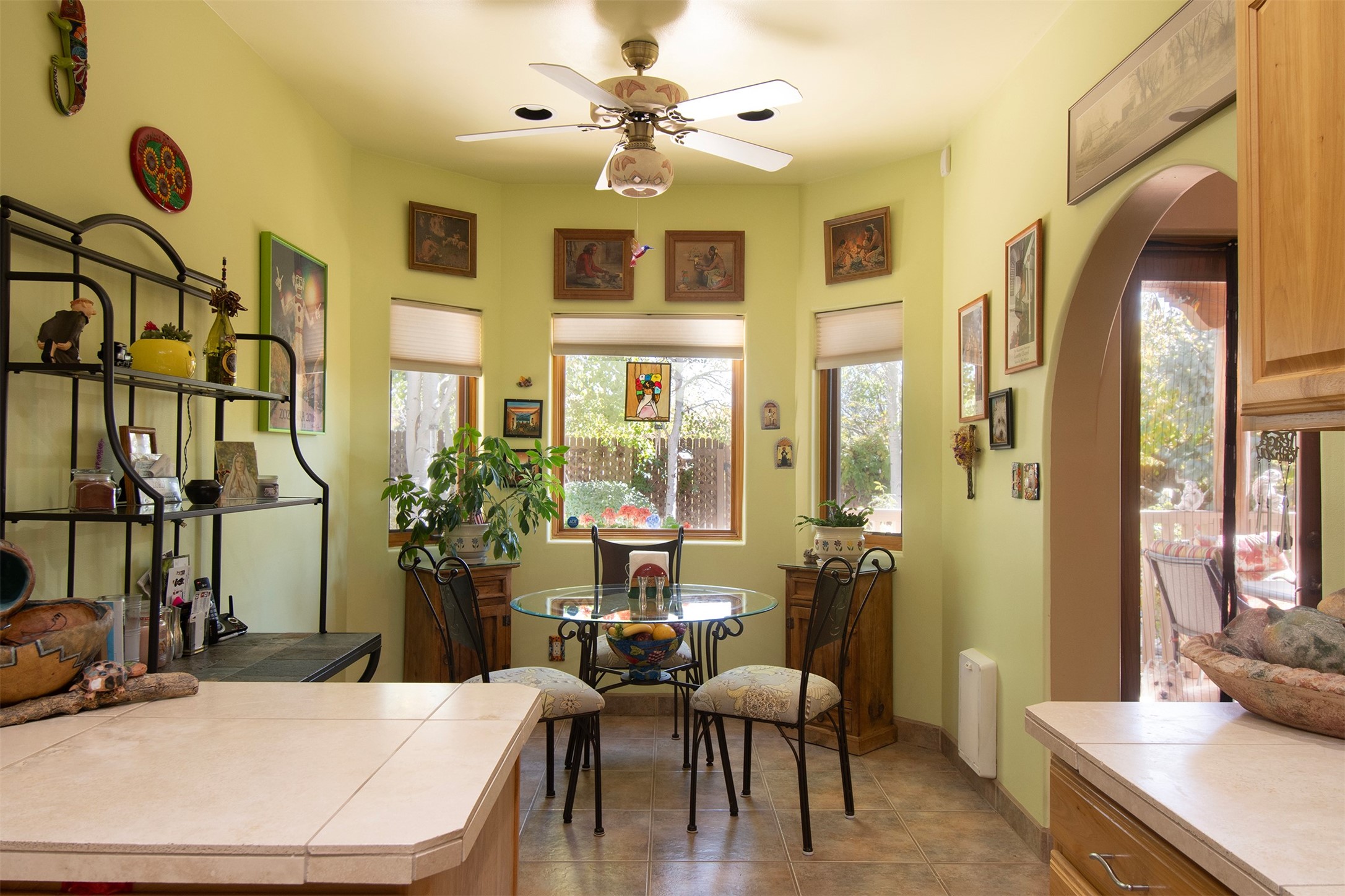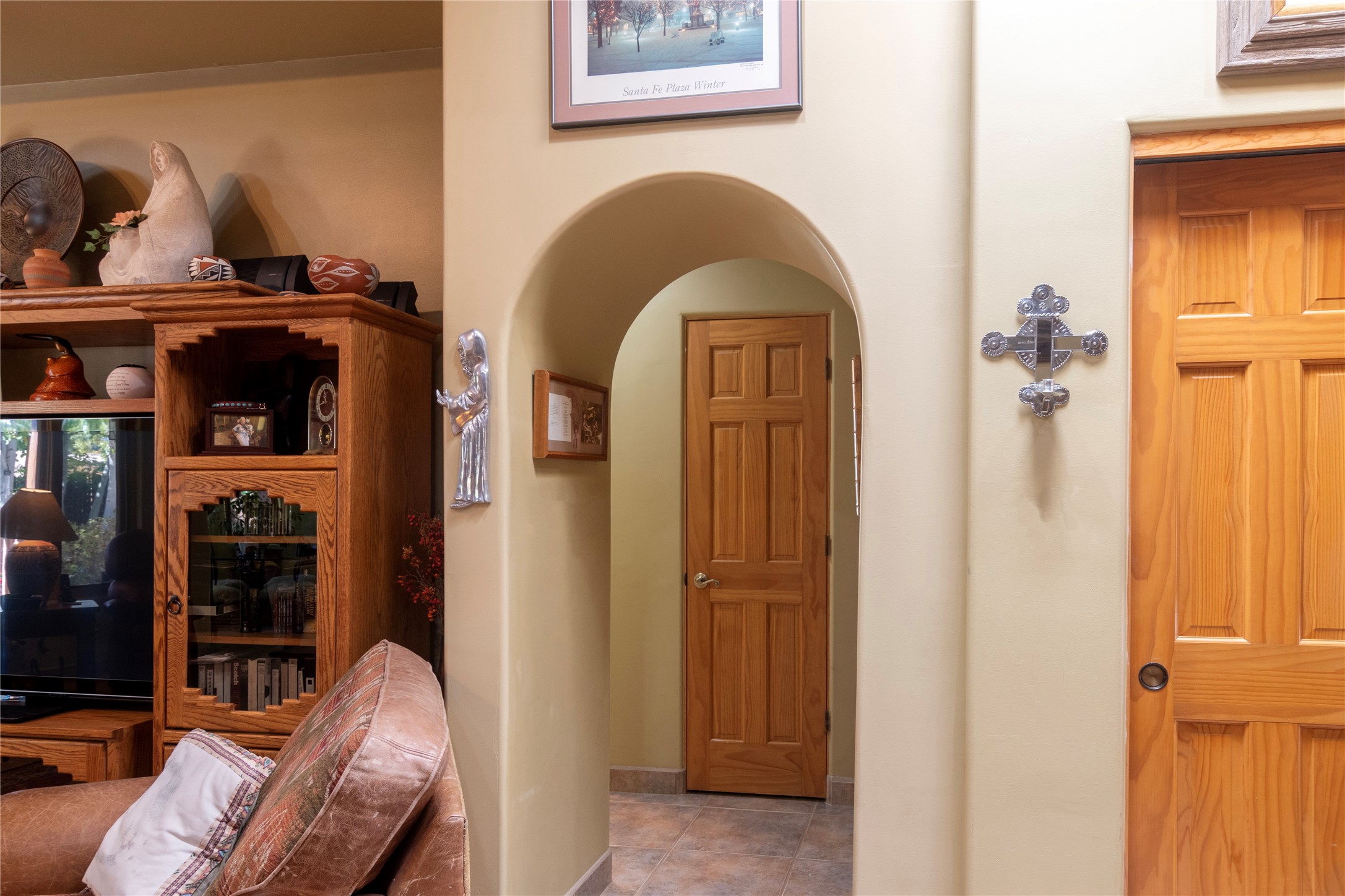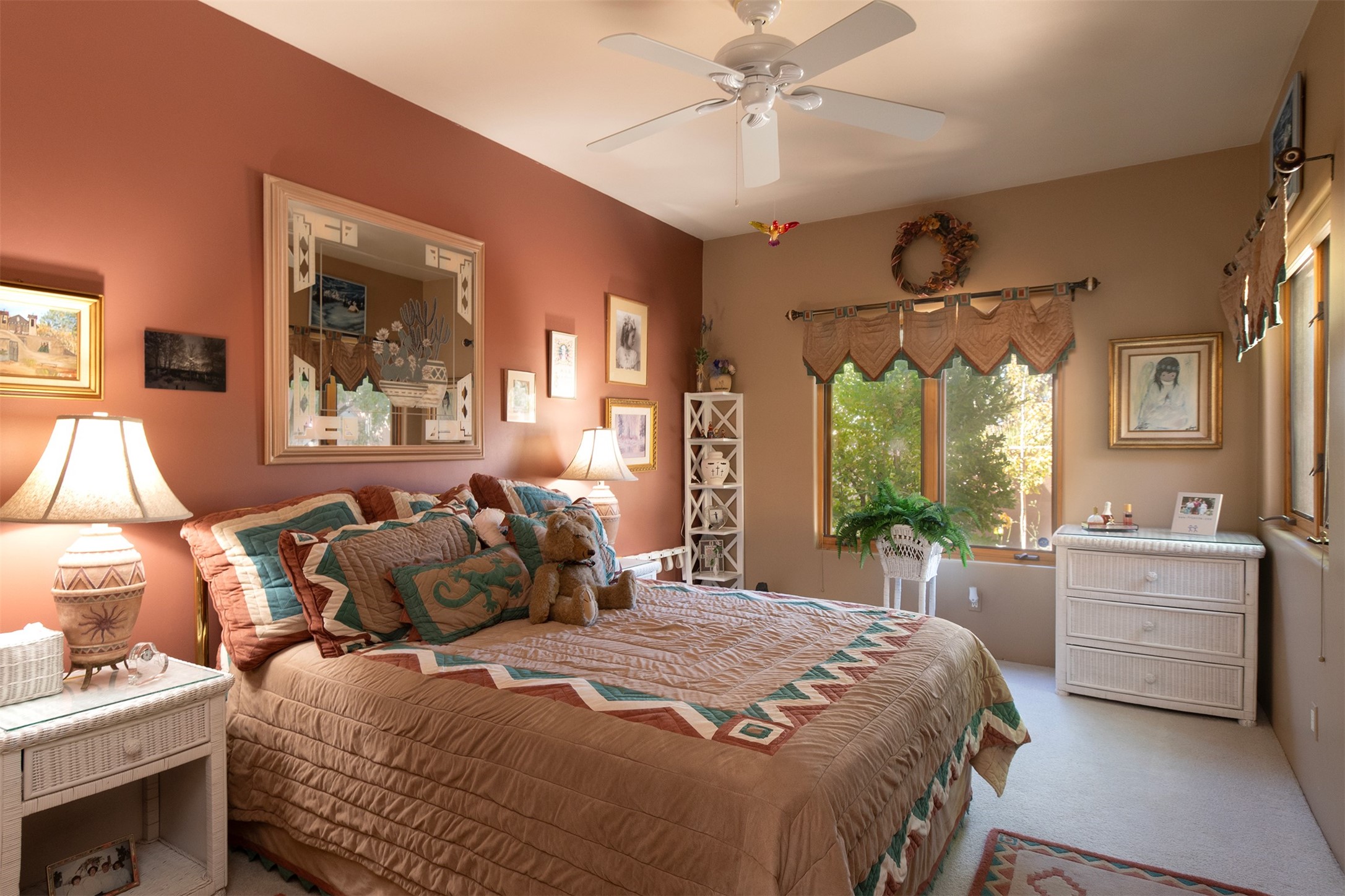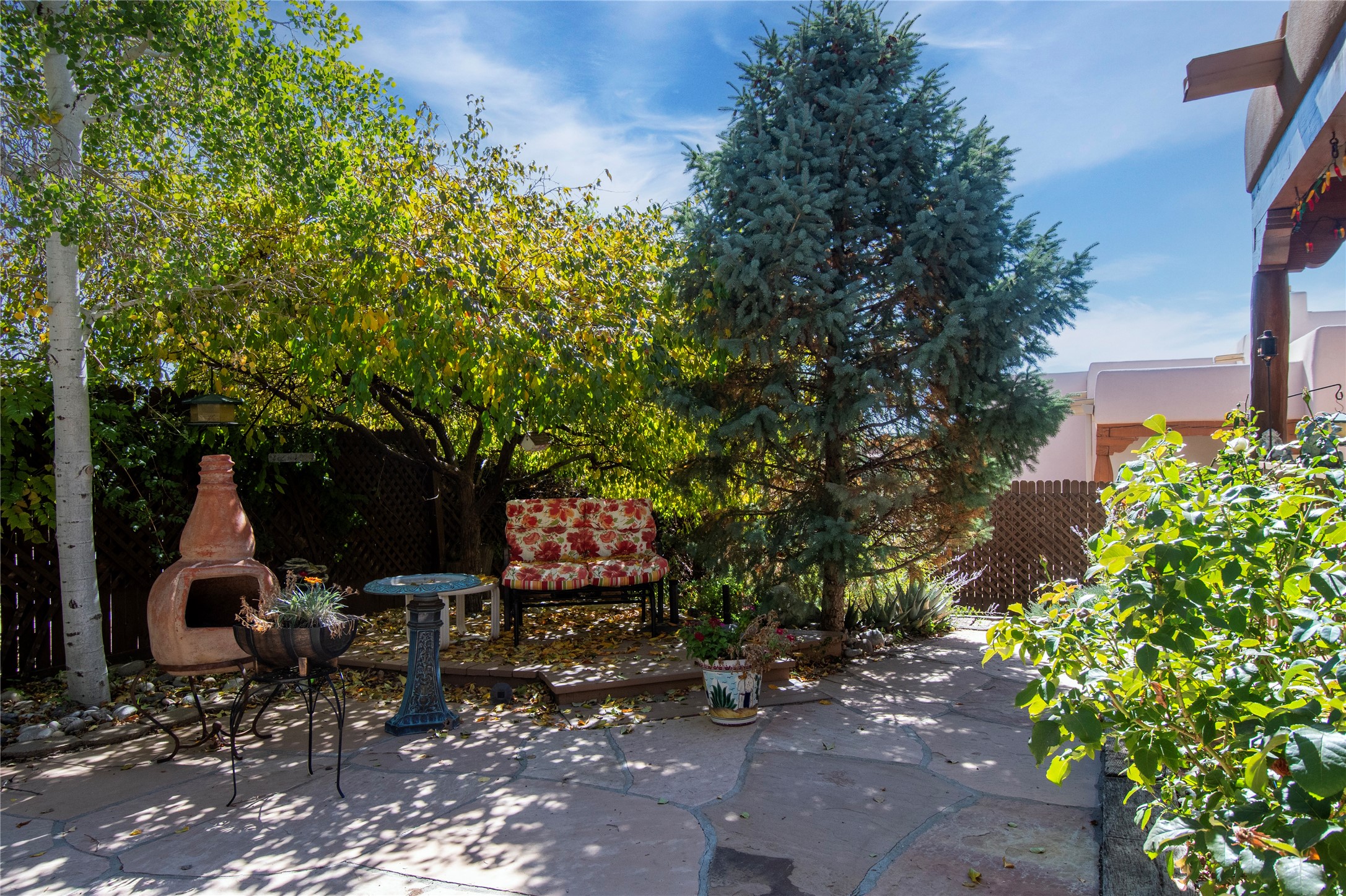 This sweet SINGLE LEVEL home located in the desirable Pueblos Del Sol neighborhood boasts rich Santa Fe-style architecture with multiple upgrades: 16- ceiling w/vigas and a magnificent kiva fireplace in the main living area, coffered & wood-planked ceilings in the primary bedroom and dining room, nichos, lentils, archways, abundant skylights. This impeccably maintained home features mountain views, a newer roof with a 20 yr warranty (conditions apply), radiant-in-floor heating, evaporative cooling, oversized 2-car garage, newer combination boiler and tankless water heater, newer clad windows, gorgeous established landscaping-- perennials, aspens, pine and shade trees- all on drip irrigation. Fully fenced/walled for privacy and pets. Its luxurious primary bedroom is completed by a superb bathroom with shower, jetted tub, dual vanities and expansive walk-in closet. The two guest bedrooms are spacious, both offering maximum privacy and space. The tranquil rear portal provides an extension of your living space for al fresco dining, morning coffee and relaxation among the multiple shaded areas. Not one single step.