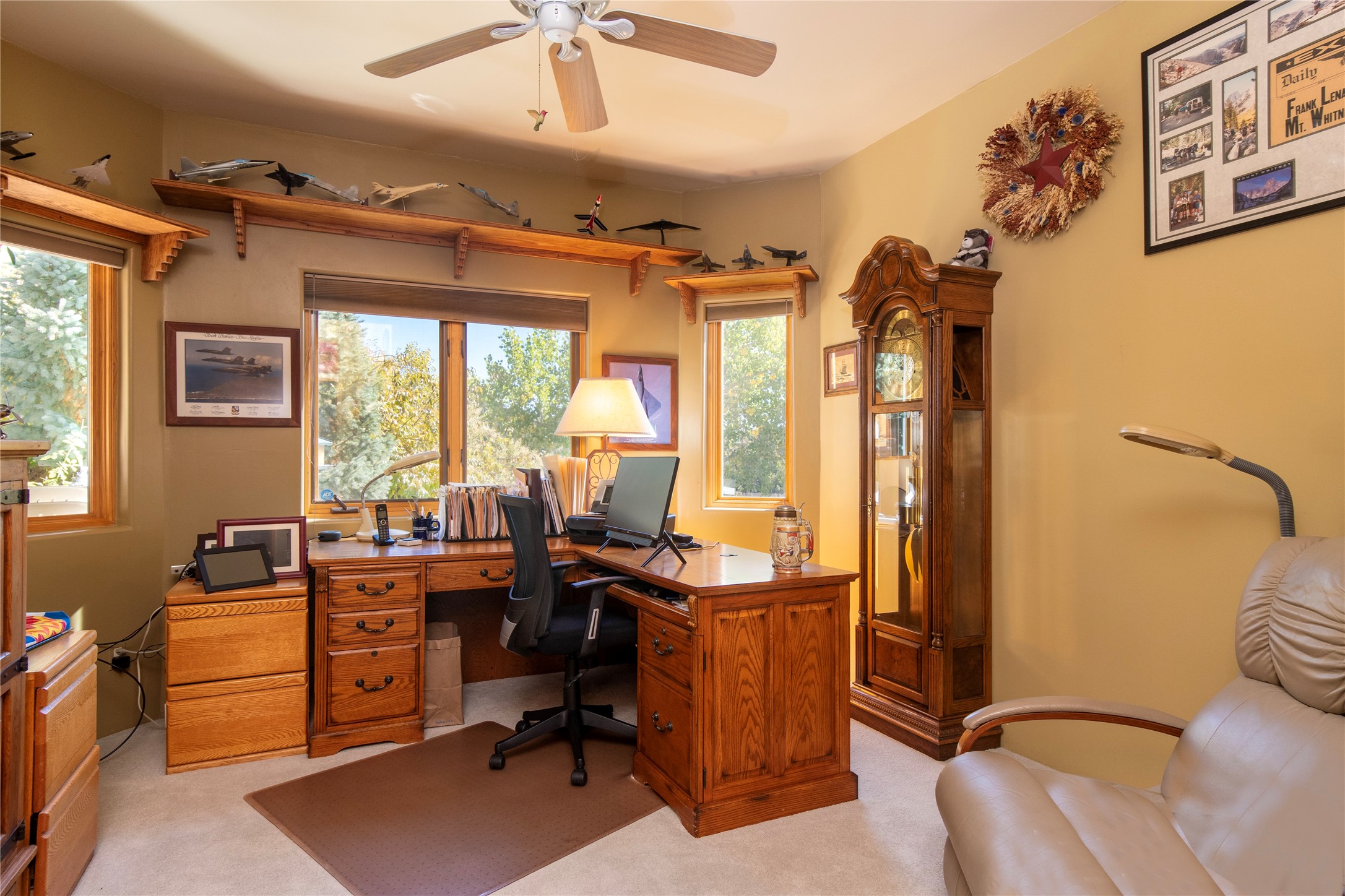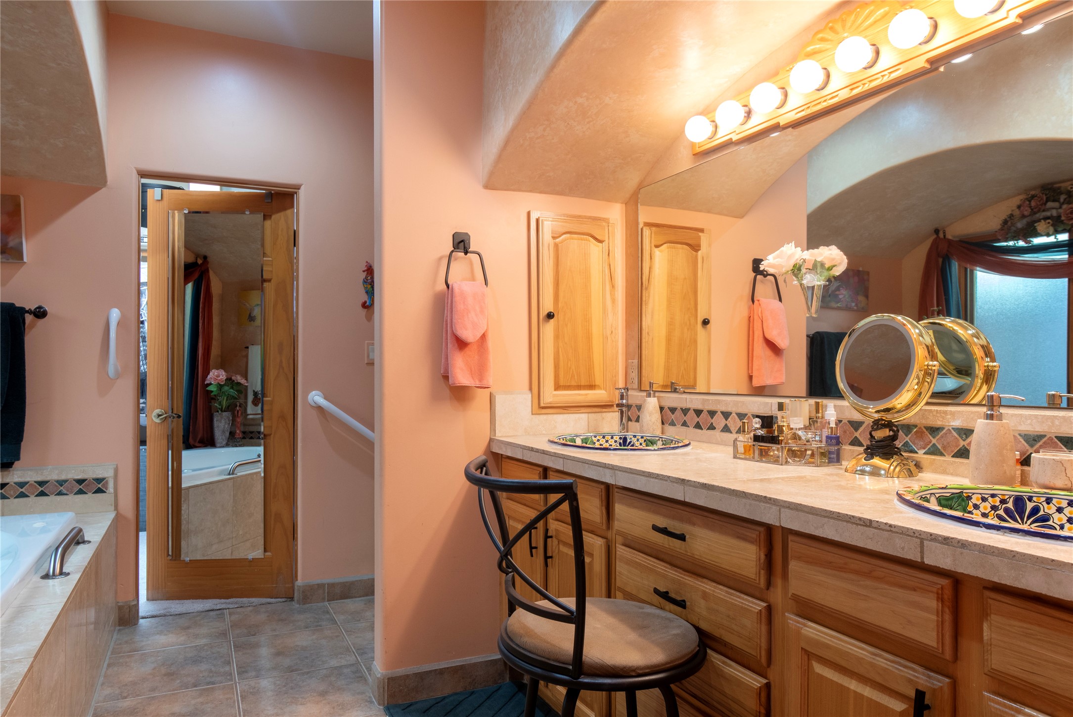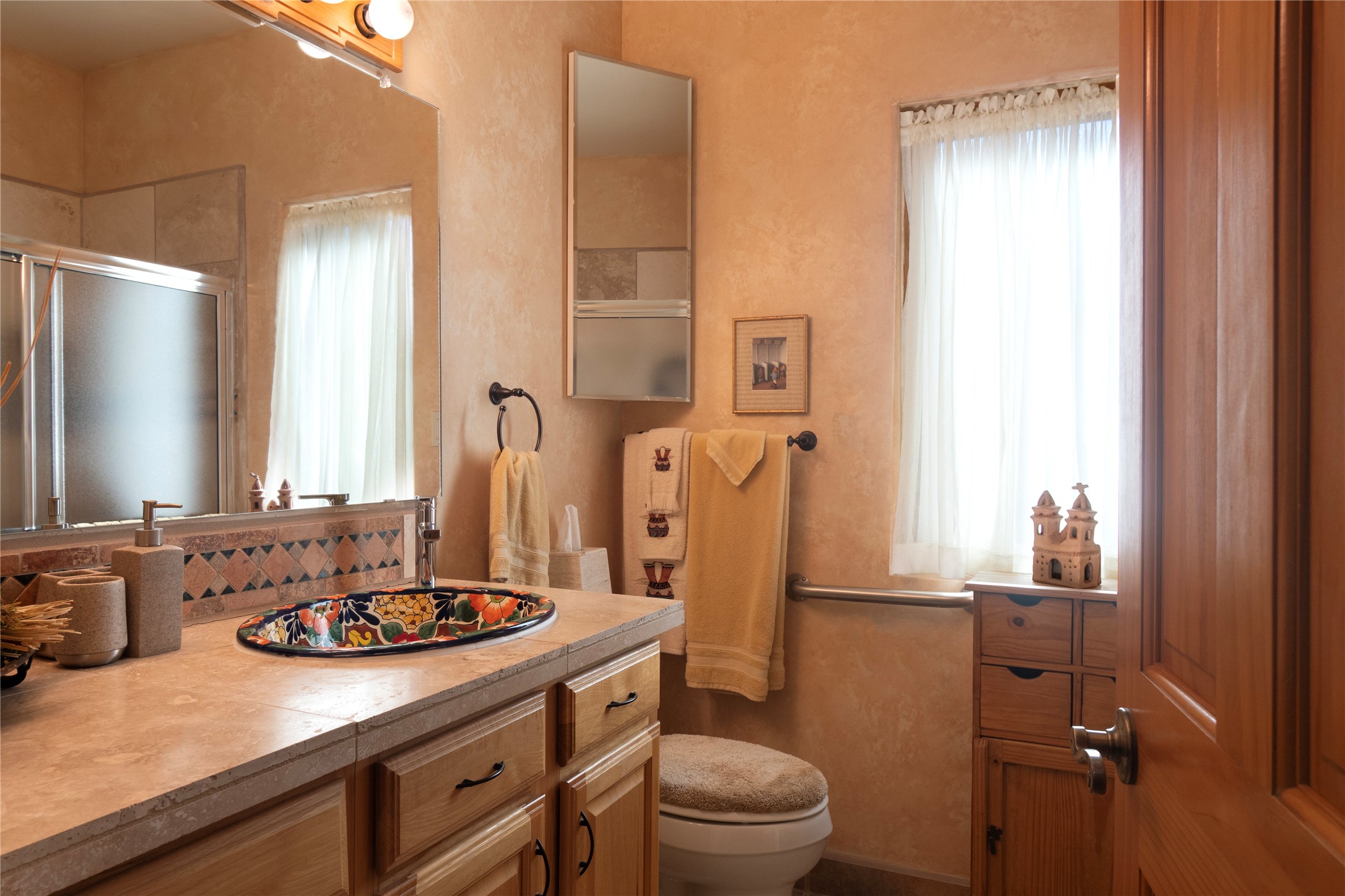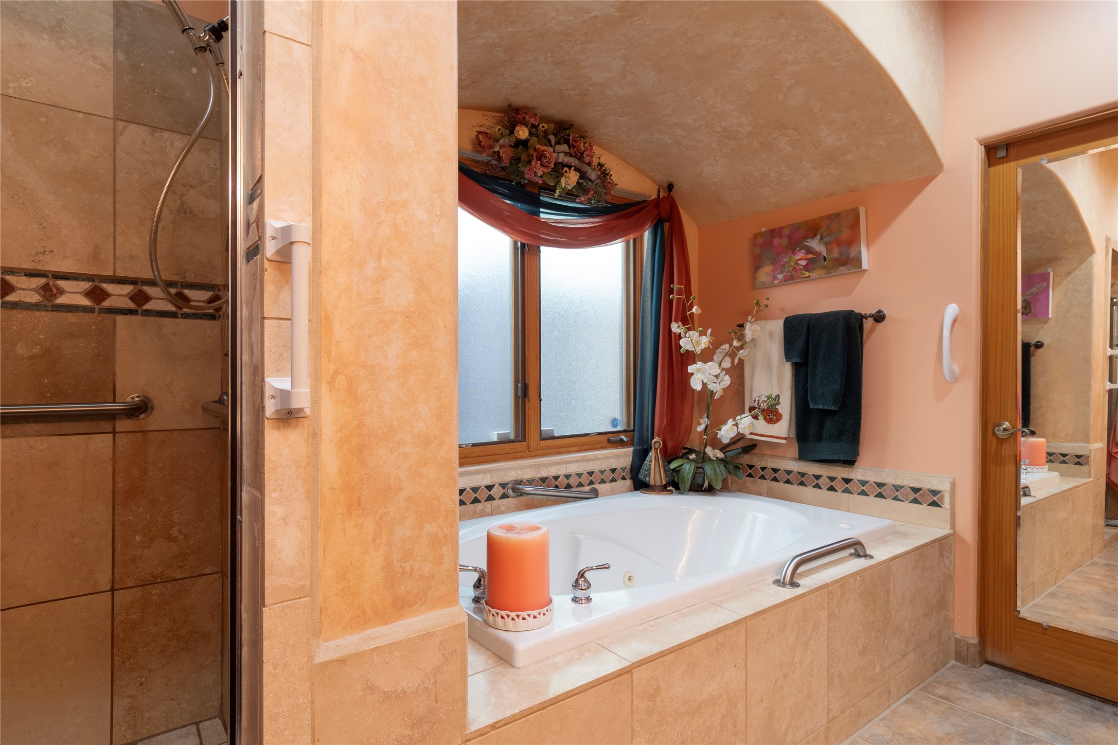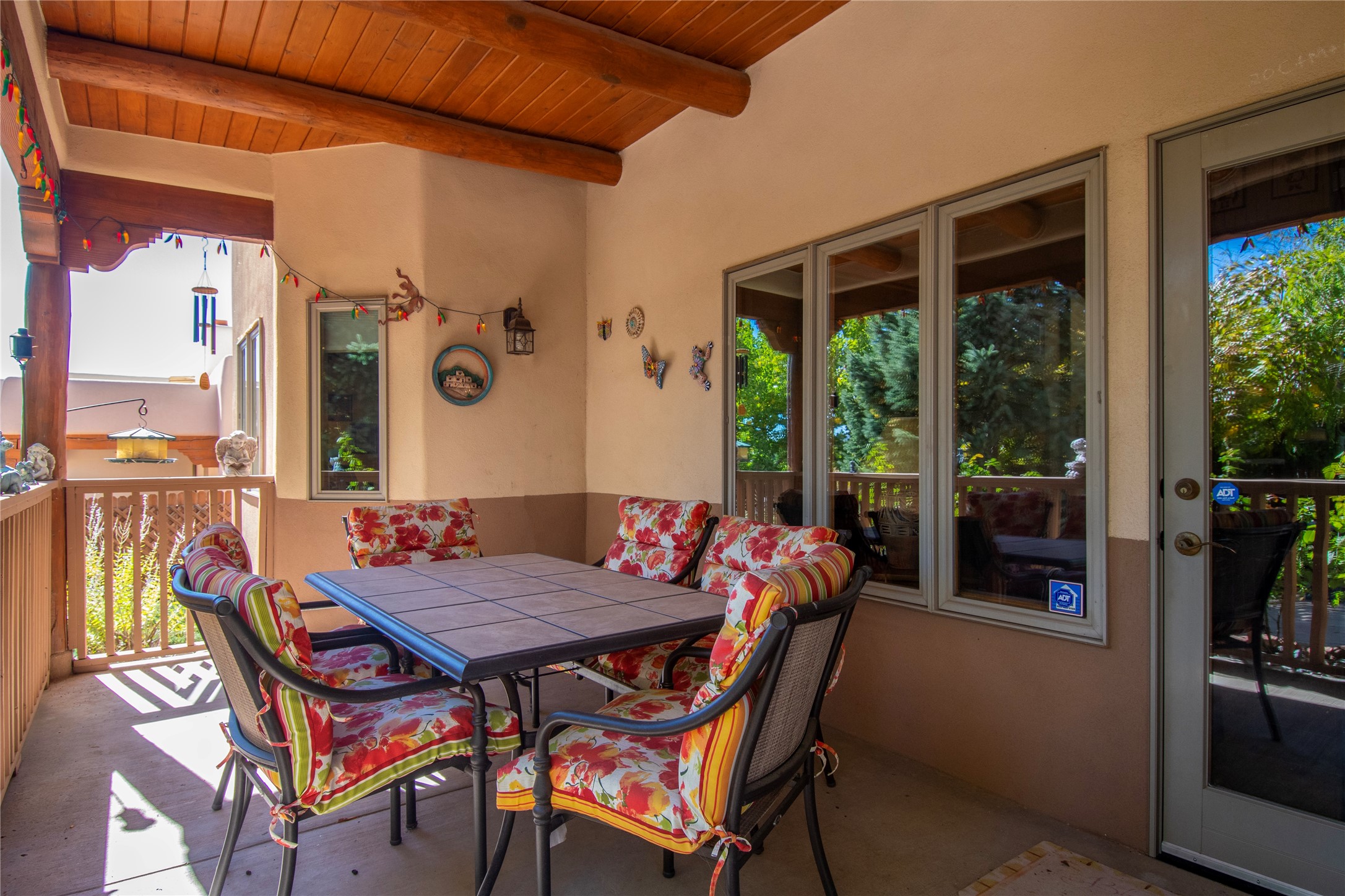 This sweet SINGLE LEVEL home located in the desirable Pueblos Del Sol neighborhood boasts rich Santa Fe-style architecture with multiple upgrades: 16- ceiling w/vigas and a magnificent kiva fireplace in the main living area, coffered & wood-planked ceilings in the primary bedroom and dining room, nichos, lentils, archways, abundant skylights. This impeccably maintained home features mountain views, a newer roof with a 20 yr warranty (conditions apply), radiant-in-floor heating, evaporative cooling, oversized 2-car garage, newer combination boiler and tankless water heater, newer clad windows, gorgeous established landscaping-- perennials, aspens, pine and shade trees- all on drip irrigation. Fully fenced/walled for privacy and pets. Its luxurious primary bedroom is completed by a superb bathroom with shower, jetted tub, dual vanities and expansive walk-in closet. The two guest bedrooms are spacious, both offering maximum privacy and space. The tranquil rear portal provides an extension of your living space for al fresco dining, morning coffee and relaxation among the multiple shaded areas. Not one single step.