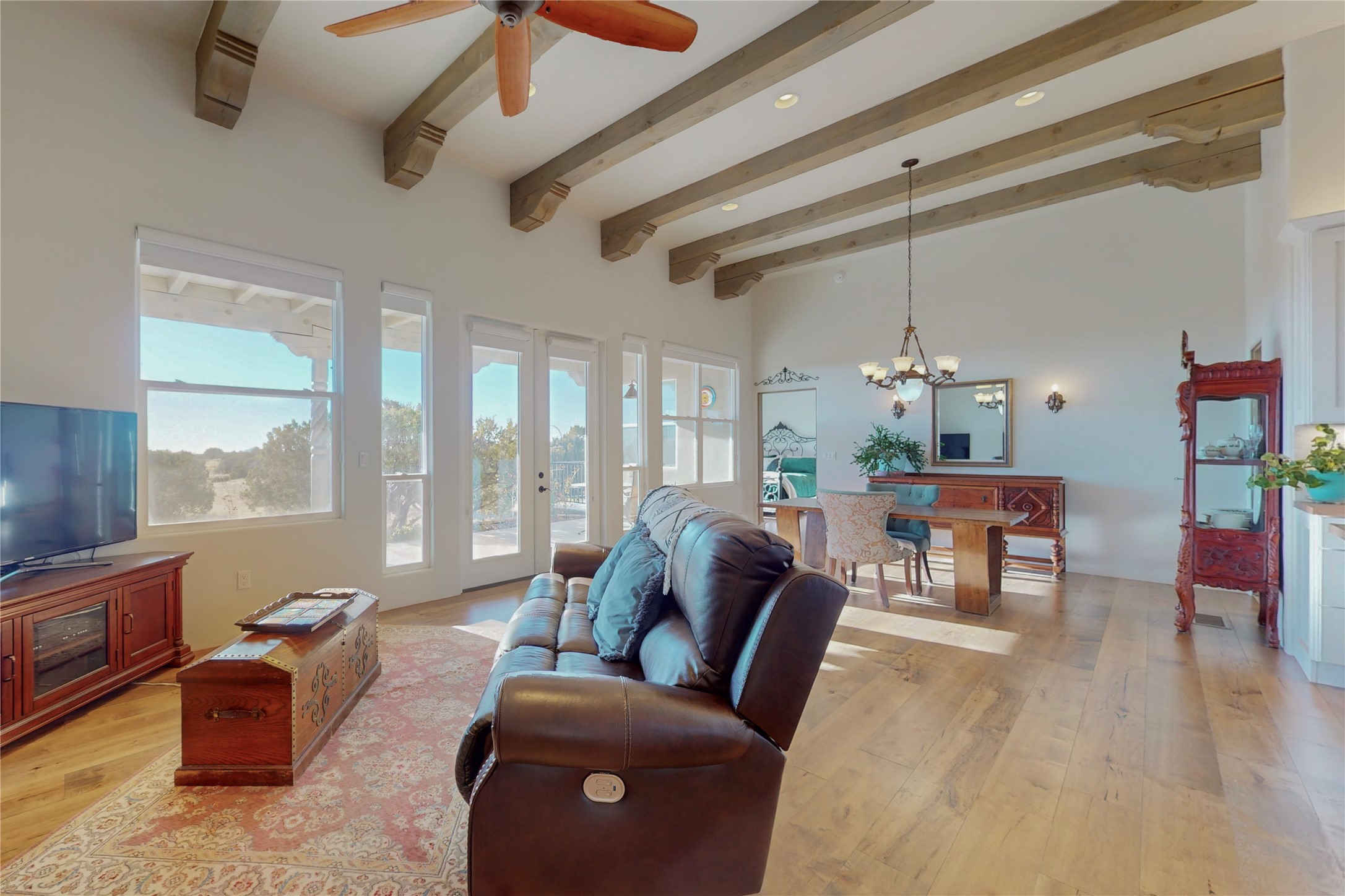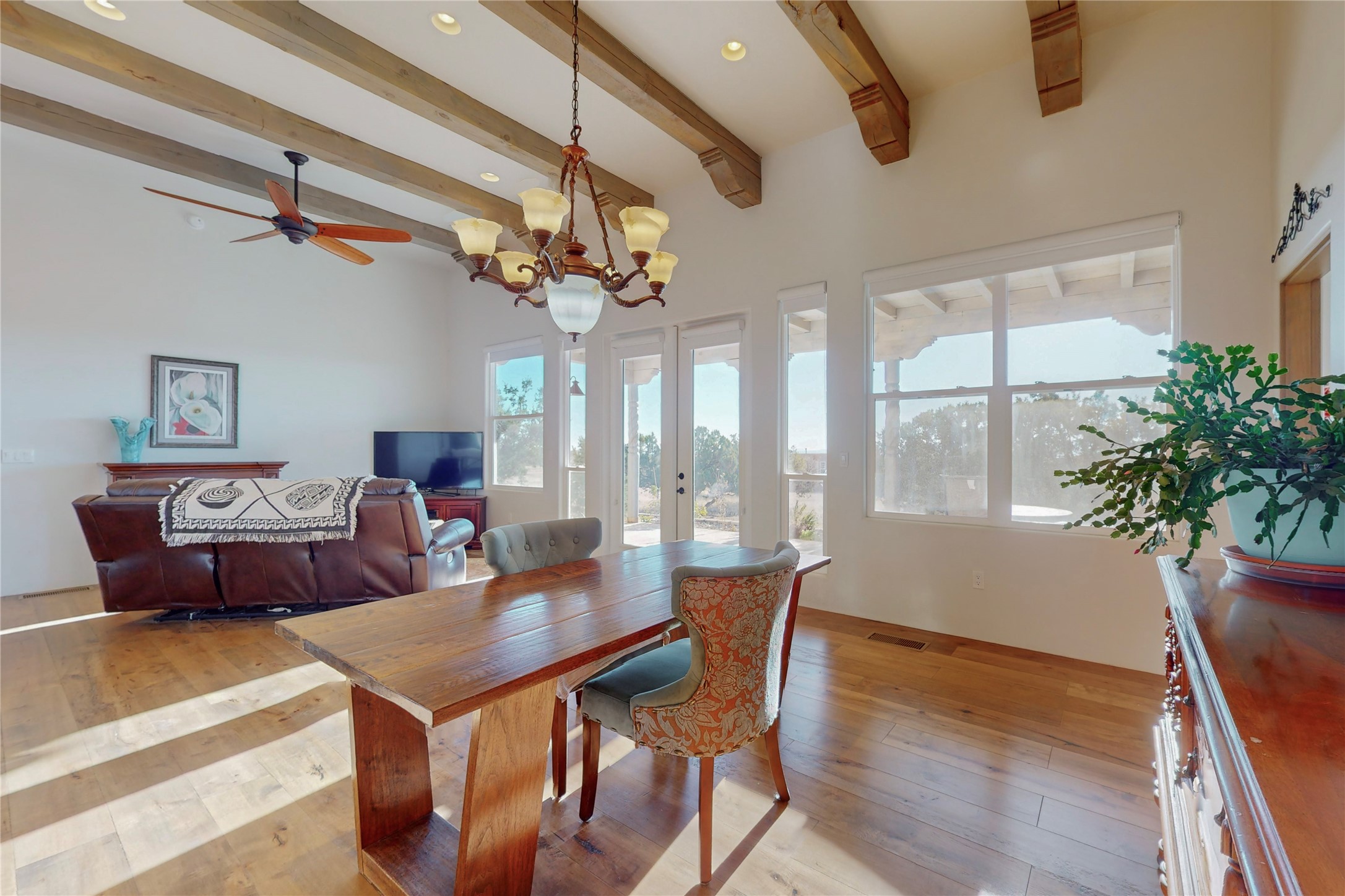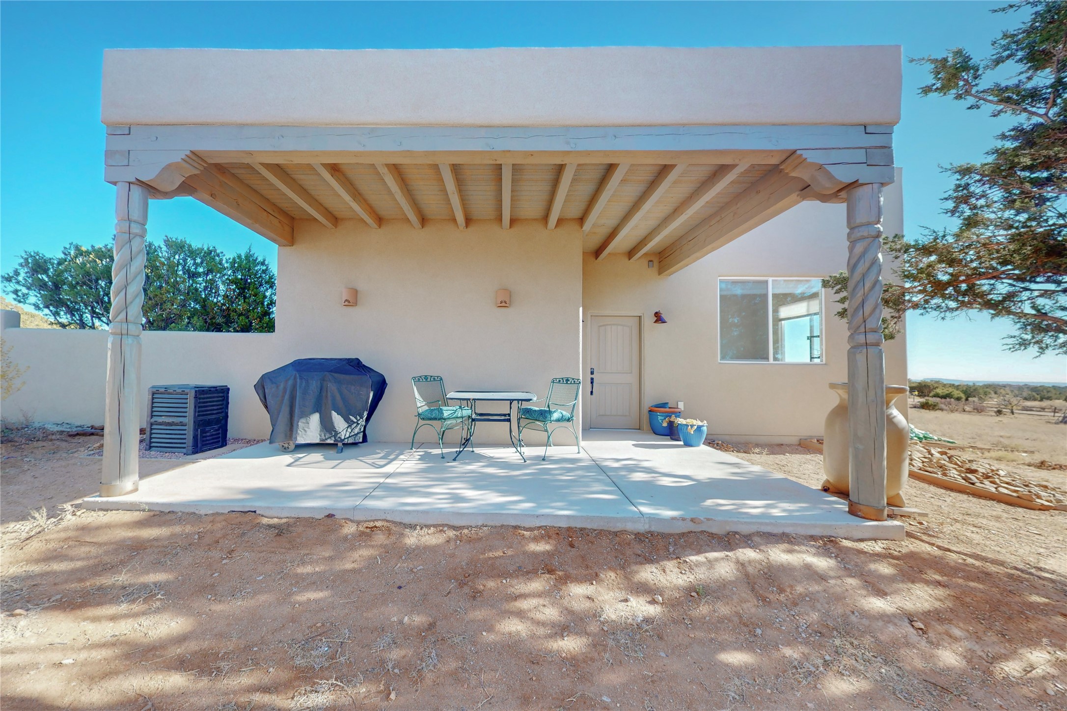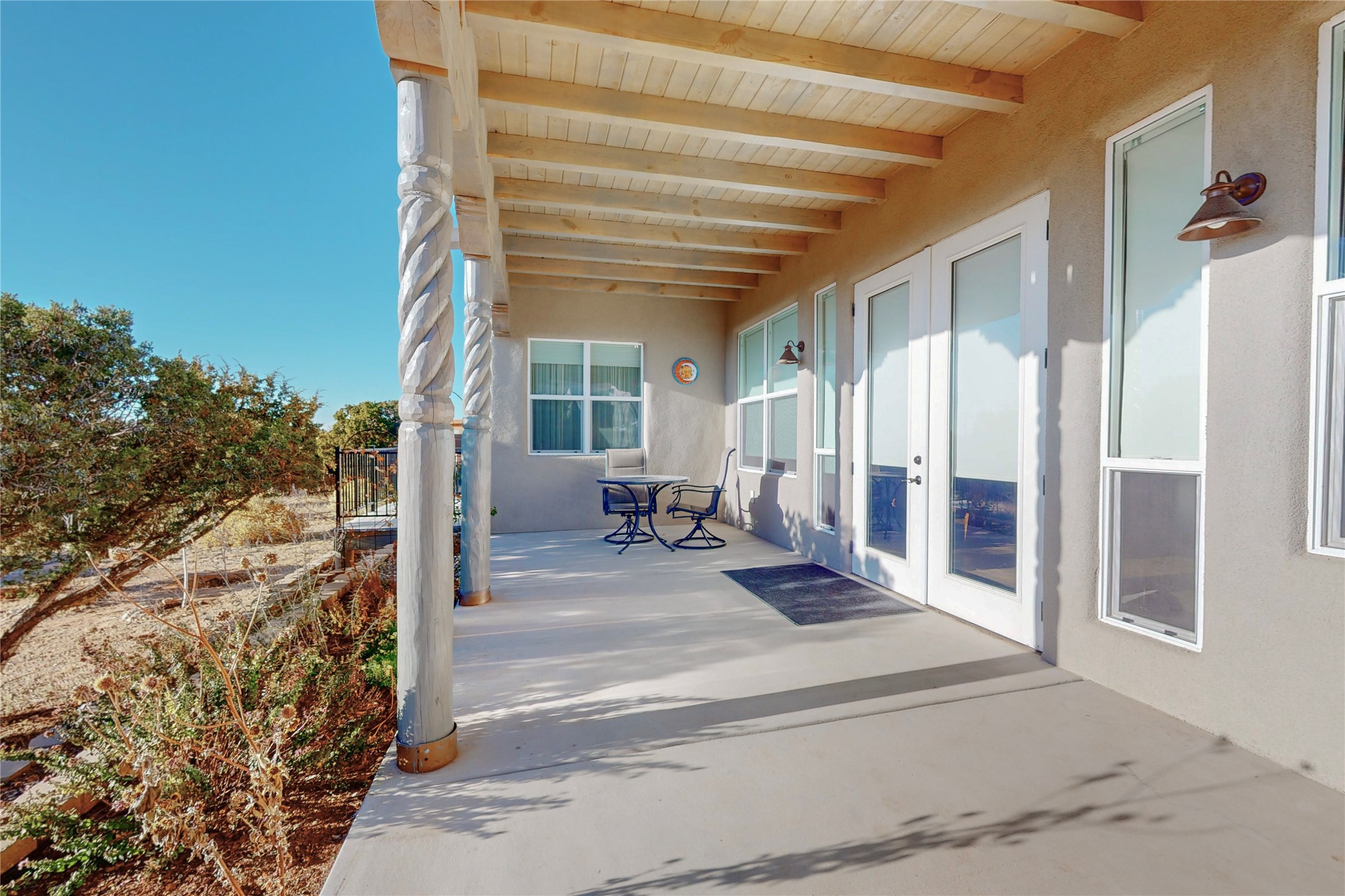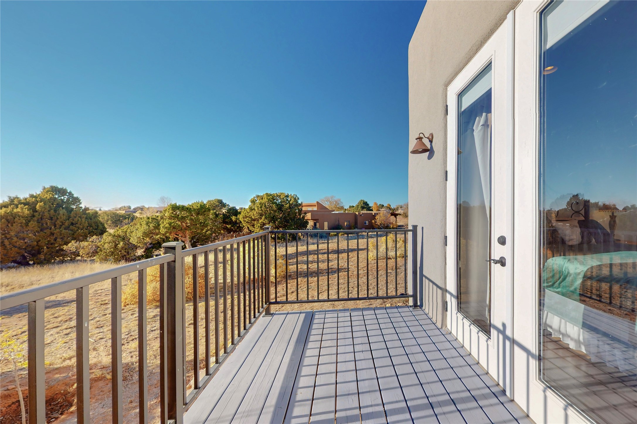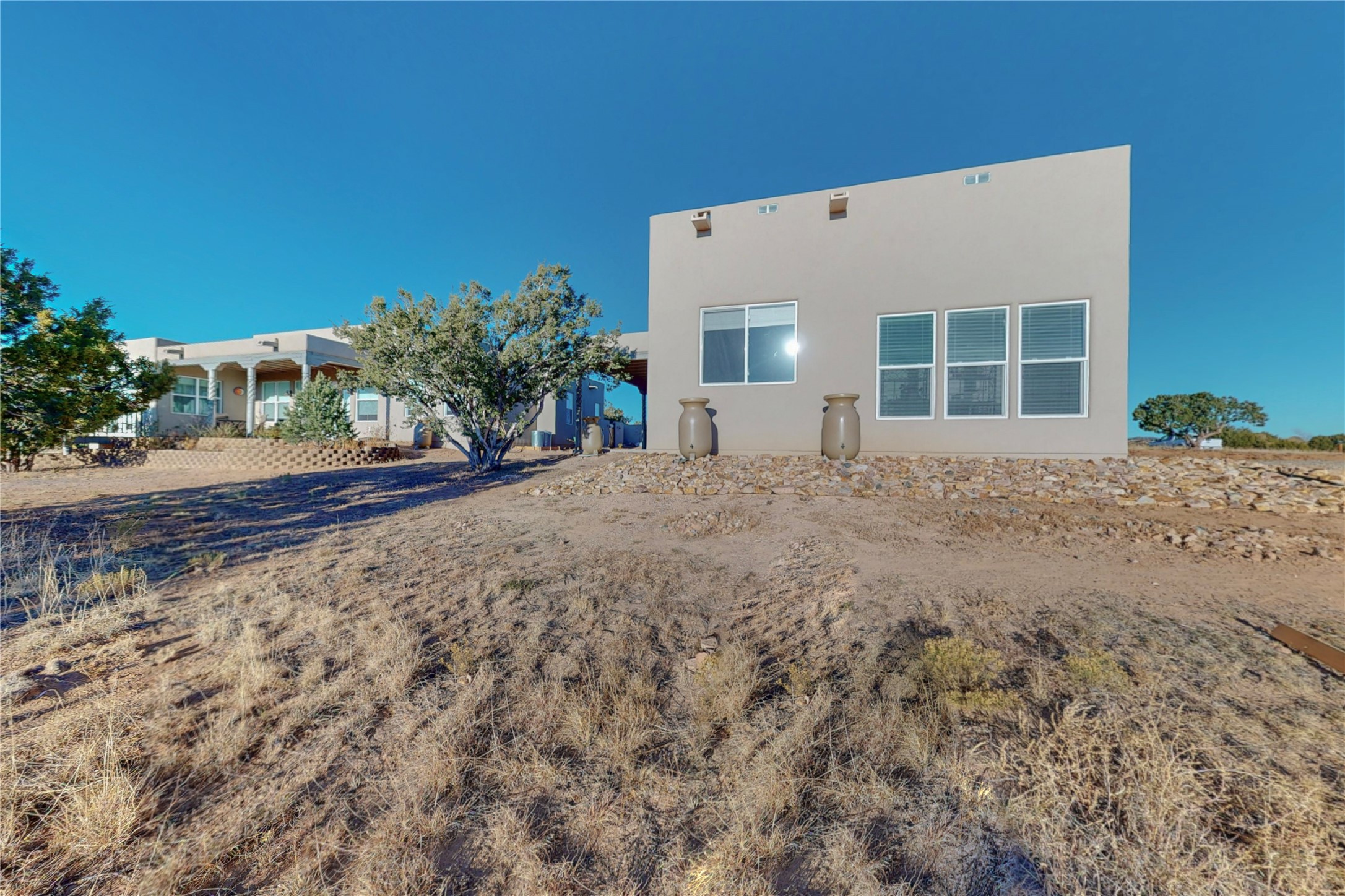 Sparkling bright "as new" 3 year old contemporary home on high corner view lot, a custom creation by Wild Sage Homes for the owners. With high ceilings and gleaming engineered wood floors throughout, this home is a perfect example of Pride of Ownership. An open plan, split bedroom design centered on a spacious great room this home was built for energy efficiency with a HERS rating of 70. Lovely long E-glass windows maximize the views and light, natural gas forced air provides efficient heating and cooling, high insulation factors make low utility bills year round. the attached finished 2 car garage includes a dedicated electrical for a freezer. An on demand gas hot water heater with a recirculating pump for instant hot water plus energy efficient upscale appliances. An 800 sqft heated RV garage with two bays and a workshop area plus a greenhouse creates space for all your hobbies and toys. This home accesses Eldorado amenities, local community activities, shopping and services plus only minutes into Santa Fe. A must see!