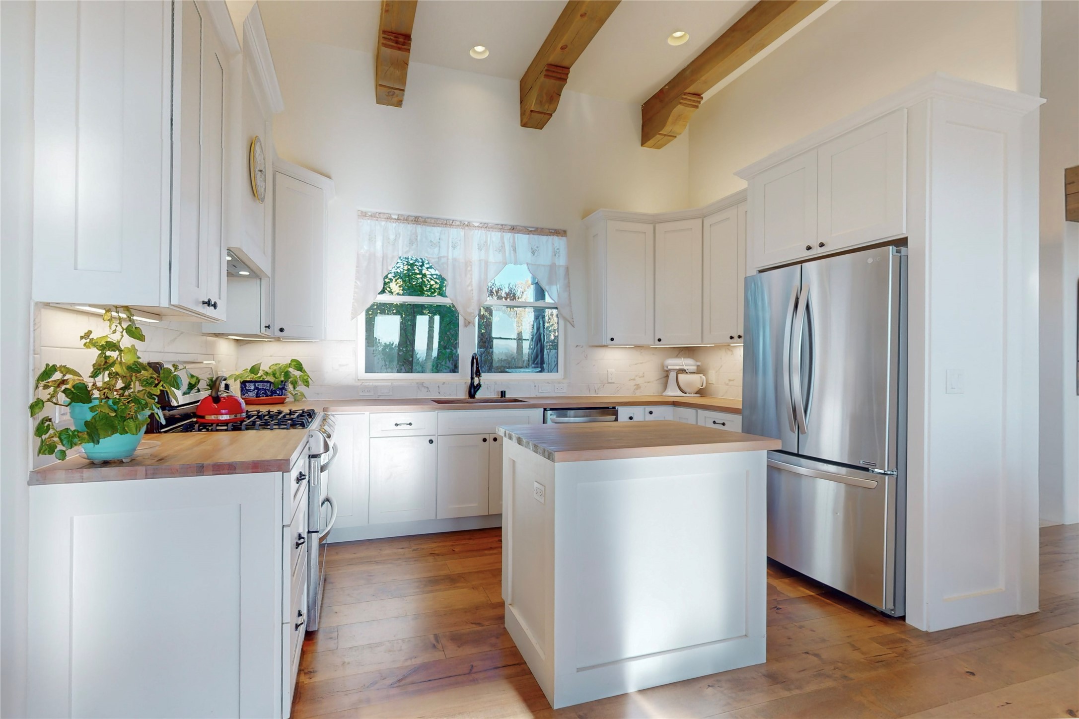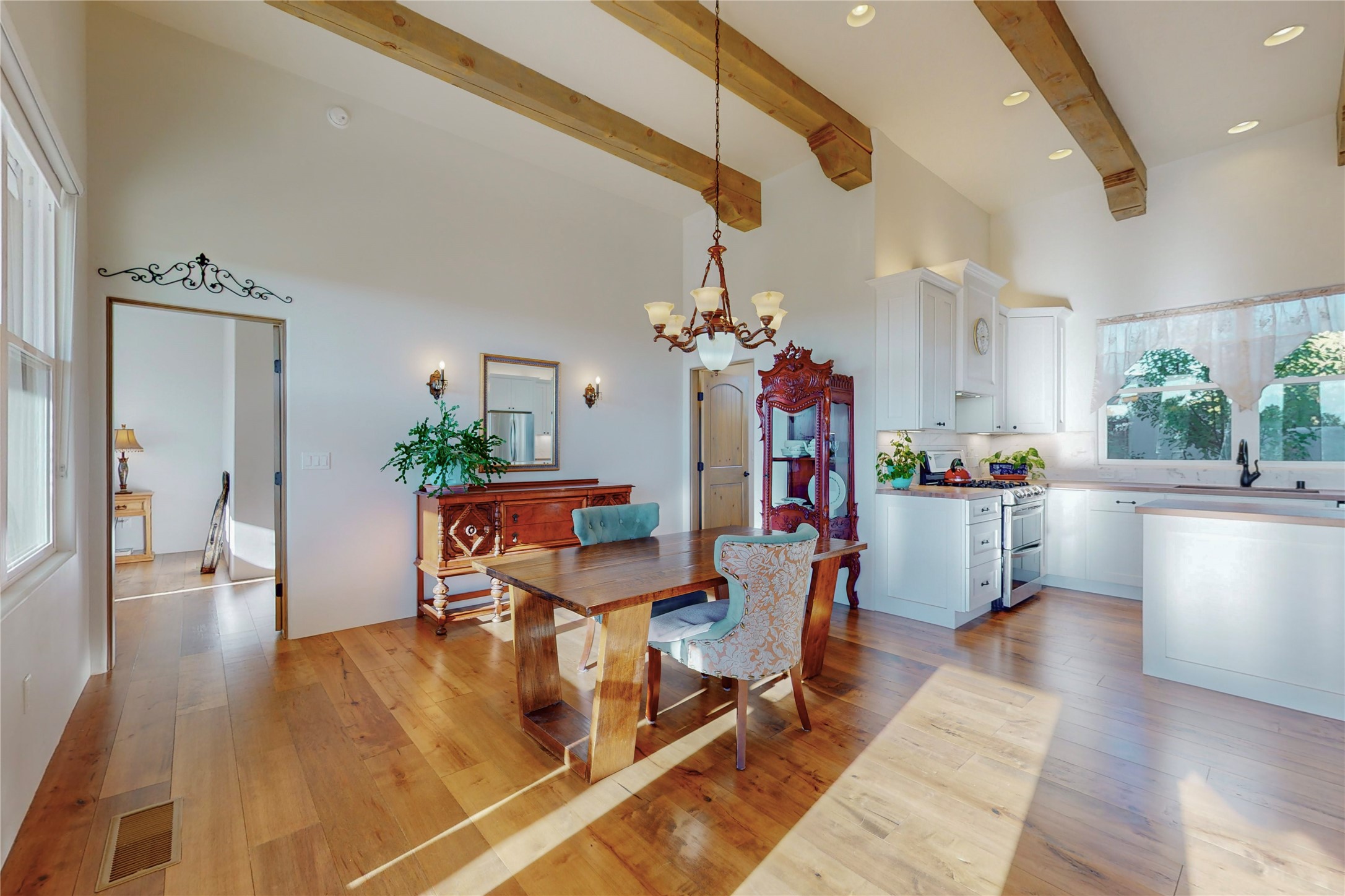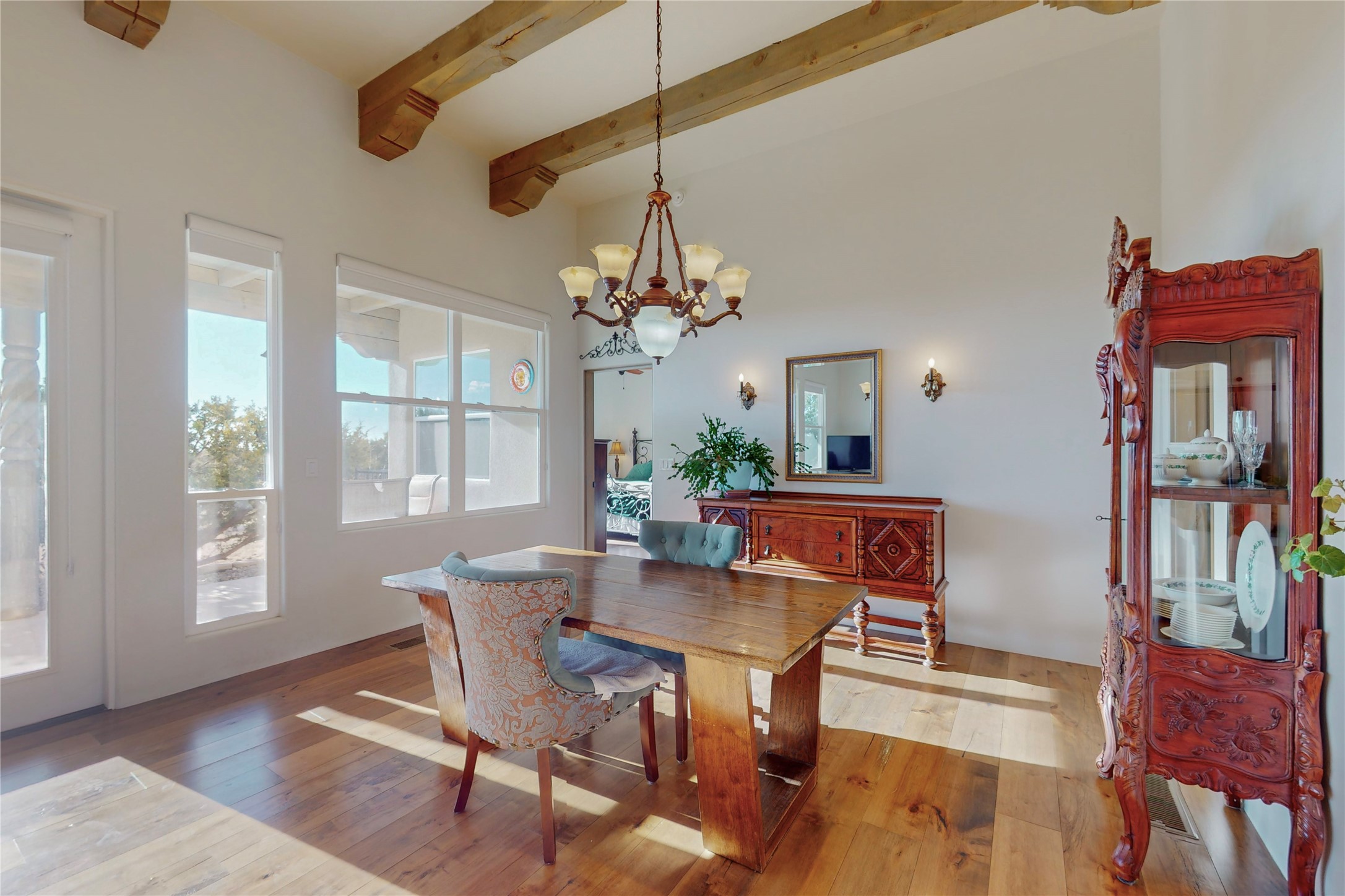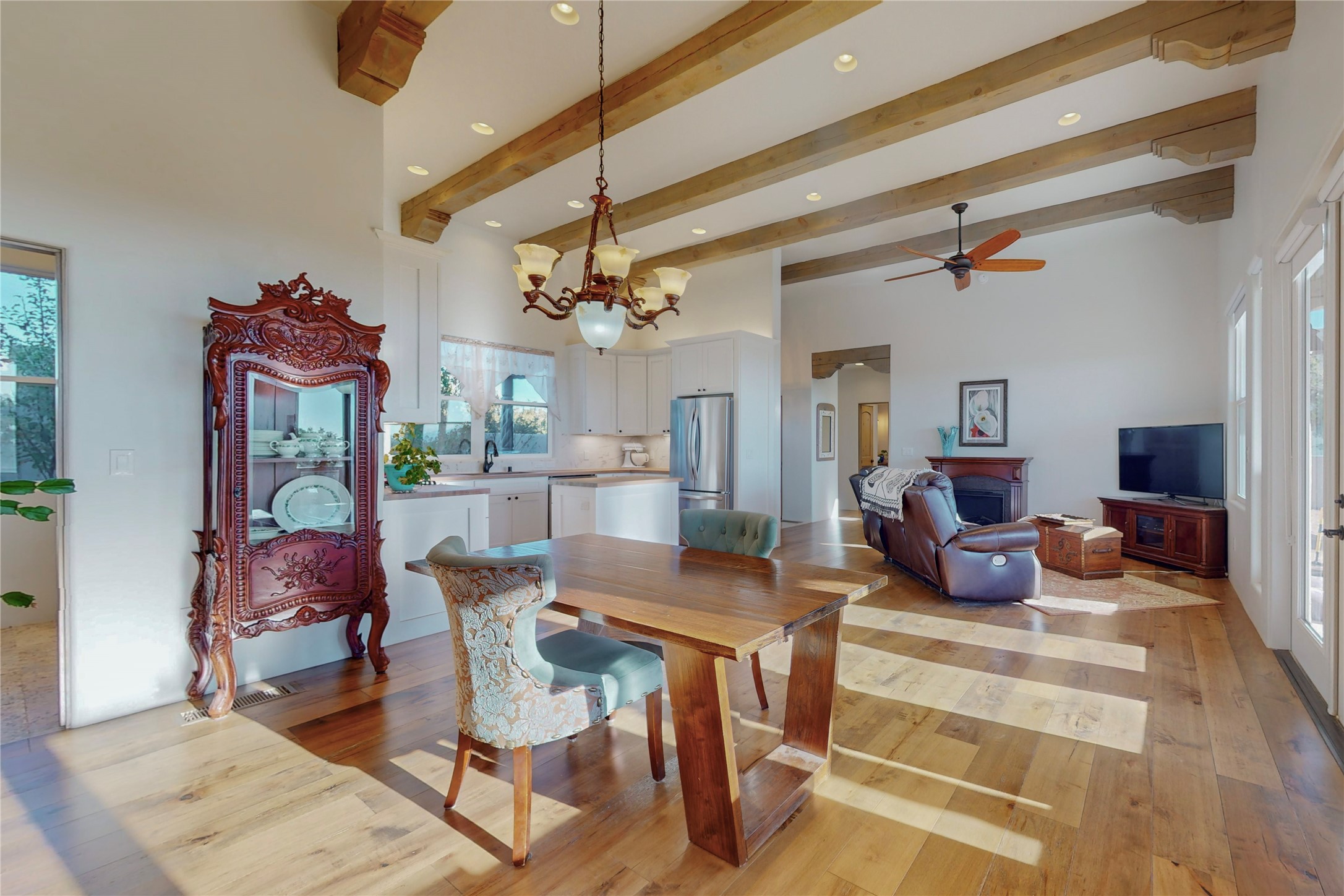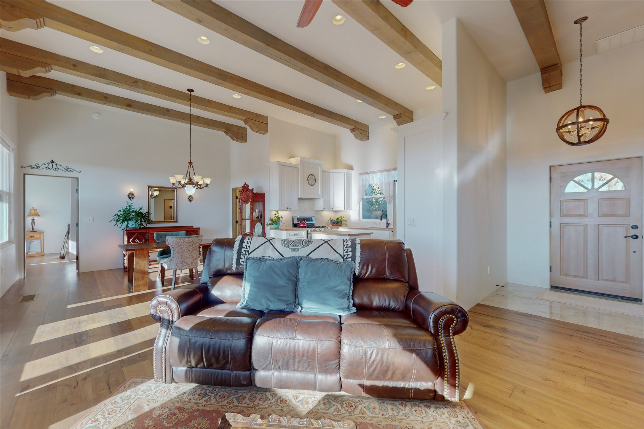 Sparkling bright "as new" 3 year old contemporary home on high corner view lot, a custom creation by Wild Sage Homes for the owners. With high ceilings and gleaming engineered wood floors throughout, this home is a perfect example of Pride of Ownership. An open plan, split bedroom design centered on a spacious great room this home was built for energy efficiency with a HERS rating of 70. Lovely long E-glass windows maximize the views and light, natural gas forced air provides efficient heating and cooling, high insulation factors make low utility bills year round. the attached finished 2 car garage includes a dedicated electrical for a freezer. An on demand gas hot water heater with a recirculating pump for instant hot water plus energy efficient upscale appliances. An 800 sqft heated RV garage with two bays and a workshop area plus a greenhouse creates space for all your hobbies and toys. This home accesses Eldorado amenities, local community activities, shopping and services plus only minutes into Santa Fe. A must see!