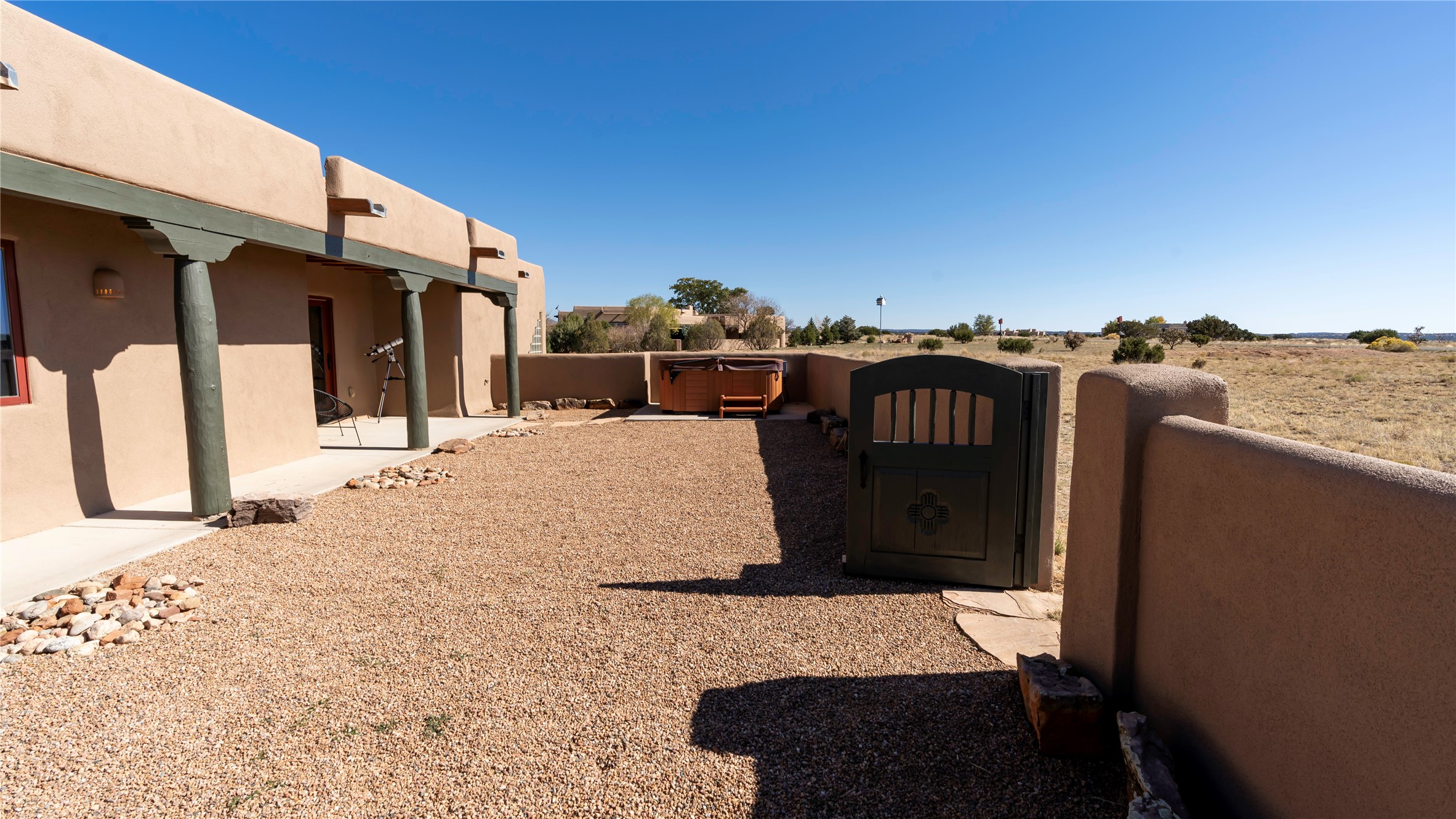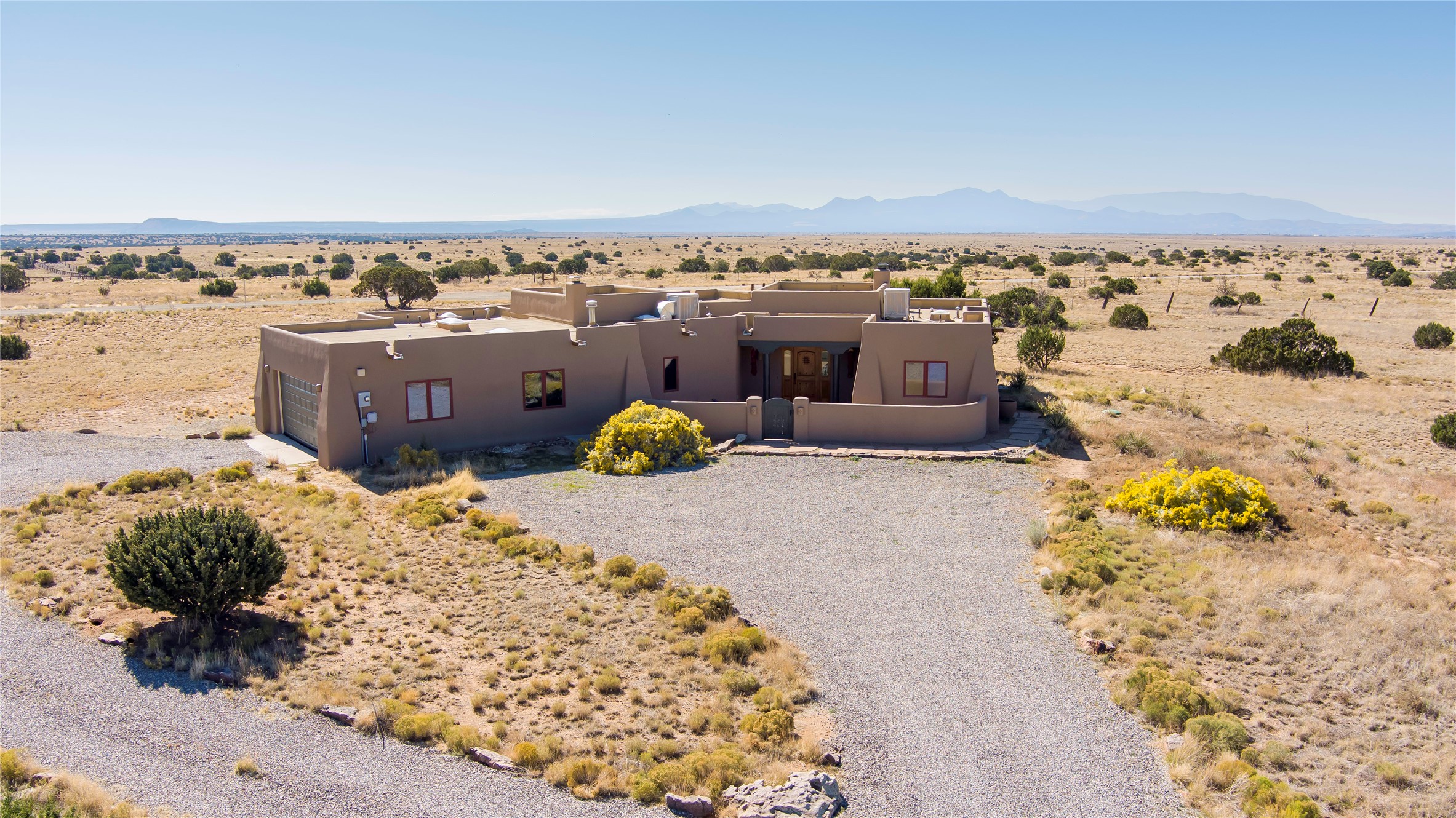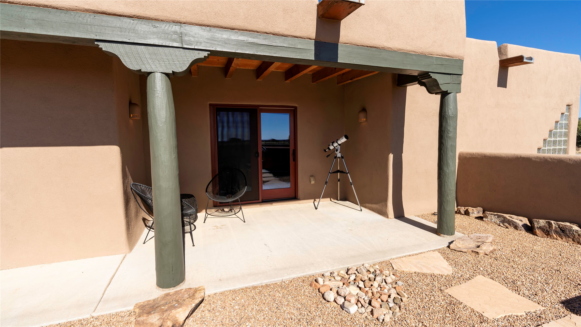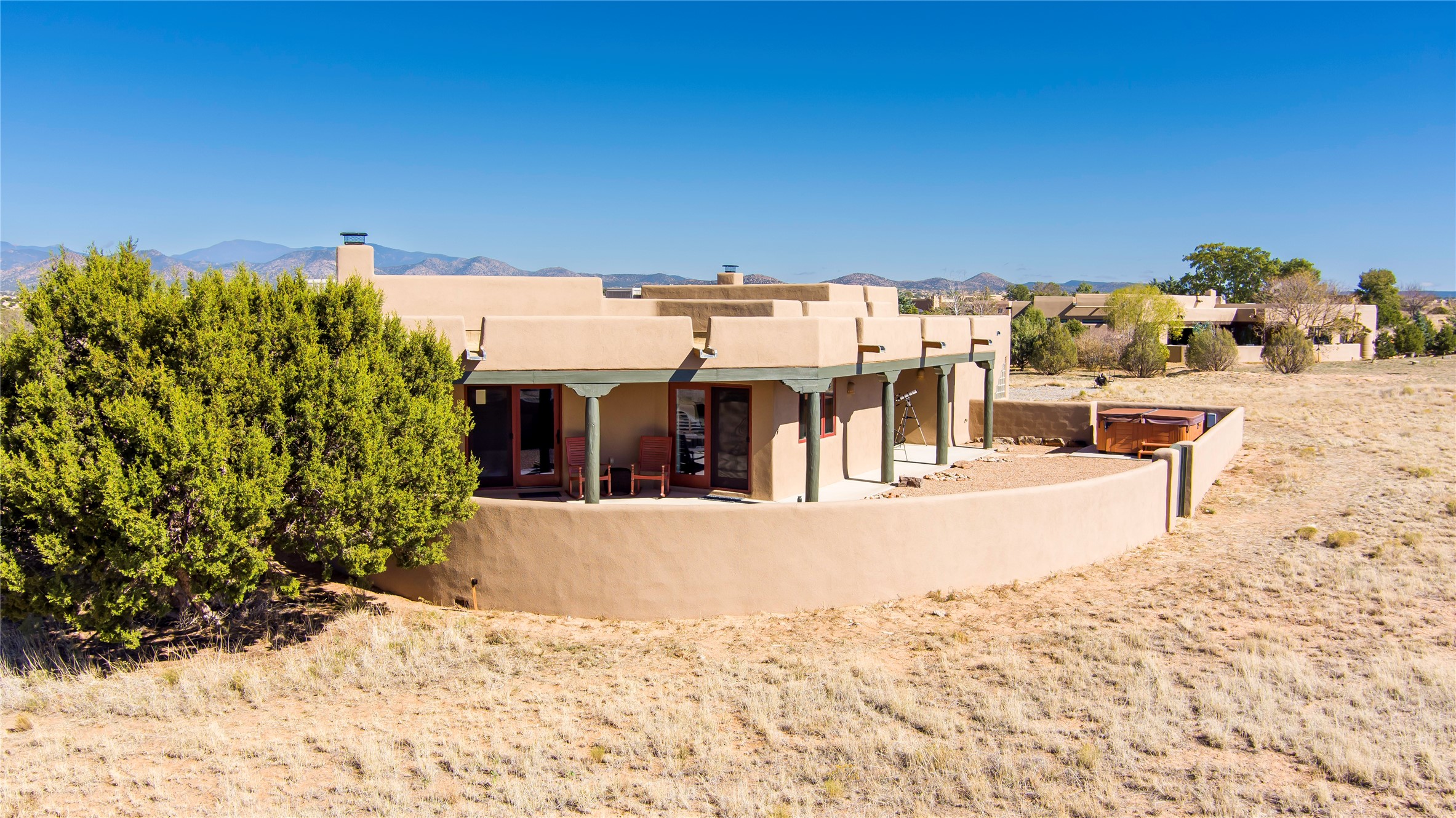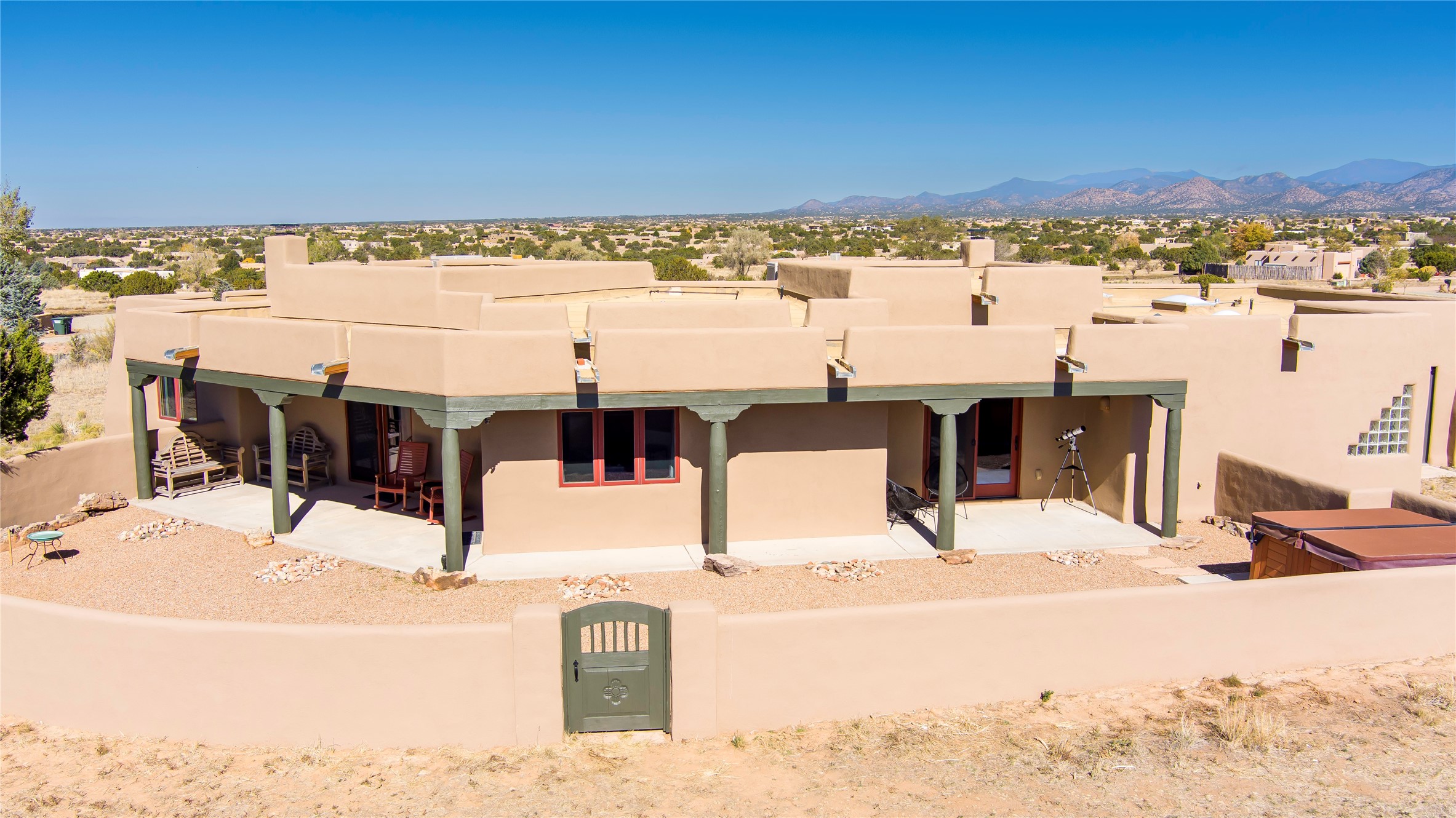 12 Quedo Road has been meticulously updated throughout with modern touches that showcase the southwestern elements of the home. The main living areas separate the primary bedroom and ensuite bathroom from the remaining two bedrooms for maximum privacy. The south side of the house features a large enclosed courtyard with two spacious portals and a hot tub, all surrounded by a privacy wall. Sunrises and sunsets are both viewable from the south courtyard, as are the open landscape and mountain views. A smaller courtyard (also with gate entrance and privacy wall) is located at the north of the house by the main entrance, and from here views of the Sangre de Cristo mountains can be enjoyed. Exterior improvements include new stucco and new paint (both completed in October, 2023). Interior improvements include new boiler and new water softener with whole-house filter and reverse osmosis filter (completed in September 2023); updated electrical features, including ceiling fans, light fixtures, and electrical outlets; new paint throughout the home; new kitchen sink; new bathroom faucets; new glass shower door; and a new Pella door with in-glass blinds in one of the secondary bedrooms. There are two wood-burning kiva fireplaces in the home, one located in the living area and a second in the primary bedroom. The house is offered fully furnished, at no additional cost to the buyer. This beautiful home is located in the quiet, dark-sky community of Eldorado. Schedule your showing today!