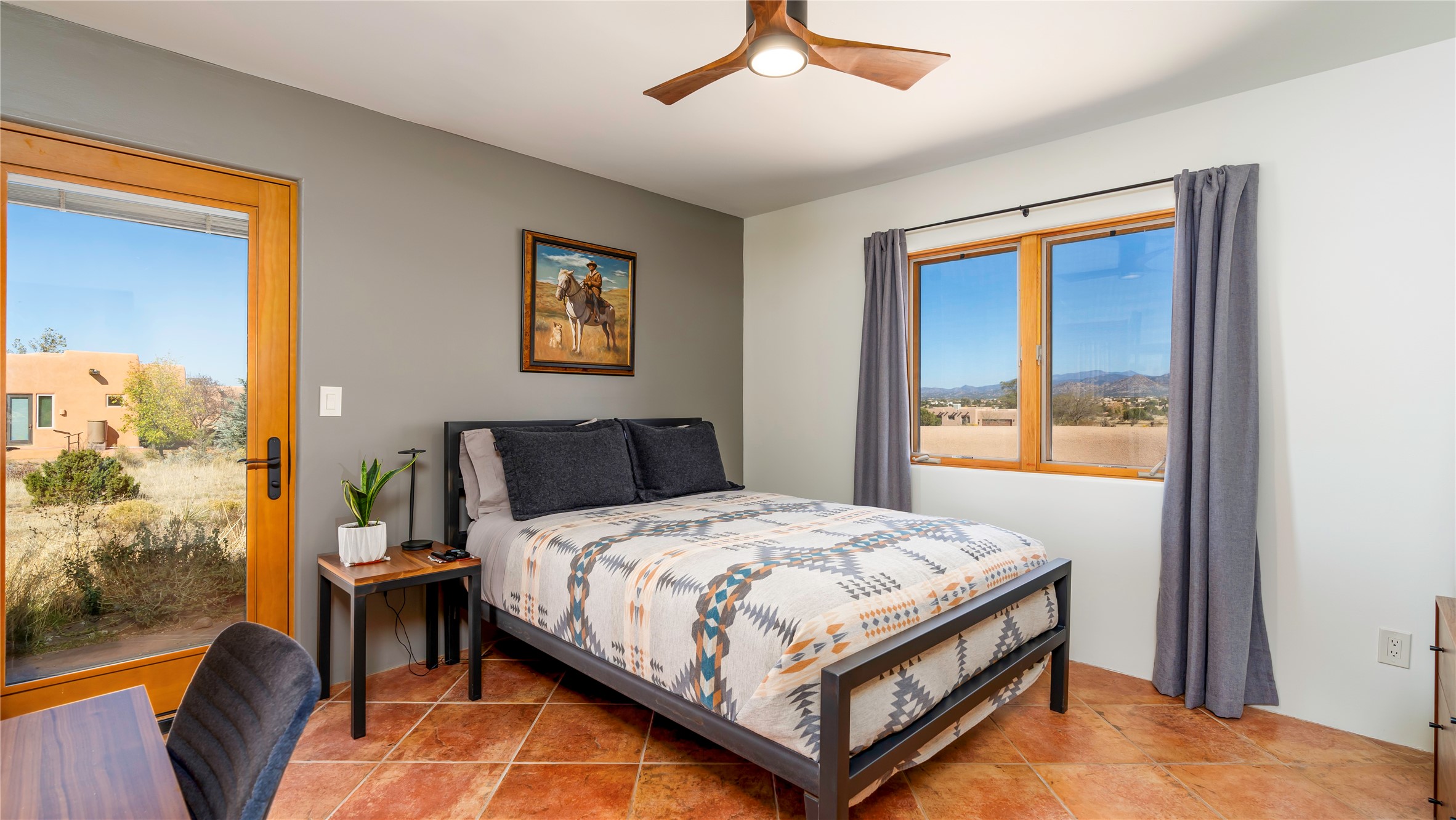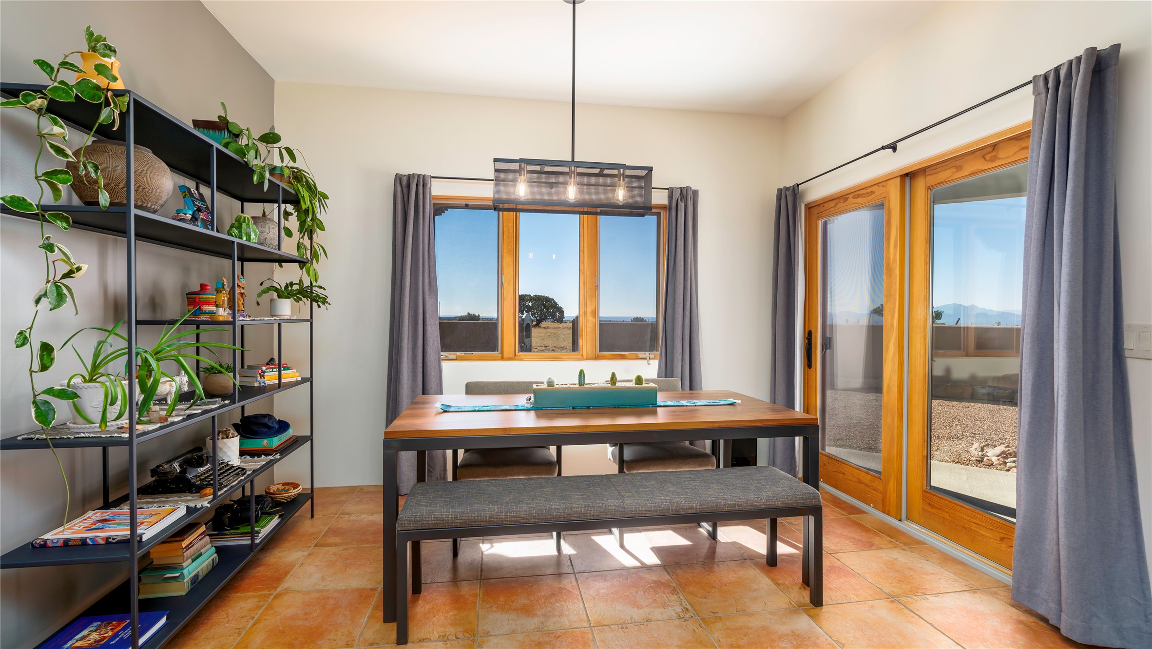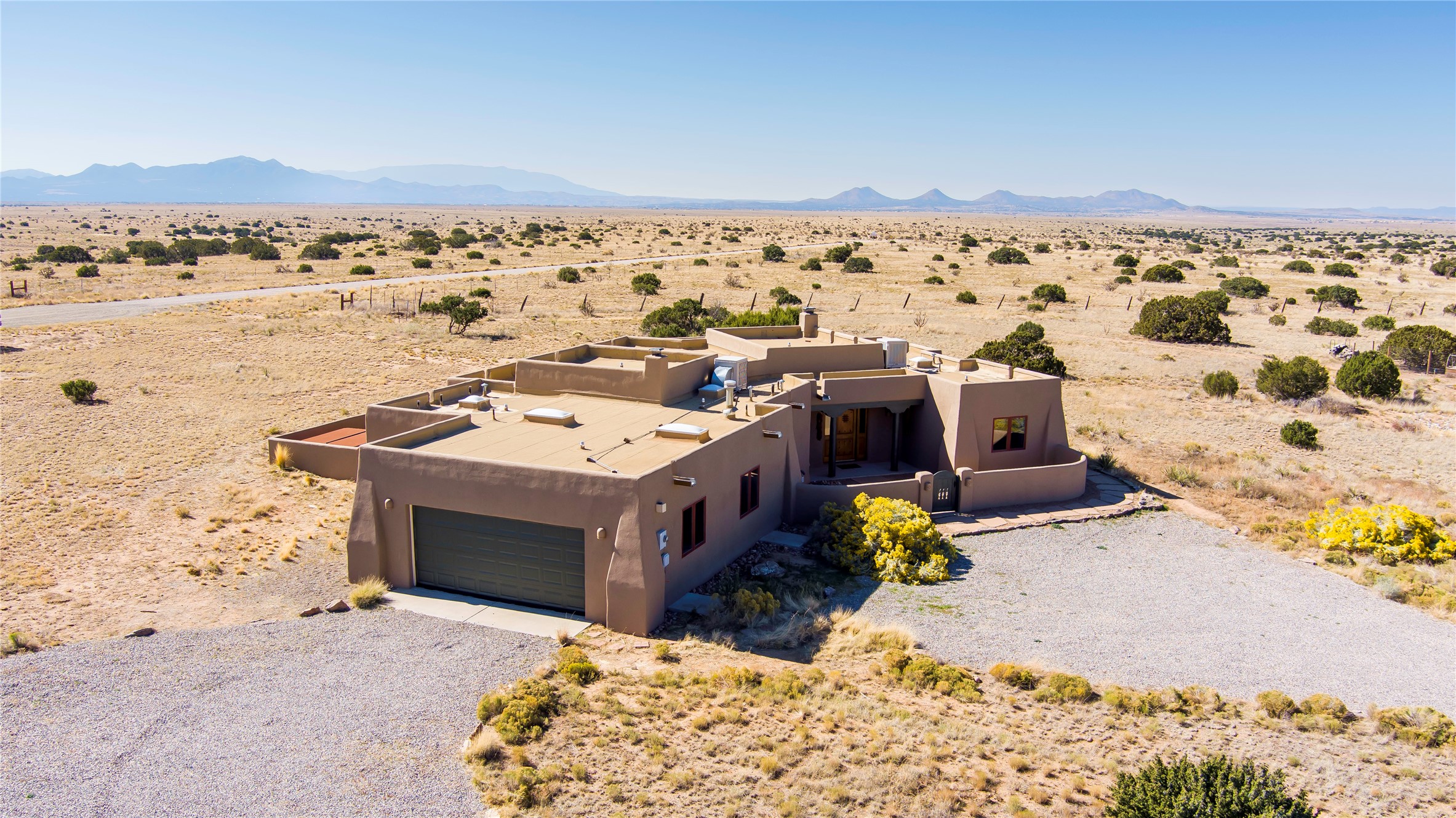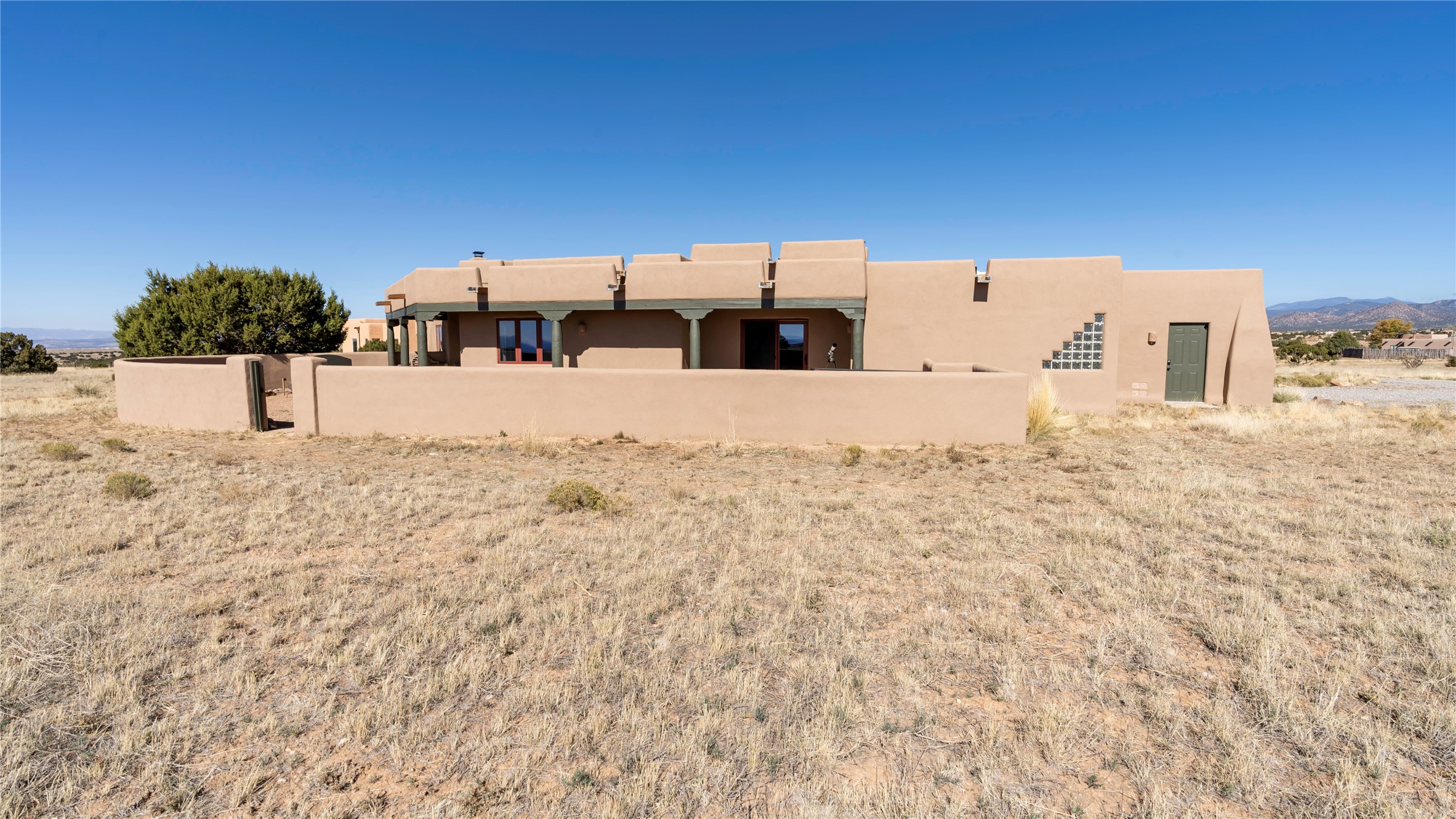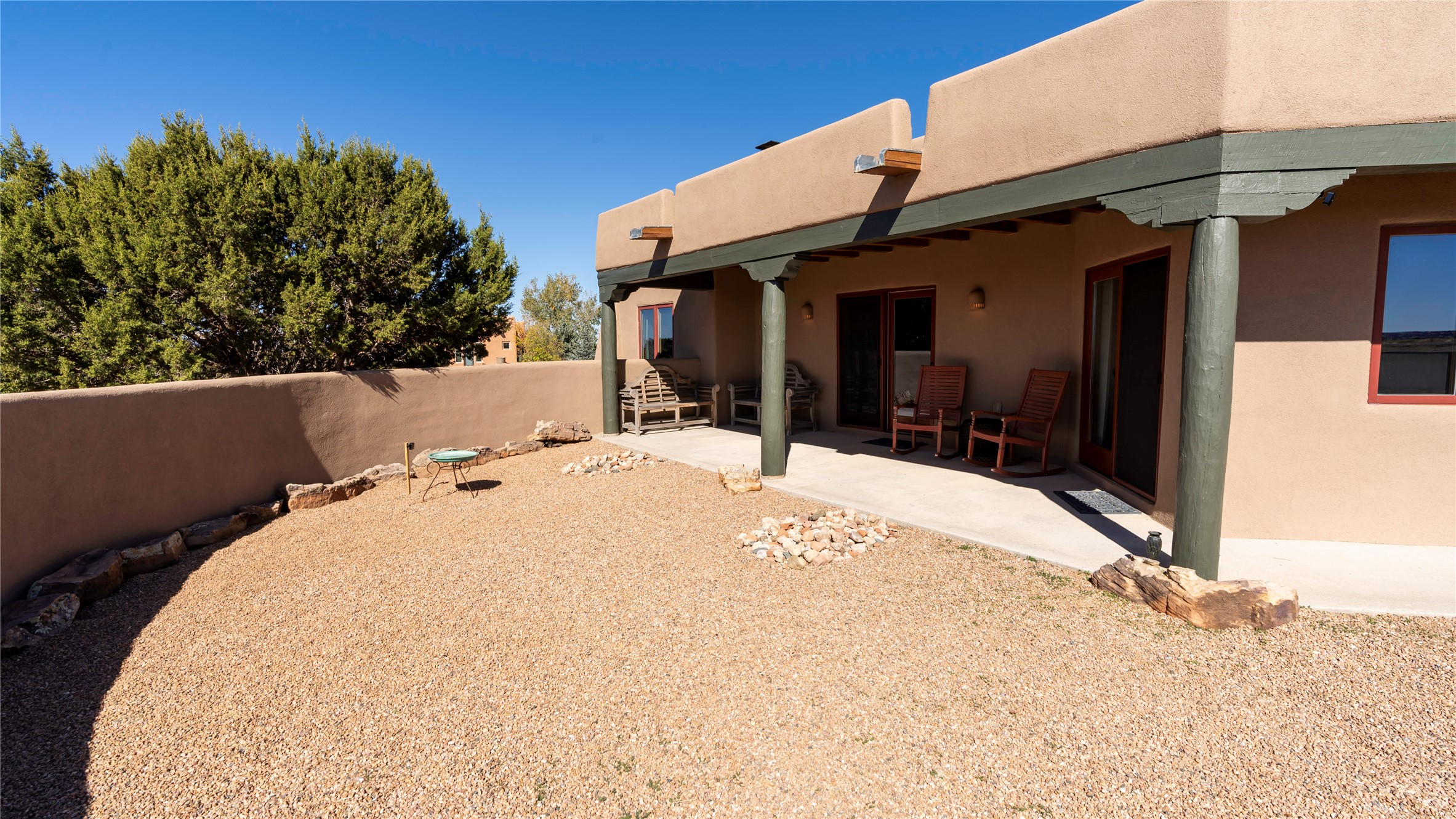 12 Quedo Road has been meticulously updated throughout with modern touches that showcase the southwestern elements of the home. The main living areas separate the primary bedroom and ensuite bathroom from the remaining two bedrooms for maximum privacy. The south side of the house features a large enclosed courtyard with two spacious portals and a hot tub, all surrounded by a privacy wall. Sunrises and sunsets are both viewable from the south courtyard, as are the open landscape and mountain views. A smaller courtyard (also with gate entrance and privacy wall) is located at the north of the house by the main entrance, and from here views of the Sangre de Cristo mountains can be enjoyed. Exterior improvements include new stucco and new paint (both completed in October, 2023). Interior improvements include new boiler and new water softener with whole-house filter and reverse osmosis filter (completed in September 2023); updated electrical features, including ceiling fans, light fixtures, and electrical outlets; new paint throughout the home; new kitchen sink; new bathroom faucets; new glass shower door; and a new Pella door with in-glass blinds in one of the secondary bedrooms. There are two wood-burning kiva fireplaces in the home, one located in the living area and a second in the primary bedroom. The house is offered fully furnished, at no additional cost to the buyer. This beautiful home is located in the quiet, dark-sky community of Eldorado. Schedule your showing today!