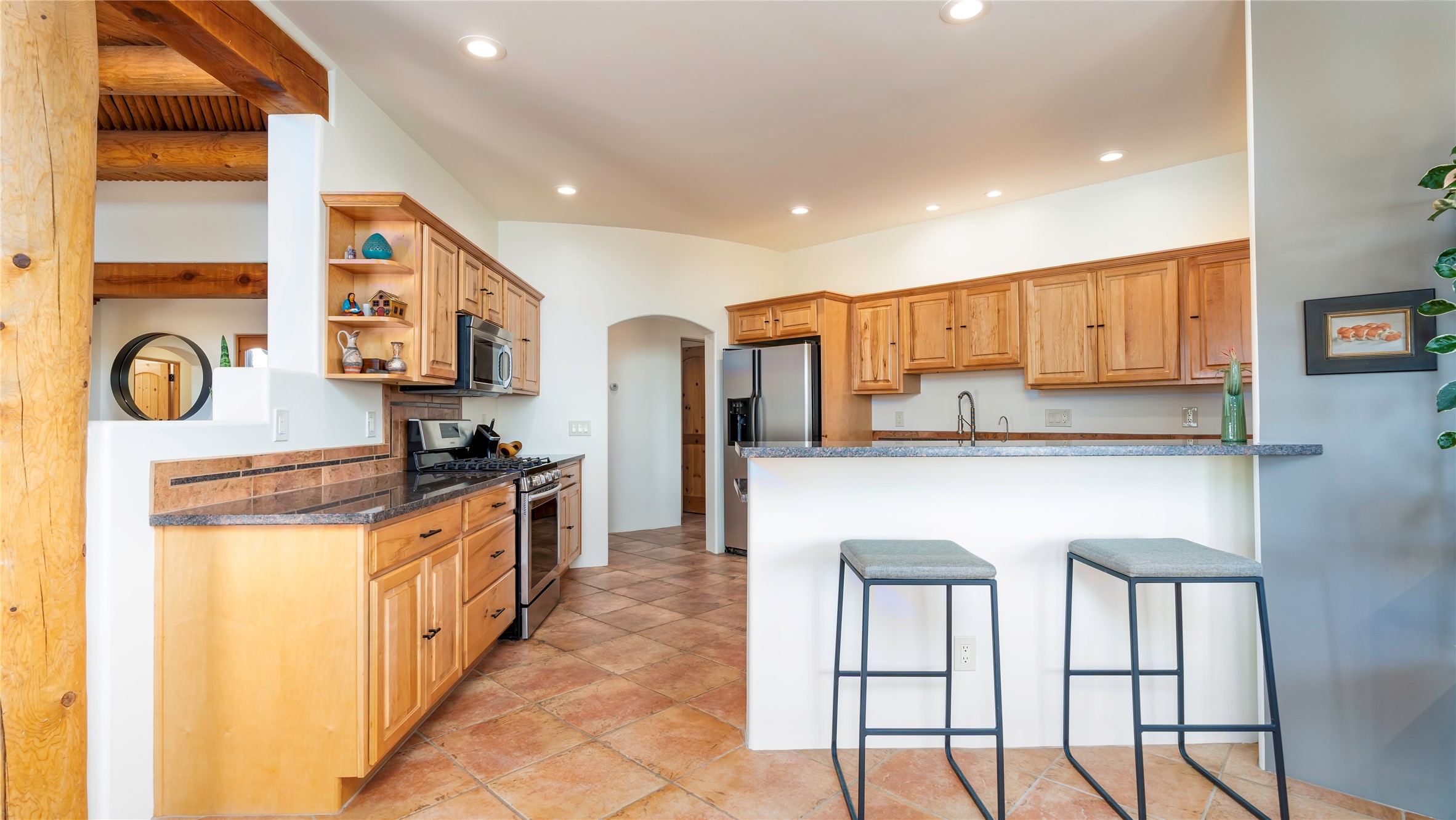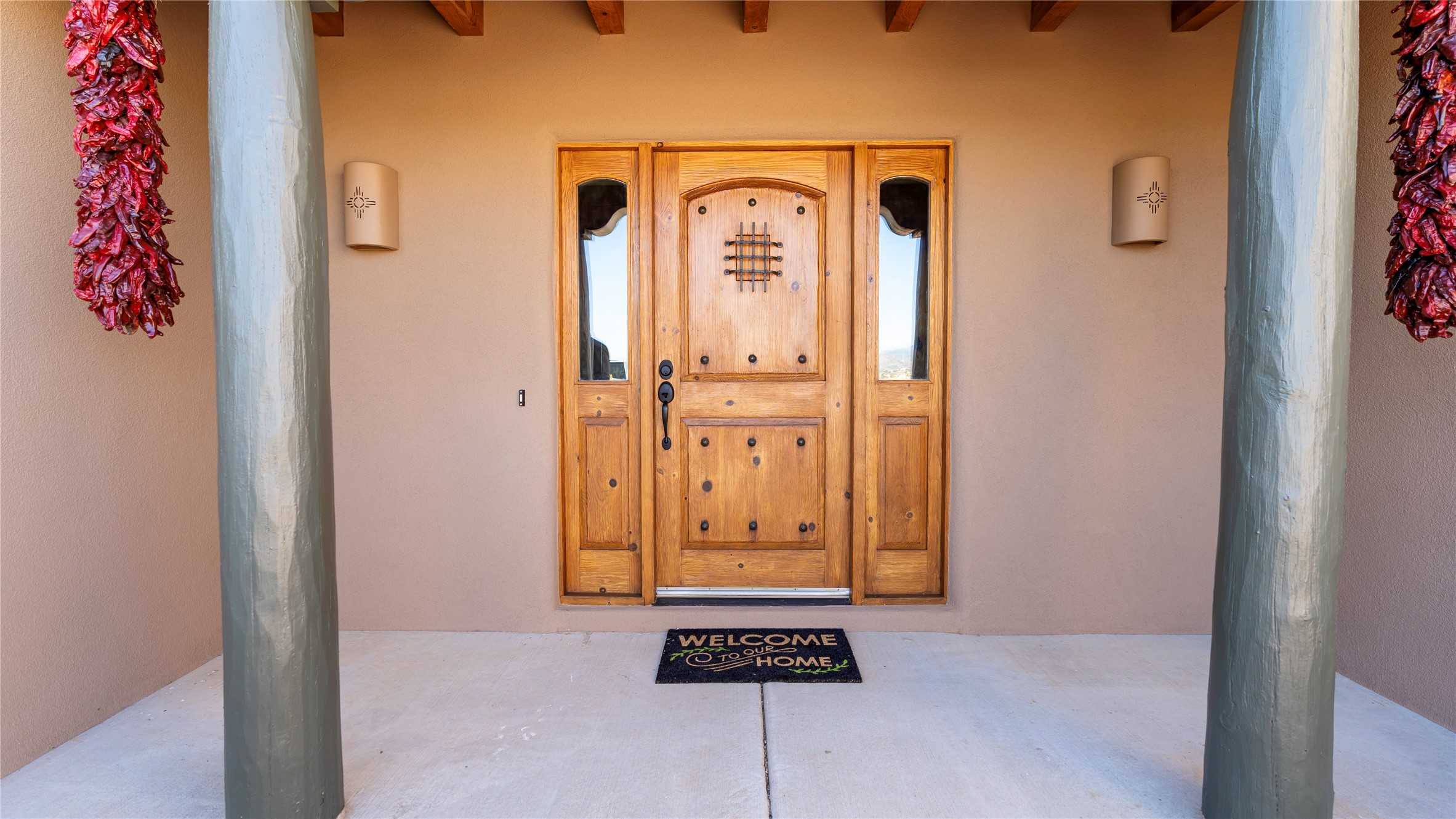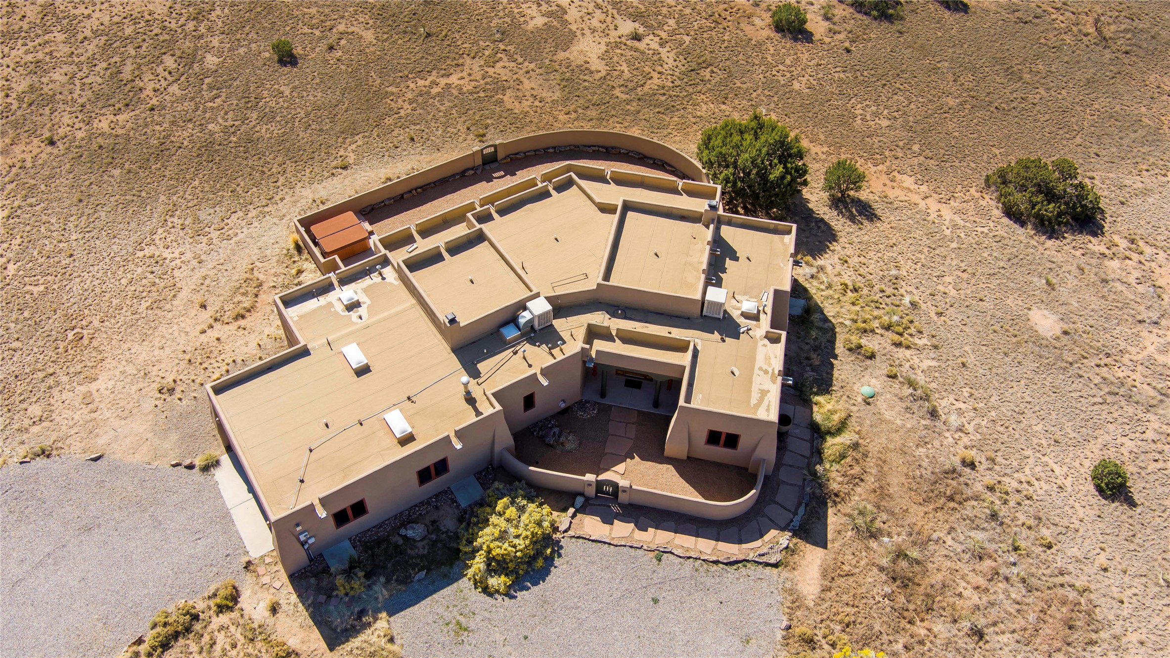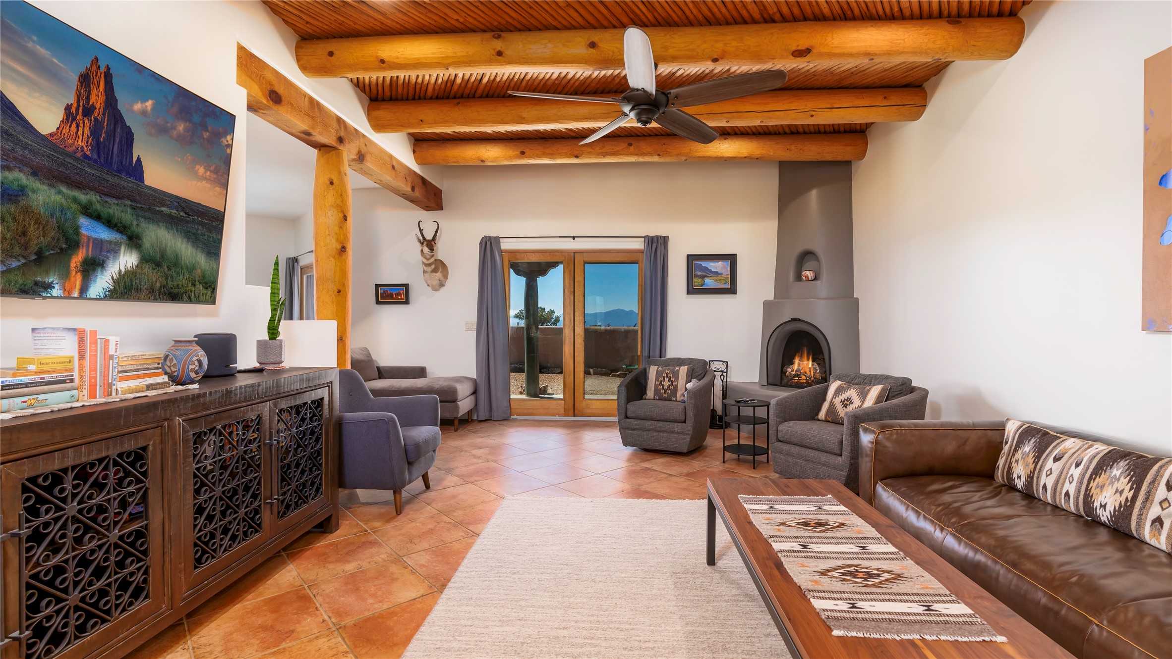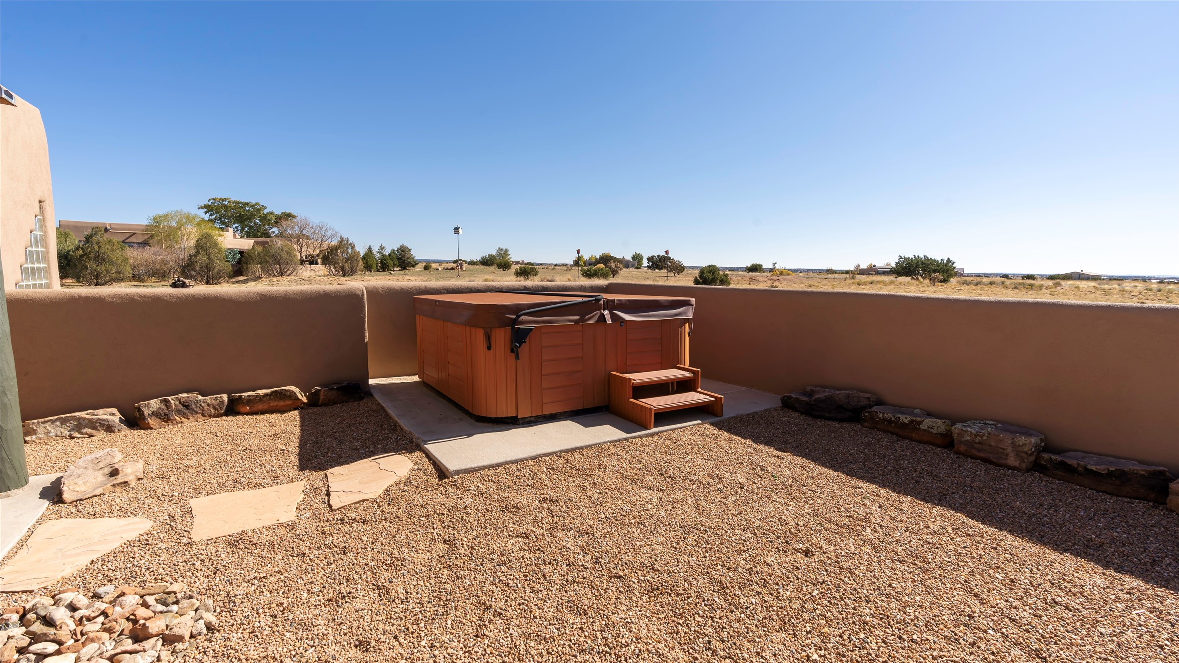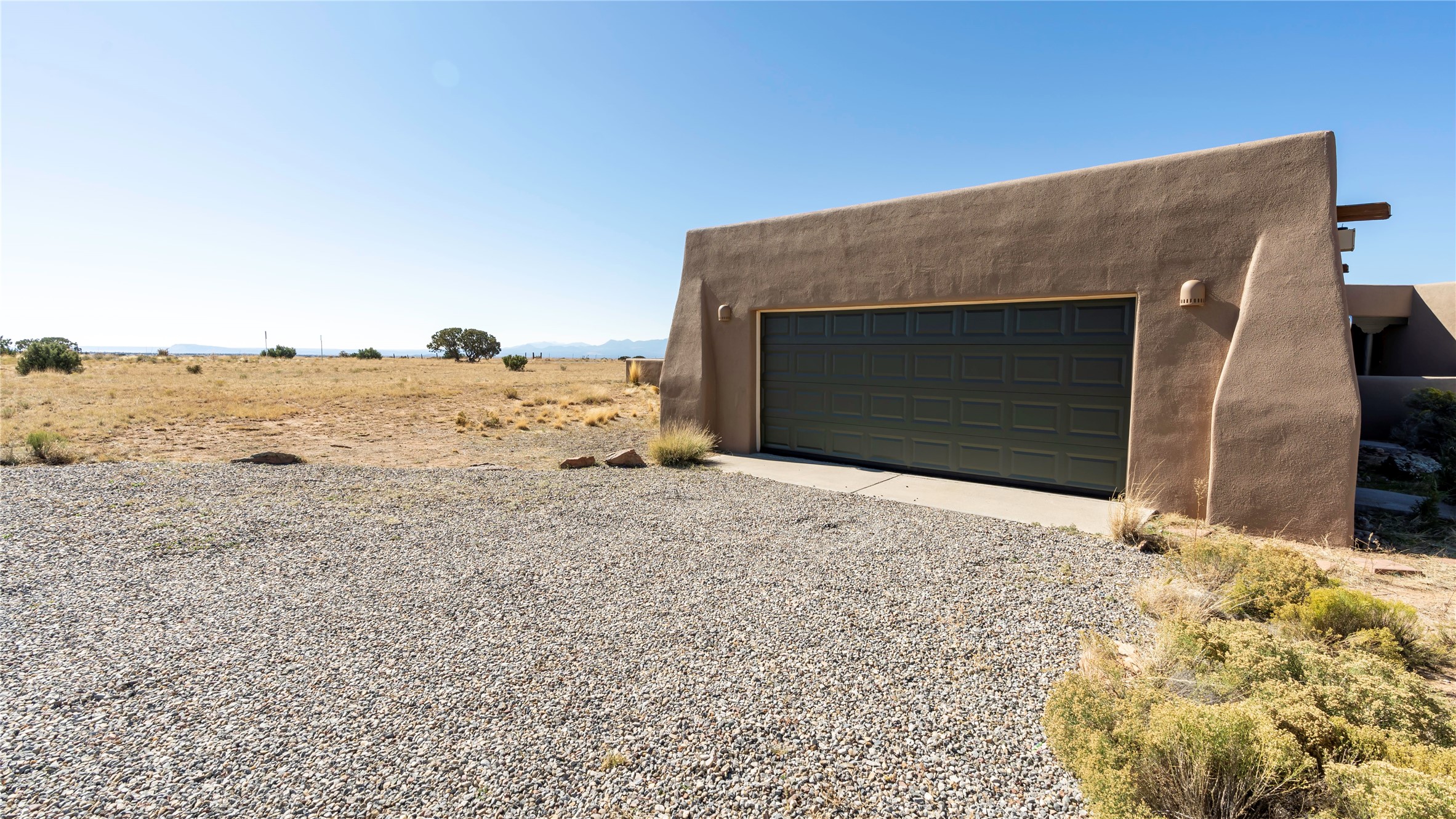 12 Quedo Road has been meticulously updated throughout with modern touches that showcase the southwestern elements of the home. The main living areas separate the primary bedroom and ensuite bathroom from the remaining two bedrooms for maximum privacy. The south side of the house features a large enclosed courtyard with two spacious portals and a hot tub, all surrounded by a privacy wall. Sunrises and sunsets are both viewable from the south courtyard, as are the open landscape and mountain views. A smaller courtyard (also with gate entrance and privacy wall) is located at the north of the house by the main entrance, and from here views of the Sangre de Cristo mountains can be enjoyed. Exterior improvements include new stucco and new paint (both completed in October, 2023). Interior improvements include new boiler and new water softener with whole-house filter and reverse osmosis filter (completed in September 2023); updated electrical features, including ceiling fans, light fixtures, and electrical outlets; new paint throughout the home; new kitchen sink; new bathroom faucets; new glass shower door; and a new Pella door with in-glass blinds in one of the secondary bedrooms. There are two wood-burning kiva fireplaces in the home, one located in the living area and a second in the primary bedroom. The house is offered fully furnished, at no additional cost to the buyer. This beautiful home is located in the quiet, dark-sky community of Eldorado. Schedule your showing today!