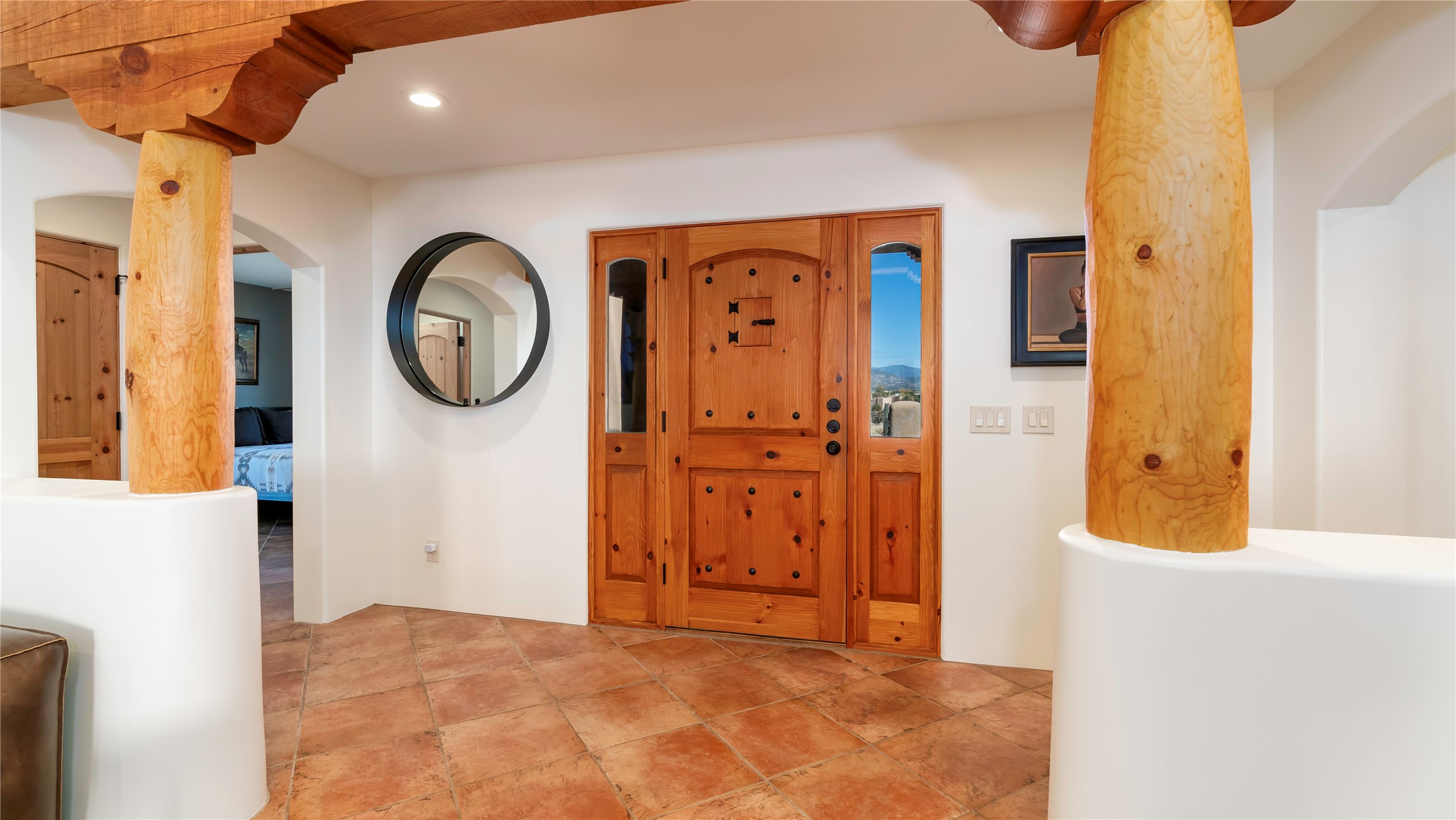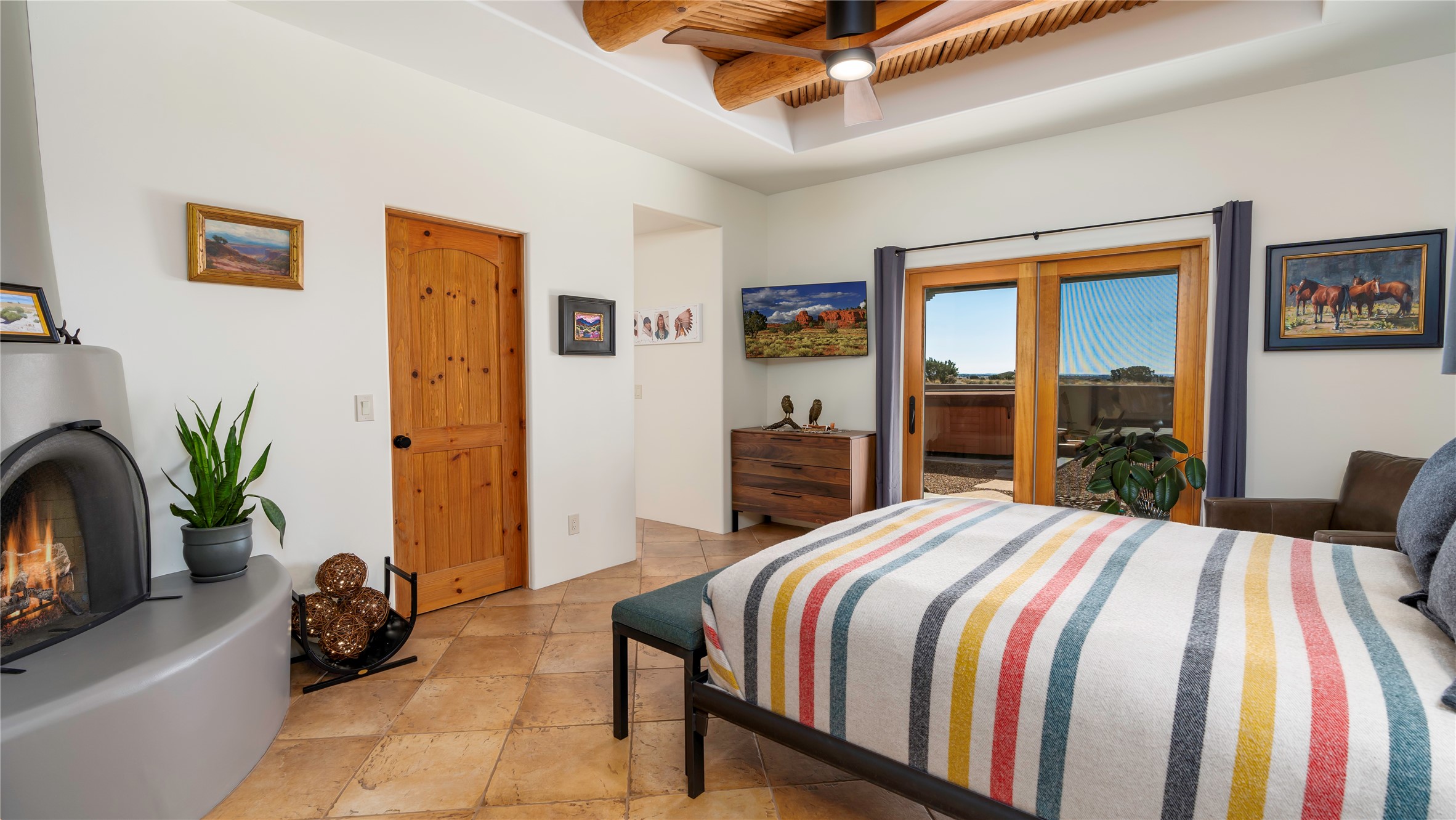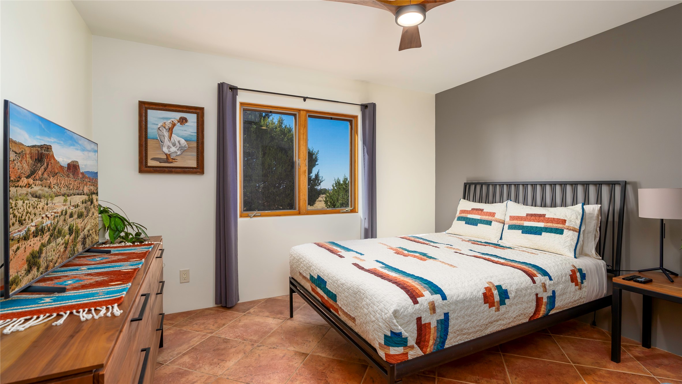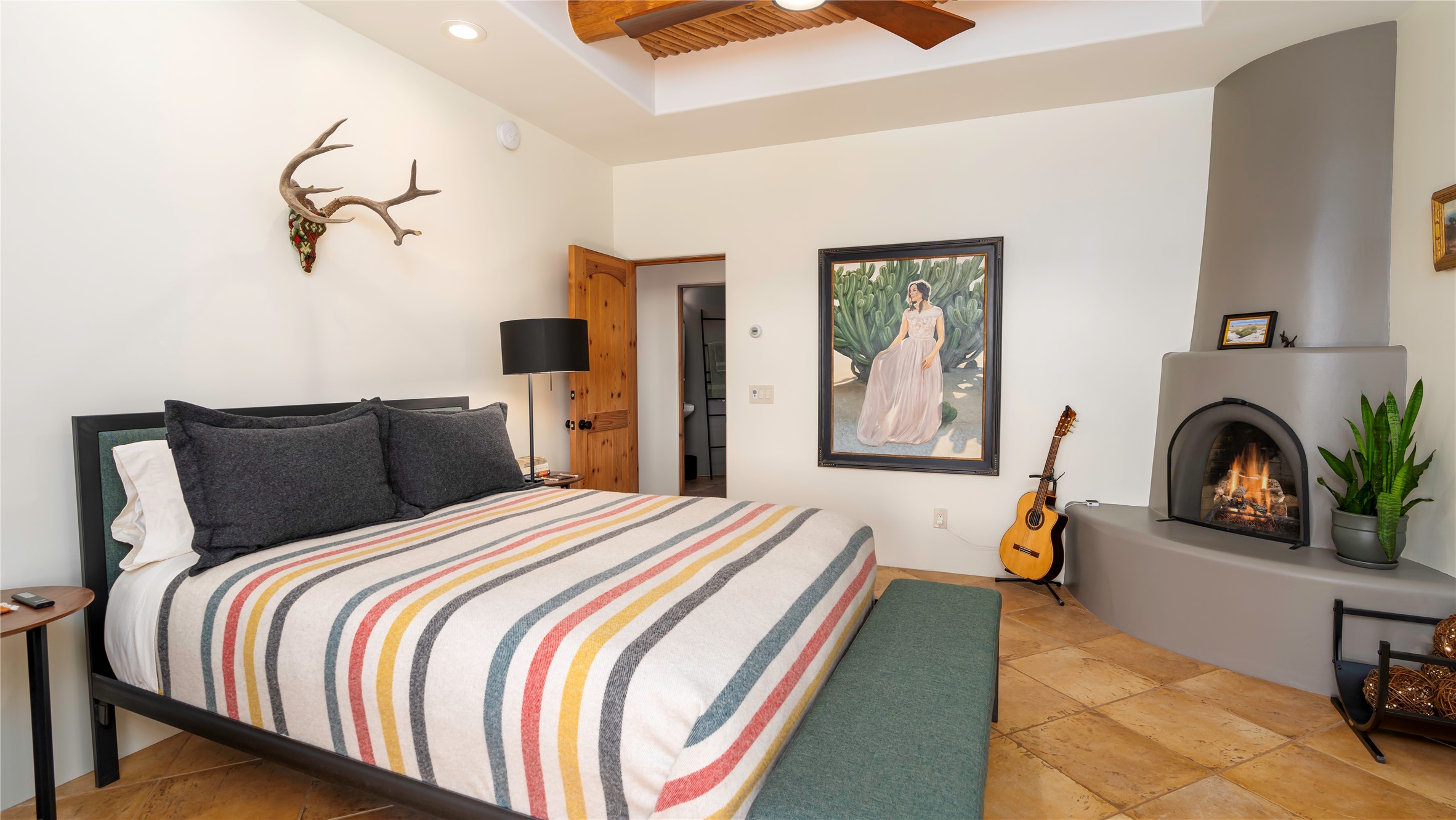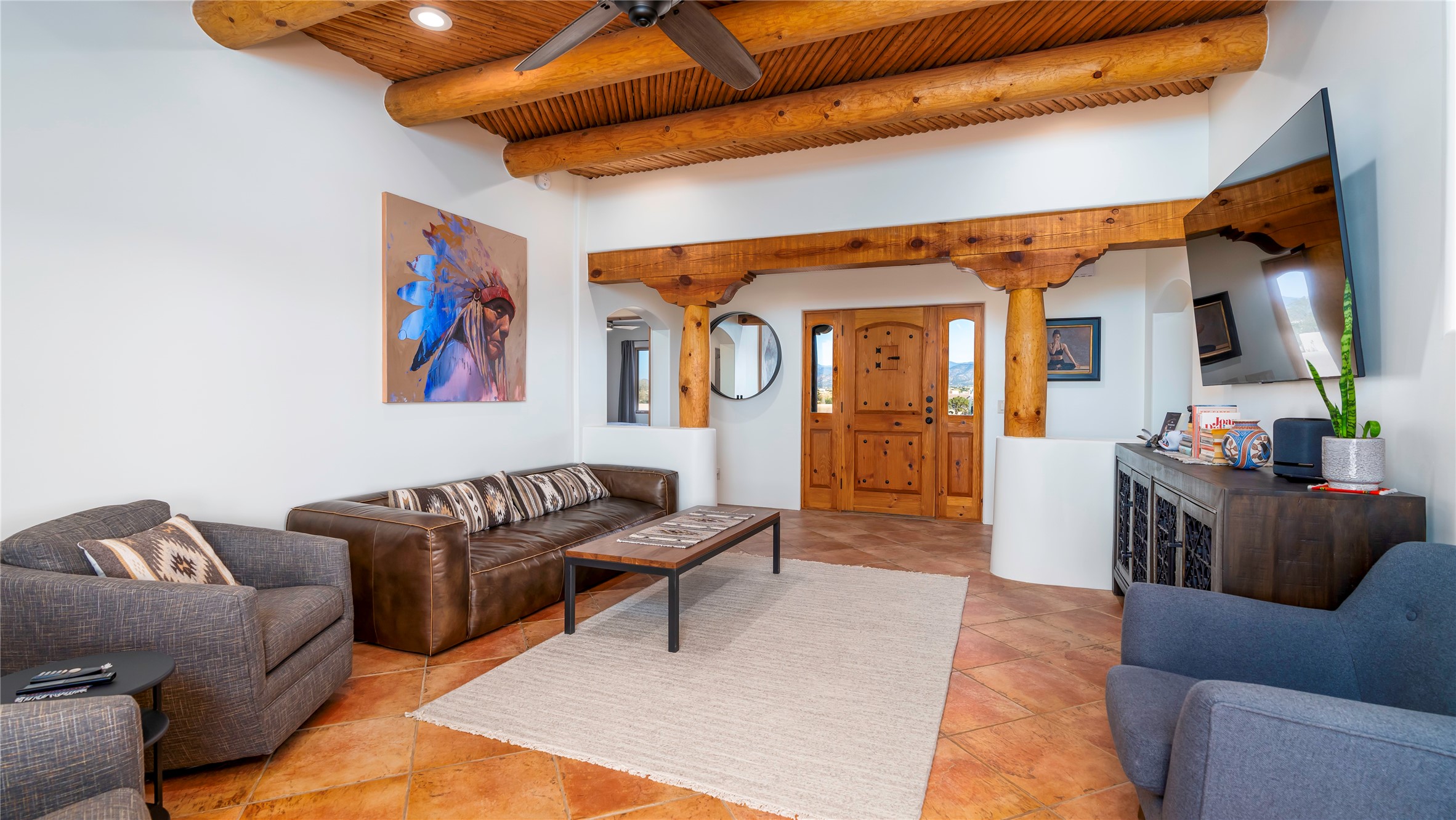 12 Quedo Road has been meticulously updated throughout with modern touches that showcase the southwestern elements of the home. The main living areas separate the primary bedroom and ensuite bathroom from the remaining two bedrooms for maximum privacy. The south side of the house features a large enclosed courtyard with two spacious portals and a hot tub, all surrounded by a privacy wall. Sunrises and sunsets are both viewable from the south courtyard, as are the open landscape and mountain views. A smaller courtyard (also with gate entrance and privacy wall) is located at the north of the house by the main entrance, and from here views of the Sangre de Cristo mountains can be enjoyed. Exterior improvements include new stucco and new paint (both completed in October, 2023). Interior improvements include new boiler and new water softener with whole-house filter and reverse osmosis filter (completed in September 2023); updated electrical features, including ceiling fans, light fixtures, and electrical outlets; new paint throughout the home; new kitchen sink; new bathroom faucets; new glass shower door; and a new Pella door with in-glass blinds in one of the secondary bedrooms. There are two wood-burning kiva fireplaces in the home, one located in the living area and a second in the primary bedroom. The house is offered fully furnished, at no additional cost to the buyer. This beautiful home is located in the quiet, dark-sky community of Eldorado. Schedule your showing today!