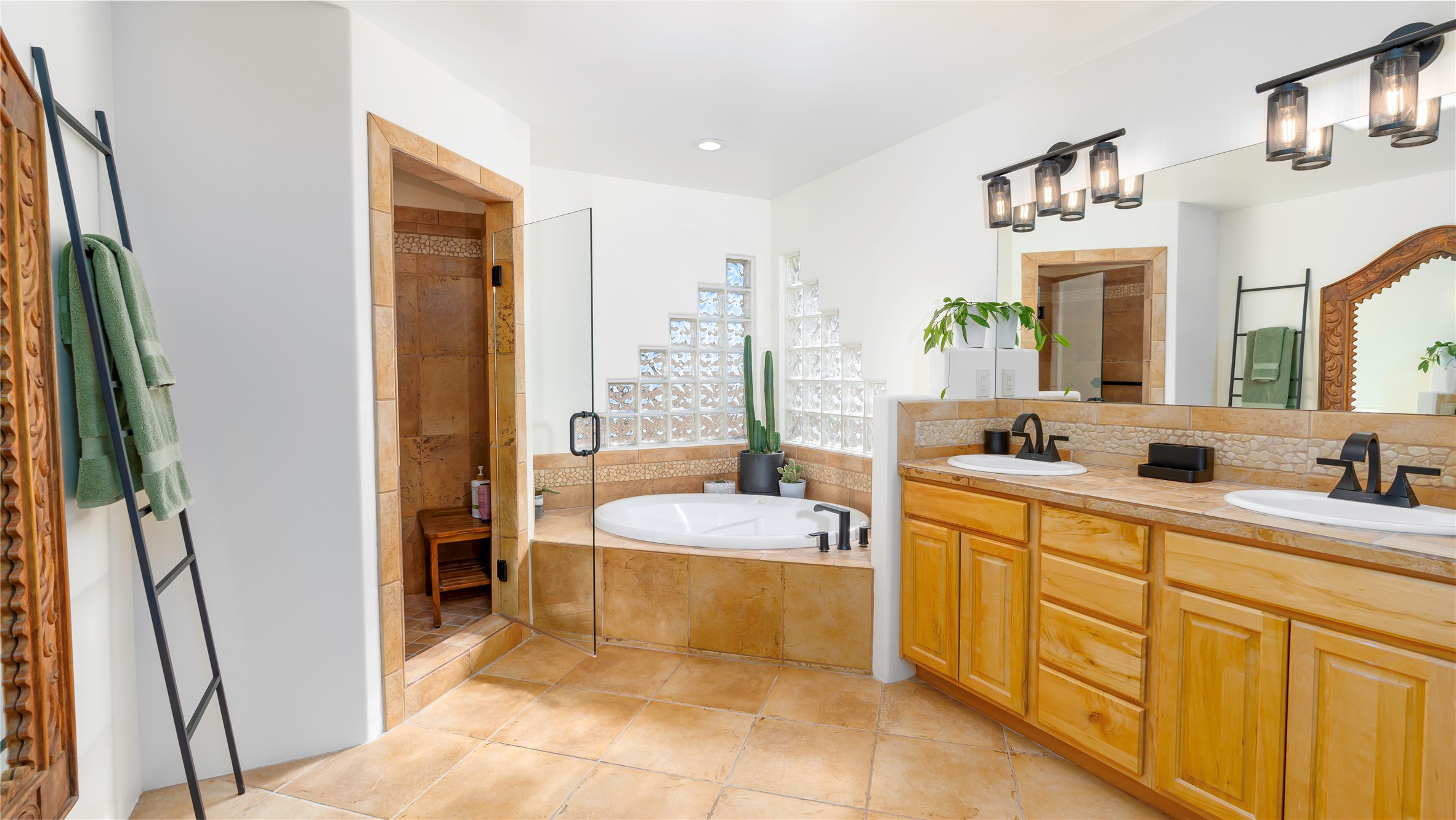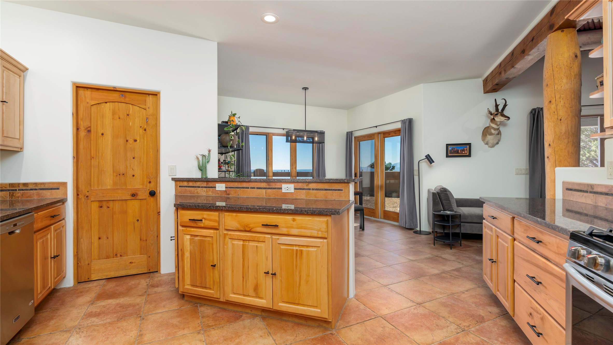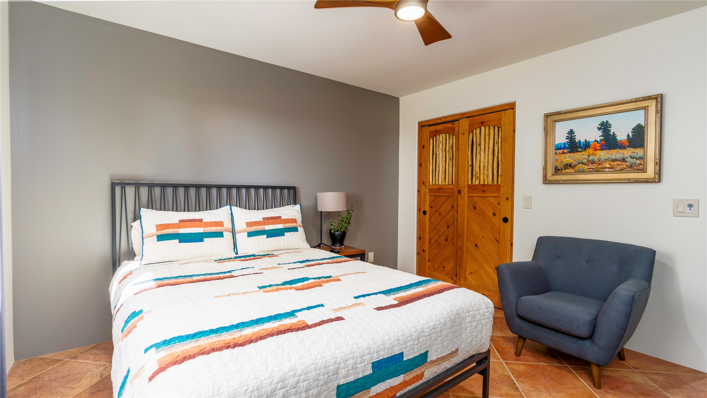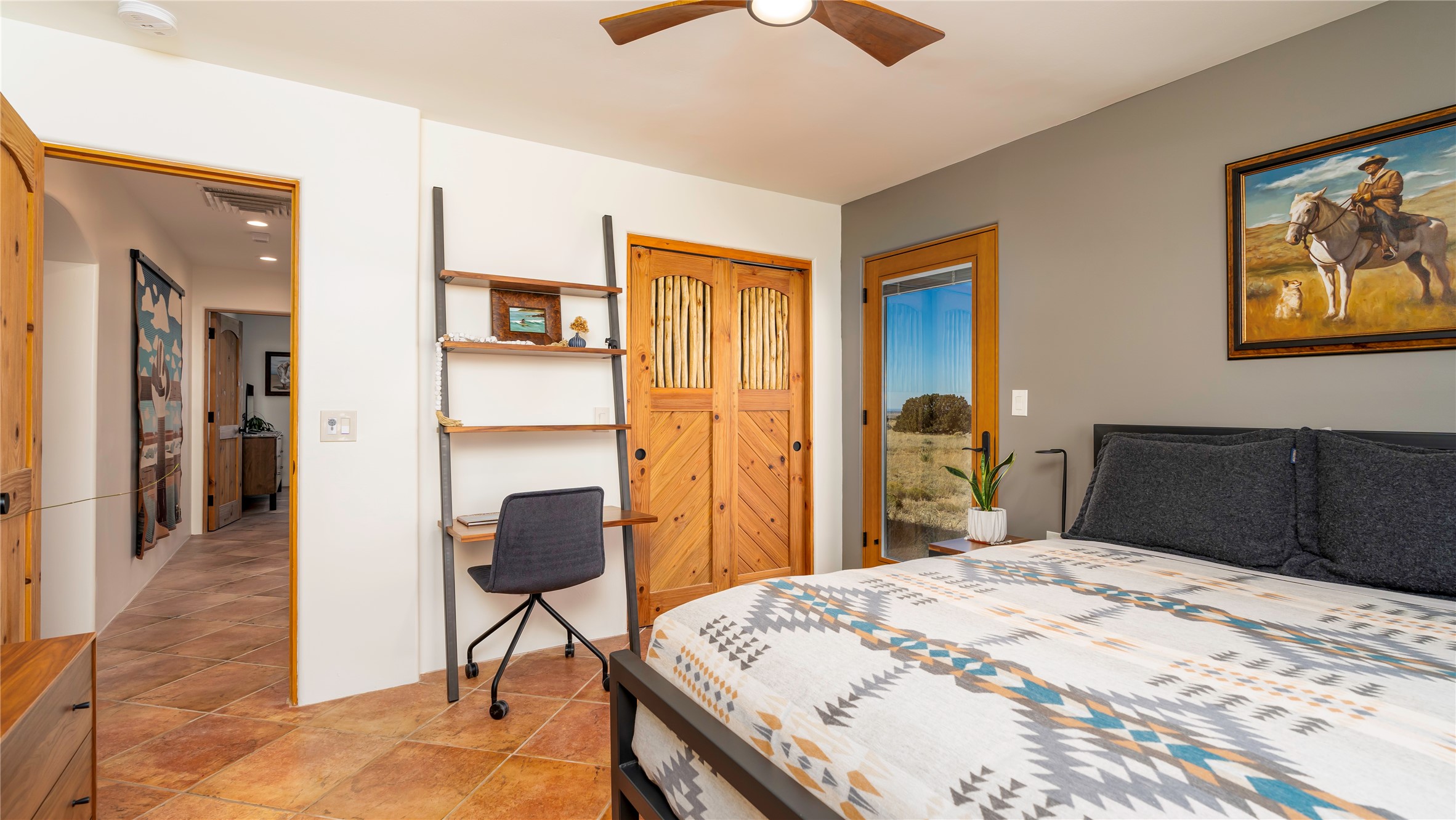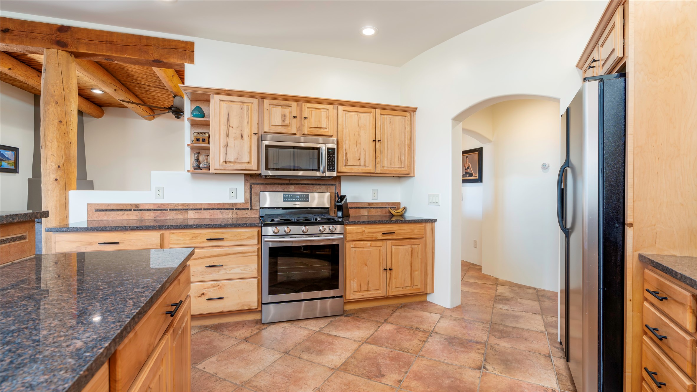 12 Quedo Road has been meticulously updated throughout with modern touches that showcase the southwestern elements of the home. The main living areas separate the primary bedroom and ensuite bathroom from the remaining two bedrooms for maximum privacy. The south side of the house features a large enclosed courtyard with two spacious portals and a hot tub, all surrounded by a privacy wall. Sunrises and sunsets are both viewable from the south courtyard, as are the open landscape and mountain views. A smaller courtyard (also with gate entrance and privacy wall) is located at the north of the house by the main entrance, and from here views of the Sangre de Cristo mountains can be enjoyed. Exterior improvements include new stucco and new paint (both completed in October, 2023). Interior improvements include new boiler and new water softener with whole-house filter and reverse osmosis filter (completed in September 2023); updated electrical features, including ceiling fans, light fixtures, and electrical outlets; new paint throughout the home; new kitchen sink; new bathroom faucets; new glass shower door; and a new Pella door with in-glass blinds in one of the secondary bedrooms. There are two wood-burning kiva fireplaces in the home, one located in the living area and a second in the primary bedroom. The house is offered fully furnished, at no additional cost to the buyer. This beautiful home is located in the quiet, dark-sky community of Eldorado. Schedule your showing today!