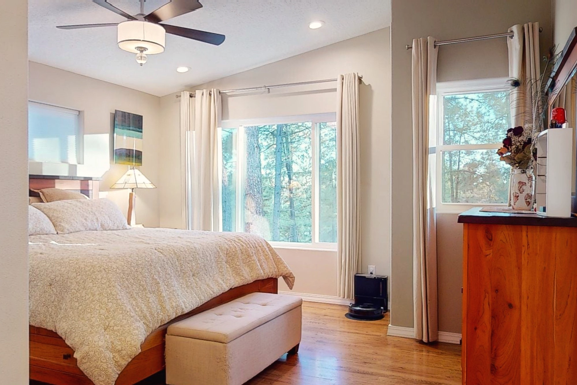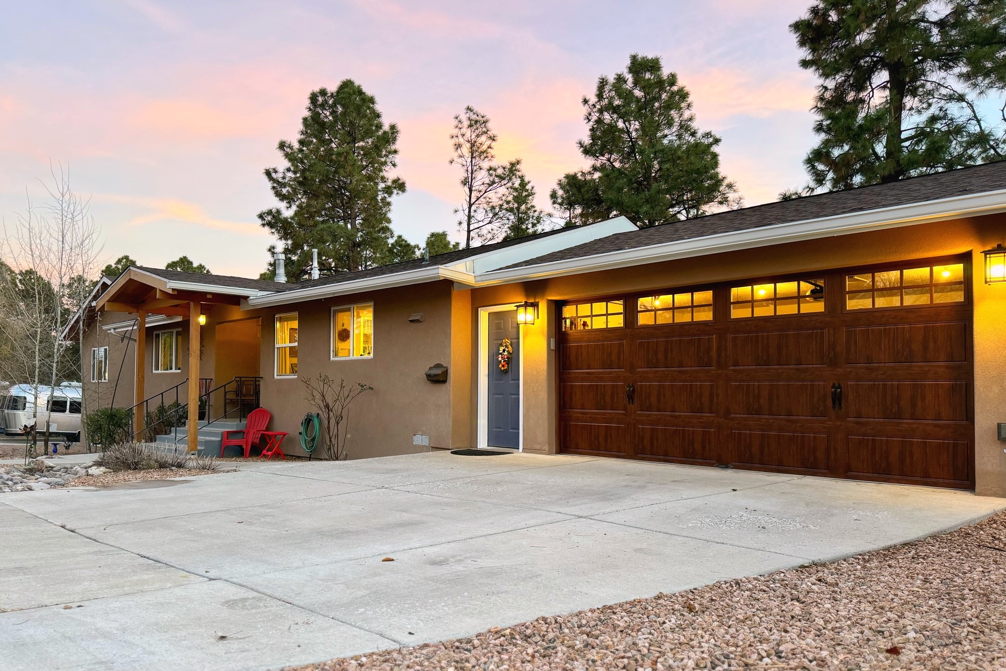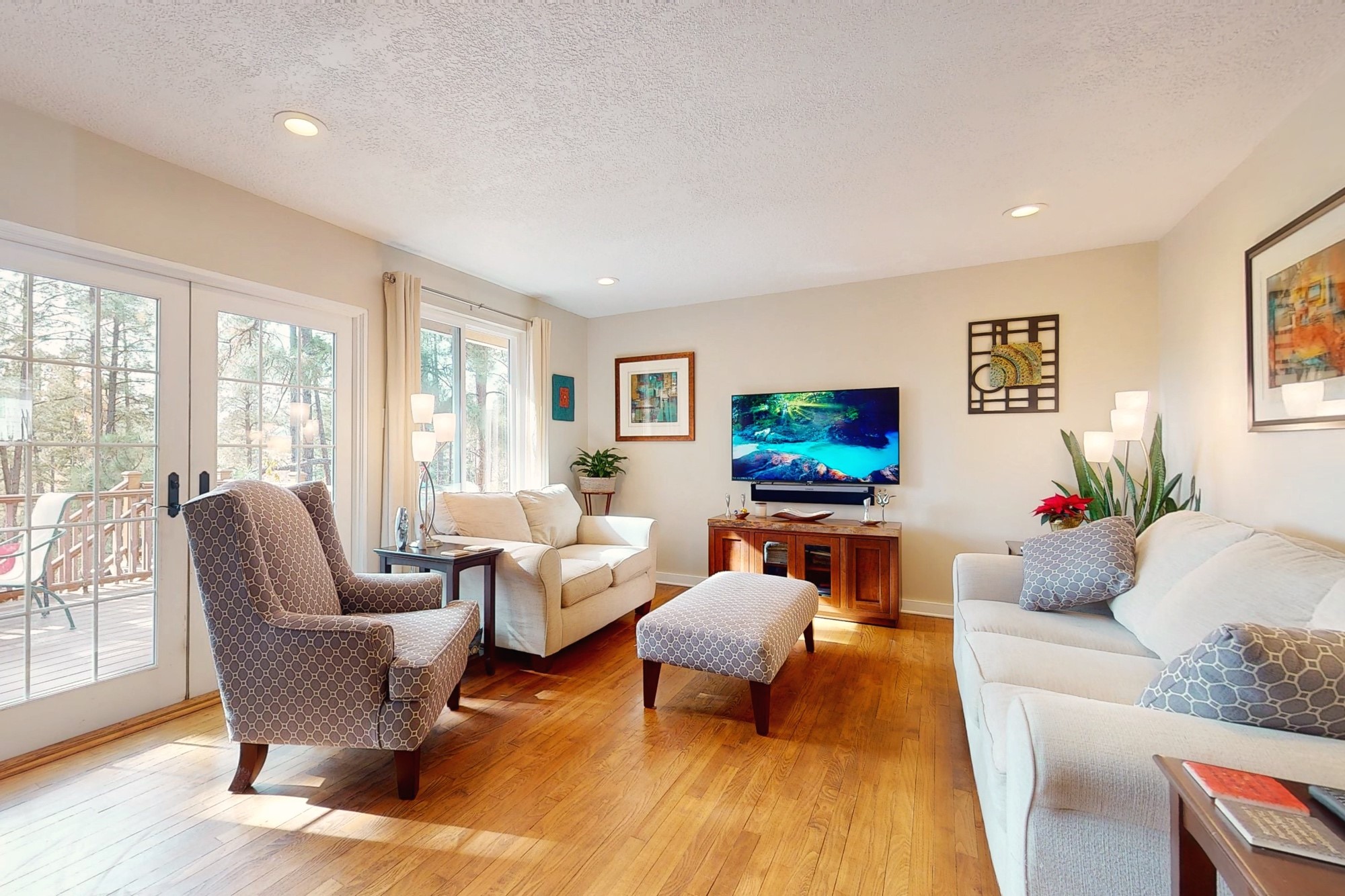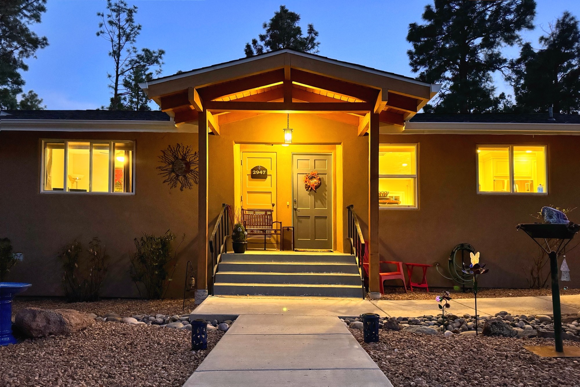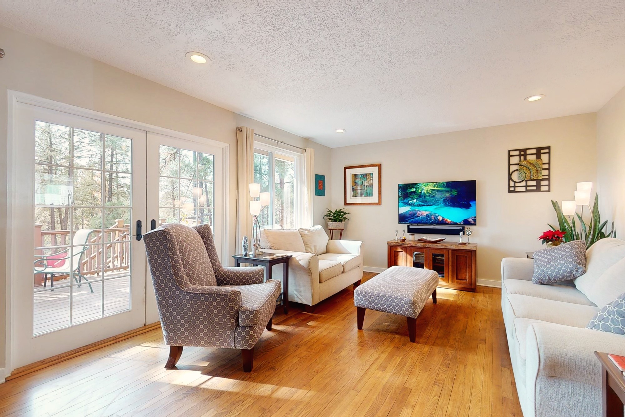Welcome to a true masterpiece of a home, where every detail has been thoughtfully attended to, offering a lifestyle of comfort and luxury. This meticulously maintained residence boasts an exemplary flow, providing a seamless blend of functionality and style. Situated on a sprawling over half-acre lot, this home is a nature lover's paradise, backing to a serene forest and the picturesque Los Alamos Golf Course. The strategically placed windows flood the interiors with an abundance of natural light, creating a warm and inviting atmosphere. From the deck off of the main living area, enjoy captivating views of the forest, offering a front-row seat to observe various forms of wildlife in their natural habitat. The first floor boast the main living area, kitchen, three bedrooms, bonus room and laundry room. The versatile bonus space presents the perfect opportunity for an office or an extra bedroom, catering to your individual needs. The kitchen is a chef's delight, featuring updated appliances, soft-close drawers and cabinets, and an eat-in breakfast nook - the perfect setting for both casual and formal dining. The spacious primary bedroom offers tall ceilings, walk in closet, and phenomenal natural light with ample room for both relaxation and rejuvenation. Off the primary is an oversized ensuite, providing a touch of luxury and convenience. Downstairs you'll find a large additional living space, one bedroom, bathroom and more storage! The fully landscaped front yard exudes curb appeal, while the clean and spacious back area offers endless possibilities for customization. The attached garage accommodates two cars and storage and additional space for RV. Don't miss the chance to make this meticulously crafted residence your own, where every detail has been perfected to create a haven of sophistication and tranquility. Recent updates include roof, windows, stucco, water heater, and furnace, ensuring modern comfort and efficiency.