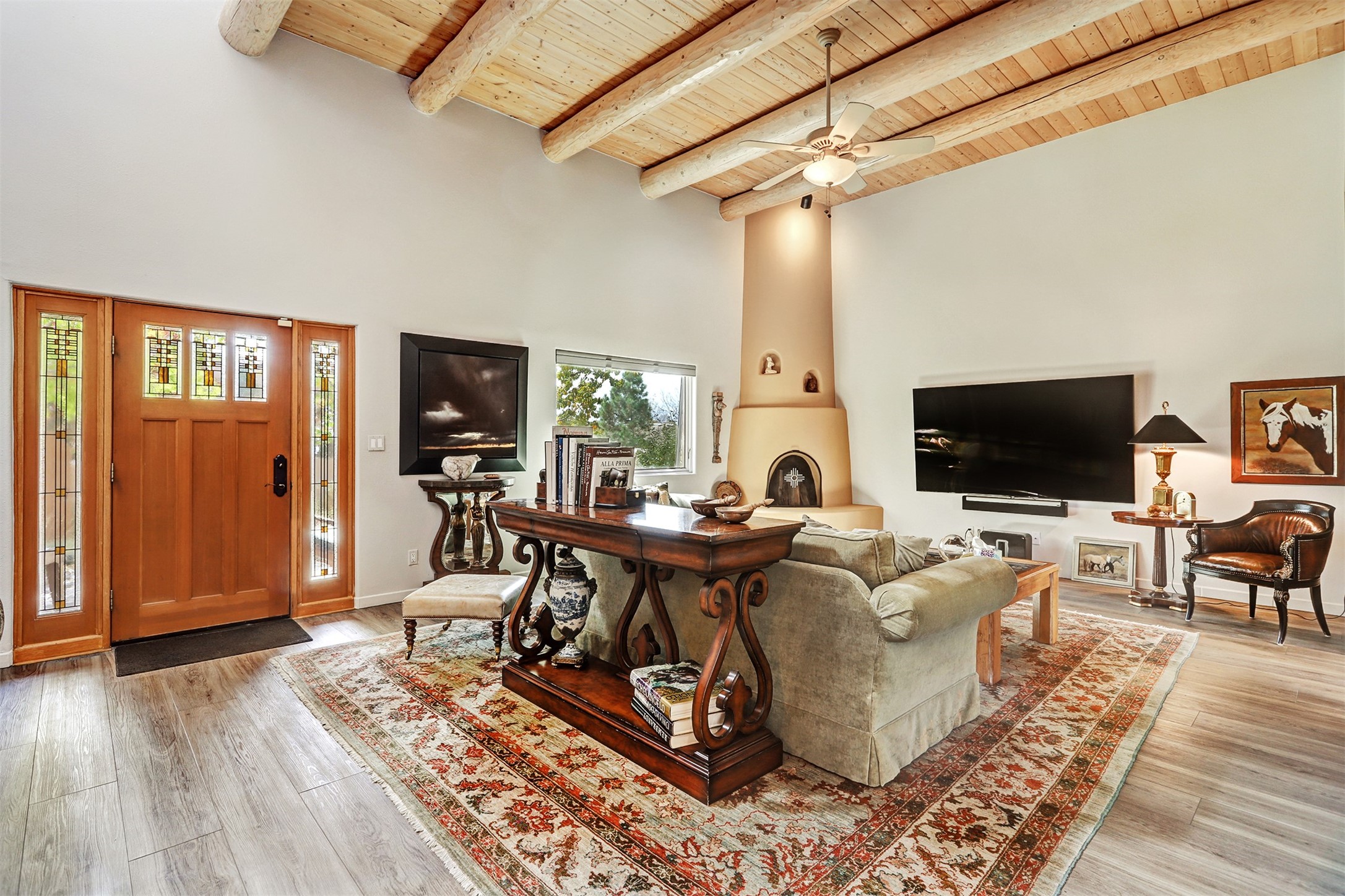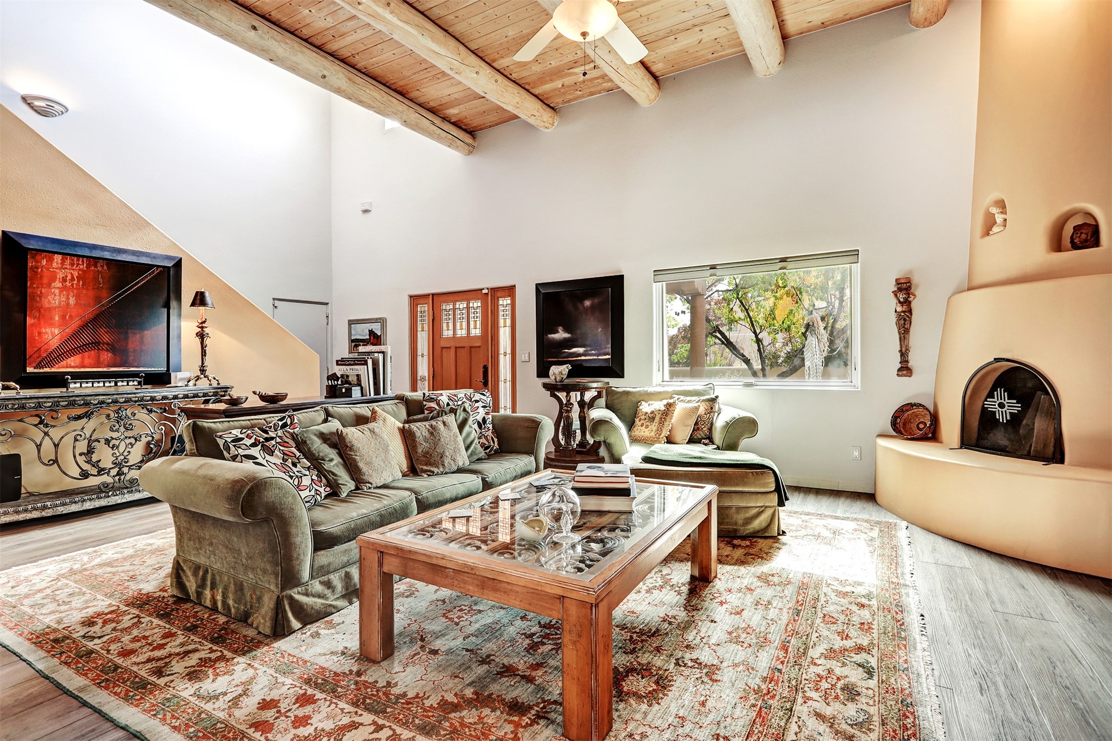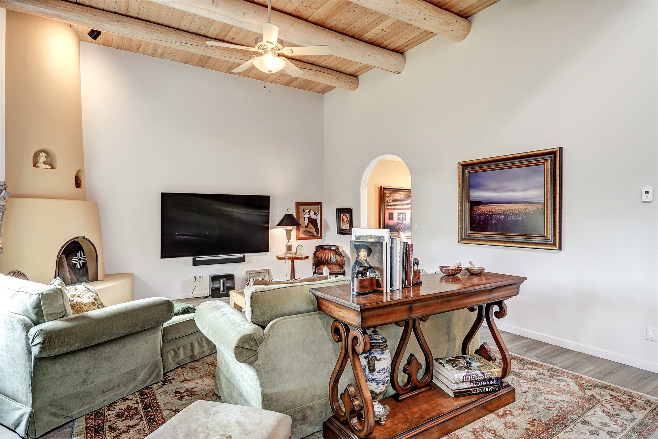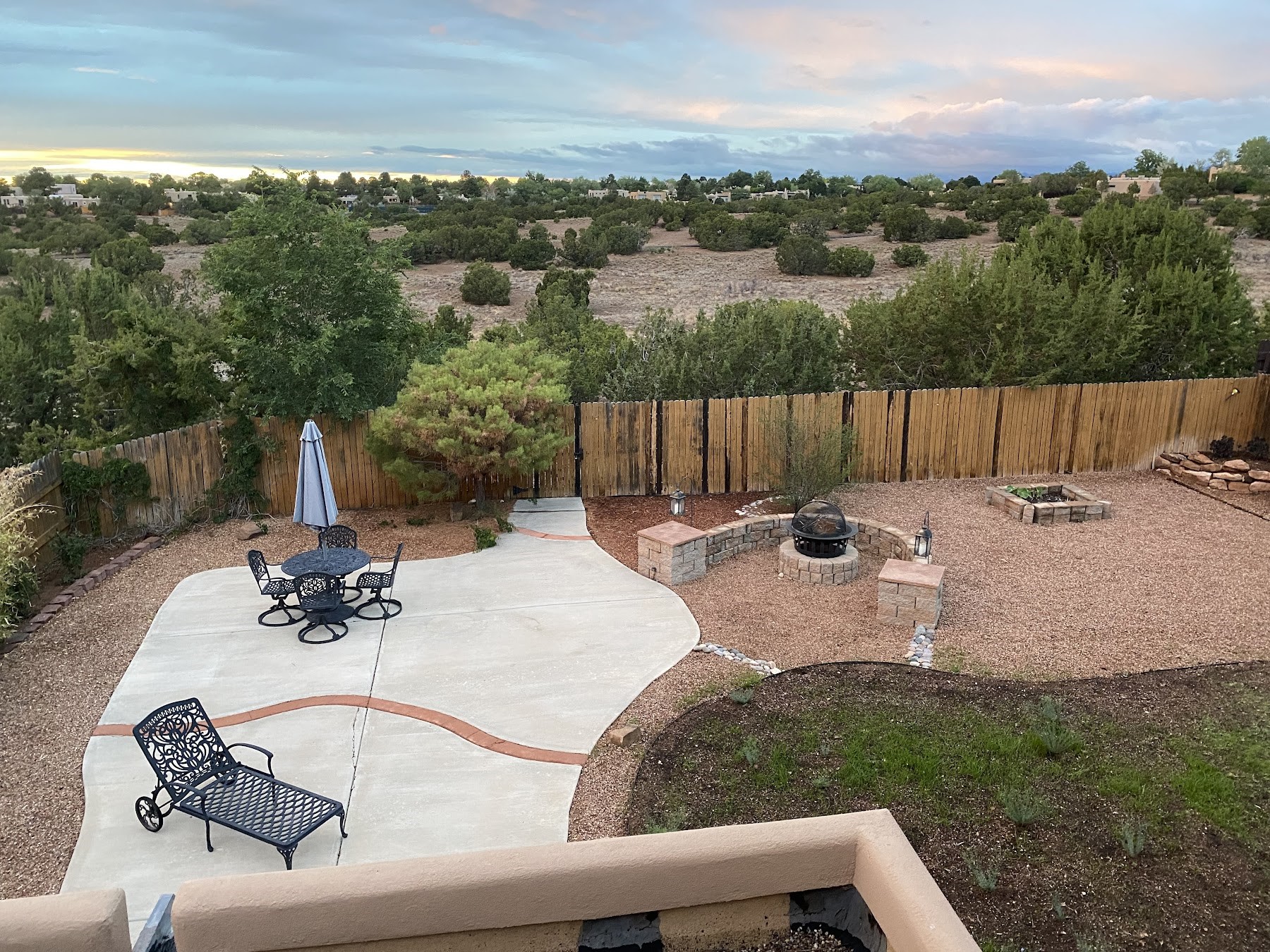 Absolutely the finest home in Pueblos del Sol with over $200k of upgrades and improvements in the last 6 years. A lush front enclosed courtyard welcomes you home. As you walk through the front door, an impeccable home presents itself that is impossible to identify from new. Current owner has painstakingly remodeled every room in the house, including a stunning primary bath featuring an impressive view toward the Sangres. Designer flooring throughout, hot water is newer on-demand unit, Carrera marble in primary bath, custom cabinets in garage, garage also has a mini-split for cooling and heat. Full list of upgrades available. Large, expansive back yard teeming with garden boxes and flowers, a true respite from the city. Large yard adjoins open space and miles upon miles of views. Easy commute to Albuquerque, 12 minutes to the Santa Fe Plaza.