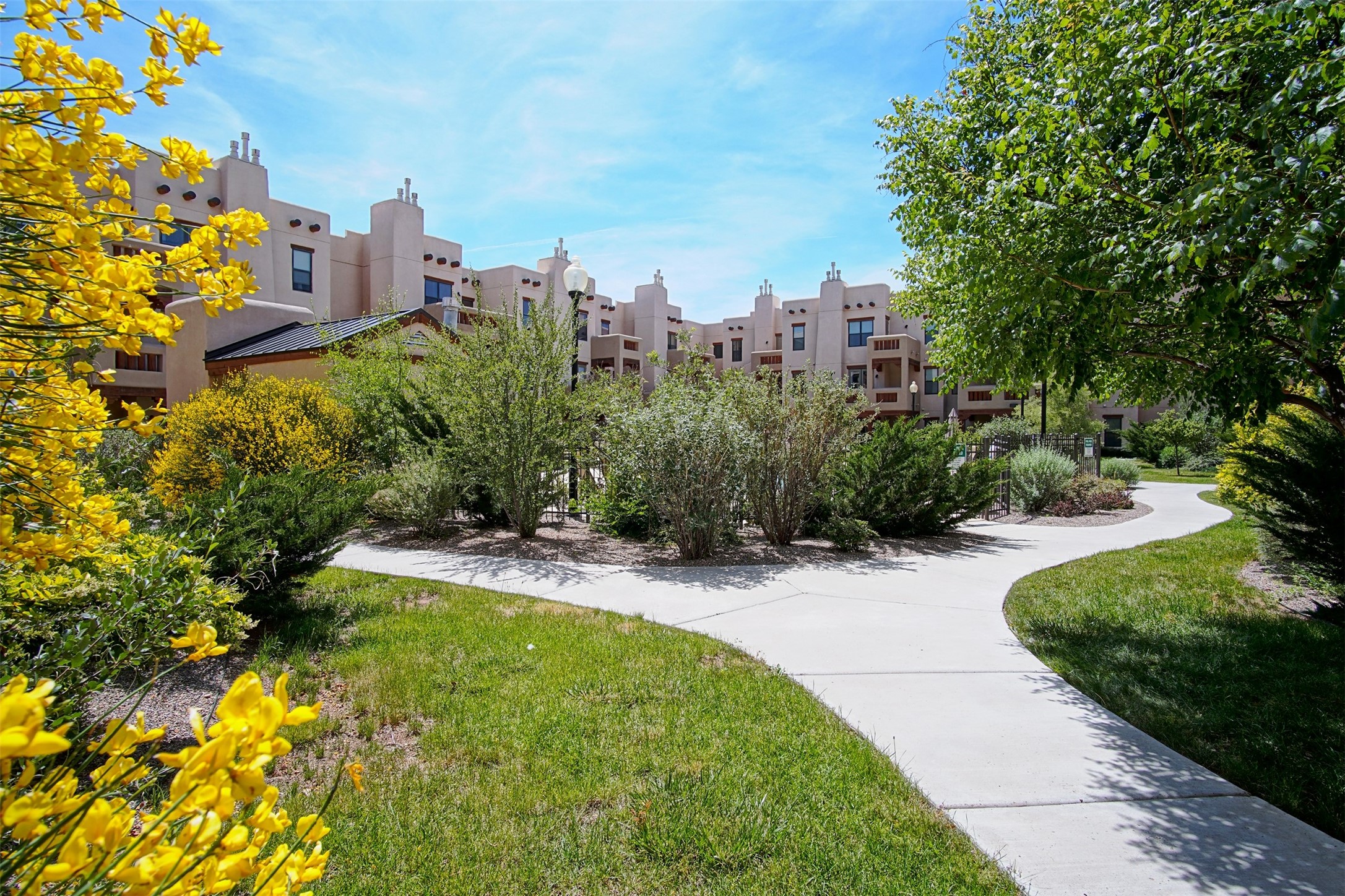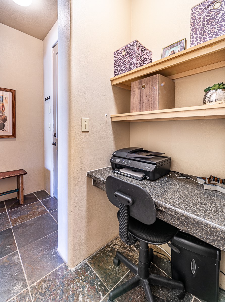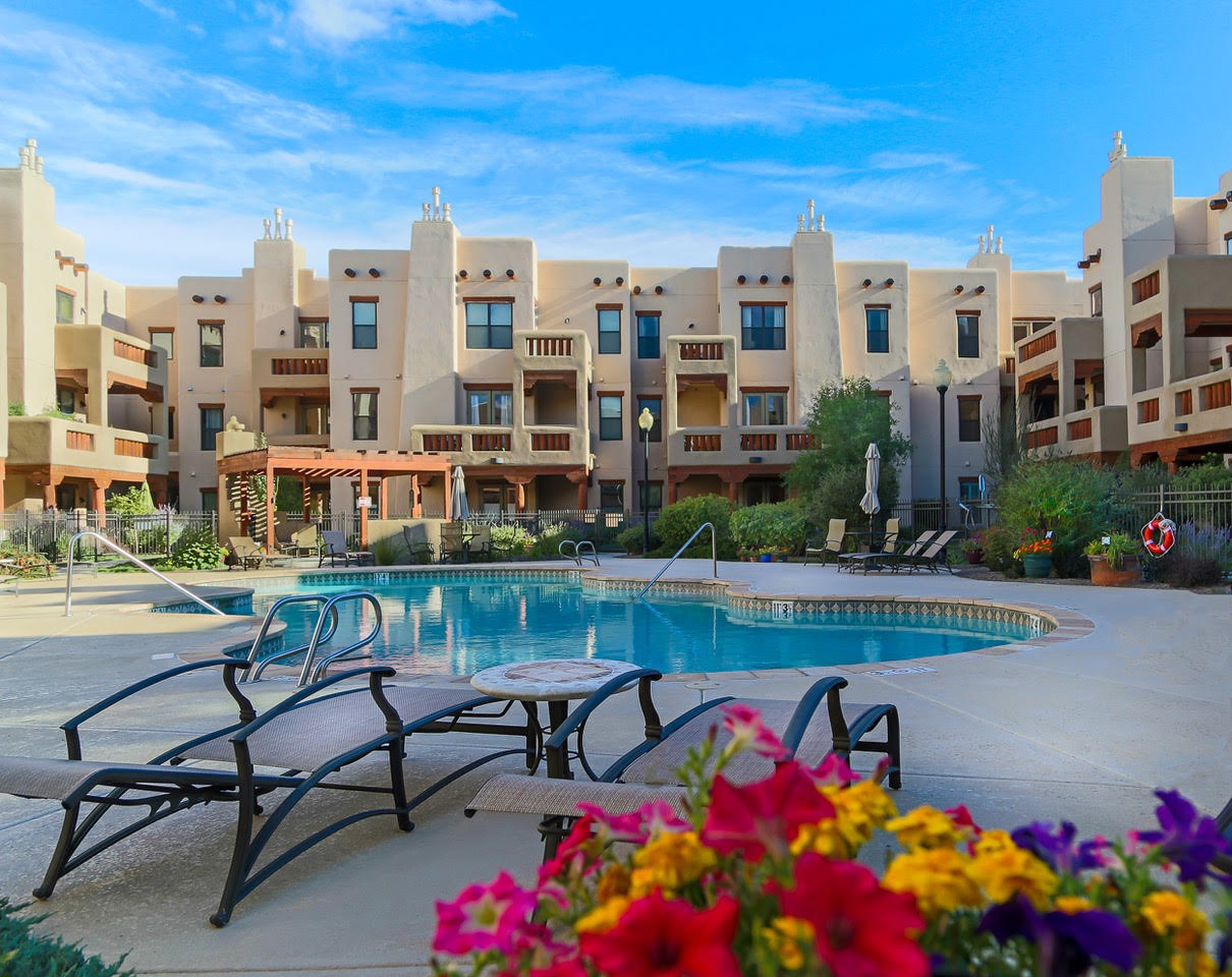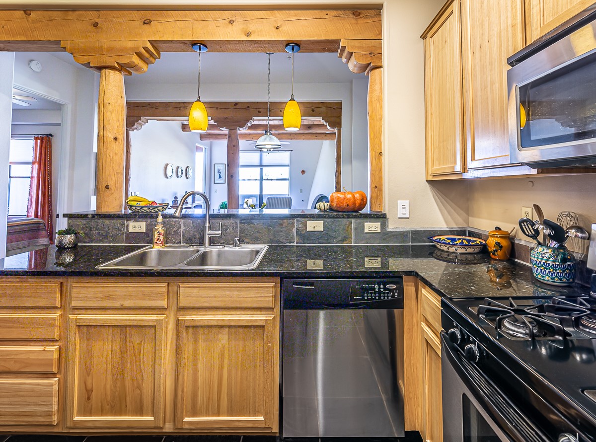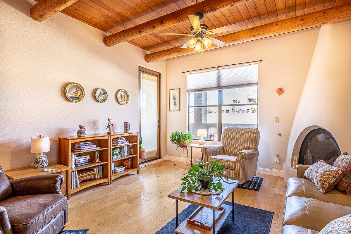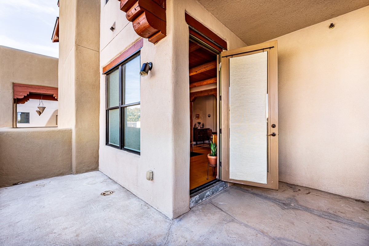 1 bedroom luxury condo PLUS storage unit PLUS garage - THIS is the condo package you have been waiting for at the Alameda! At 874 sf, this is the largest 1 BR floorplan, which includes additional sq. footage, plus a convenient half-bath and office nook. Loaded with luxury, this Pueblo style unit exudes serenity, charm, and class, with magnificent vigas and corbels, kiva FP, granite countertops, slate and birch-toned flooring, with newer carpeting in the bedroom, leading to a granite/slate bath with walk-in-closet. The stylish open kitchen includes a newer stainless steel refrigerator, disposal, dishwasher, gas range, microwave, and a washer dryer duo in a separate laundry closet. A spacious 220 sf patio-portal offers outdoor enjoyment, and your storage and parking needs are covered with the indoor storage unit, 1-car garage, and 2 additional parking spaces. In addition, this unit enjoys a prime, E-Z access location within the building, proximate to elevator and parking. As for the Alameda, this landmark complex has set the standard for luxury condo living since 2008 with a magnificent pool court, fitness center, beautiful reception rooms, library, gated parking, full time onsite management, and 24 hr controlled access for your peace of mind. Located 12 mins from the plaza, and proximate to shopping, restaurants, culture, and major transportation, this location makes Santa Fe living a breeze. Come see this unit before it's G-O-N-E!