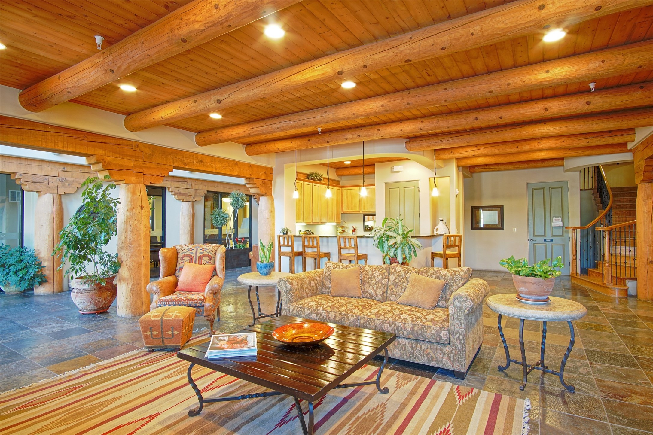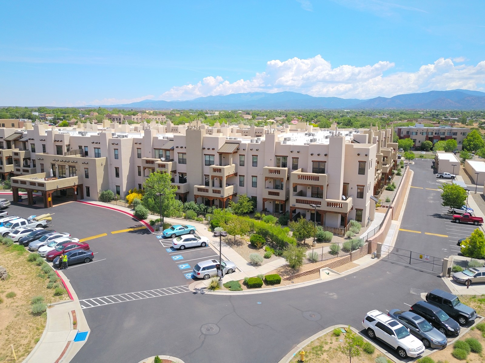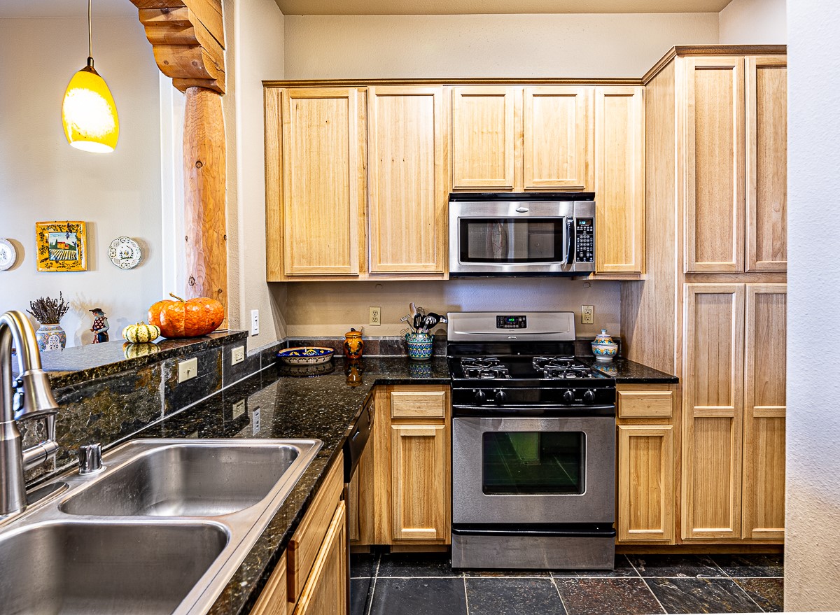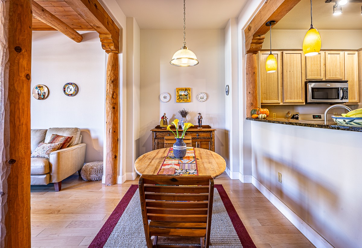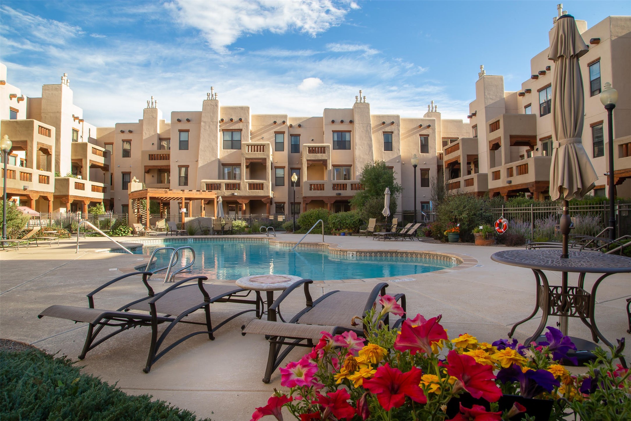 1 bedroom luxury condo PLUS storage unit PLUS garage - THIS is the condo package you have been waiting for at the Alameda! At 874 sf, this is the largest 1 BR floorplan, which includes additional sq. footage, plus a convenient half-bath and office nook. Loaded with luxury, this Pueblo style unit exudes serenity, charm, and class, with magnificent vigas and corbels, kiva FP, granite countertops, slate and birch-toned flooring, with newer carpeting in the bedroom, leading to a granite/slate bath with walk-in-closet. The stylish open kitchen includes a newer stainless steel refrigerator, disposal, dishwasher, gas range, microwave, and a washer dryer duo in a separate laundry closet. A spacious 220 sf patio-portal offers outdoor enjoyment, and your storage and parking needs are covered with the indoor storage unit, 1-car garage, and 2 additional parking spaces. In addition, this unit enjoys a prime, E-Z access location within the building, proximate to elevator and parking. As for the Alameda, this landmark complex has set the standard for luxury condo living since 2008 with a magnificent pool court, fitness center, beautiful reception rooms, library, gated parking, full time onsite management, and 24 hr controlled access for your peace of mind. Located 12 mins from the plaza, and proximate to shopping, restaurants, culture, and major transportation, this location makes Santa Fe living a breeze. Come see this unit before it's G-O-N-E!