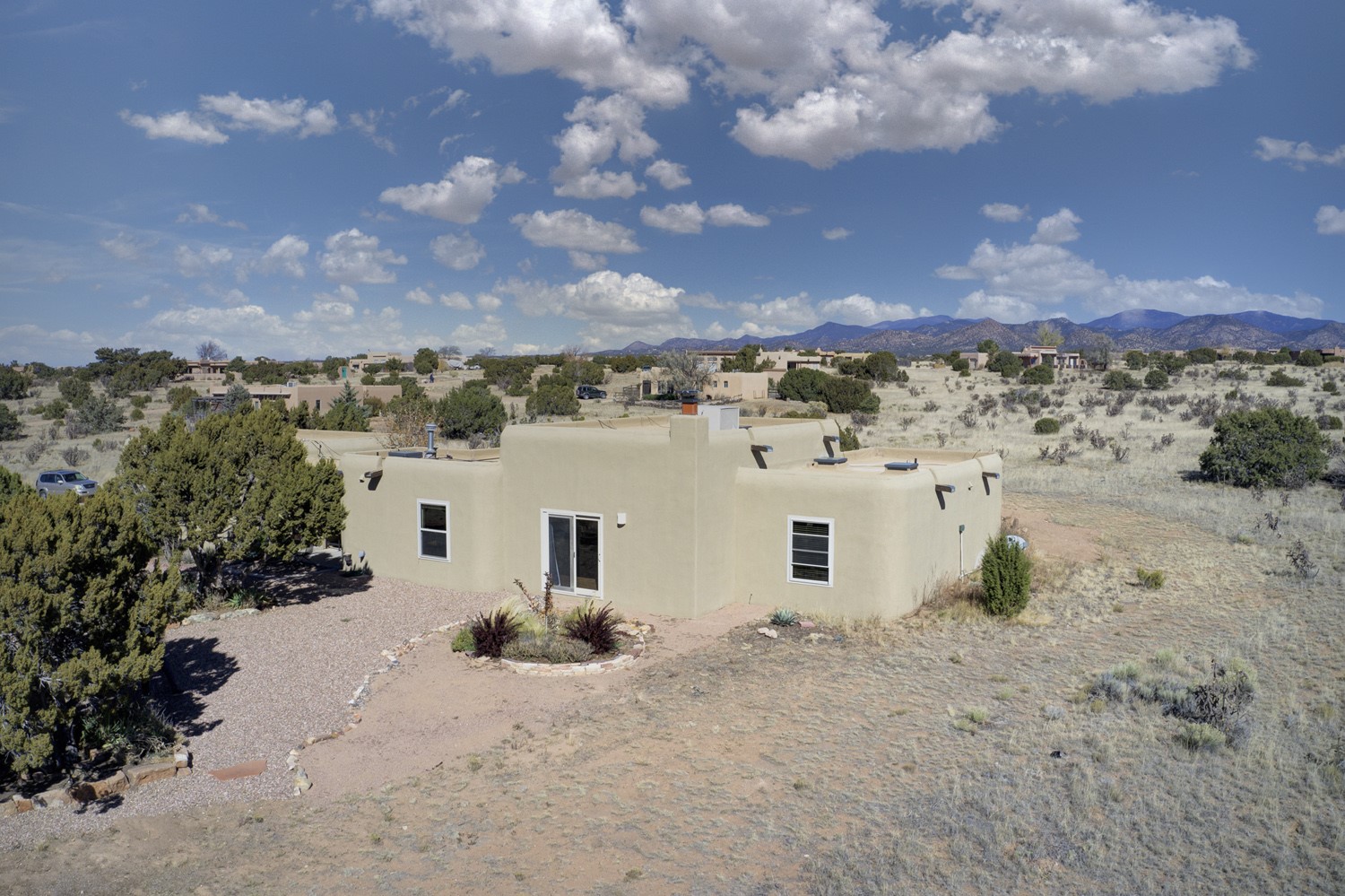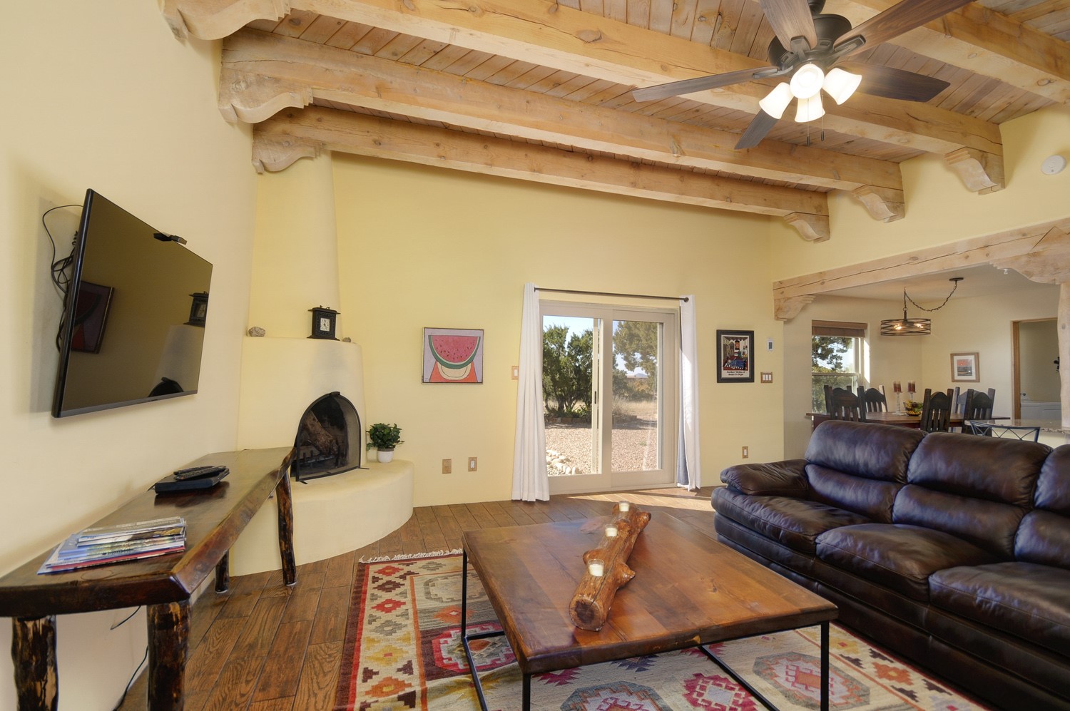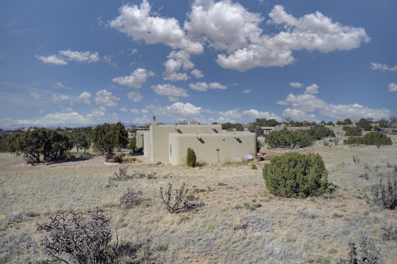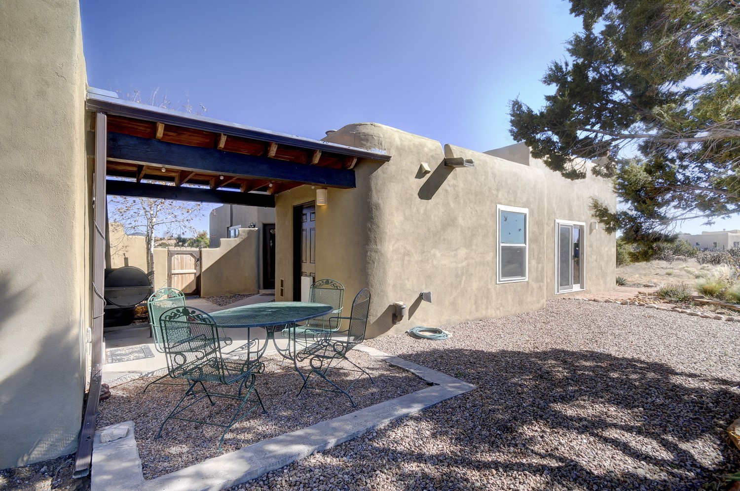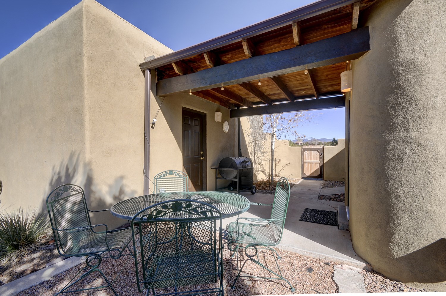 Immerse yourself in the enchanting beauty of Santa Fe with this 3-bedroom, 2-bathroom home. Contemporary Pueblo style boasts many architectural details! Tongue and Groove Viga Beam Ceilings, Hand-Carved Corbels and Saltillo tile floors capture the essence of Santa Fe living! Spacious Great Room offers a Plaster Kiva Fireplace/New Decorator Ceiling Fan! Fabulously Open Kitchen with painted white cabinetry/stainless steel gas range! Abundant Granite Counters with designer backsplash are ideal for the Chef and Ideal for Entertaining! The U-shaped kitchen has a huge breakfast bar large enough for 6-8 People! The Dining area and Kitchen flow into the Open Great Room! Split Bedroom design offers privacy! Inviting Owner's Suite with Patio access/Tile Flooring, and Spa Bath! The suite has a new Mini-Split! Separate jet tub/Tile shower with Pebble Stone Floor and Dual Sinks! Mini split in BR. Huge walk-in closet! Guest Bedrooms share a full bath with designer SW Tile! The detached oversized two-car finished garage offers space for your vehicles, toys, and a workshop area! A perfect combination of trees and meadows throughout the property. Over 100k in Recent Upgrades! The owner rebuilt the drive and cleared Cactus at significant expense! 20k+ Beautiful Landscaping on auto drip system. ur + in Extensive New Roof in 2020! Recent Windows! Upgraded Lighting! Make this property your sanctuary In New Mexico and Create Cherished Memories in one of the most captivating cities in the Southwest, Santa Fe! Move-in Ready, Ideal for 2nd home! The Home is being sold FULLY FURNISHED! Includes equipment and tools in the garage! El Dorado was Rated The Best Place to live in Santa Fe by Niche Magazine! HOA $570. year Covers Pool/Parks/Community Center and 4000 acre Nature Preserve! Endless Hiking Trails! Please go to the Community Website for more info: https://eldoradosf.org