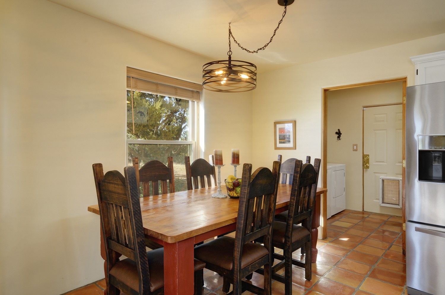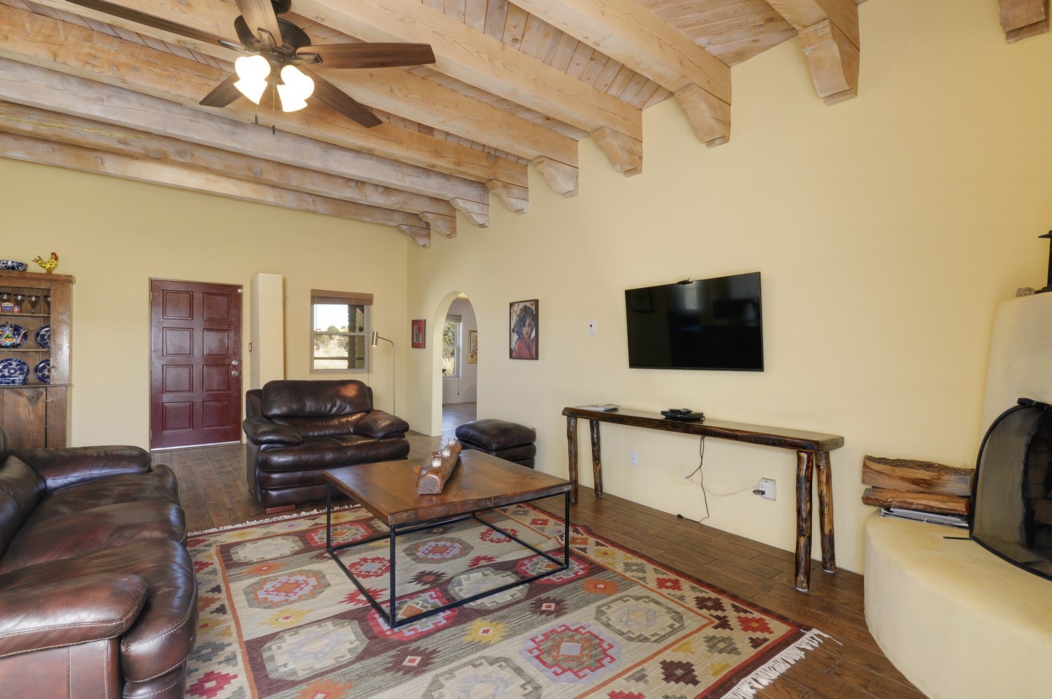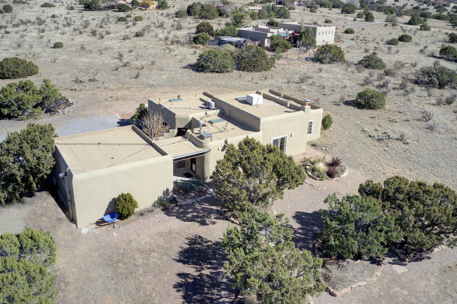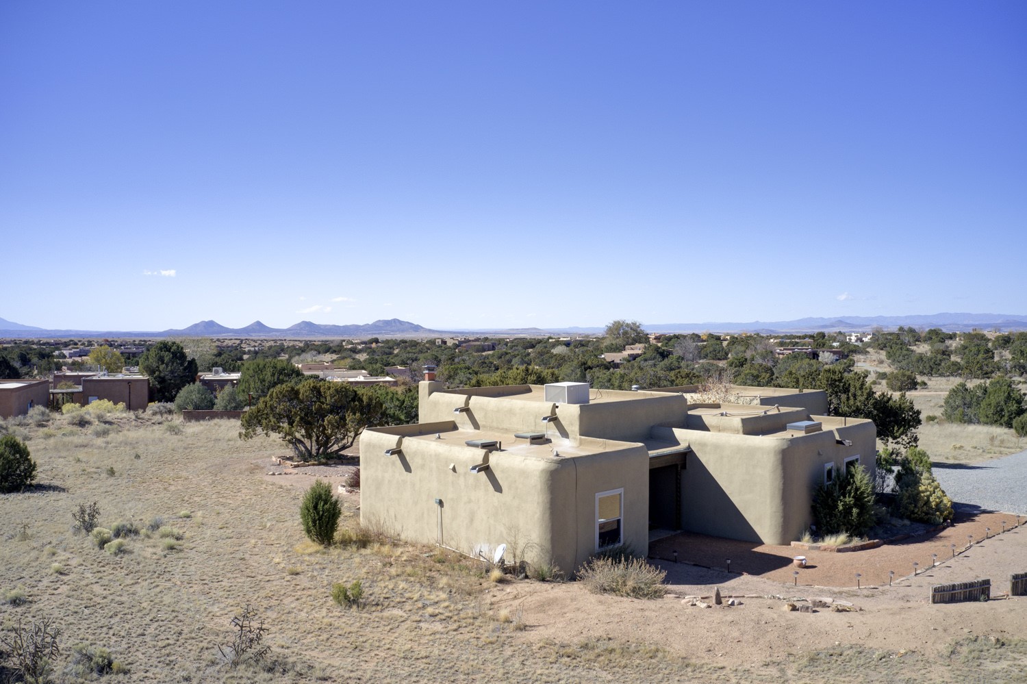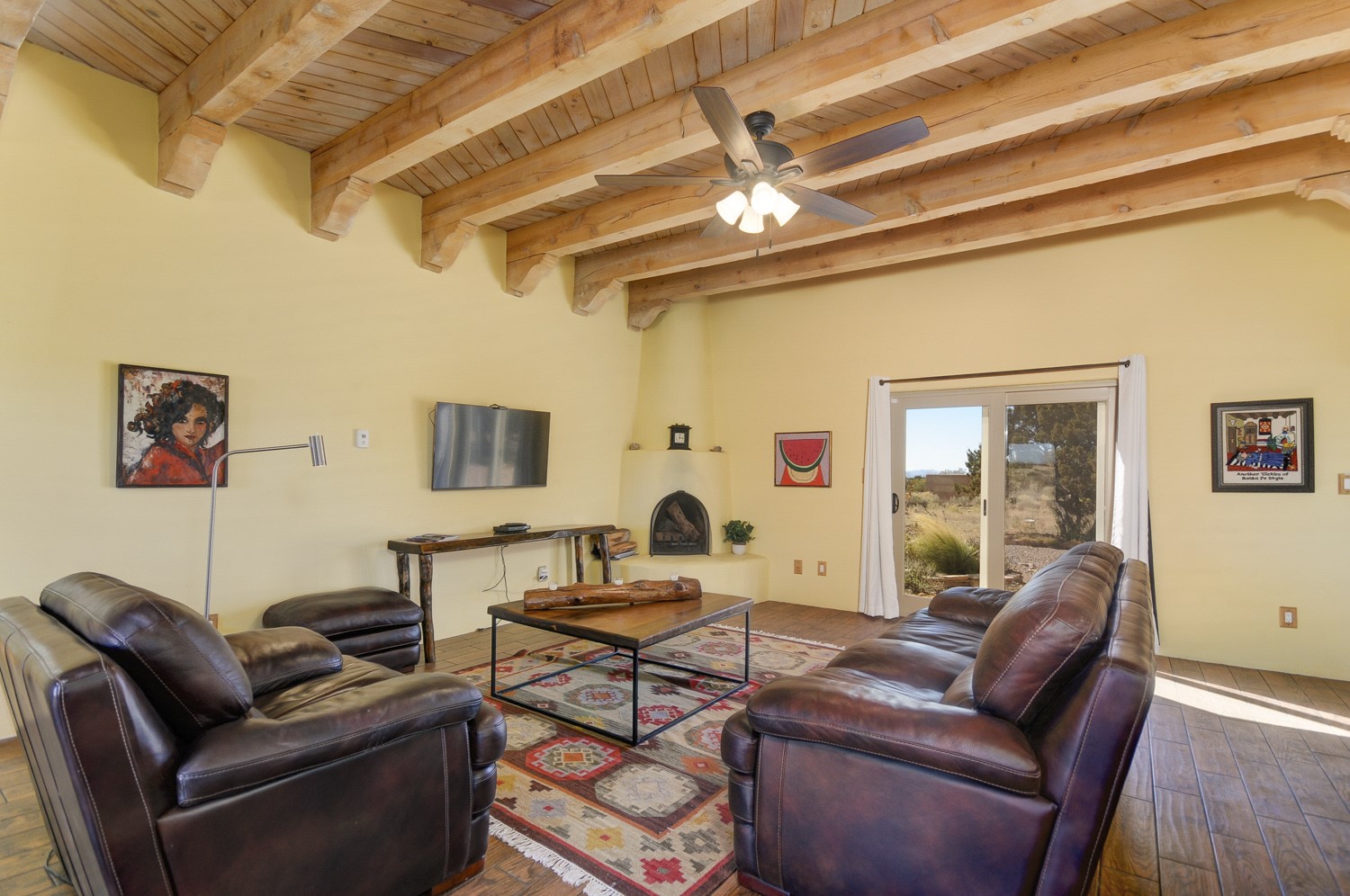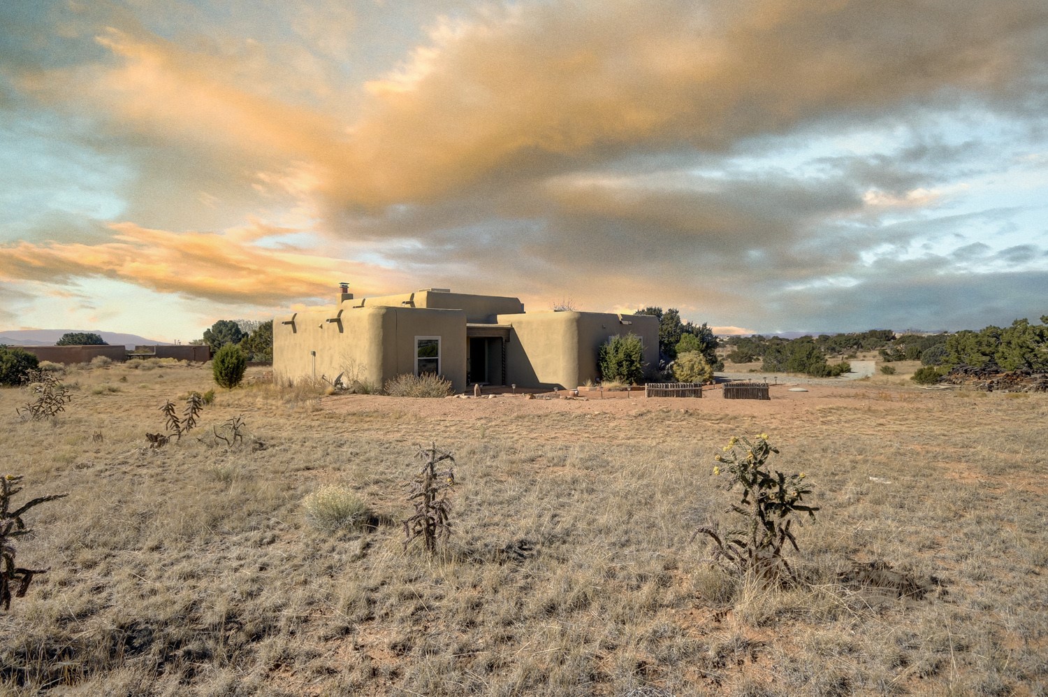 Immerse yourself in the enchanting beauty of Santa Fe with this 3-bedroom, 2-bathroom home. Contemporary Pueblo style boasts many architectural details! Tongue and Groove Viga Beam Ceilings, Hand-Carved Corbels and Saltillo tile floors capture the essence of Santa Fe living! Spacious Great Room offers a Plaster Kiva Fireplace/New Decorator Ceiling Fan! Fabulously Open Kitchen with painted white cabinetry/stainless steel gas range! Abundant Granite Counters with designer backsplash are ideal for the Chef and Ideal for Entertaining! The U-shaped kitchen has a huge breakfast bar large enough for 6-8 People! The Dining area and Kitchen flow into the Open Great Room! Split Bedroom design offers privacy! Inviting Owner's Suite with Patio access/Tile Flooring, and Spa Bath! The suite has a new Mini-Split! Separate jet tub/Tile shower with Pebble Stone Floor and Dual Sinks! Mini split in BR. Huge walk-in closet! Guest Bedrooms share a full bath with designer SW Tile! The detached oversized two-car finished garage offers space for your vehicles, toys, and a workshop area! A perfect combination of trees and meadows throughout the property. Over 100k in Recent Upgrades! The owner rebuilt the drive and cleared Cactus at significant expense! 20k+ Beautiful Landscaping on auto drip system. ur + in Extensive New Roof in 2020! Recent Windows! Upgraded Lighting! Make this property your sanctuary In New Mexico and Create Cherished Memories in one of the most captivating cities in the Southwest, Santa Fe! Move-in Ready, Ideal for 2nd home! The Home is being sold FULLY FURNISHED! Includes equipment and tools in the garage! El Dorado was Rated The Best Place to live in Santa Fe by Niche Magazine! HOA $570. year Covers Pool/Parks/Community Center and 4000 acre Nature Preserve! Endless Hiking Trails! Please go to the Community Website for more info: https://eldoradosf.org