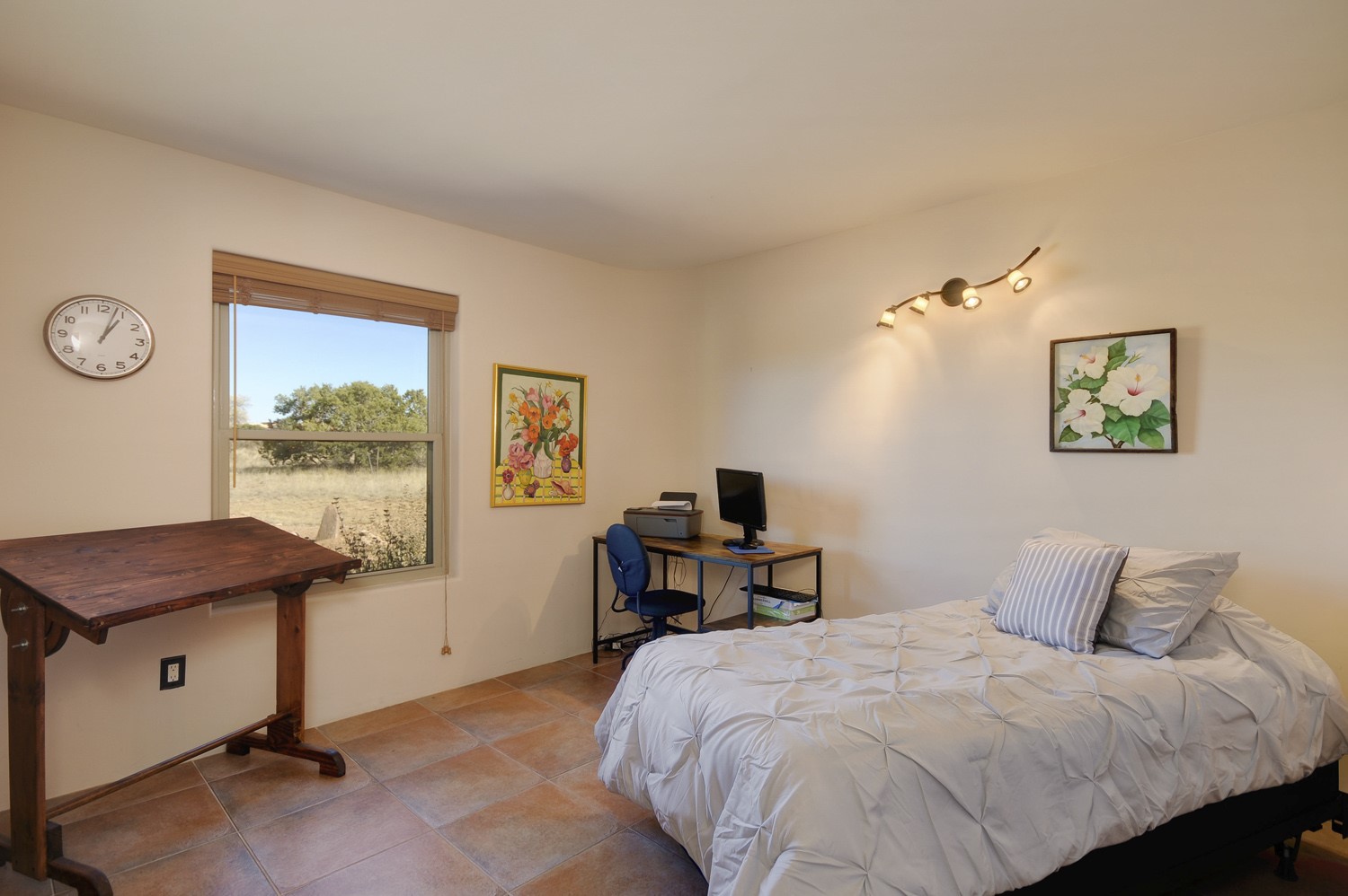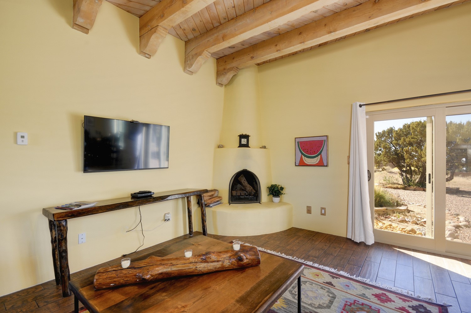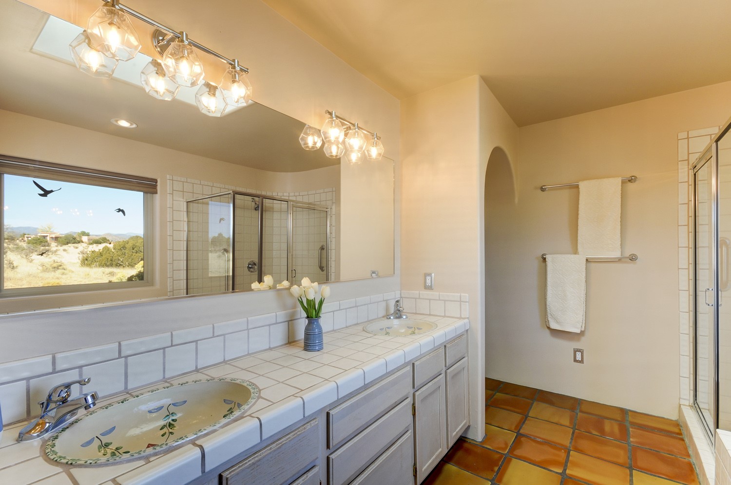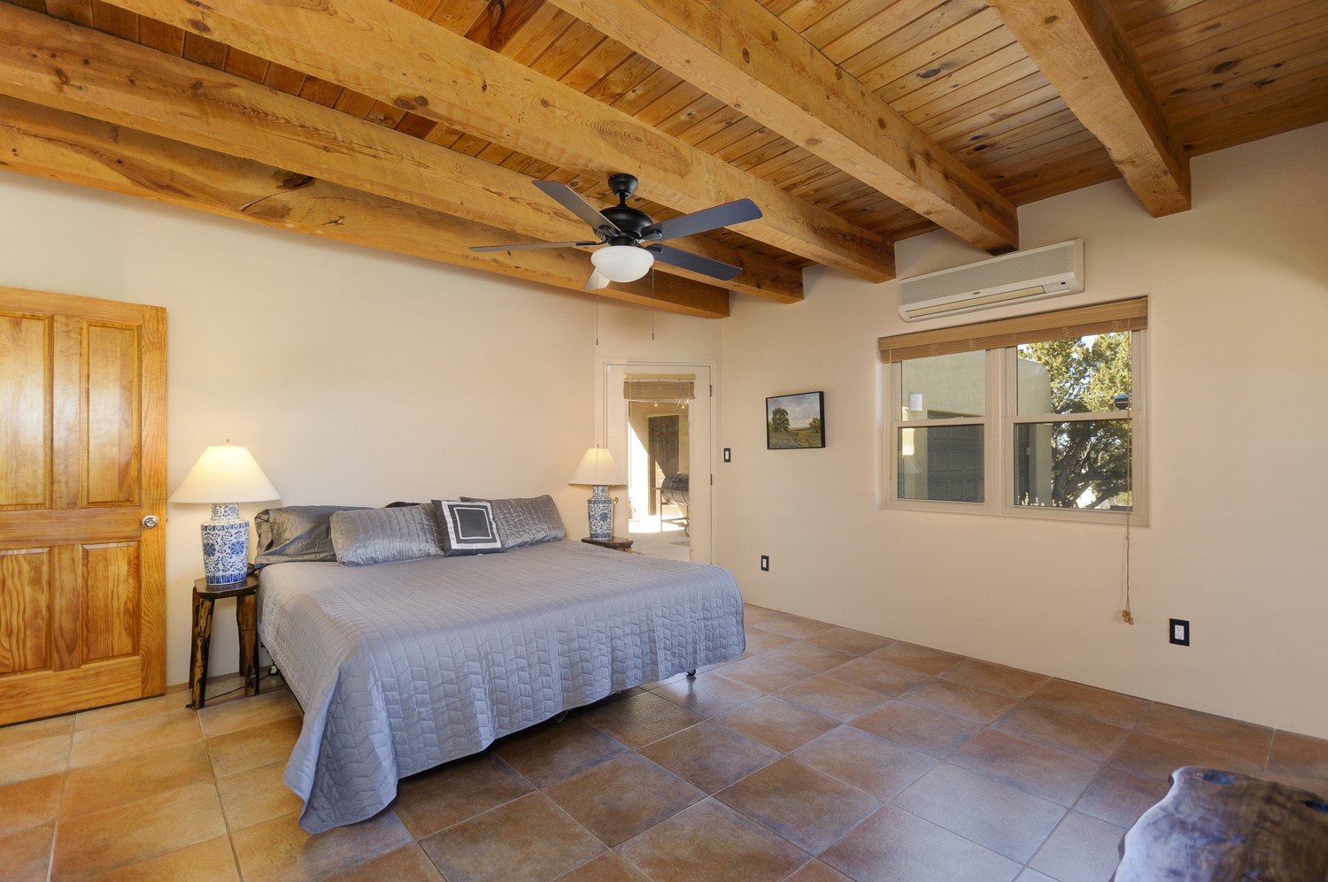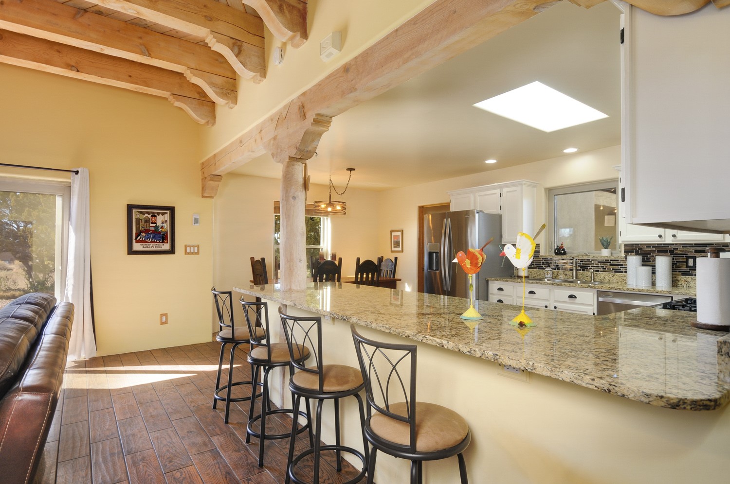 Immerse yourself in the enchanting beauty of Santa Fe with this 3-bedroom, 2-bathroom home. Contemporary Pueblo style boasts many architectural details! Tongue and Groove Viga Beam Ceilings, Hand-Carved Corbels and Saltillo tile floors capture the essence of Santa Fe living! Spacious Great Room offers a Plaster Kiva Fireplace/New Decorator Ceiling Fan! Fabulously Open Kitchen with painted white cabinetry/stainless steel gas range! Abundant Granite Counters with designer backsplash are ideal for the Chef and Ideal for Entertaining! The U-shaped kitchen has a huge breakfast bar large enough for 6-8 People! The Dining area and Kitchen flow into the Open Great Room! Split Bedroom design offers privacy! Inviting Owner's Suite with Patio access/Tile Flooring, and Spa Bath! The suite has a new Mini-Split! Separate jet tub/Tile shower with Pebble Stone Floor and Dual Sinks! Mini split in BR. Huge walk-in closet! Guest Bedrooms share a full bath with designer SW Tile! The detached oversized two-car finished garage offers space for your vehicles, toys, and a workshop area! A perfect combination of trees and meadows throughout the property. Over 100k in Recent Upgrades! The owner rebuilt the drive and cleared Cactus at significant expense! 20k+ Beautiful Landscaping on auto drip system. ur + in Extensive New Roof in 2020! Recent Windows! Upgraded Lighting! Make this property your sanctuary In New Mexico and Create Cherished Memories in one of the most captivating cities in the Southwest, Santa Fe! Move-in Ready, Ideal for 2nd home! The Home is being sold FULLY FURNISHED! Includes equipment and tools in the garage! El Dorado was Rated The Best Place to live in Santa Fe by Niche Magazine! HOA $570. year Covers Pool/Parks/Community Center and 4000 acre Nature Preserve! Endless Hiking Trails! Please go to the Community Website for more info: https://eldoradosf.org