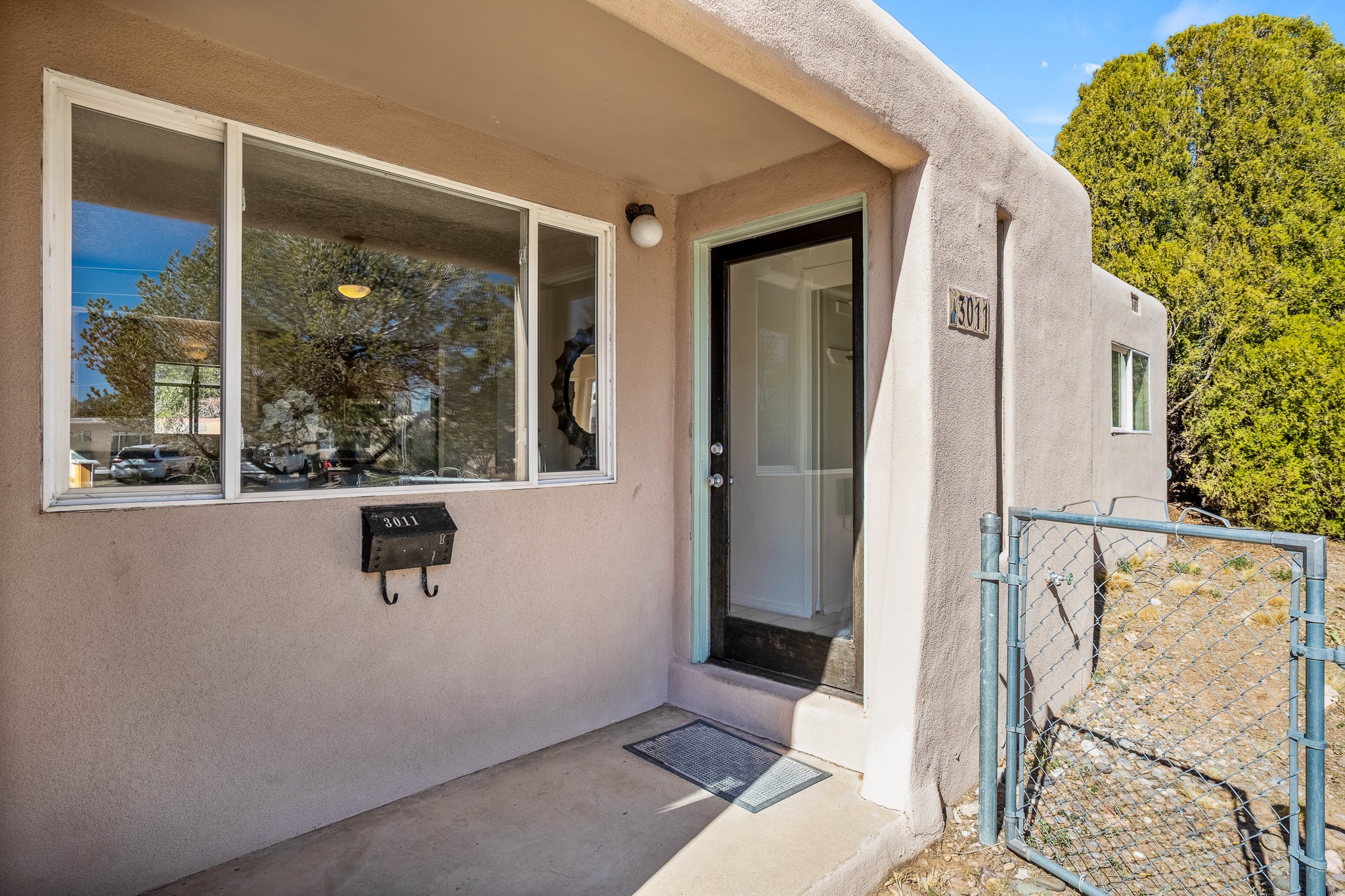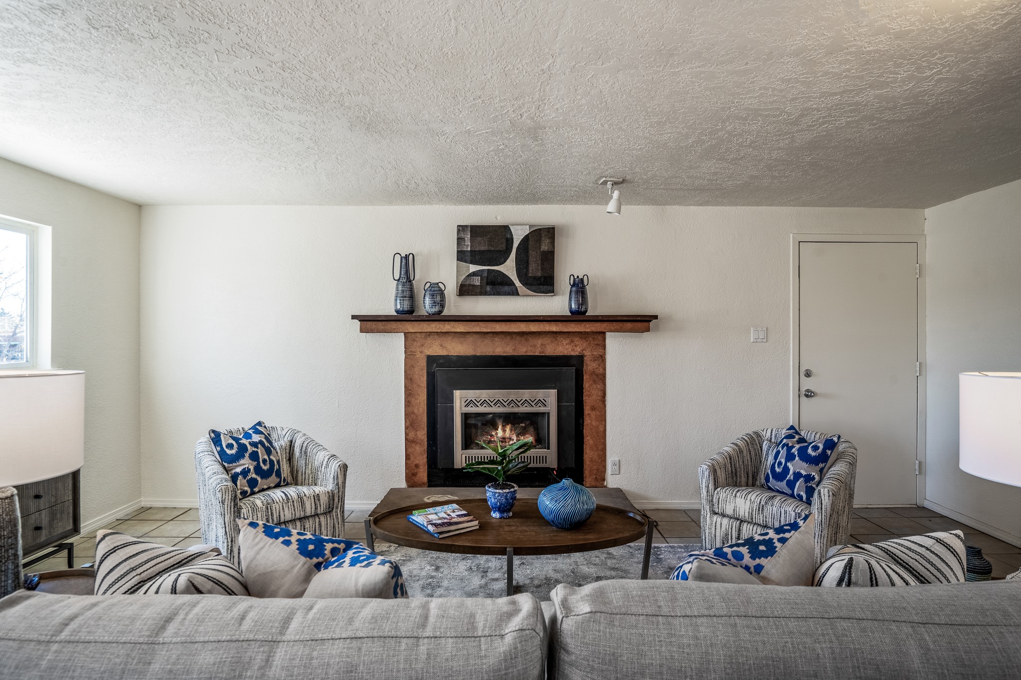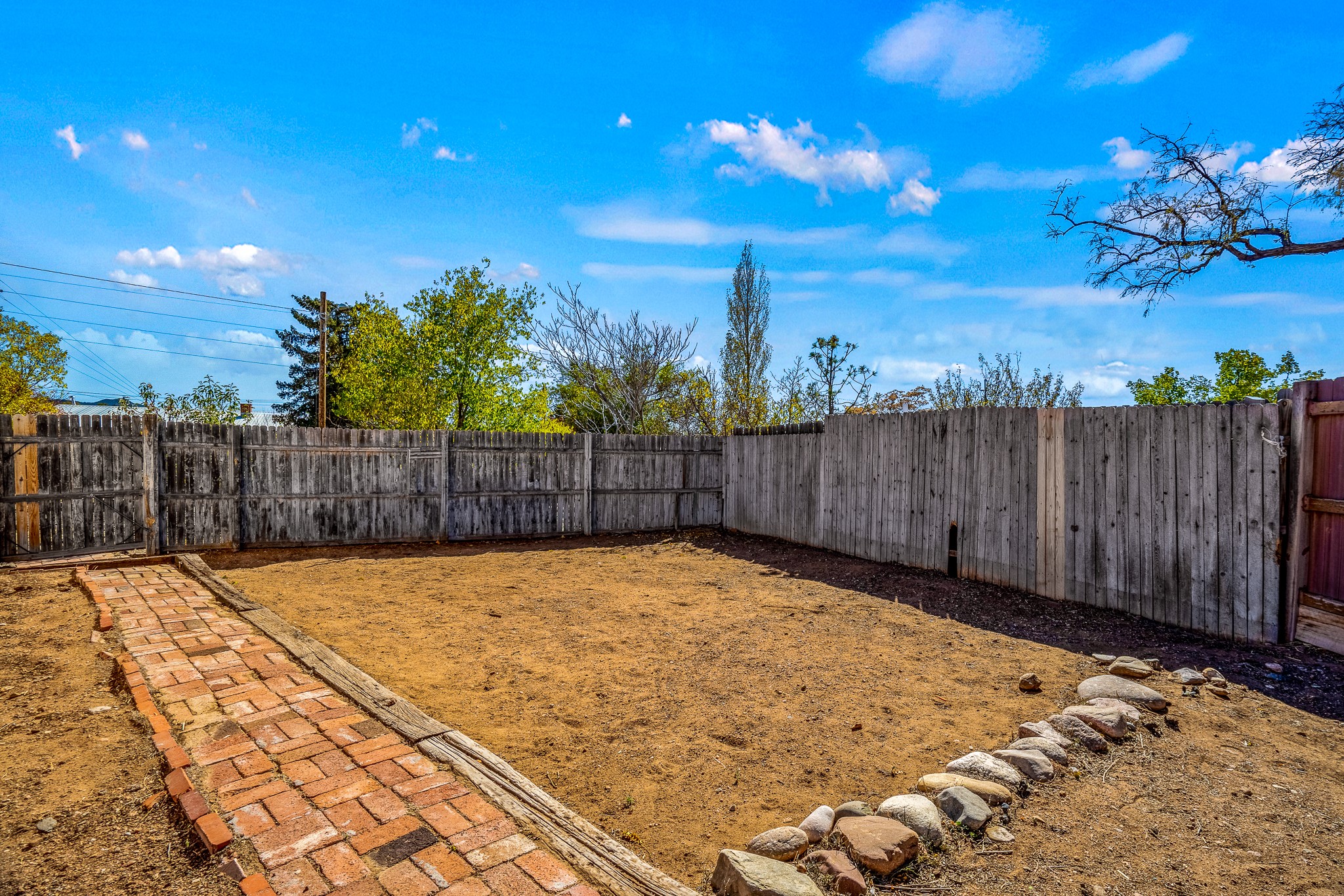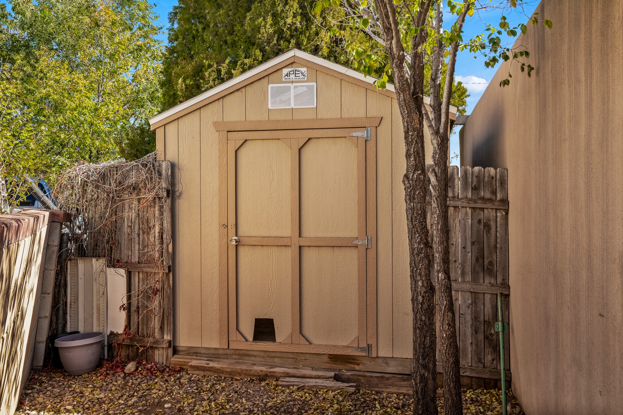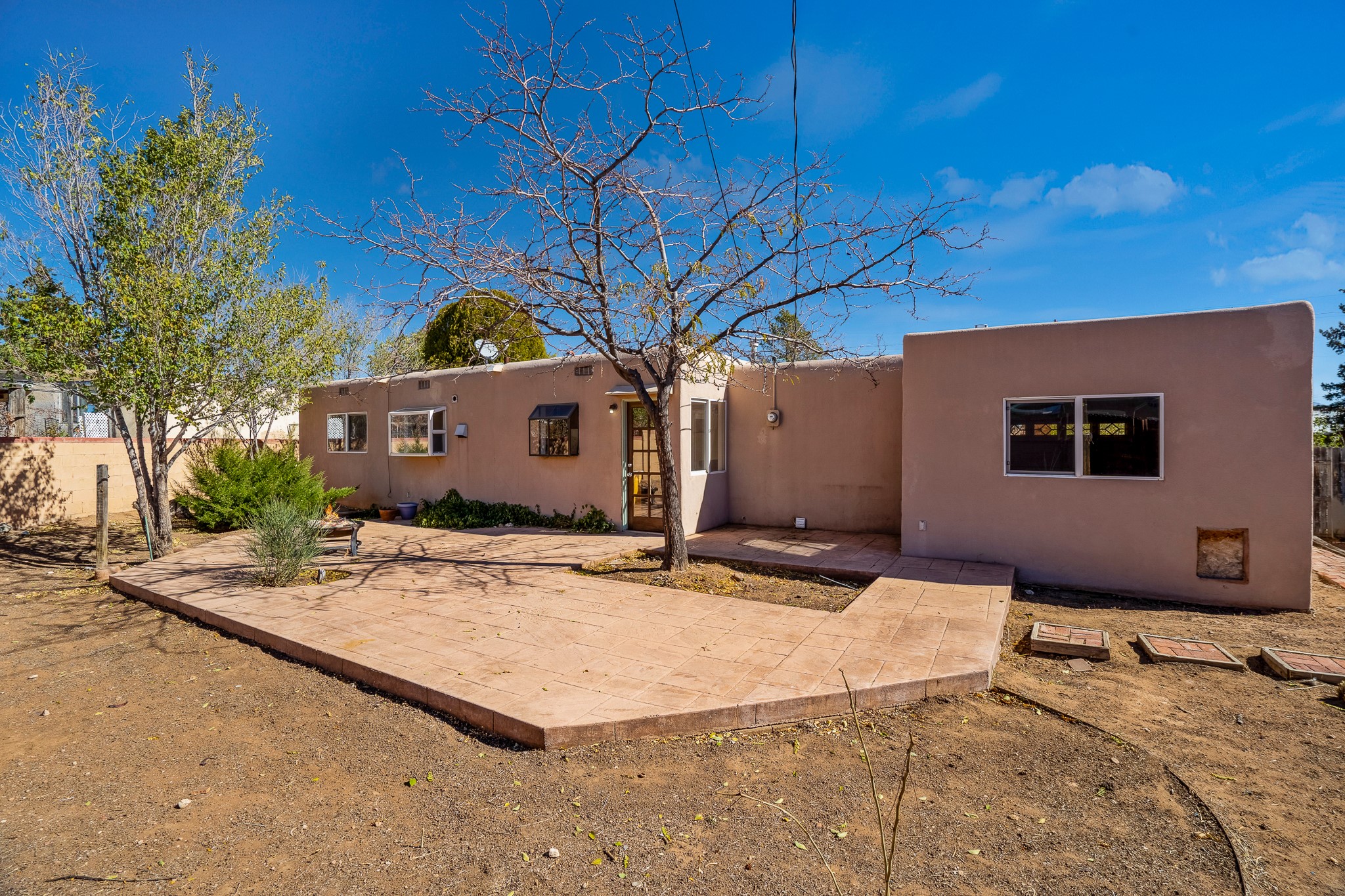Open concept living/dining/kitchen welcomes you in to this well located 3 bedroom home. Tile floors throughout main areas and into bathroom. Stainless steel appliance package in kitchen is all 5 years old: includes refrigerator, dishwasher, electric oven, microwave, hot water heater- the garbage disposal has also been recently replaced. Lovely manufactured wood flooring has been added in the 3 bedrooms. Kitchen and bathroom have small bay windows above the sink in kitchen and tub in bath, which create extra light and lovely places for plants or decorations. Gas fireplace in living room. Single car attached garage makes for a great place for storage or another potential space if buyer wants to put in heating. The yard is very large - since the lot is on a curve of Siringo Rondo the size is .187 acres, or 8146 sq ft - much larger than the minimum lot size. Ample rear yard has lovely stamped concrete patio area with trees for shade and lots of room to plant. Western side yard is also deep and could easily be area for vegetable garden. When outdoors do not miss the shed that is out to the east side of the home - it is a great place to keep outdoor tools so they stay dry and out of the elements. Front yard has a lovely iris patch and another fenced in area that could work well for dogs . Home warranty provided by seller. Owner is New Mexico real estate broker.