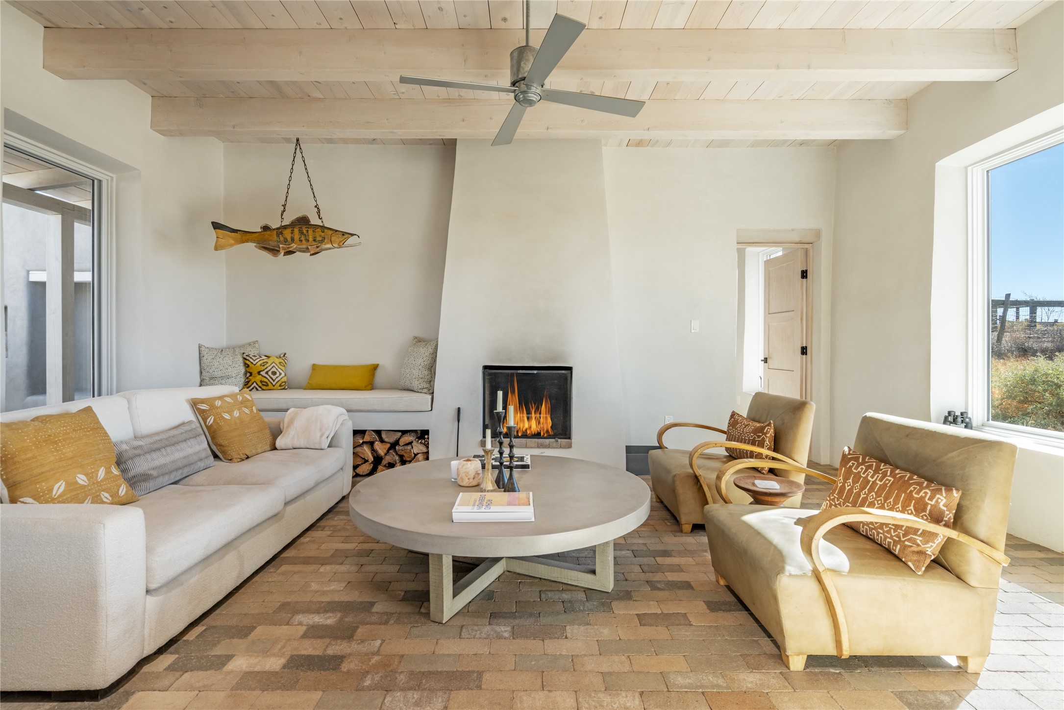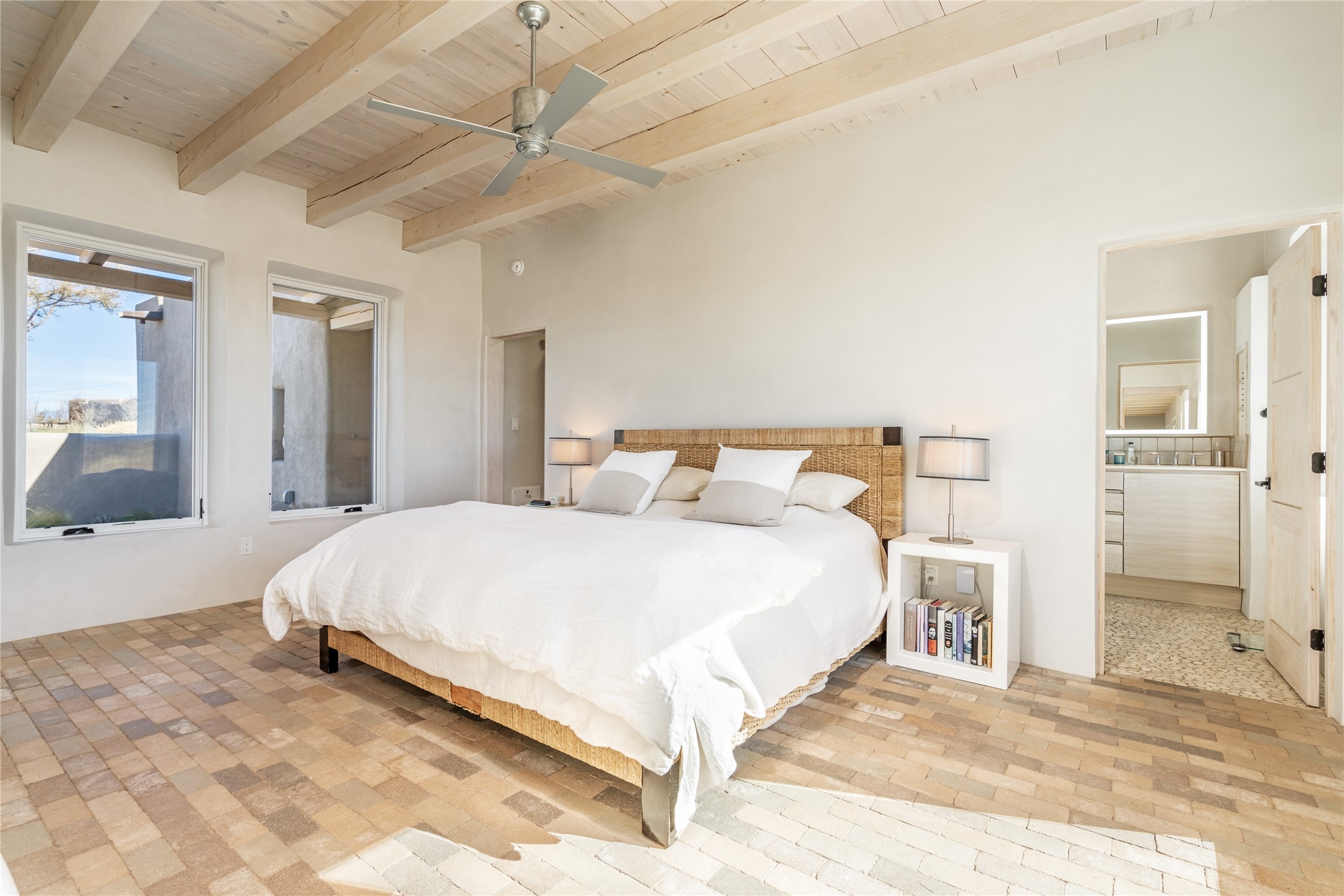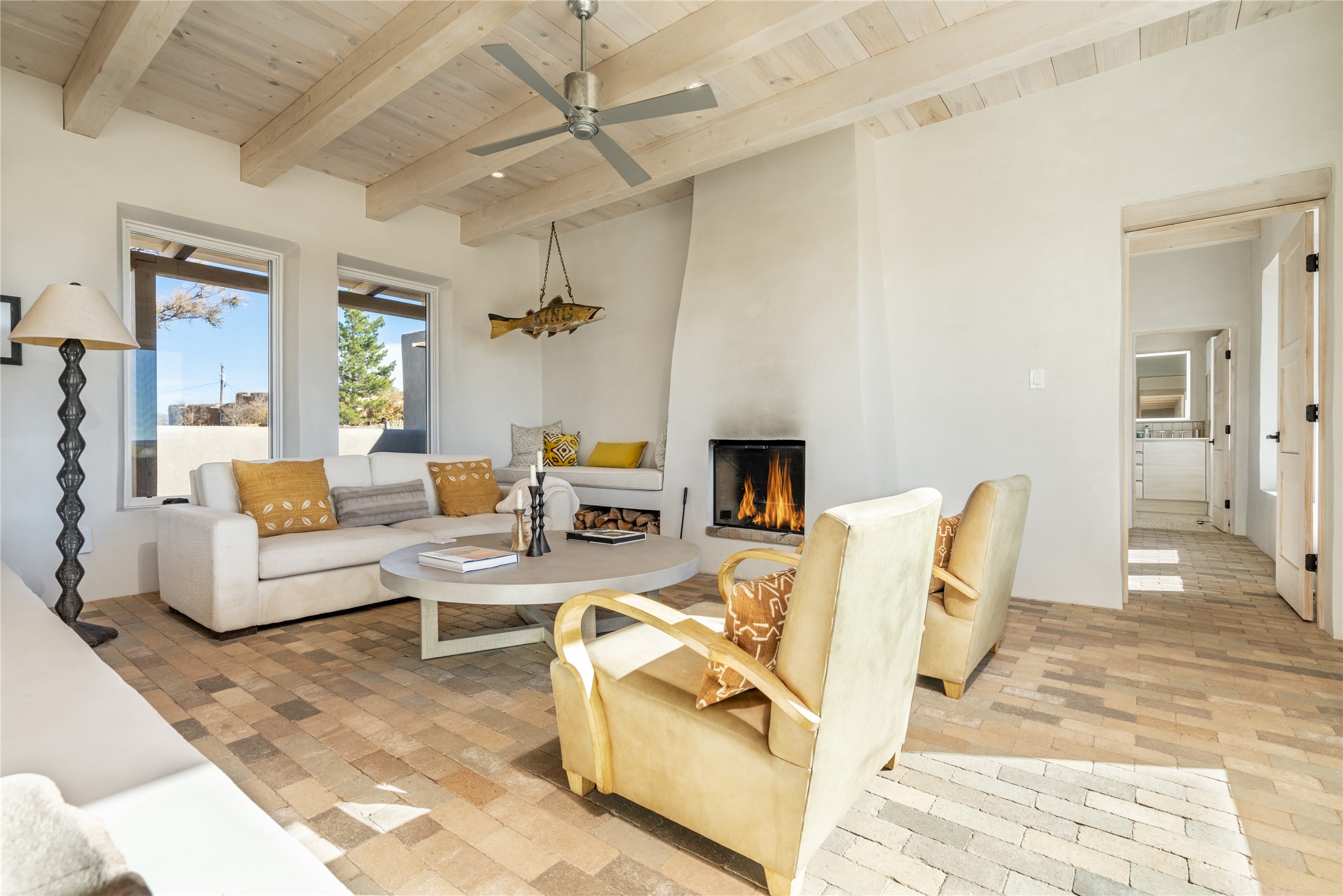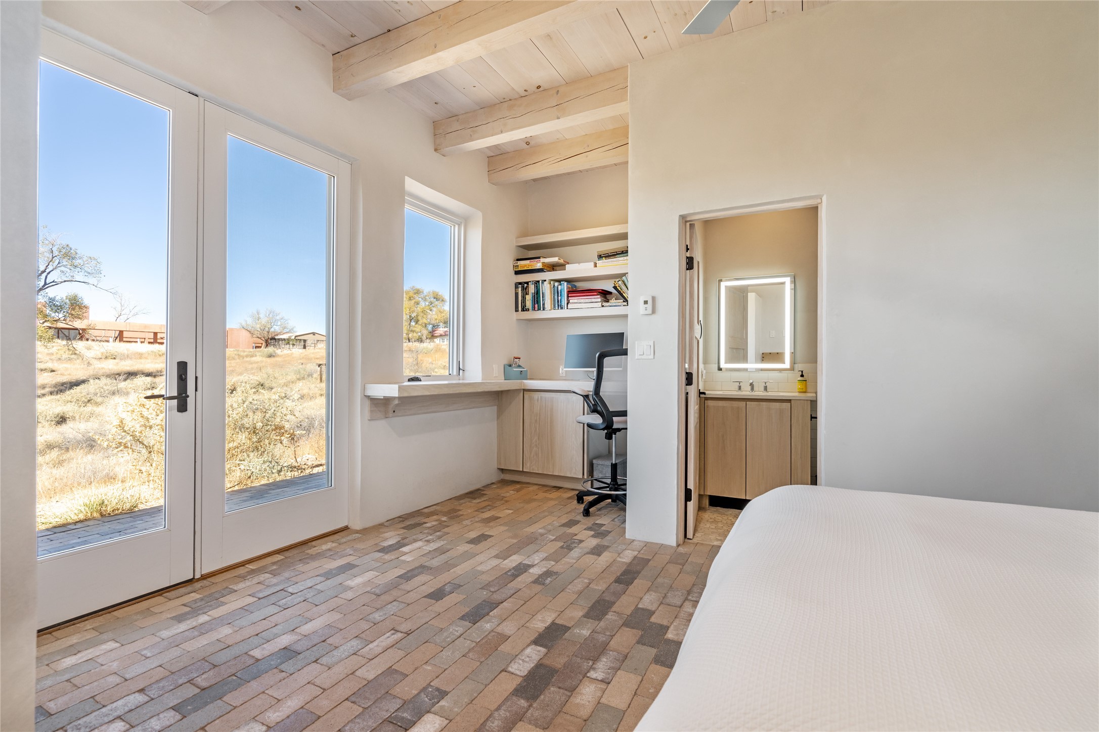 Spectacular adobe home and casita by custom builder Andrew Geer created from handmade adobe bricks in the historic village of Galisteo, offering luxurious living and majestic views overlooking the beautiful Cerro Pelon Ranch.Entertainers and chefs will adore the kitchen with Energy Star appliances, a Wolf dual fuel range oven, and incredible views for doing dishes. The home's large windows allow the outdoors in, creating a spacious feeling in the dining and main living areas in this open floor plan 2 bed, 2 bath main home. The contemporary design features modern amenities including an energy efficient HERS Index of 55, radiant heating, and satellite internet with whole house wi-fi, combined with old world accents such as brick floors and beam ceilings, with a sleek fireplace and intimate ambiance.Nature lovers will prize the abundant natural light from walls full of glass doors and picture windows, as well as a private courtyard and open back patio gazing across the epic landscape and dazzling skies. Artists, remote workers, and guests will love the adobe studio casita with office/flex nook and bath.This special property is a unique blend of past and present, an alluring oasis a world away yet within arms reach of the vibrance and culture of downtown Santa Fe.Experience its splendor today.