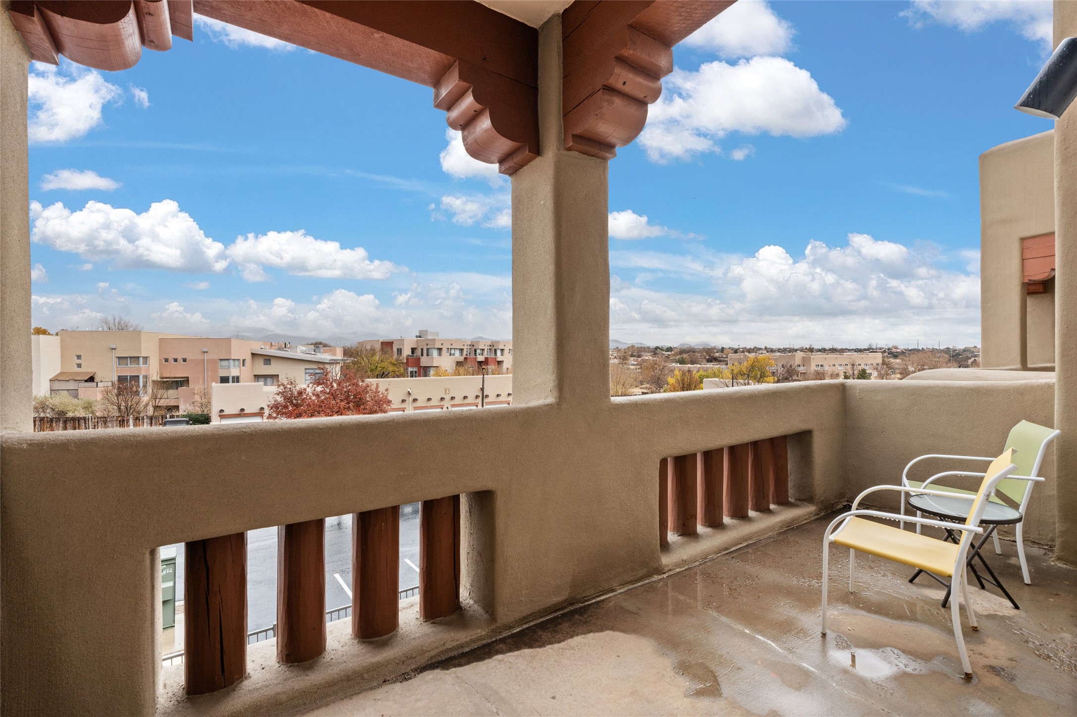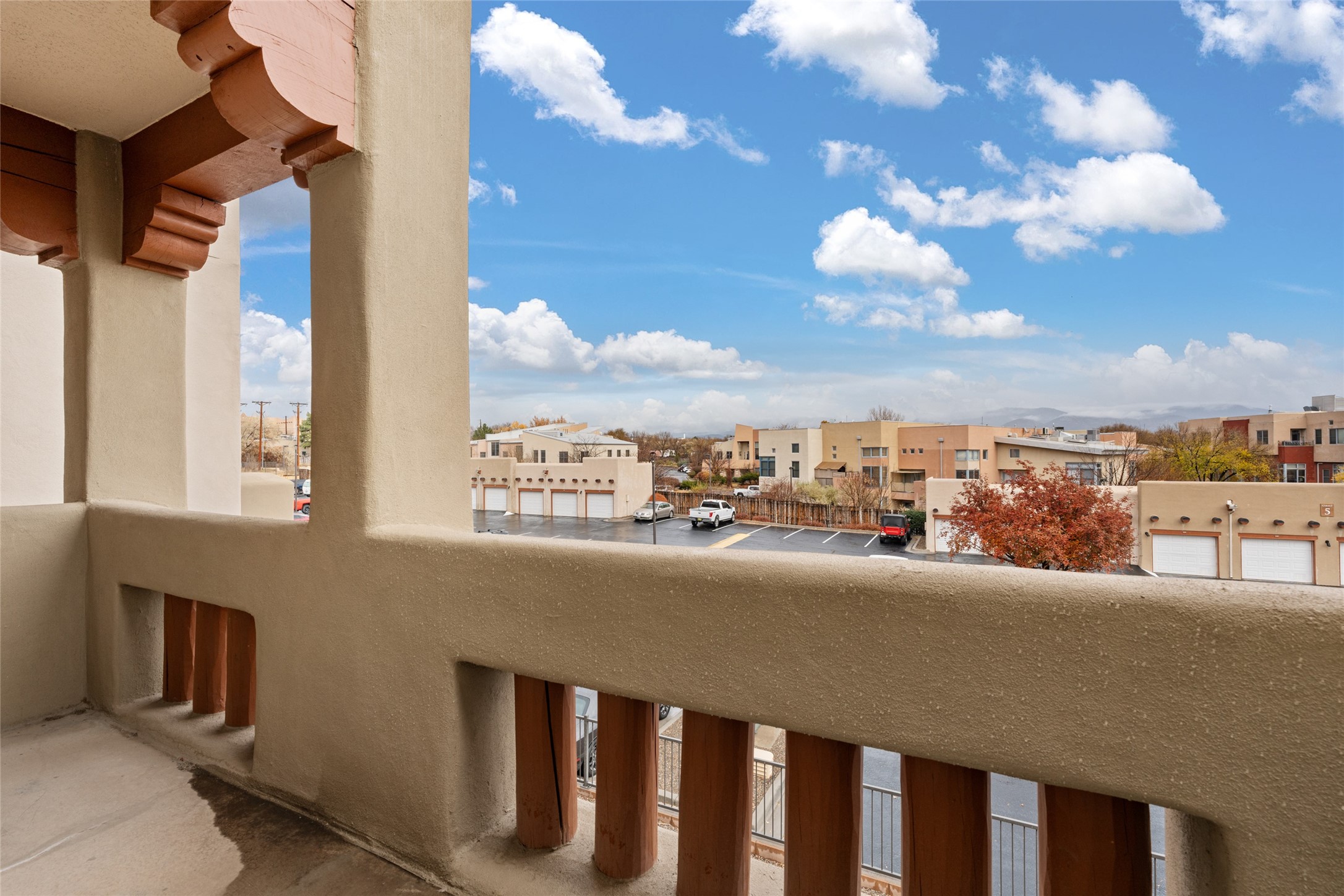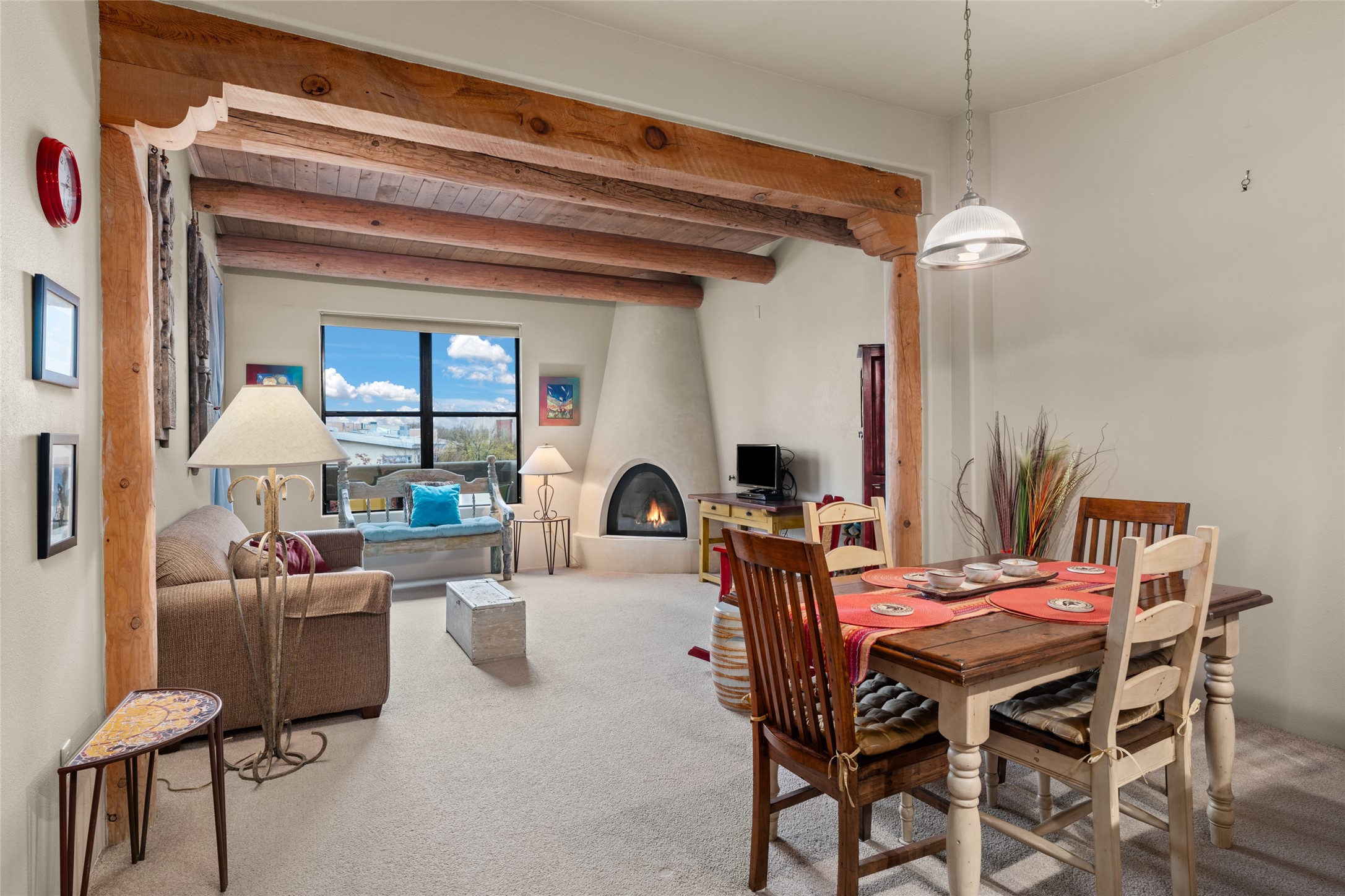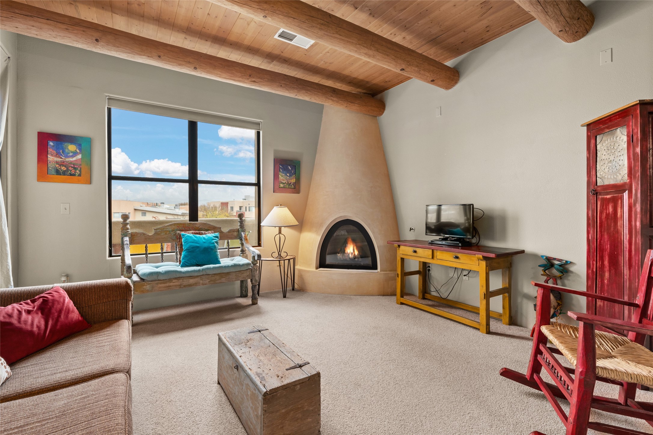 Sangre de Cristo mountain views and a good-sized, deeded storage closet add to the appeal of this fully-furnished, one bedroom, 1.5 bath condo with generous balcony. A sophisticated blend of traditional and contemporary style, this handsome residence has high ceilings, lovely wood vigas and corbels, granite counters and slate tile flooring in the kitchen and baths, plus an iconic corner kiva fireplace. The well-designed Alameda complex, with its beautiful outdoor pool, fitness center, handsome library, gated parking and onsite management, offers a level of quality and comfort uncommon at this price point. Located at the rear of the complex, for greater tranquility, this charming property is convenient to restaurants, shopping, and major thoroughfares.