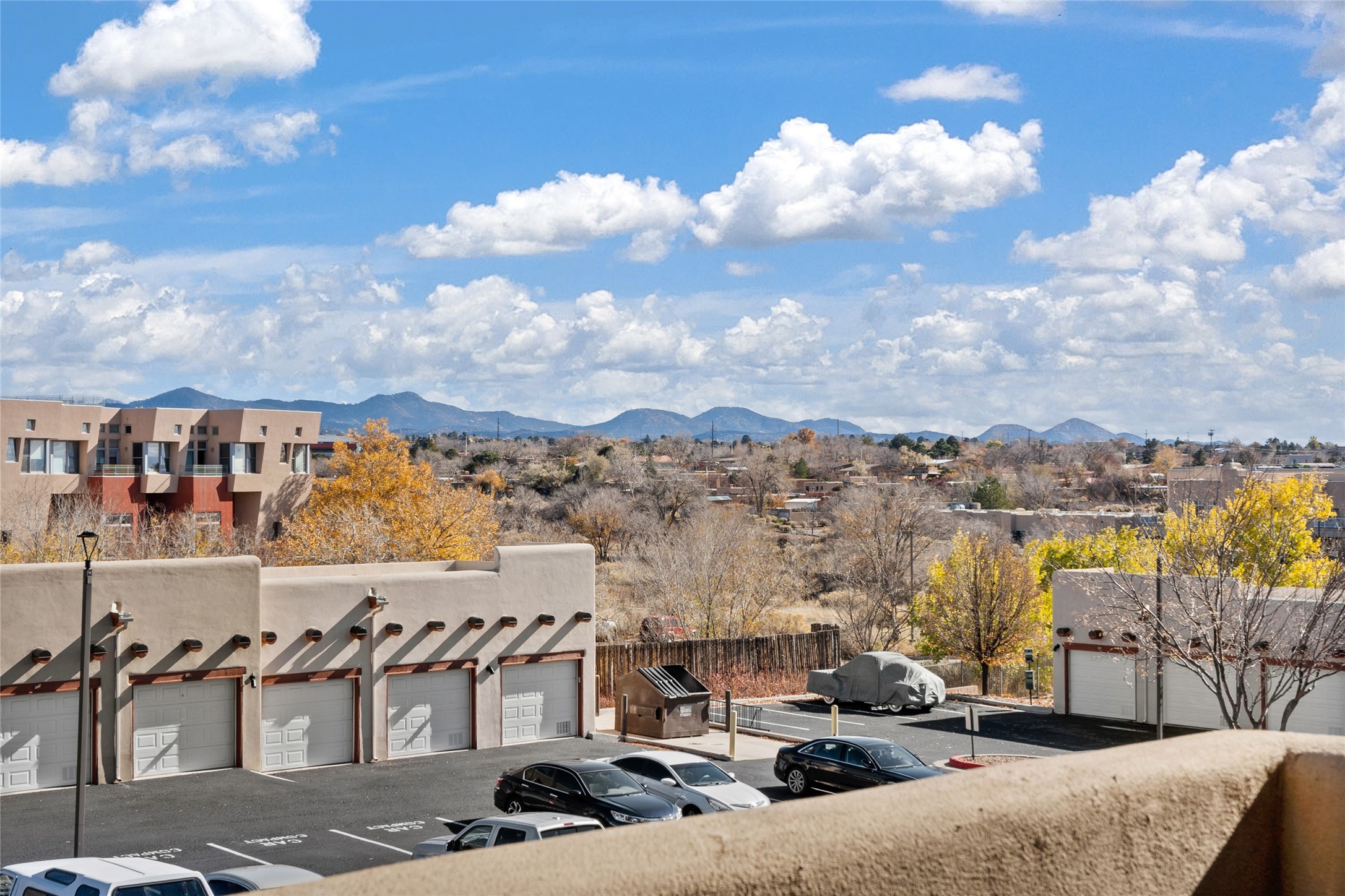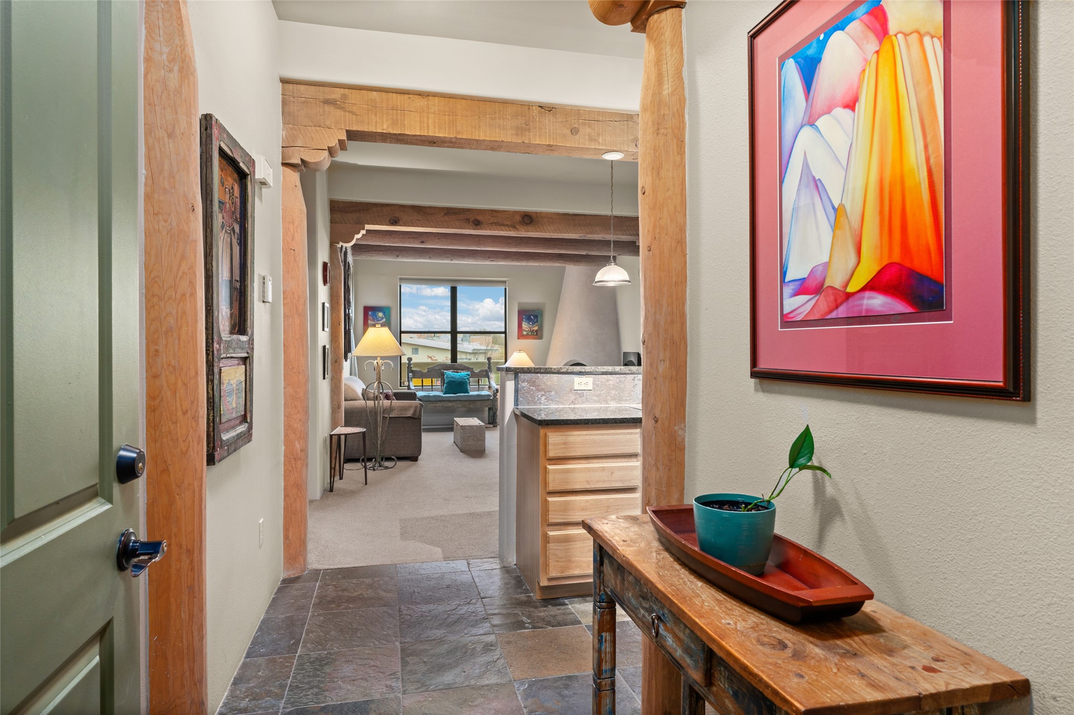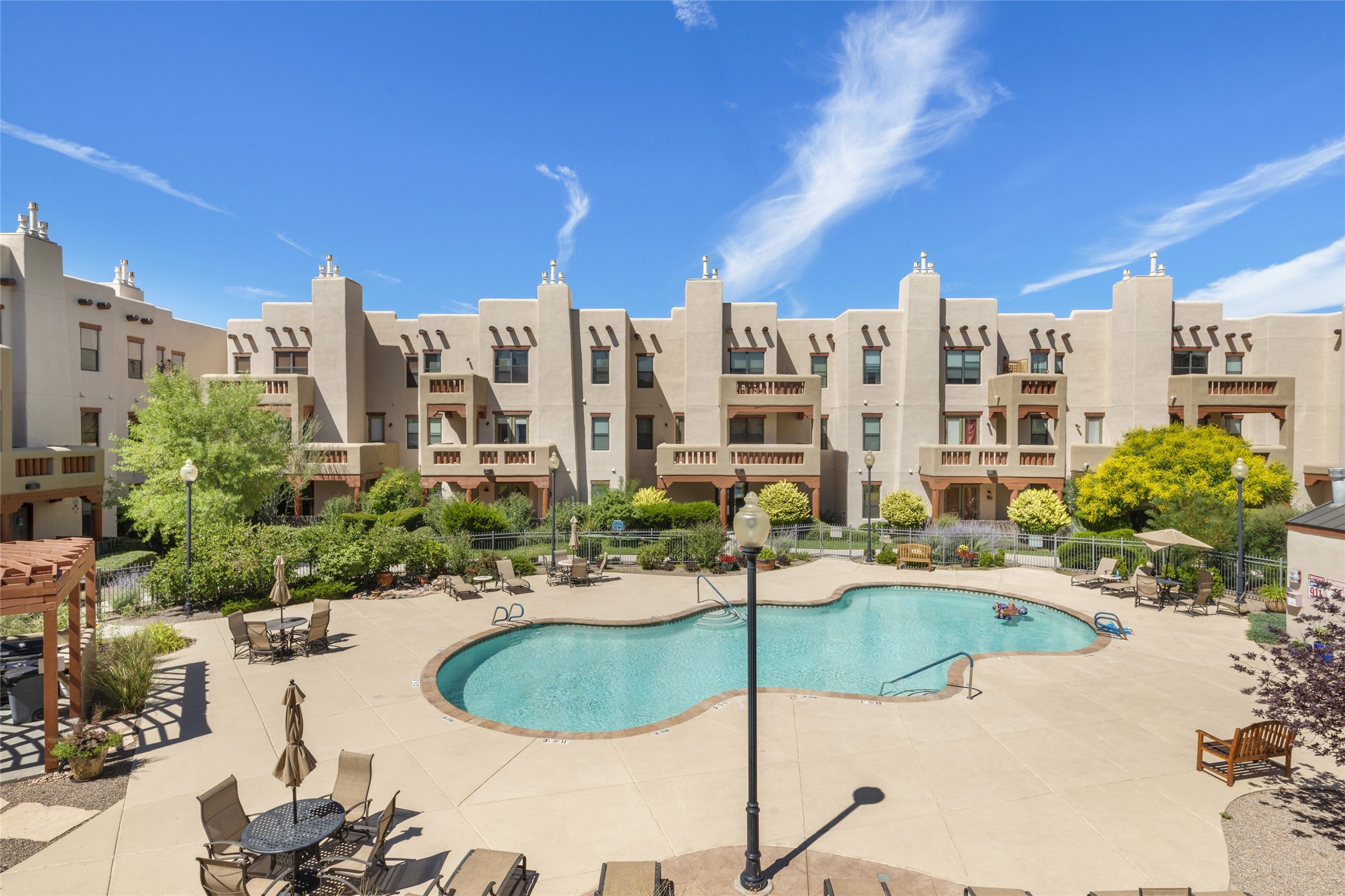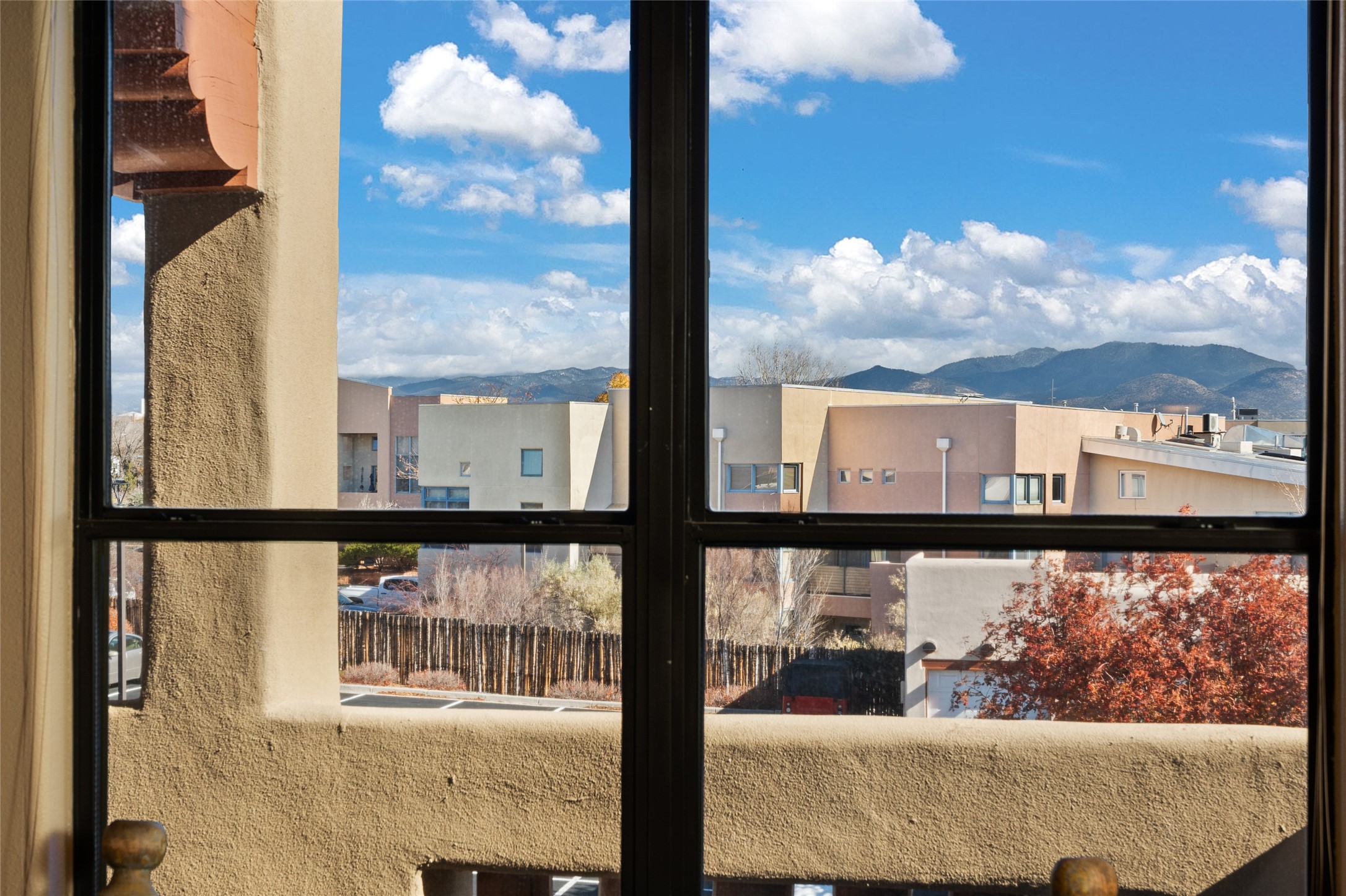 Sangre de Cristo mountain views and a good-sized, deeded storage closet add to the appeal of this fully-furnished, one bedroom, 1.5 bath condo with generous balcony. A sophisticated blend of traditional and contemporary style, this handsome residence has high ceilings, lovely wood vigas and corbels, granite counters and slate tile flooring in the kitchen and baths, plus an iconic corner kiva fireplace. The well-designed Alameda complex, with its beautiful outdoor pool, fitness center, handsome library, gated parking and onsite management, offers a level of quality and comfort uncommon at this price point. Located at the rear of the complex, for greater tranquility, this charming property is convenient to restaurants, shopping, and major thoroughfares.