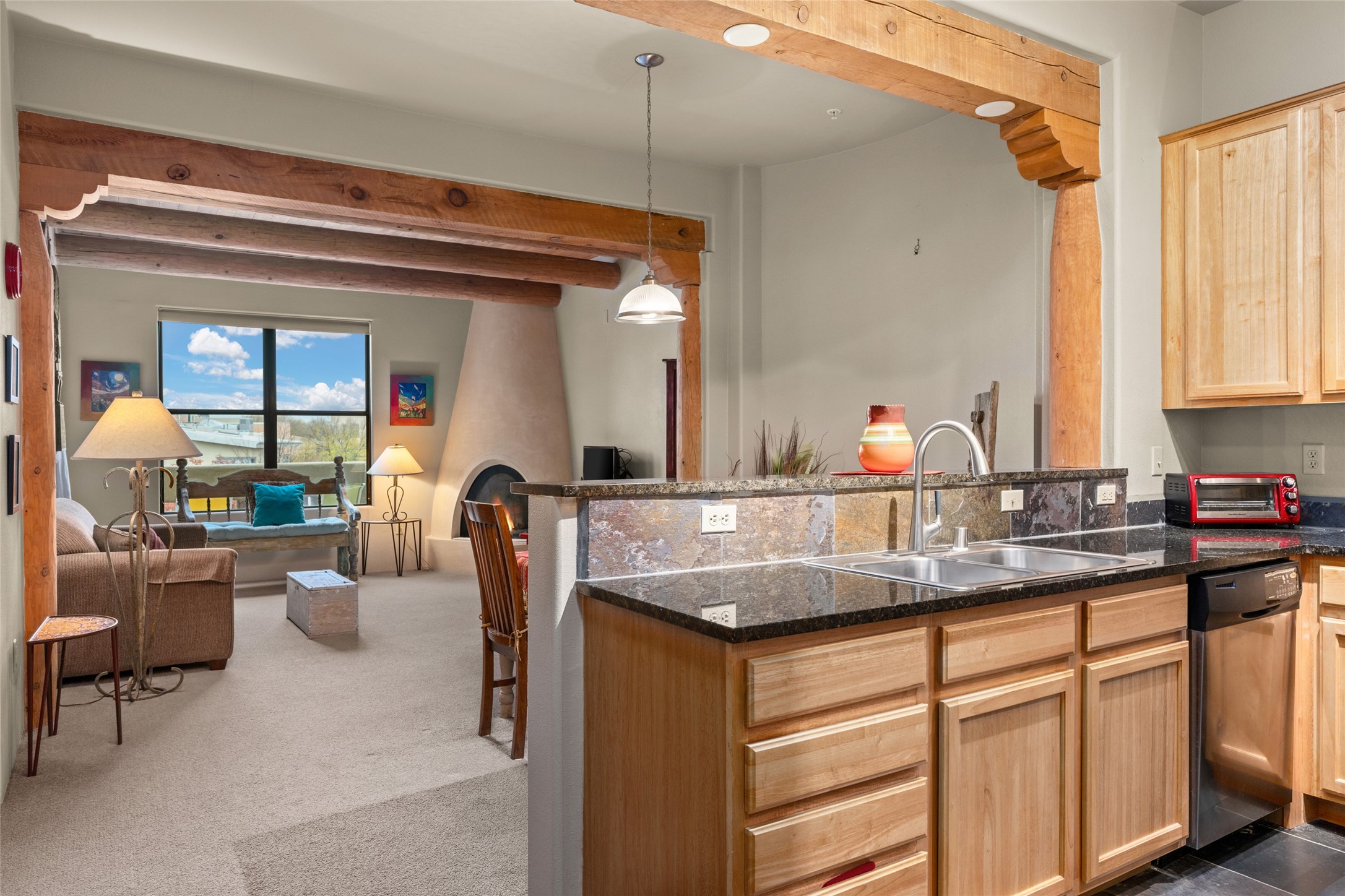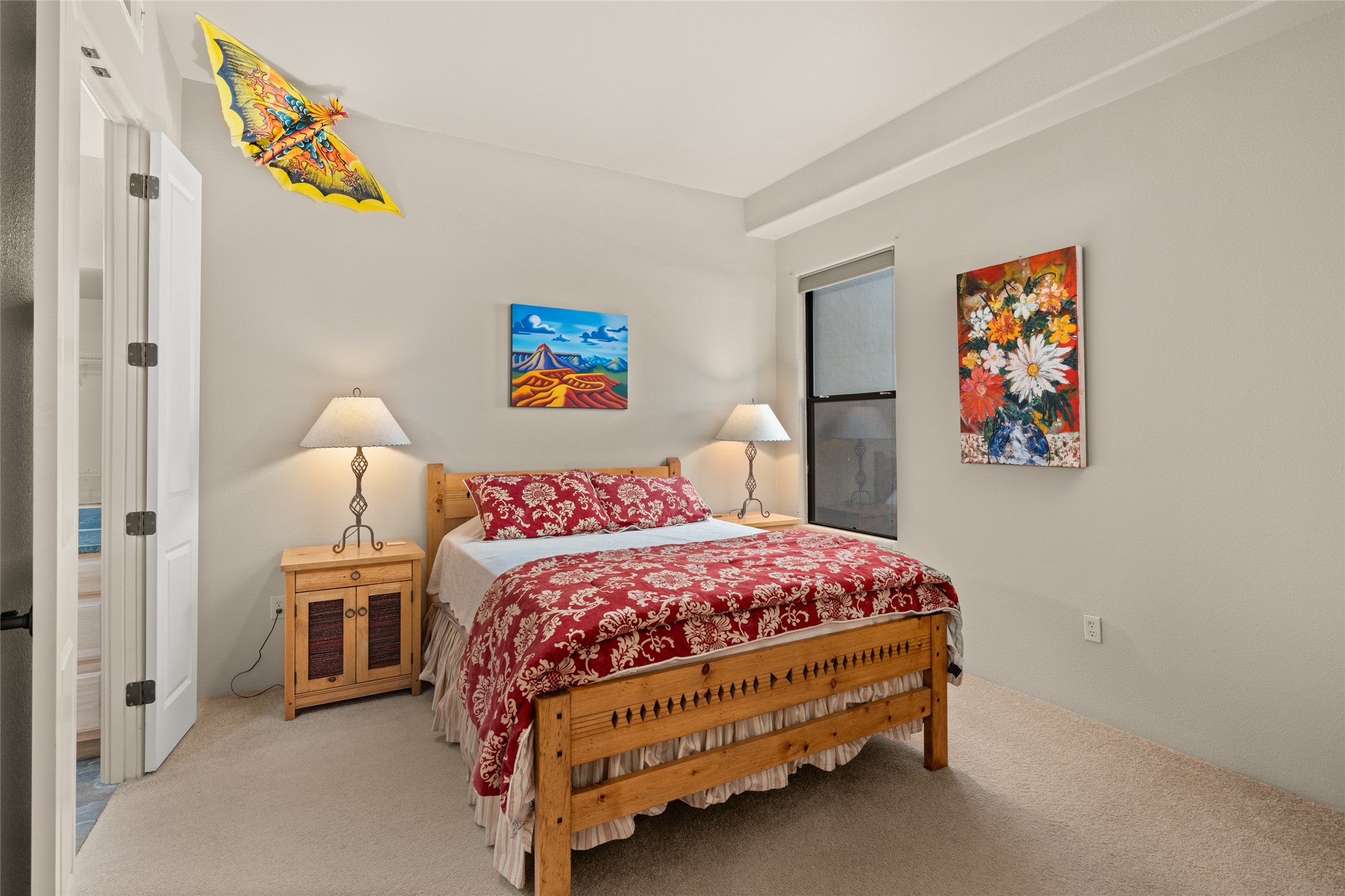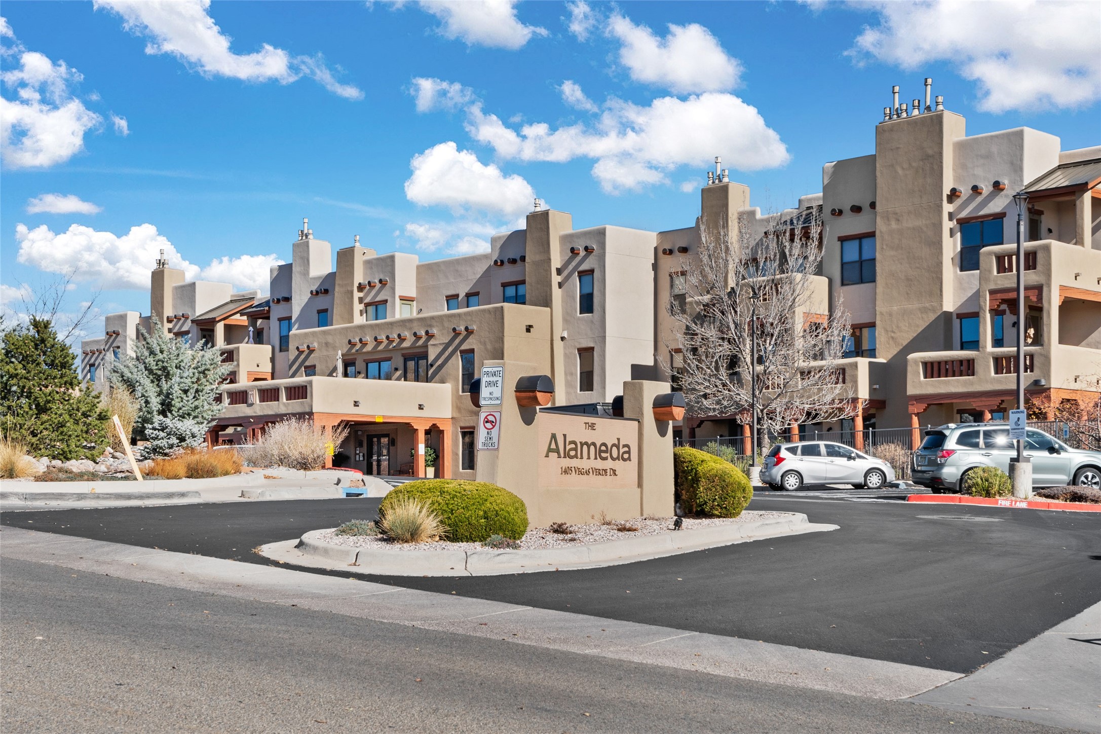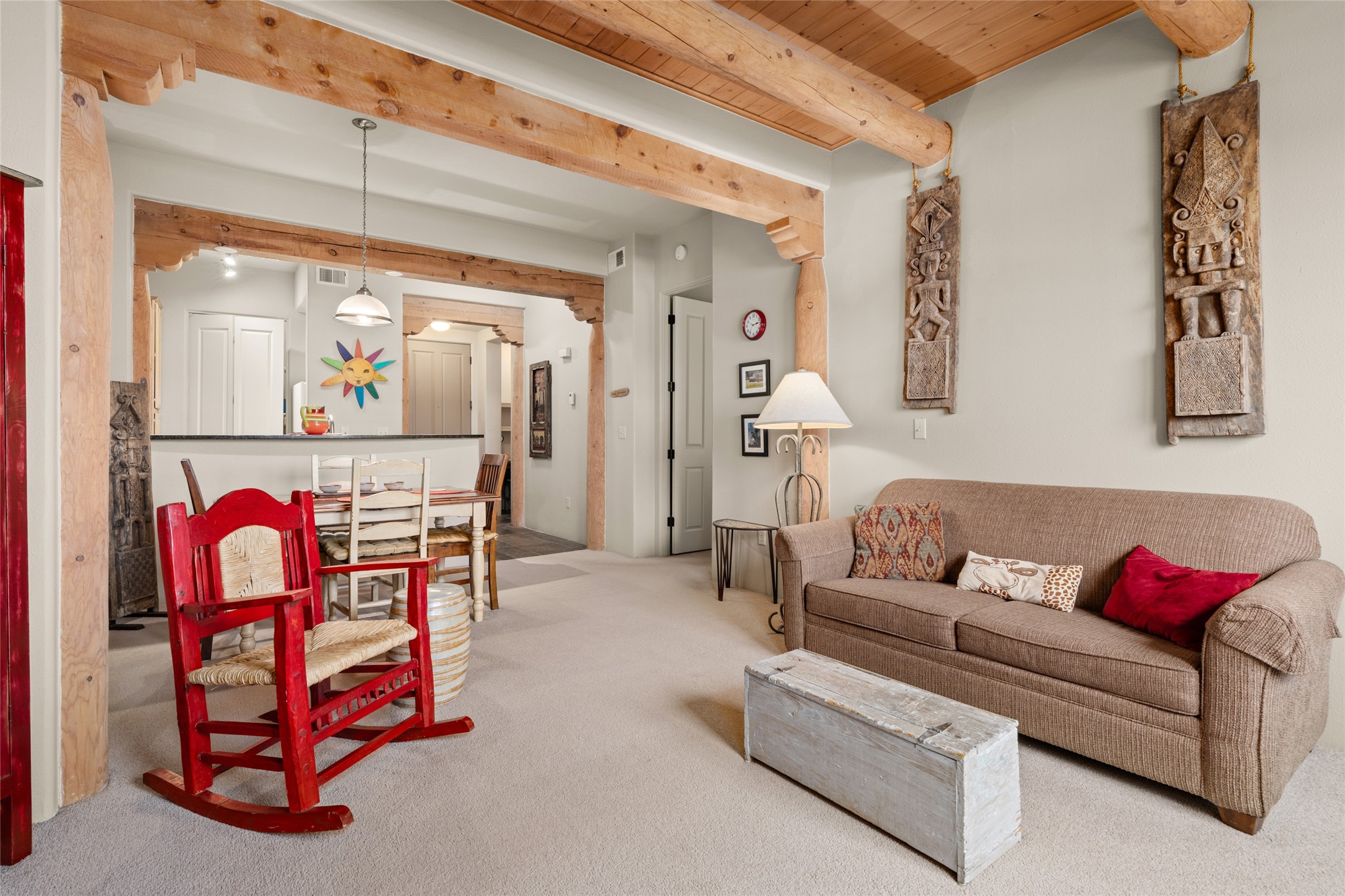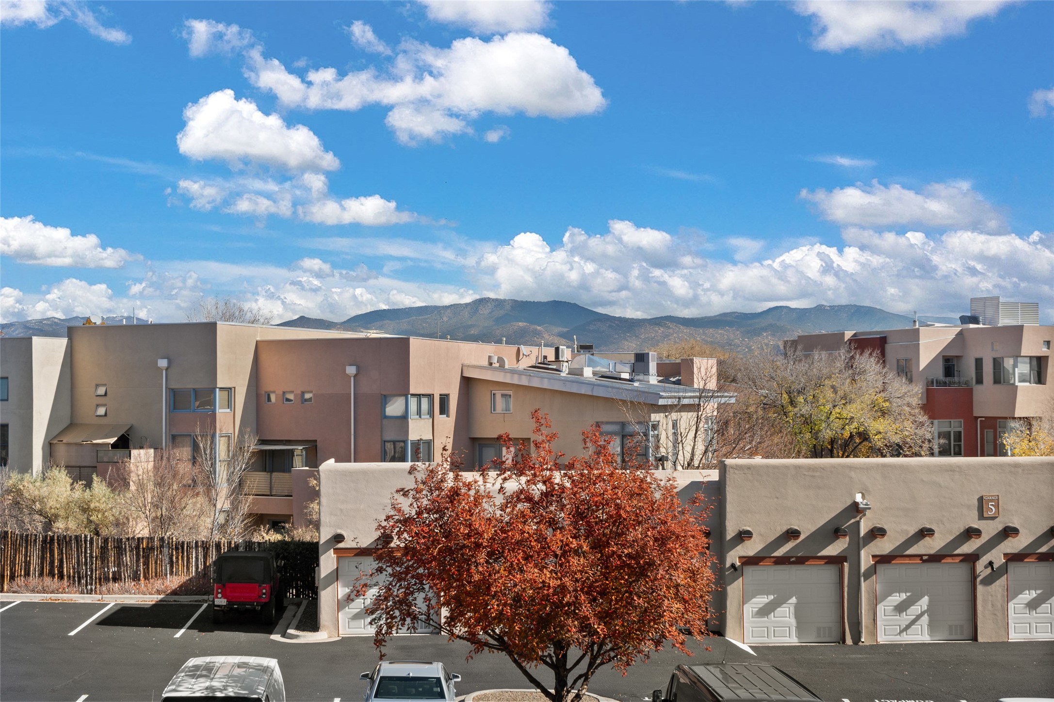 Sangre de Cristo mountain views and a good-sized, deeded storage closet add to the appeal of this fully-furnished, one bedroom, 1.5 bath condo with generous balcony. A sophisticated blend of traditional and contemporary style, this handsome residence has high ceilings, lovely wood vigas and corbels, granite counters and slate tile flooring in the kitchen and baths, plus an iconic corner kiva fireplace. The well-designed Alameda complex, with its beautiful outdoor pool, fitness center, handsome library, gated parking and onsite management, offers a level of quality and comfort uncommon at this price point. Located at the rear of the complex, for greater tranquility, this charming property is convenient to restaurants, shopping, and major thoroughfares.